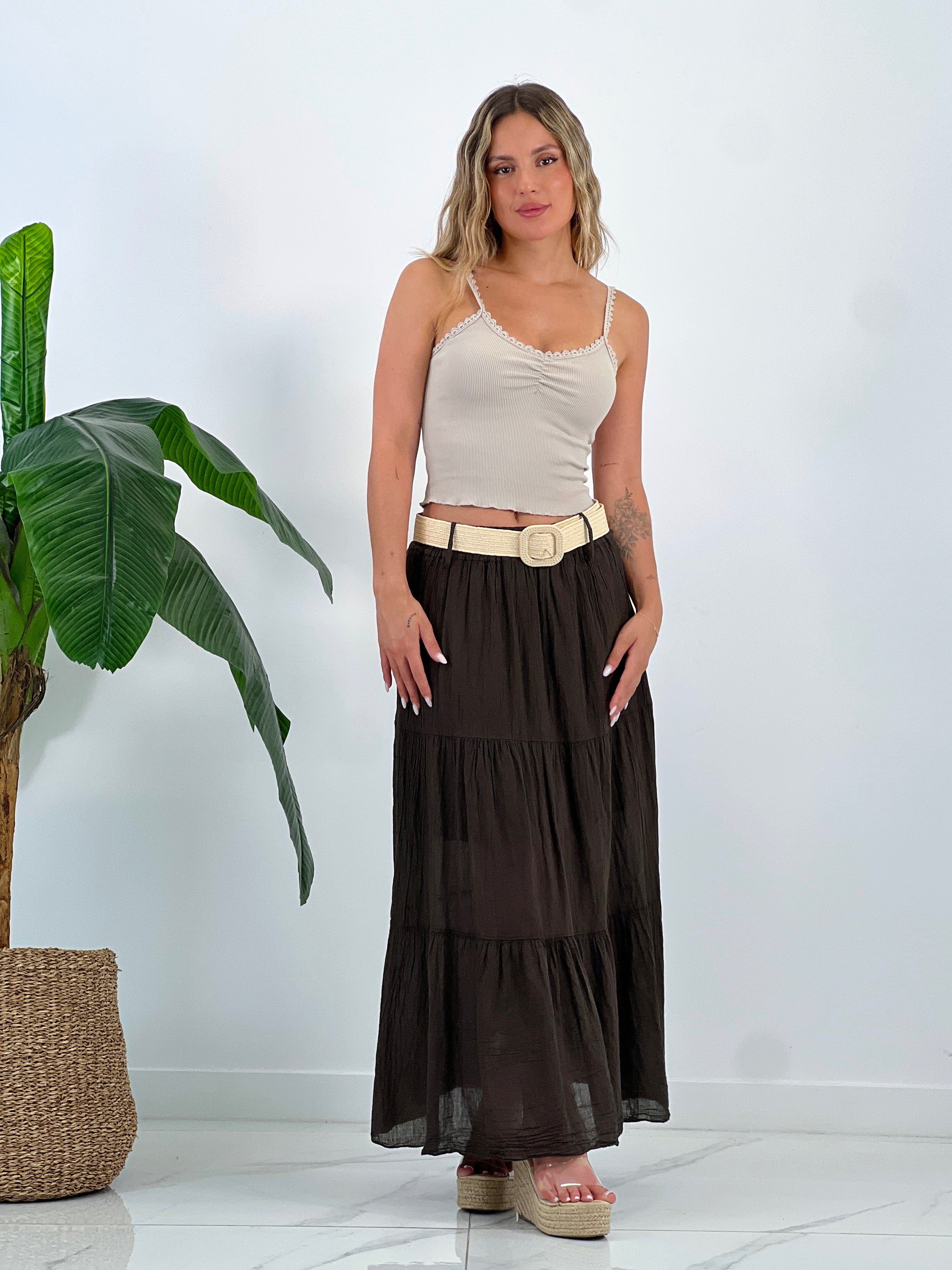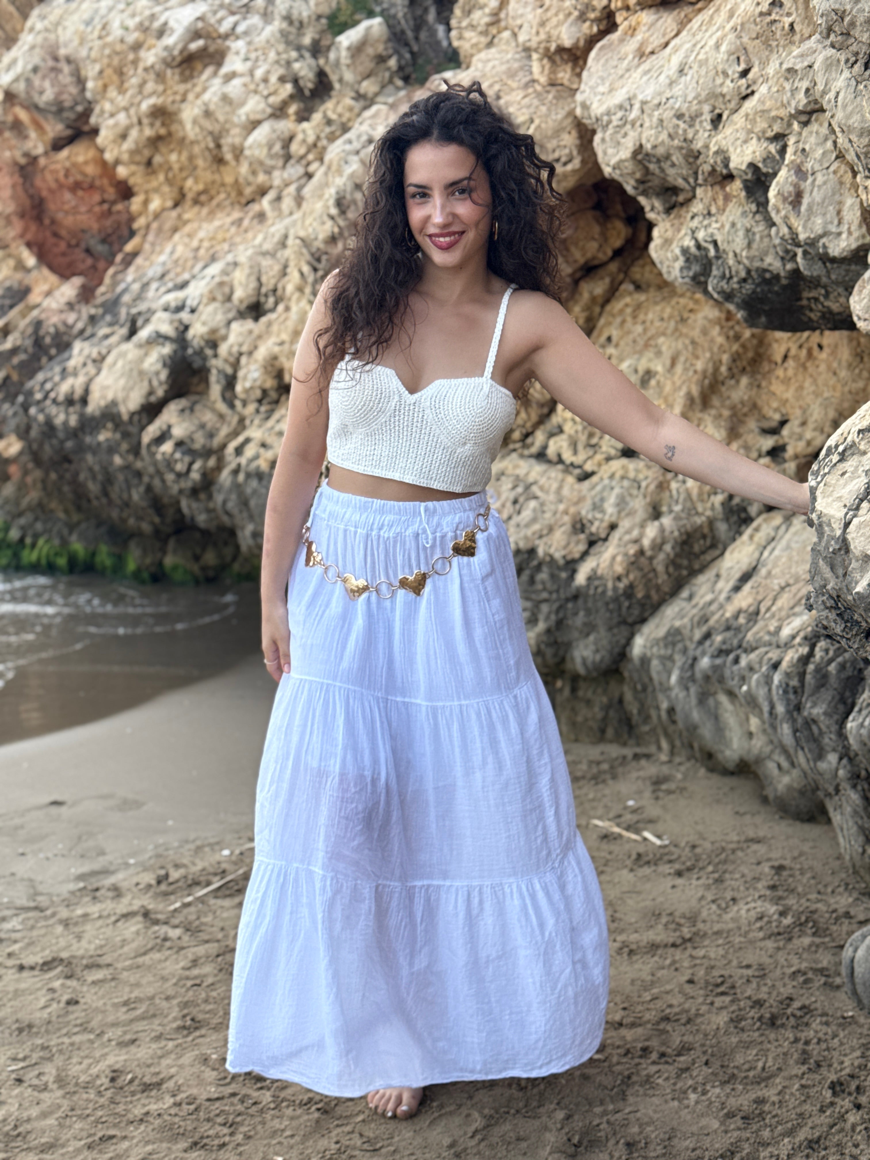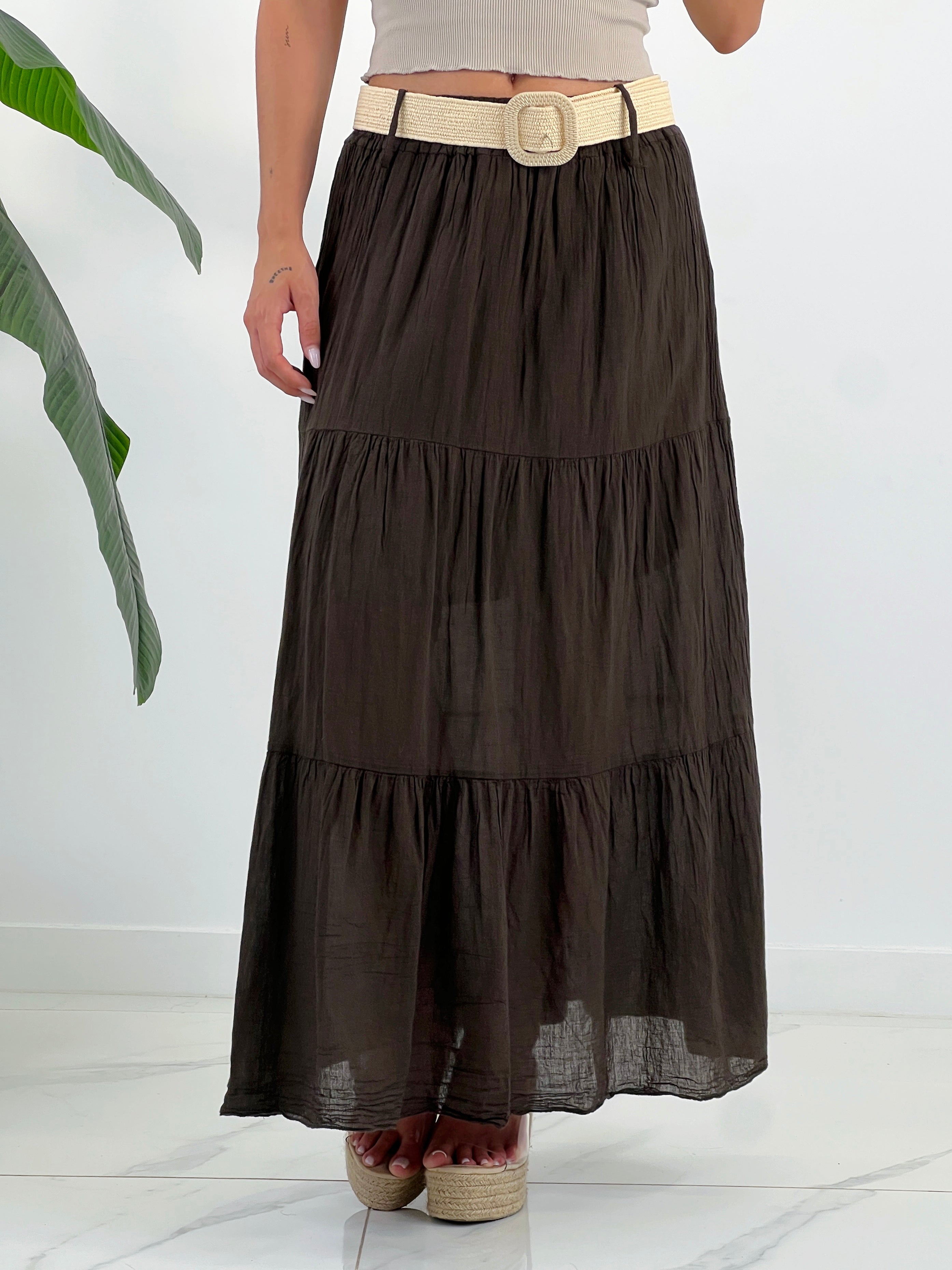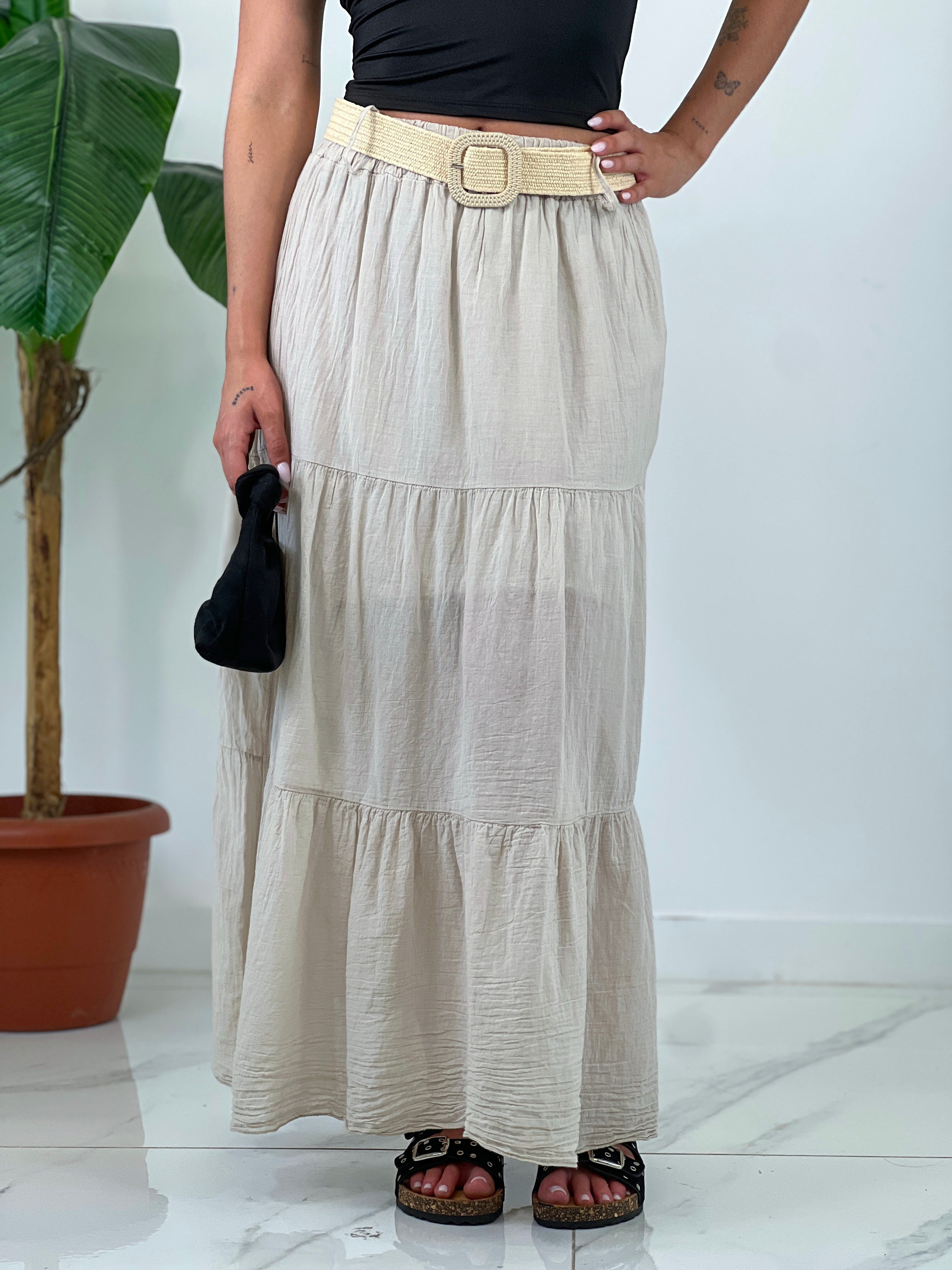 Faldilla llarga de cotó amb disseny rústic i elegants volants que aporten moviment i textura. Confeccionada amb materials de qualitat per garantir durabilitat i comoditat durant tot el dia. Inclou cinturó a joc per definir la silueta i adaptar-se perfectament a diferents estils. Ideal per combinar amb peces bàsiques en looks tant casuals com més elaborats.