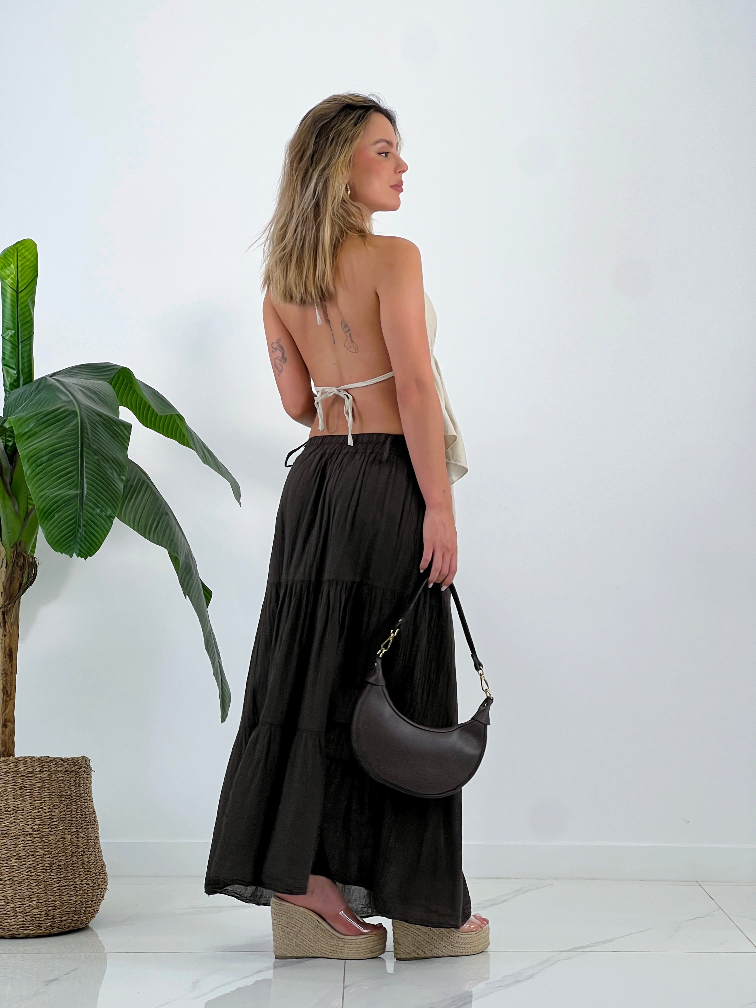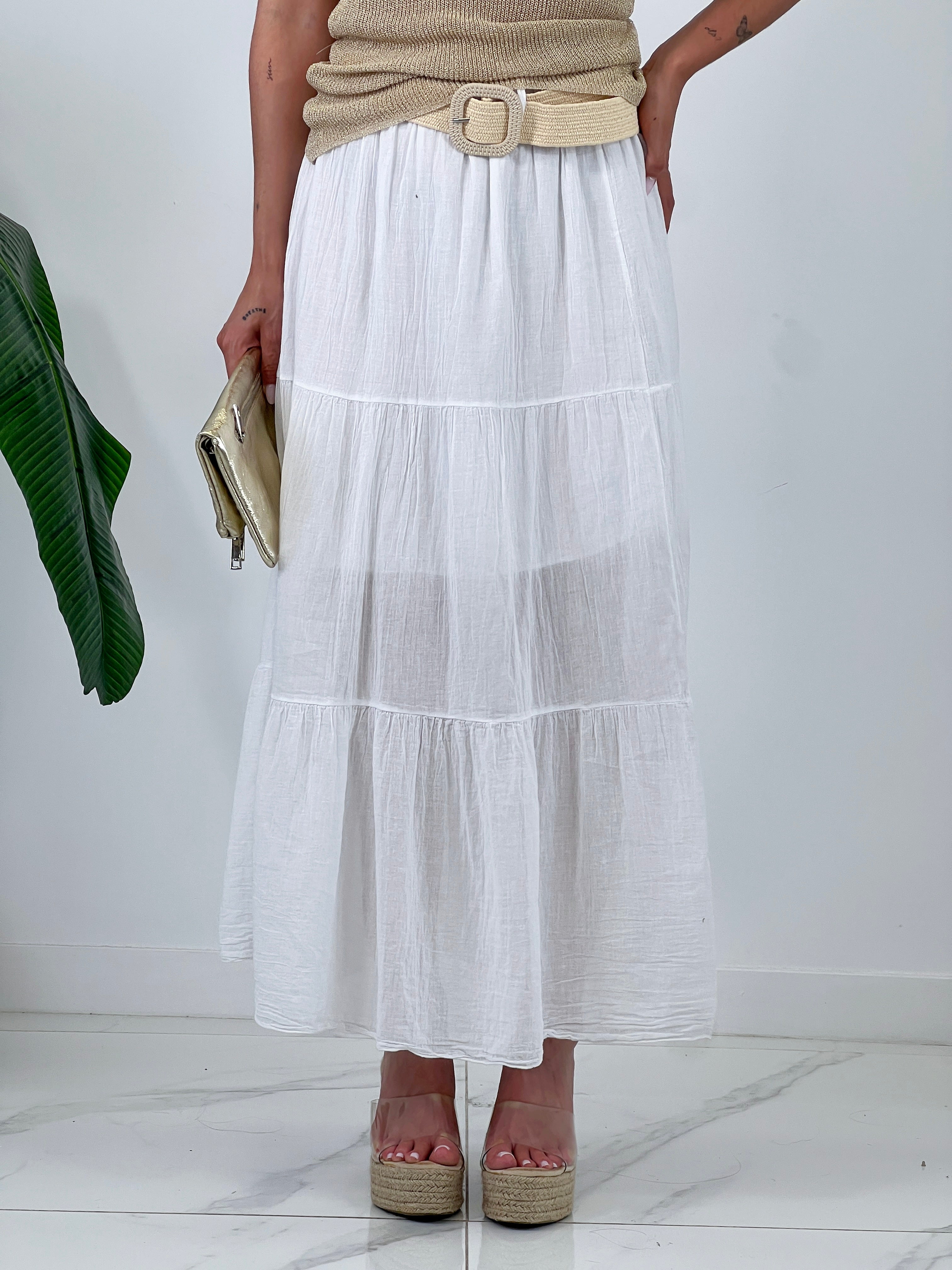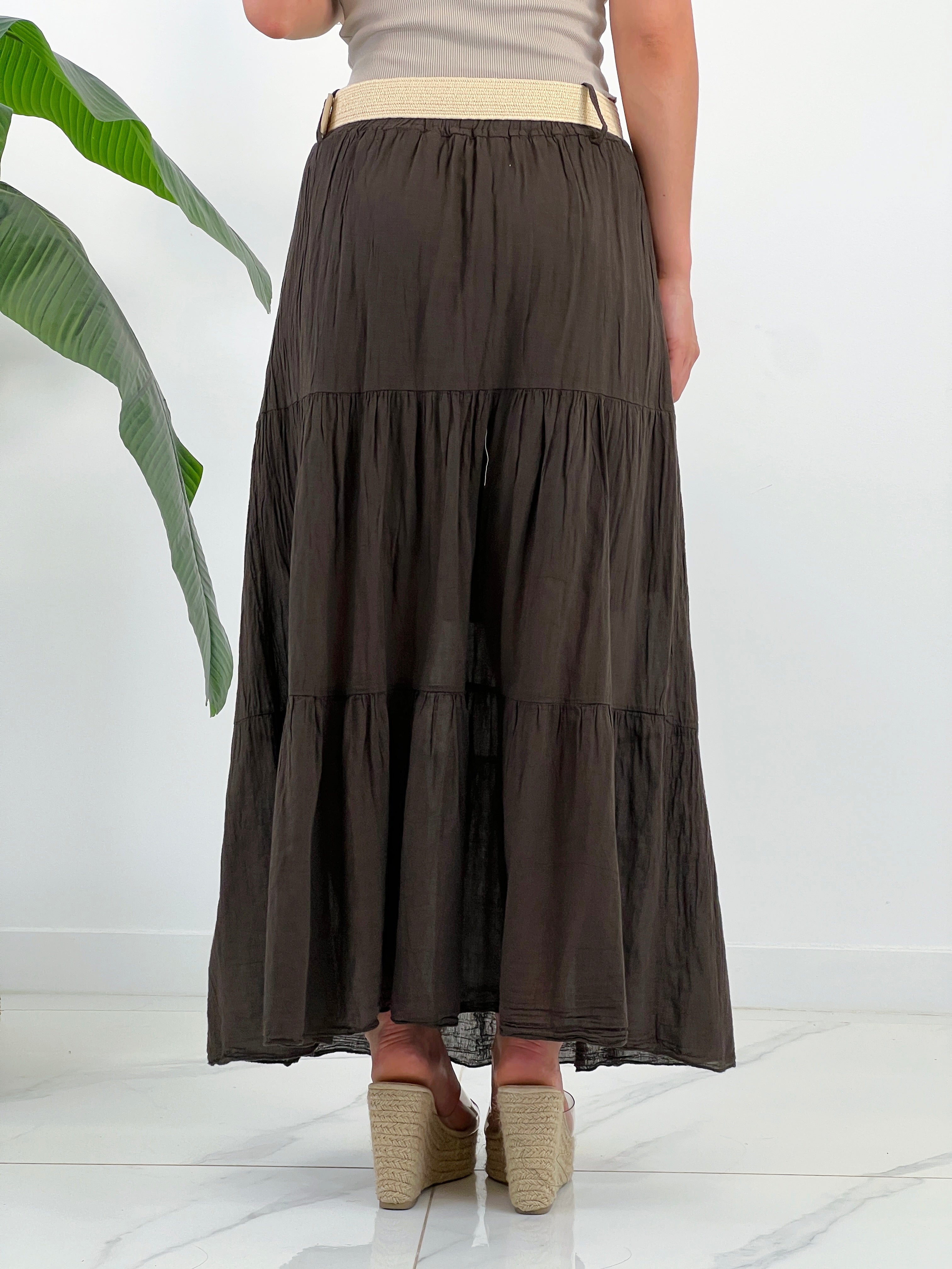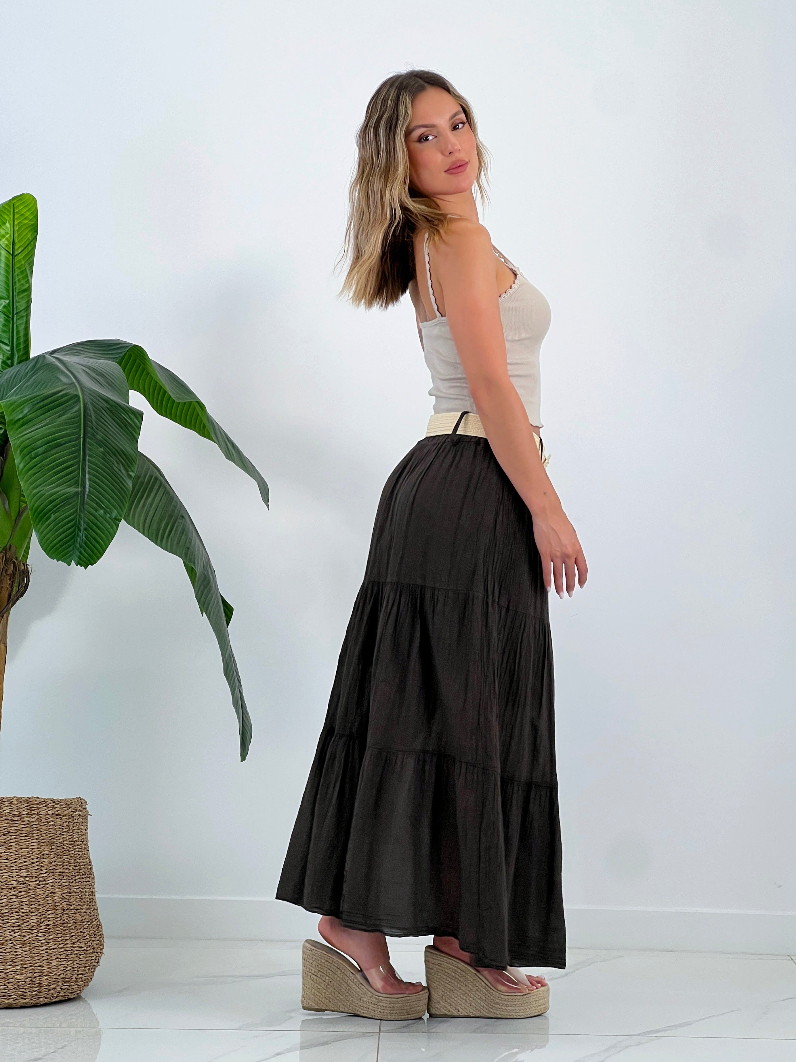 Faldilla llarga de cotó amb disseny rústic i elegants volants que aporten moviment i textura. Confeccionada amb materials de qualitat per garantir durabilitat i comoditat durant tot el dia. Inclou cinturó a joc per definir la silueta i adaptar-se perfectament a diferents estils. Ideal per combinar amb peces bàsiques en looks tant casuals com més elaborats.