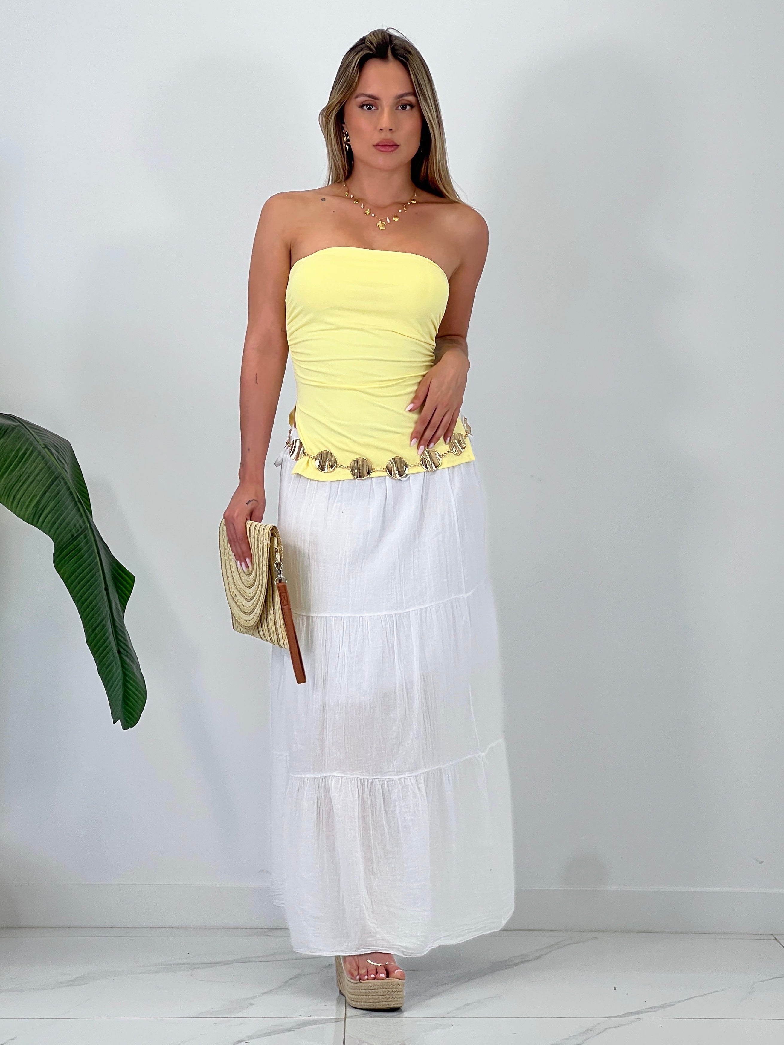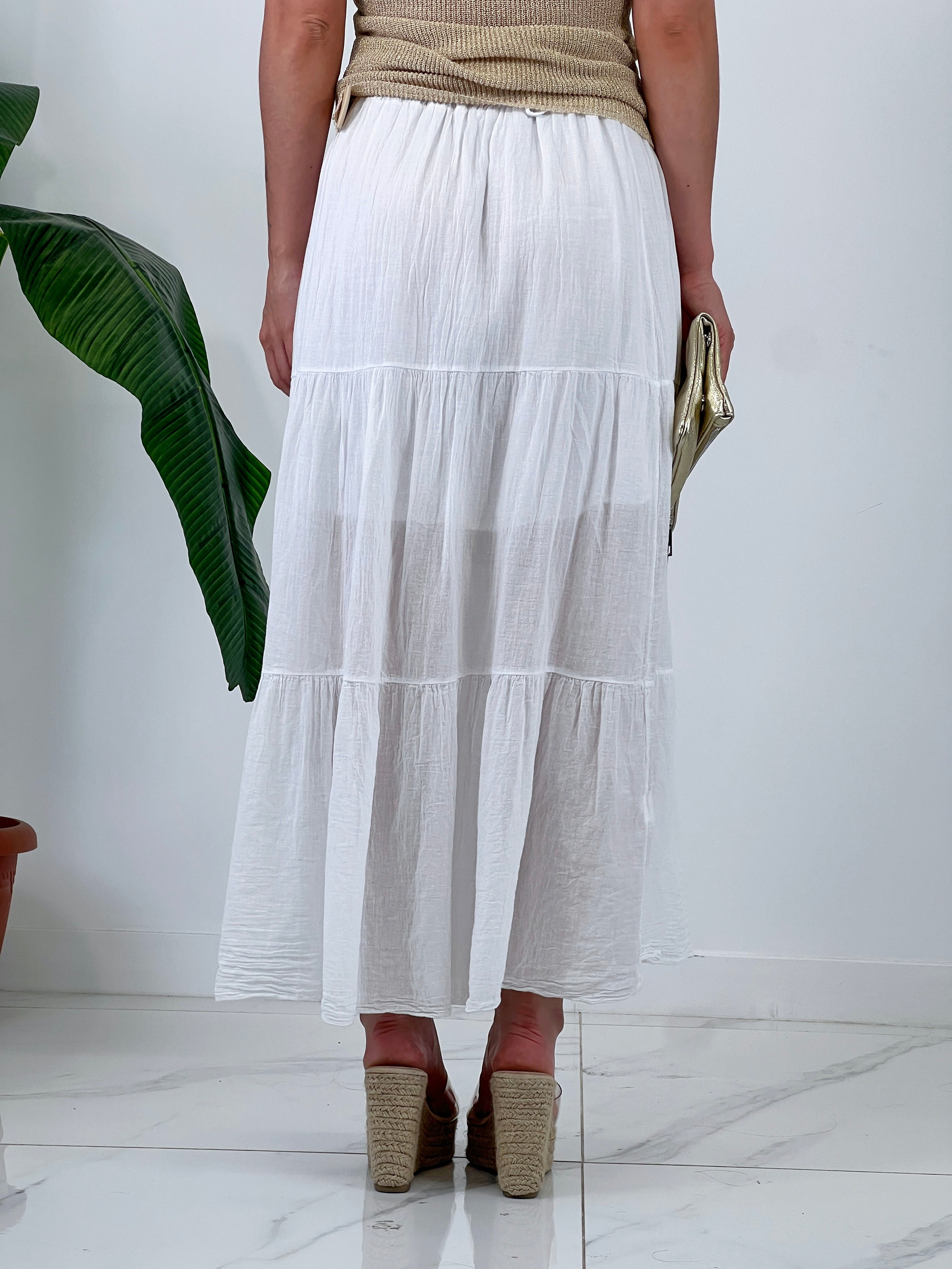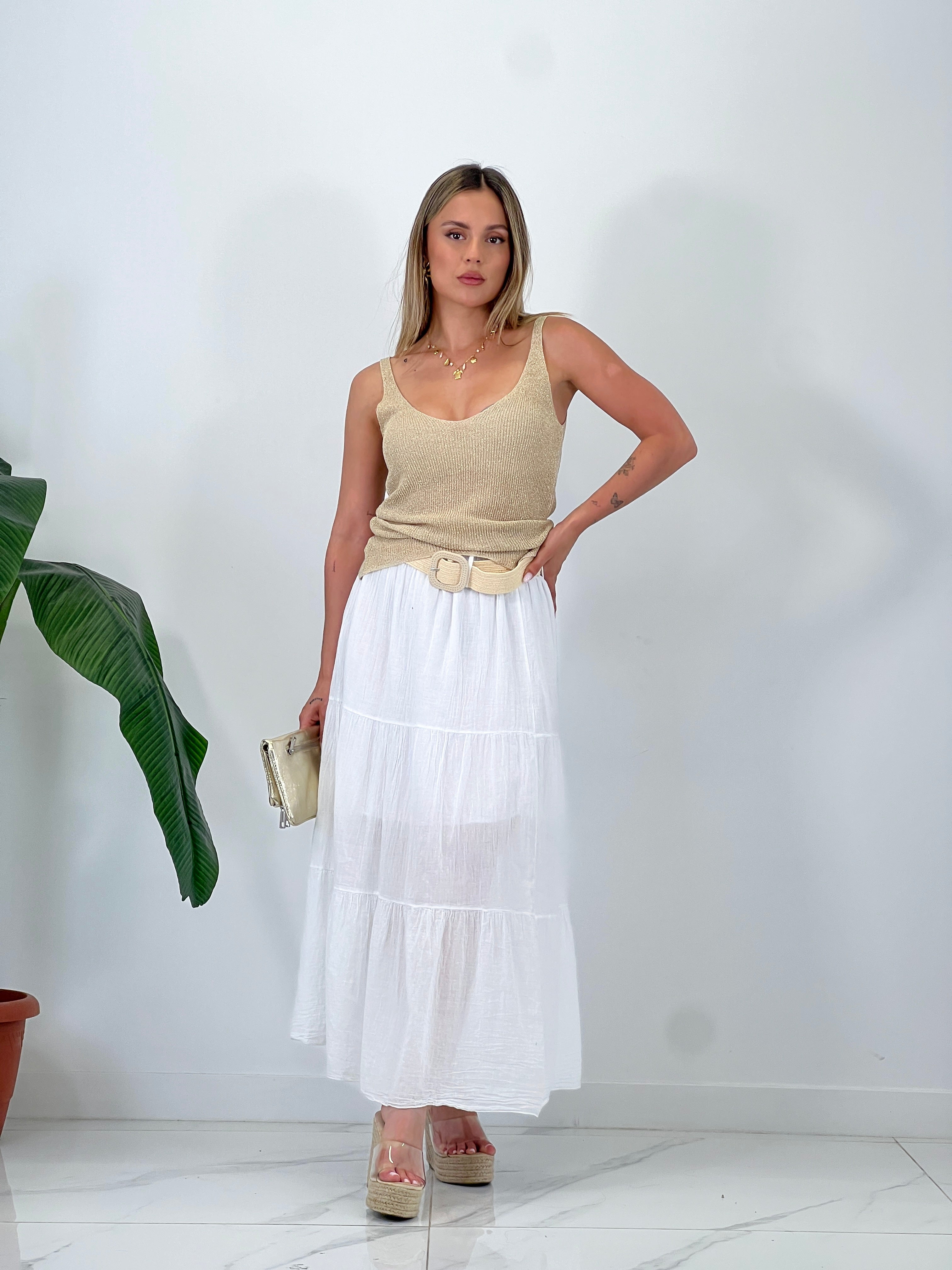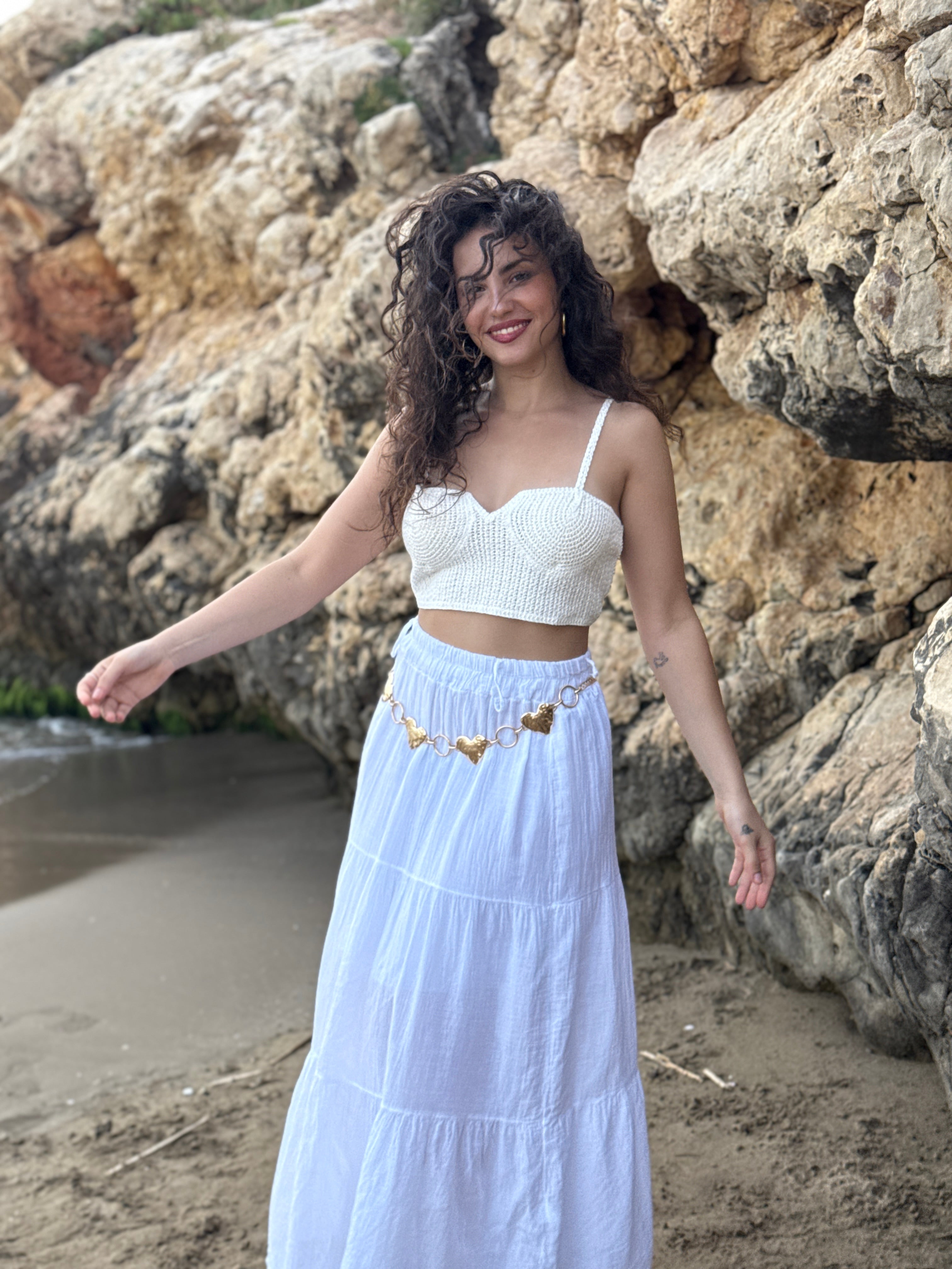 Faldilla llarga de cotó amb disseny rústic i elegants volants que aporten moviment i textura. Confeccionada amb materials de qualitat per garantir durabilitat i comoditat durant tot el dia. Inclou cinturó a joc per definir la silueta i adaptar-se perfectament a diferents estils. Ideal per combinar amb peces bàsiques en looks tant casuals com més elaborats.