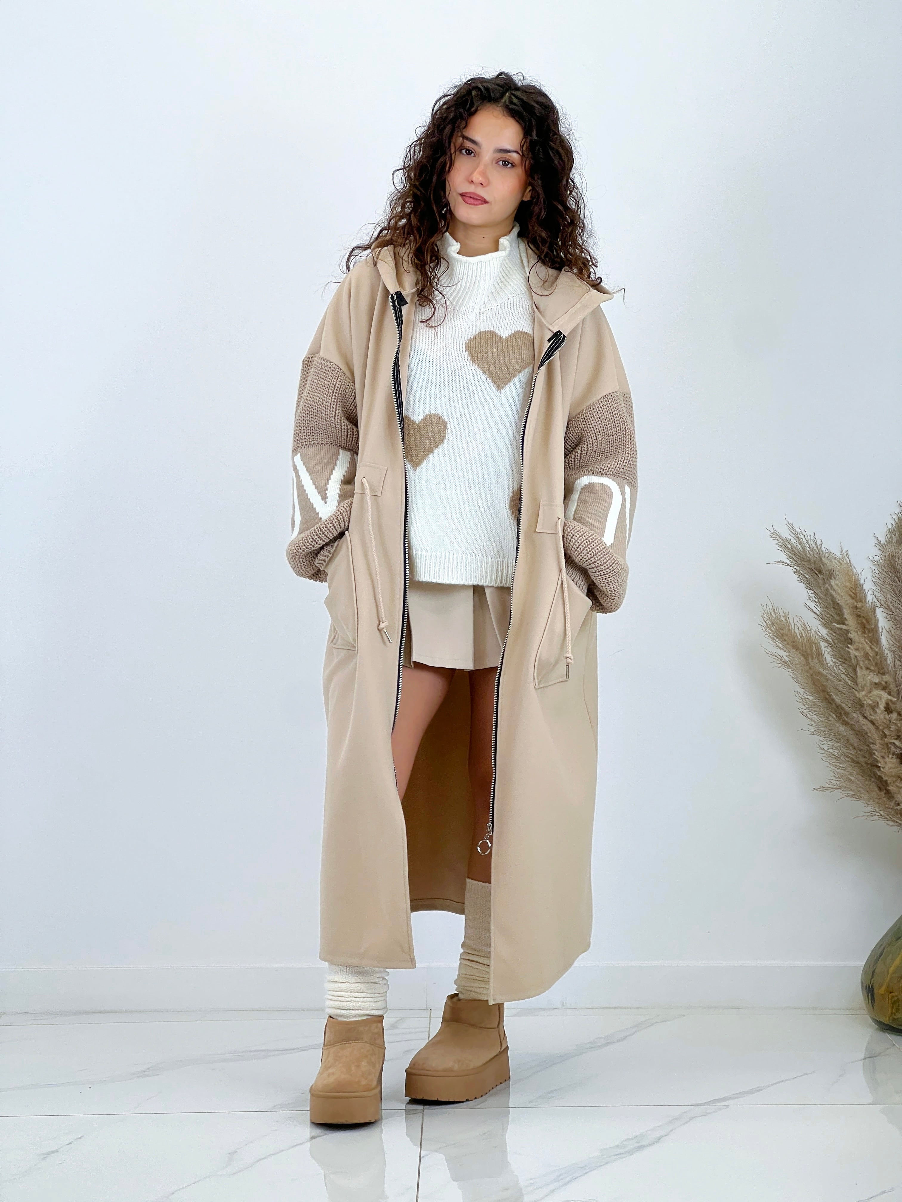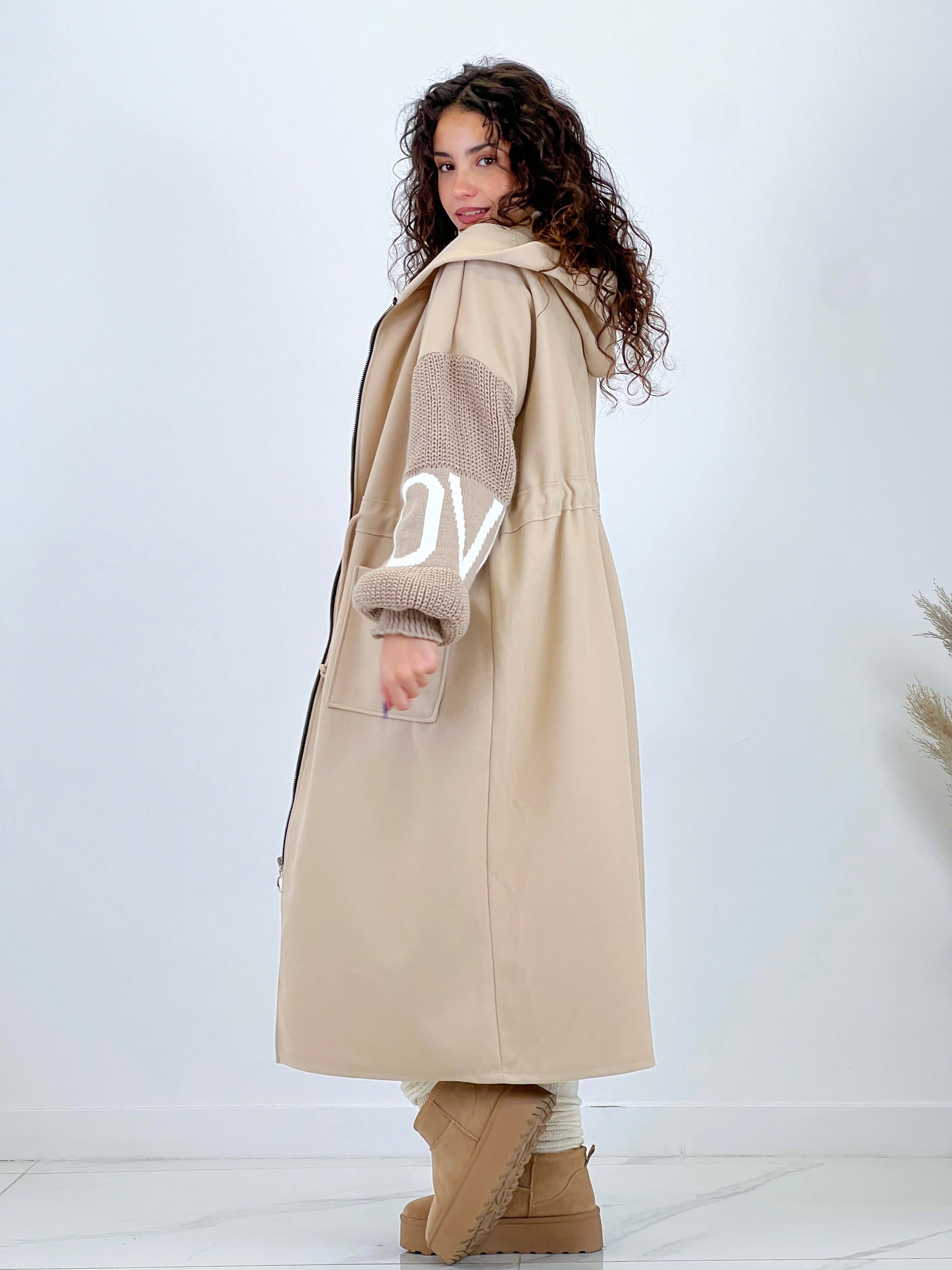 Abrigo largo con cuerpo de paño y manga larga con puño en tejido tricot y detalle de print LOVE. Capucha, cierre de cremallera y cordón ajustable a la cintura.
