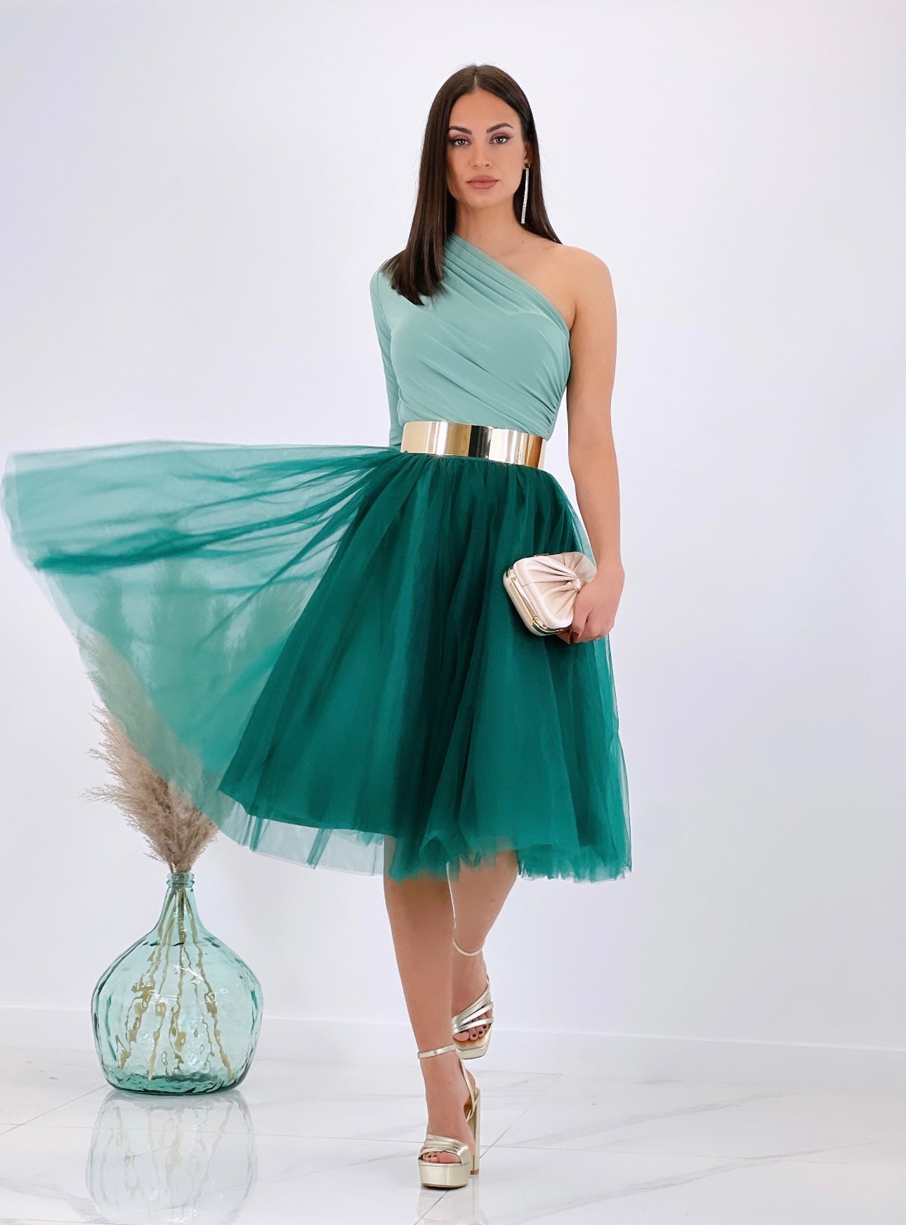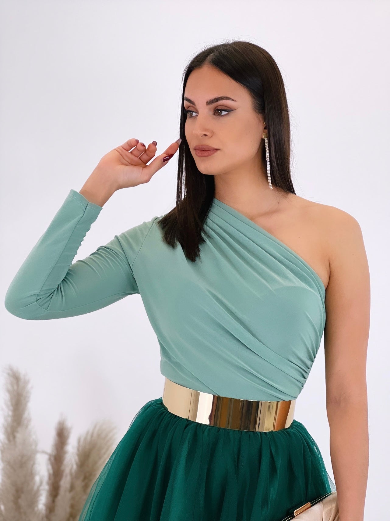 Este body asimétrico presenta un elegante escote diagonal y una manga única, con un efecto drapeado que acentúa tu silueta. Con hombro al descubierto y cierre de corchetes en la espalda, es una opción moderna y versátil para lucir en cualquier ocasión.
