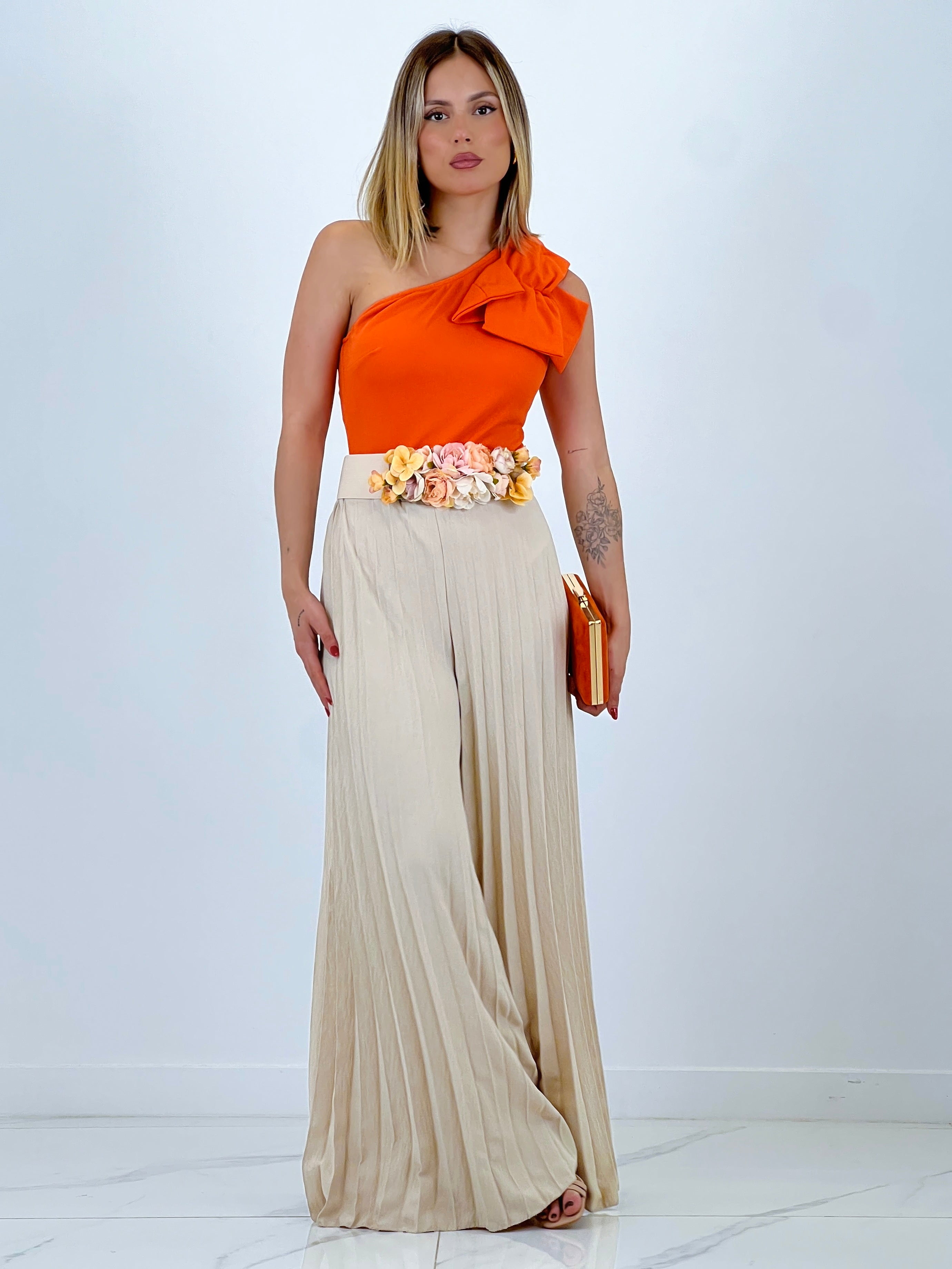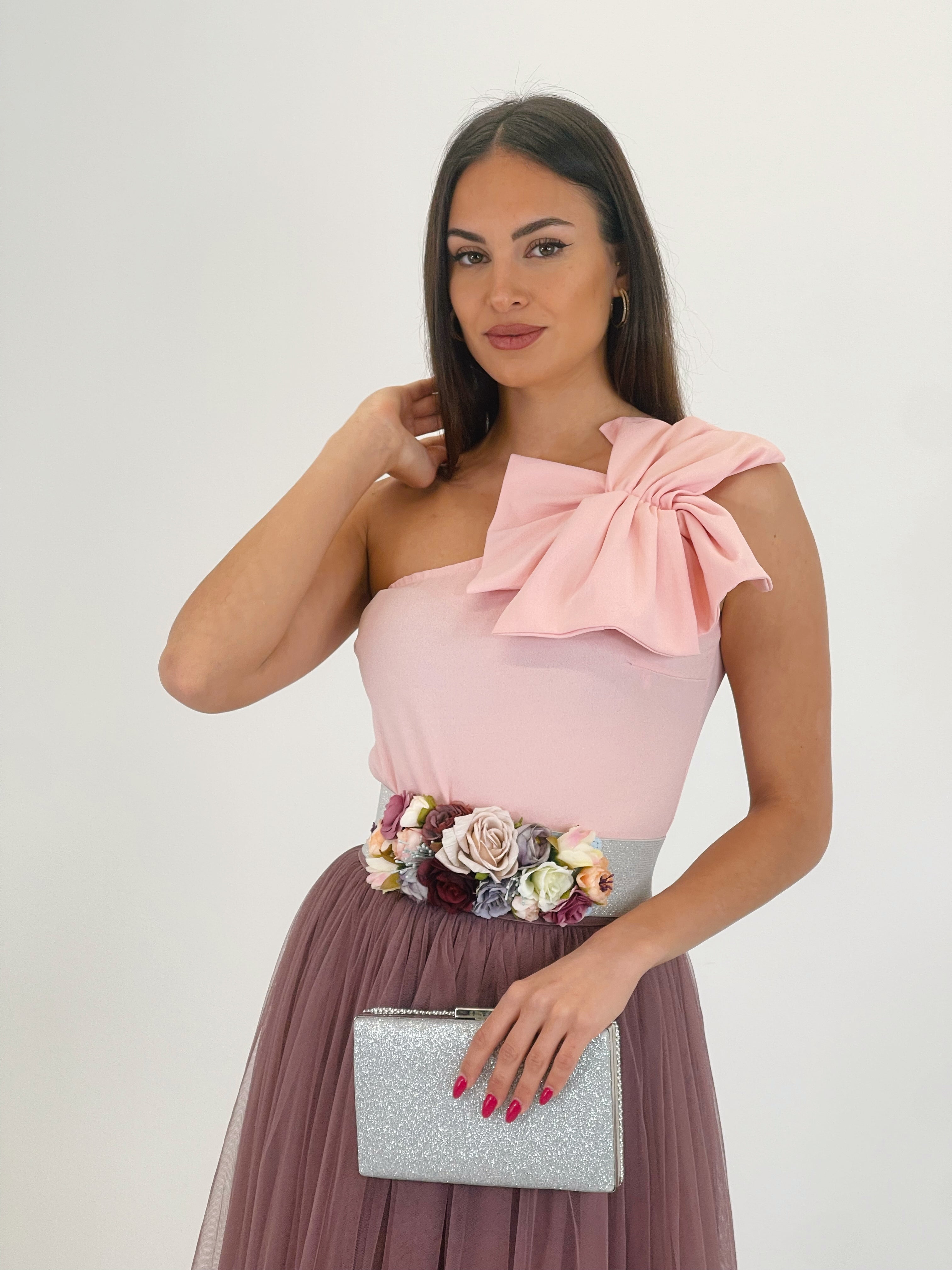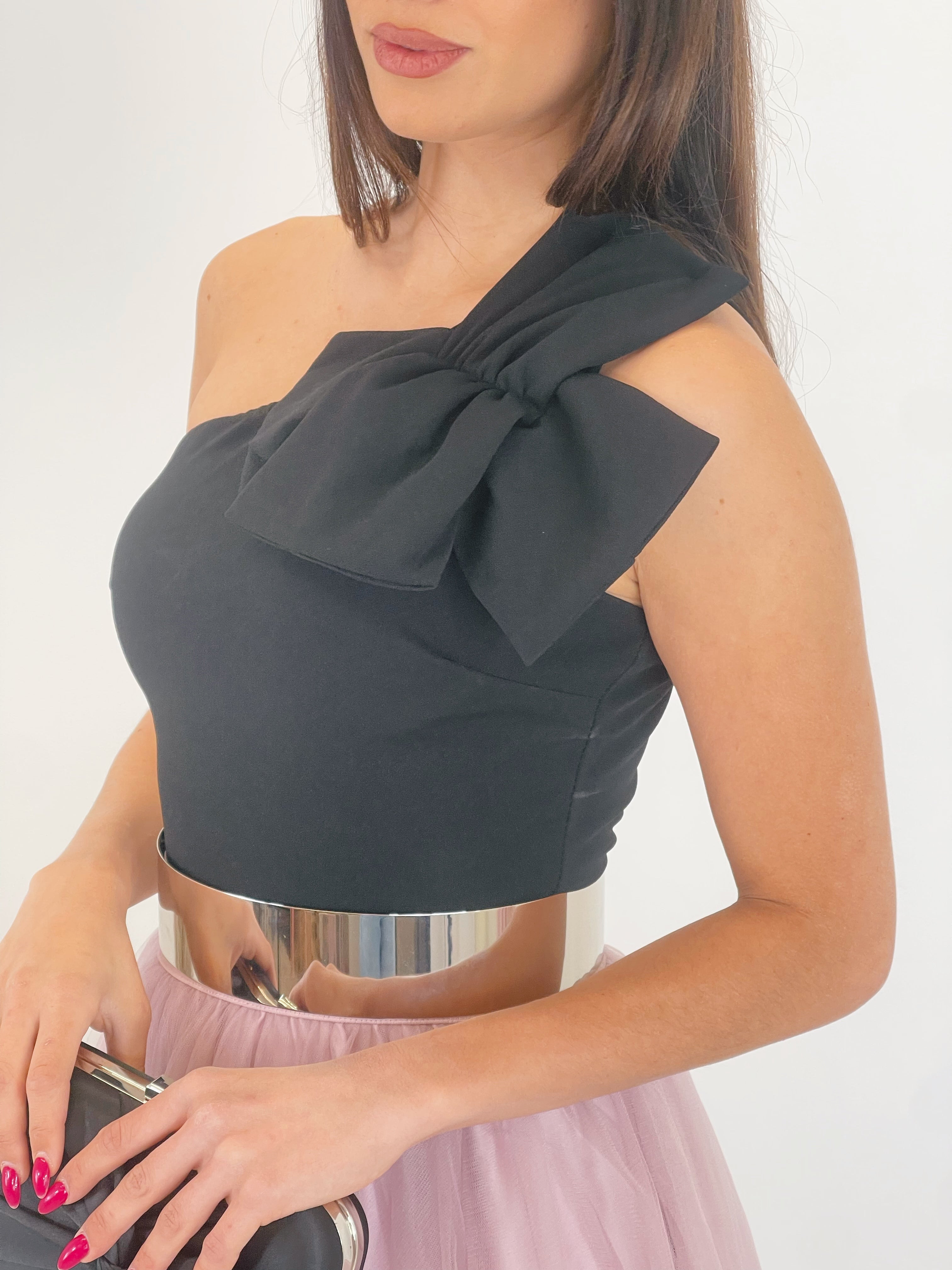 Este body asimétrico cuenta con un único tirante decorado con un lazo en la parte delantera del hombro. Su diseño original y elegante te hará destacar en cualquier evento, mientras que su corte asimétrico te permite lucir un estilo único y moderno.