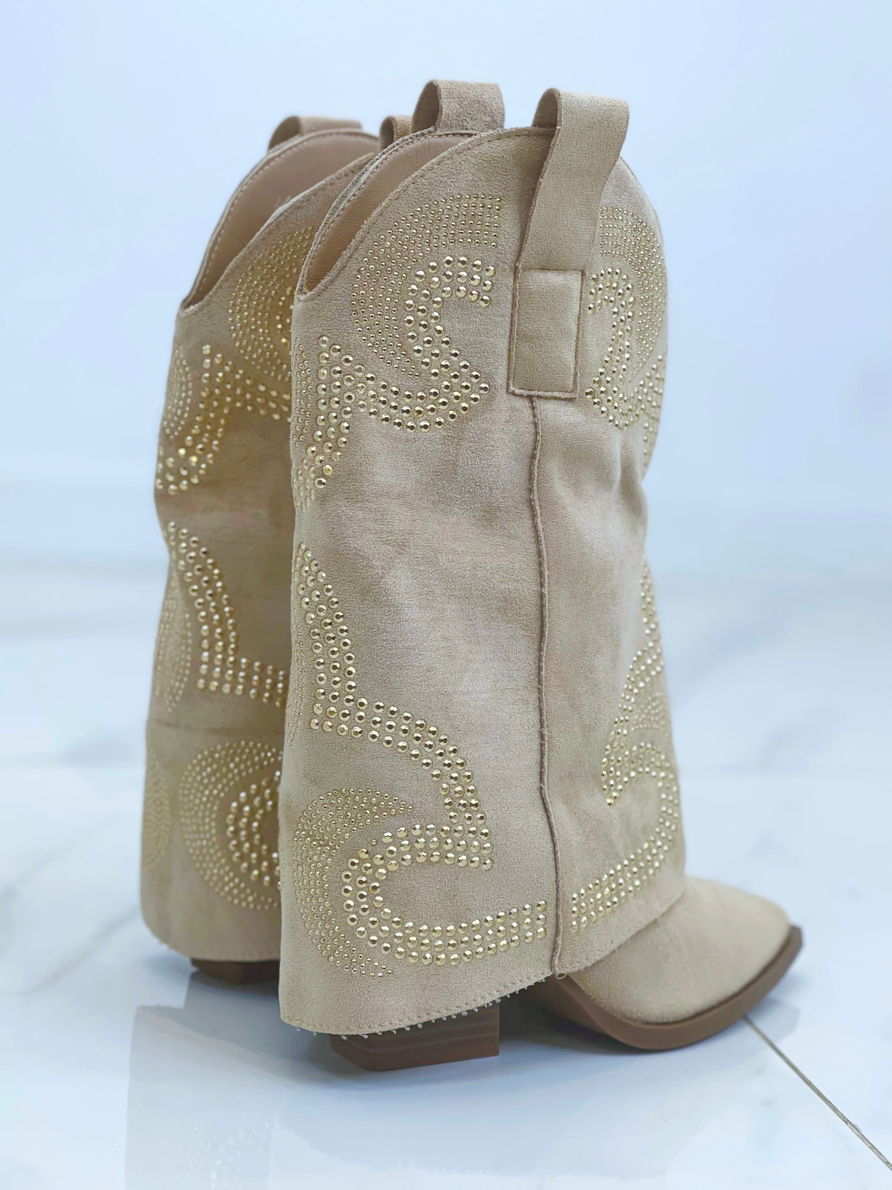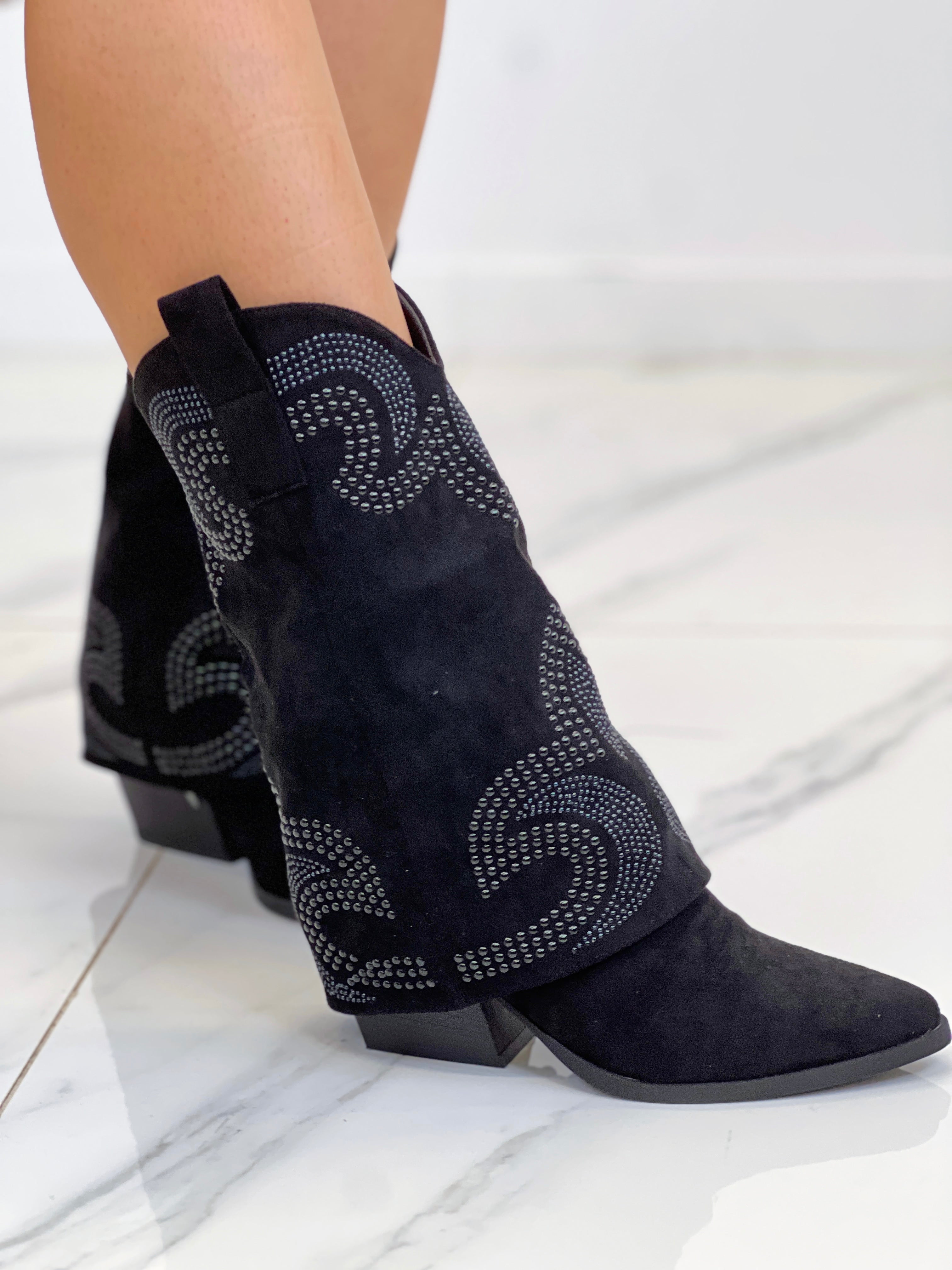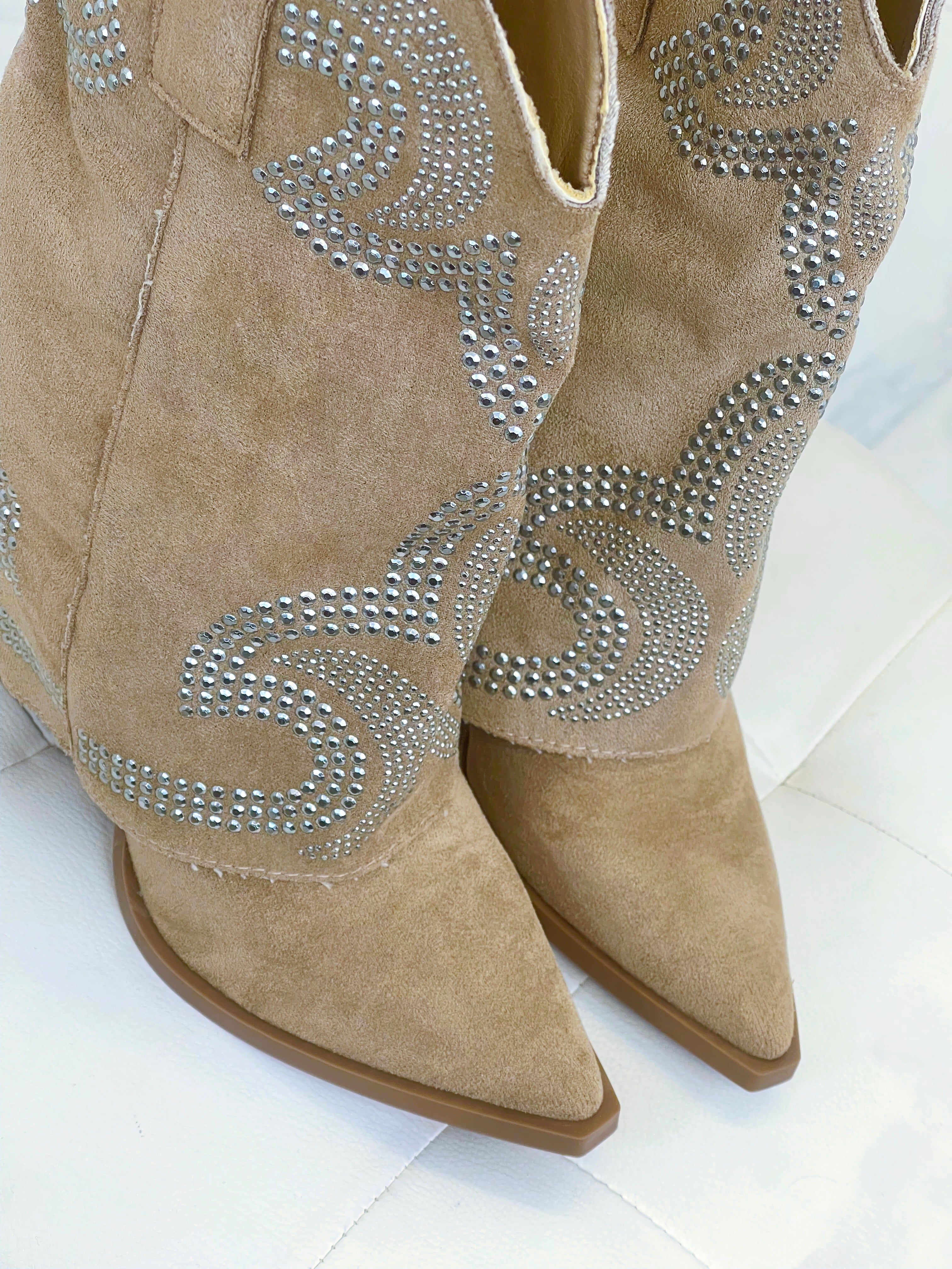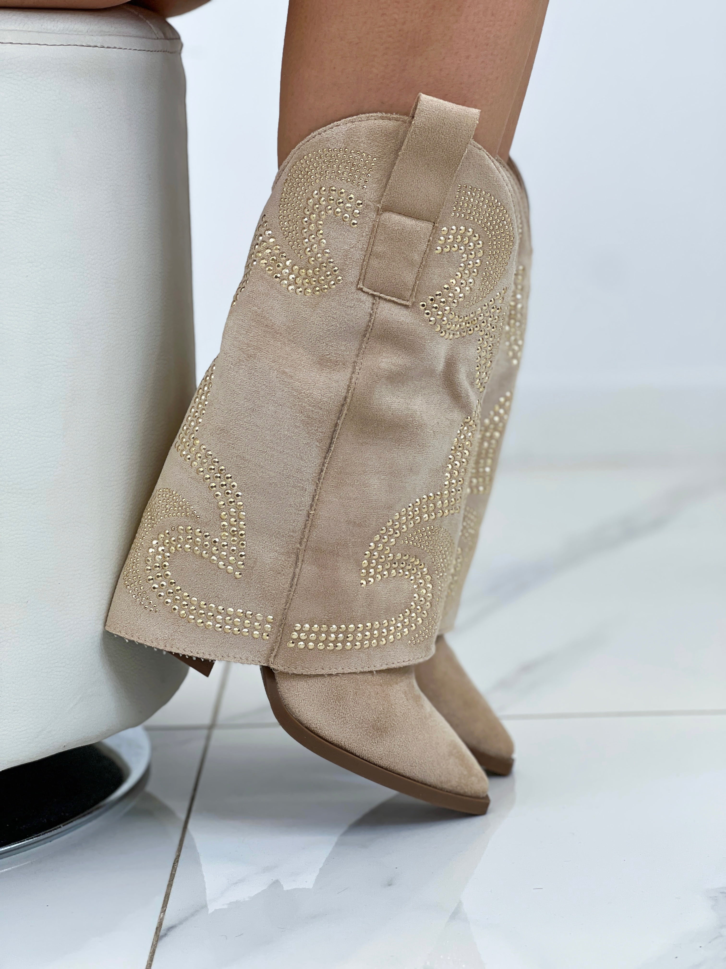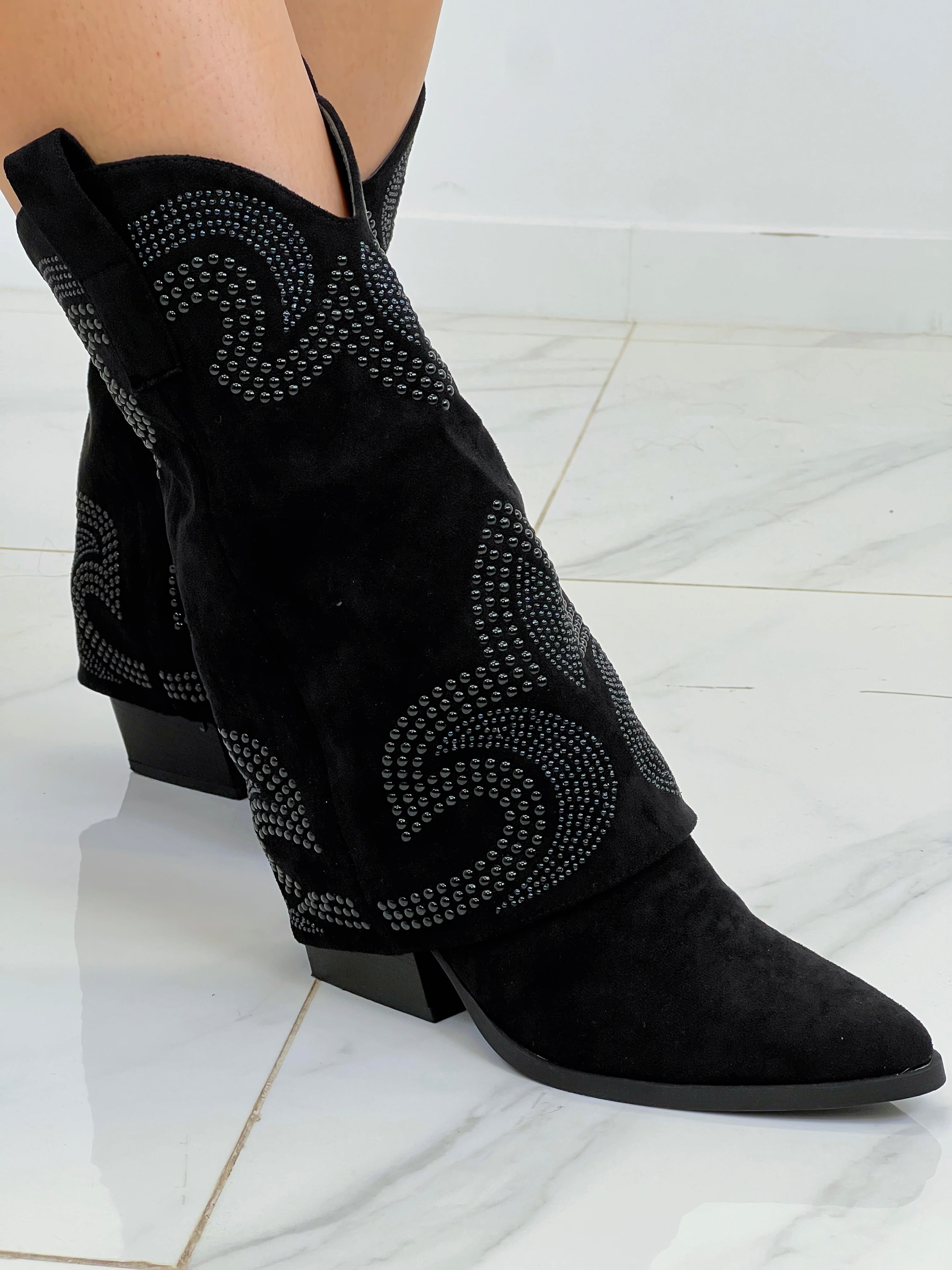 Bota cowboy por debajo de la rodilla con el detalle de pedrería y tacón de madera.
