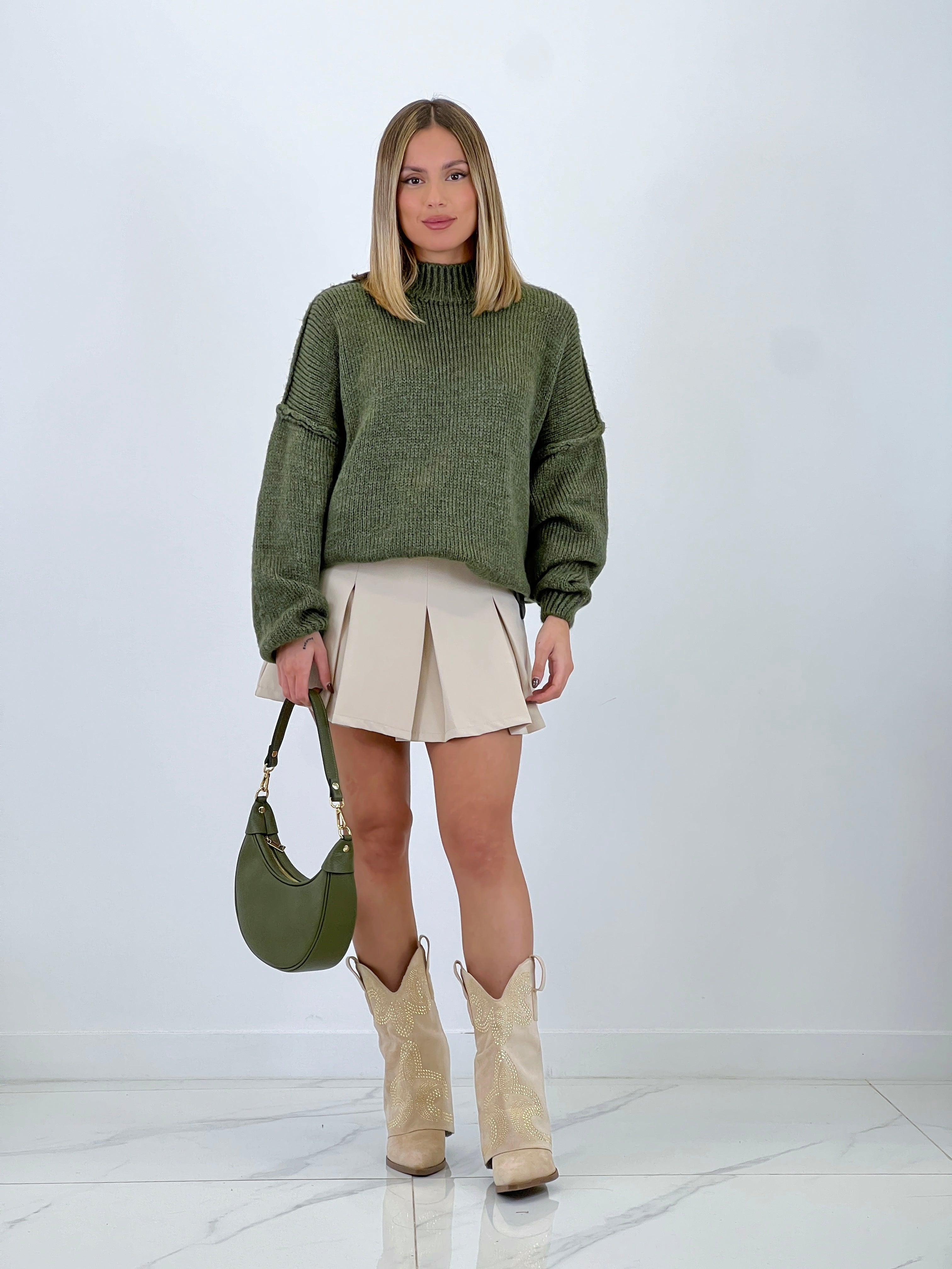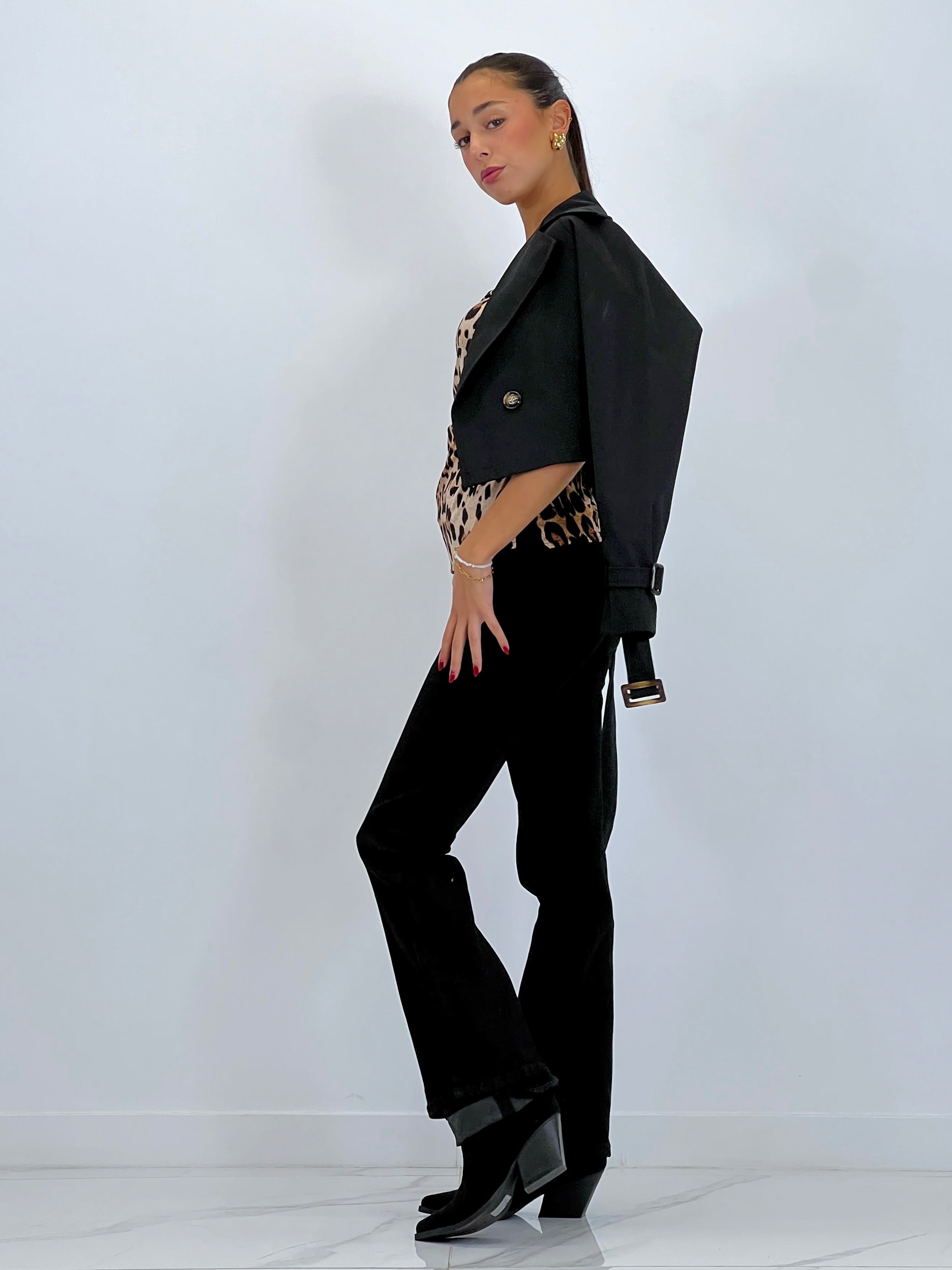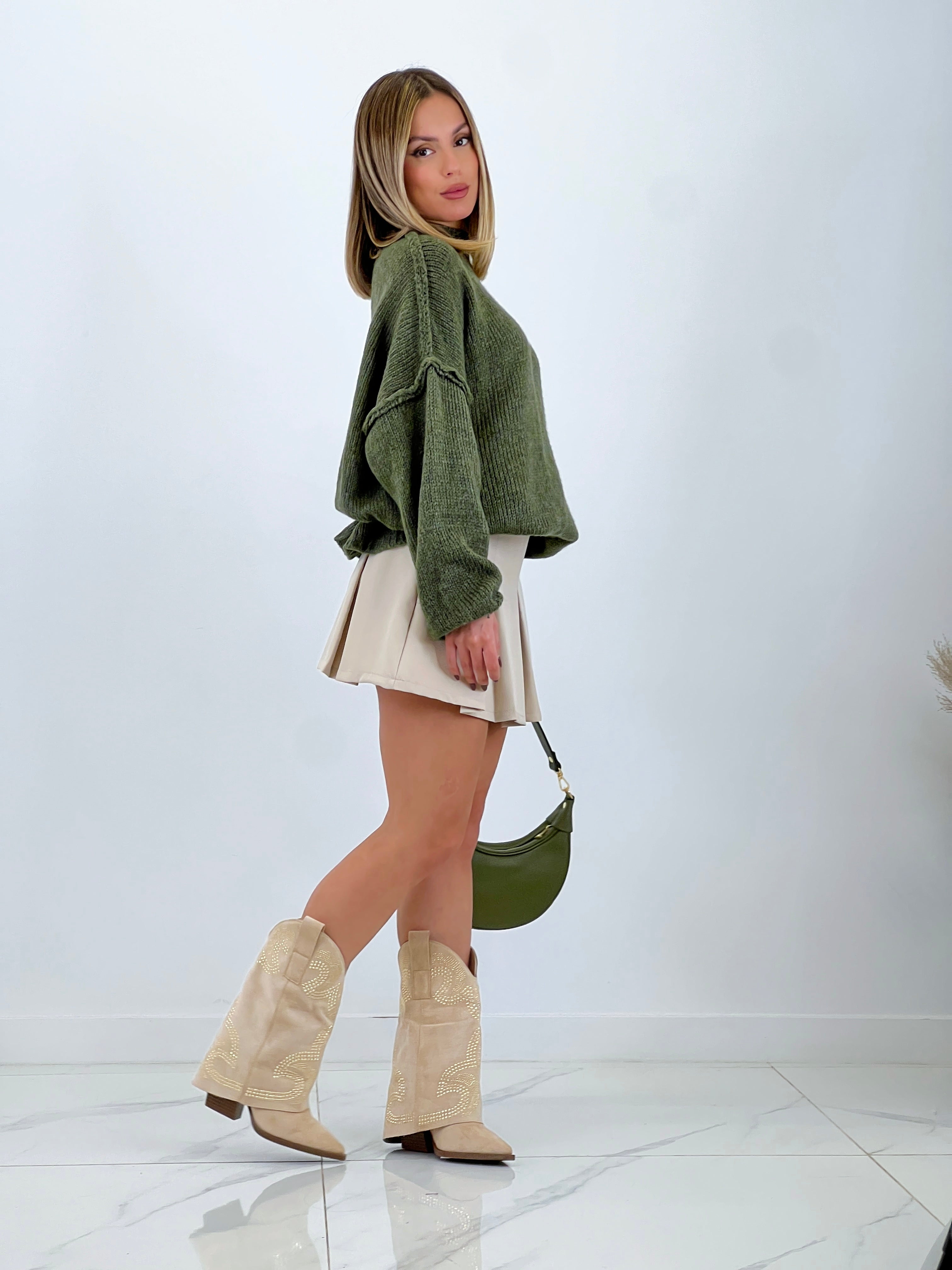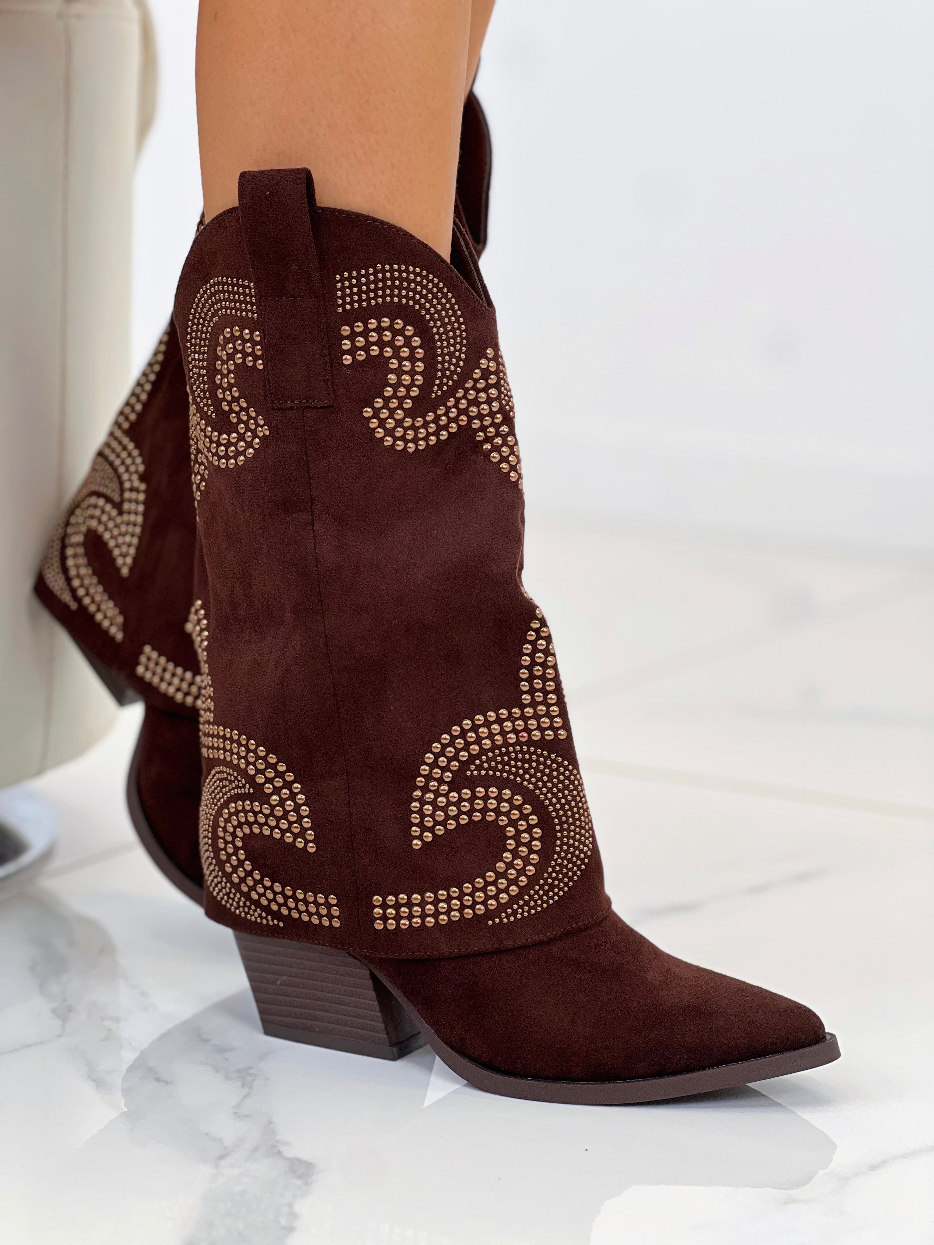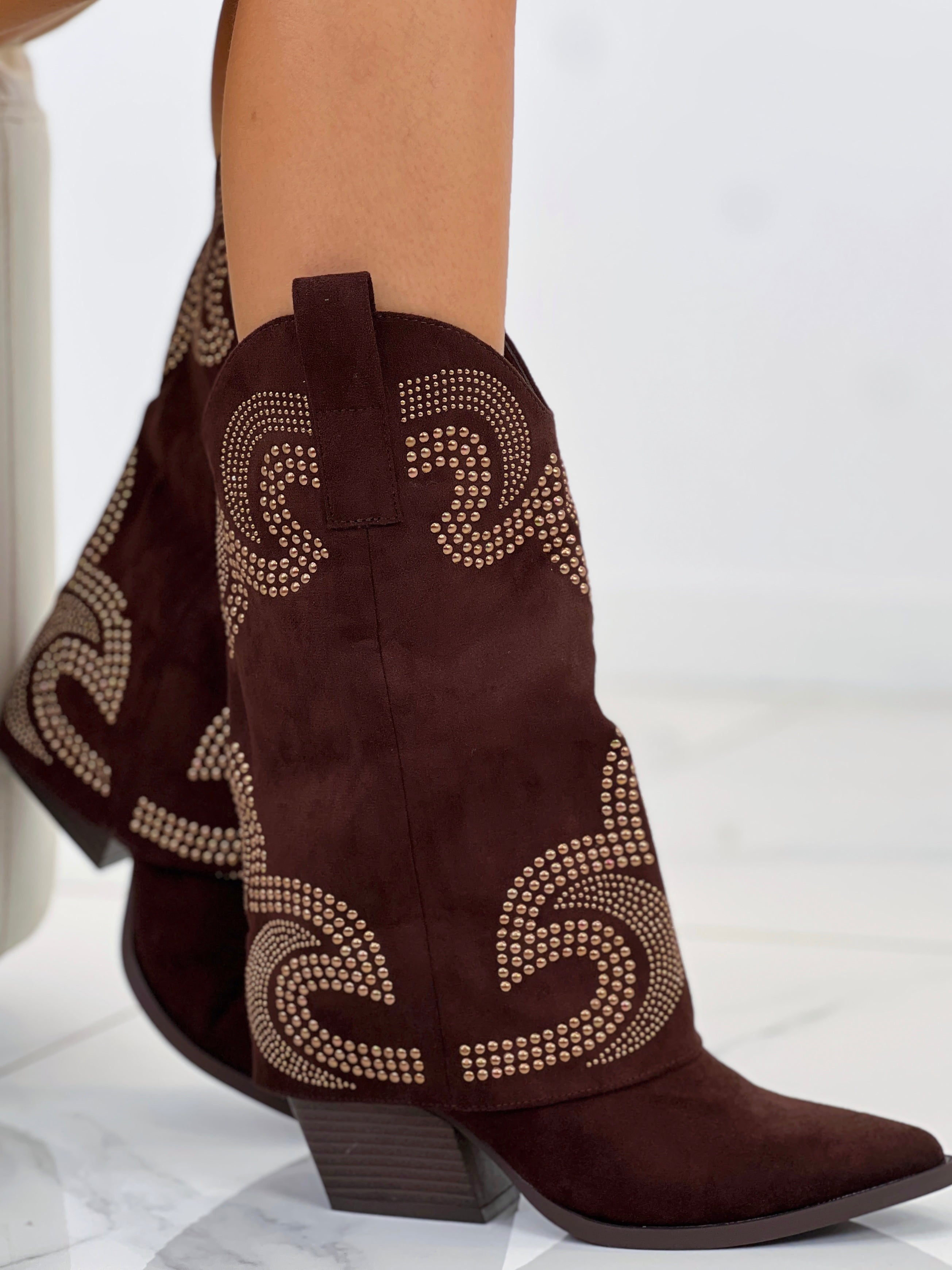 Bota cowboy por debajo de la rodilla con el detalle de pedrería y tacón de madera.