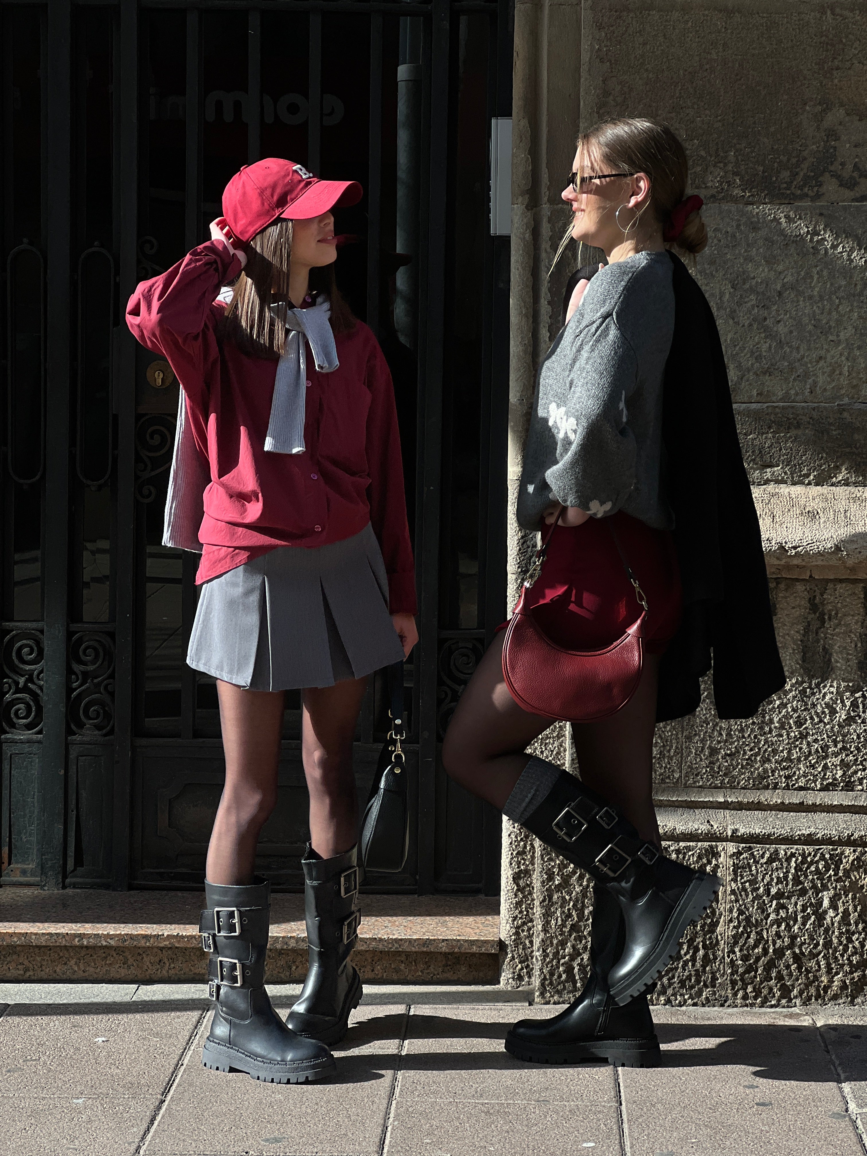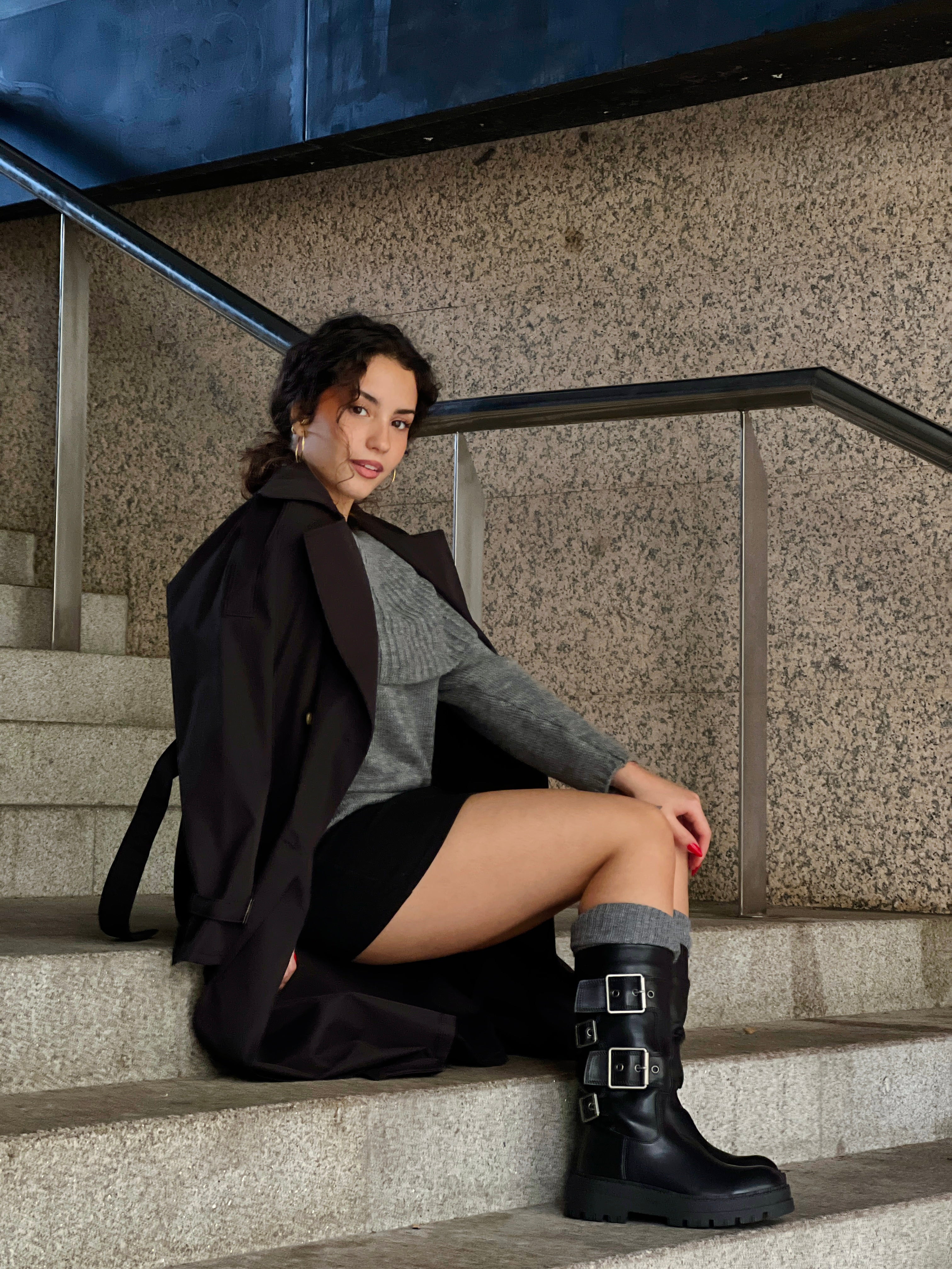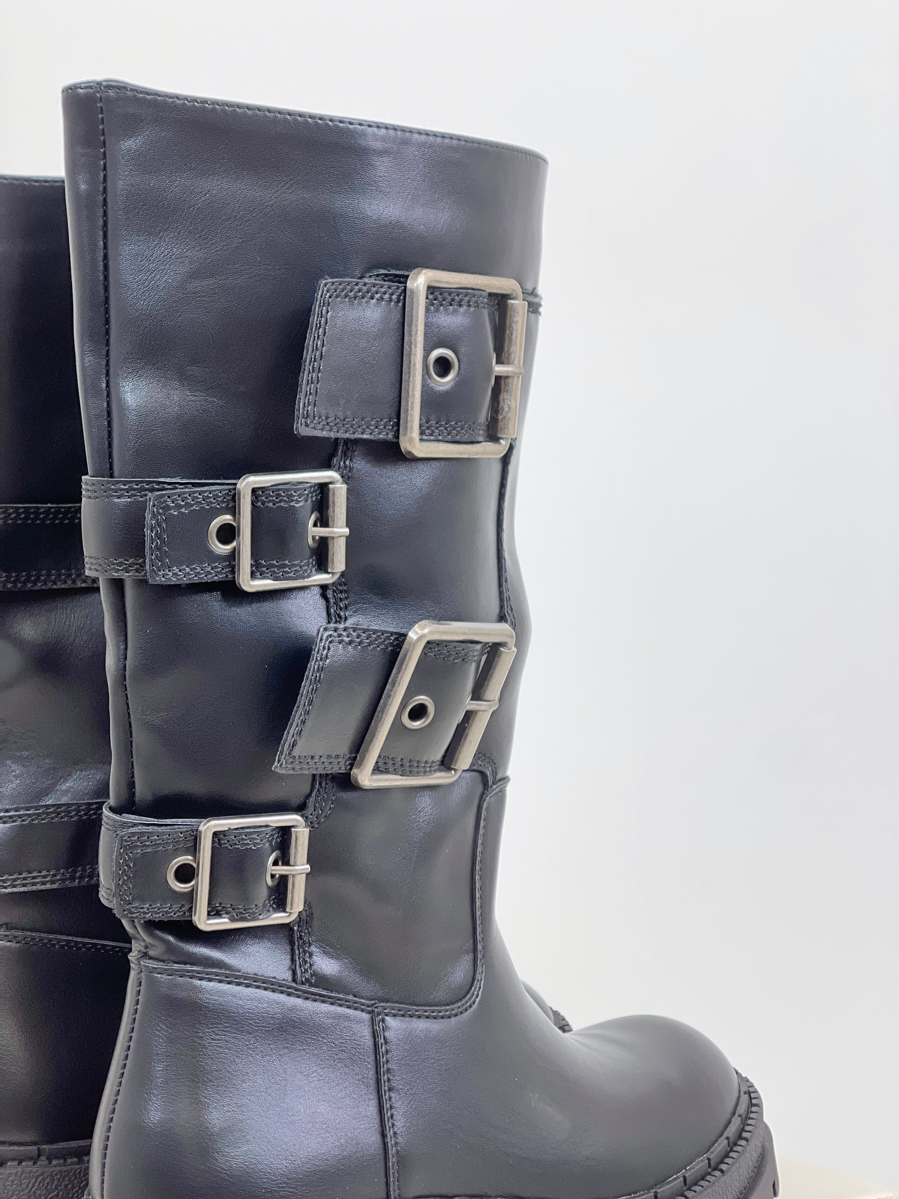 Bota de media caña negra, con punta redonda. Detalle de hebillas en color plata. Suela track, cremallera en la parte interior. Material de piel vegana.
