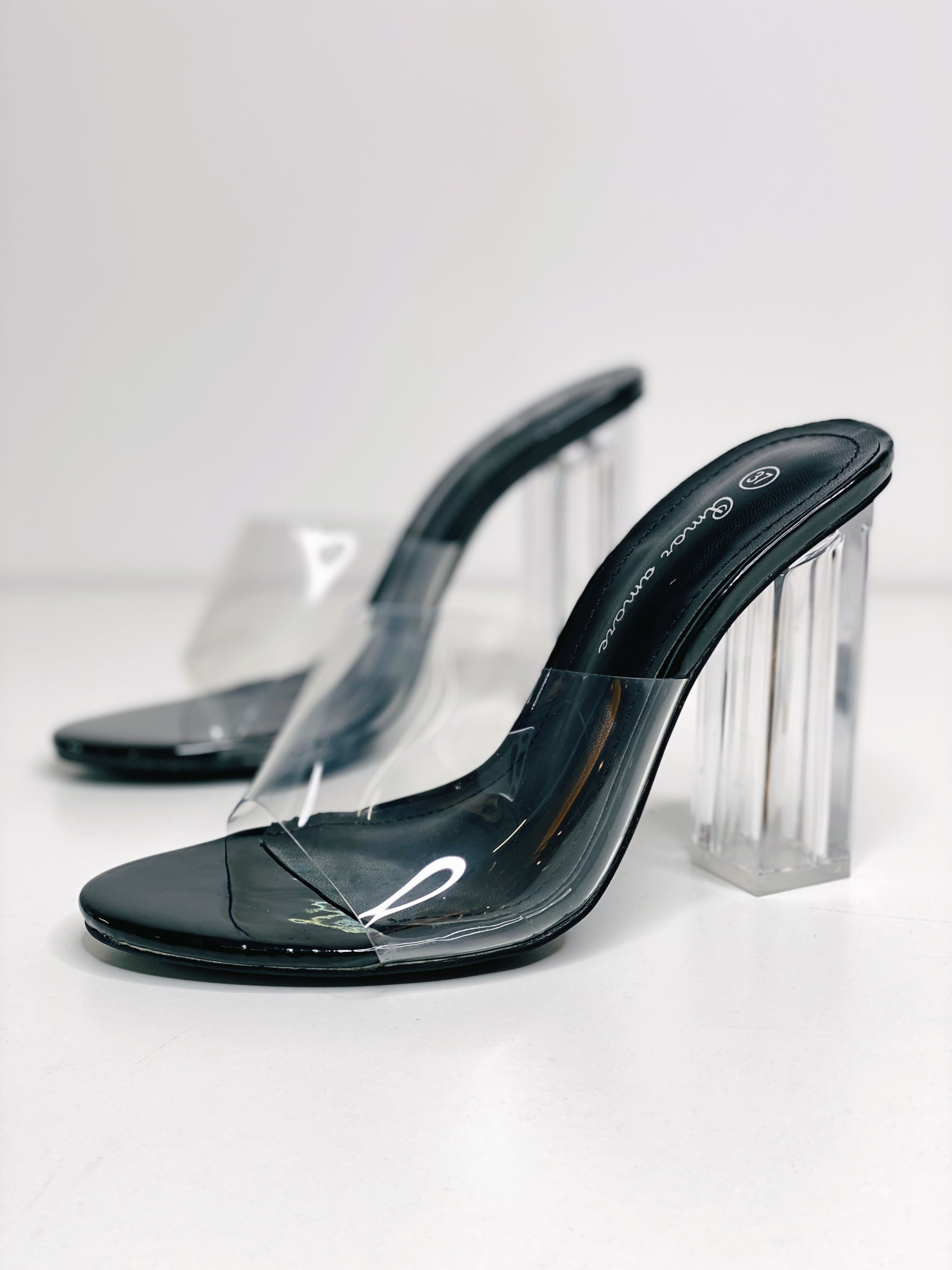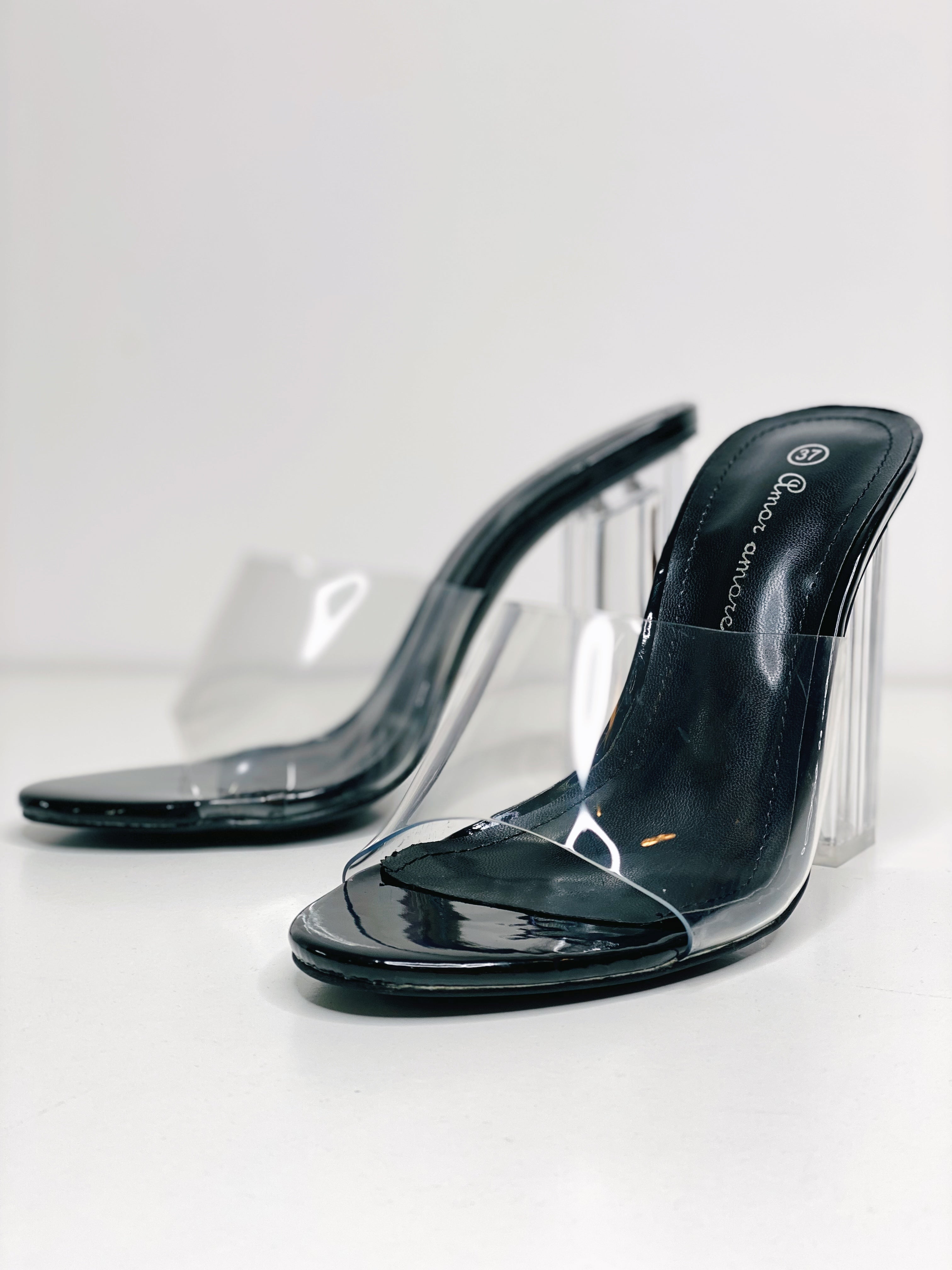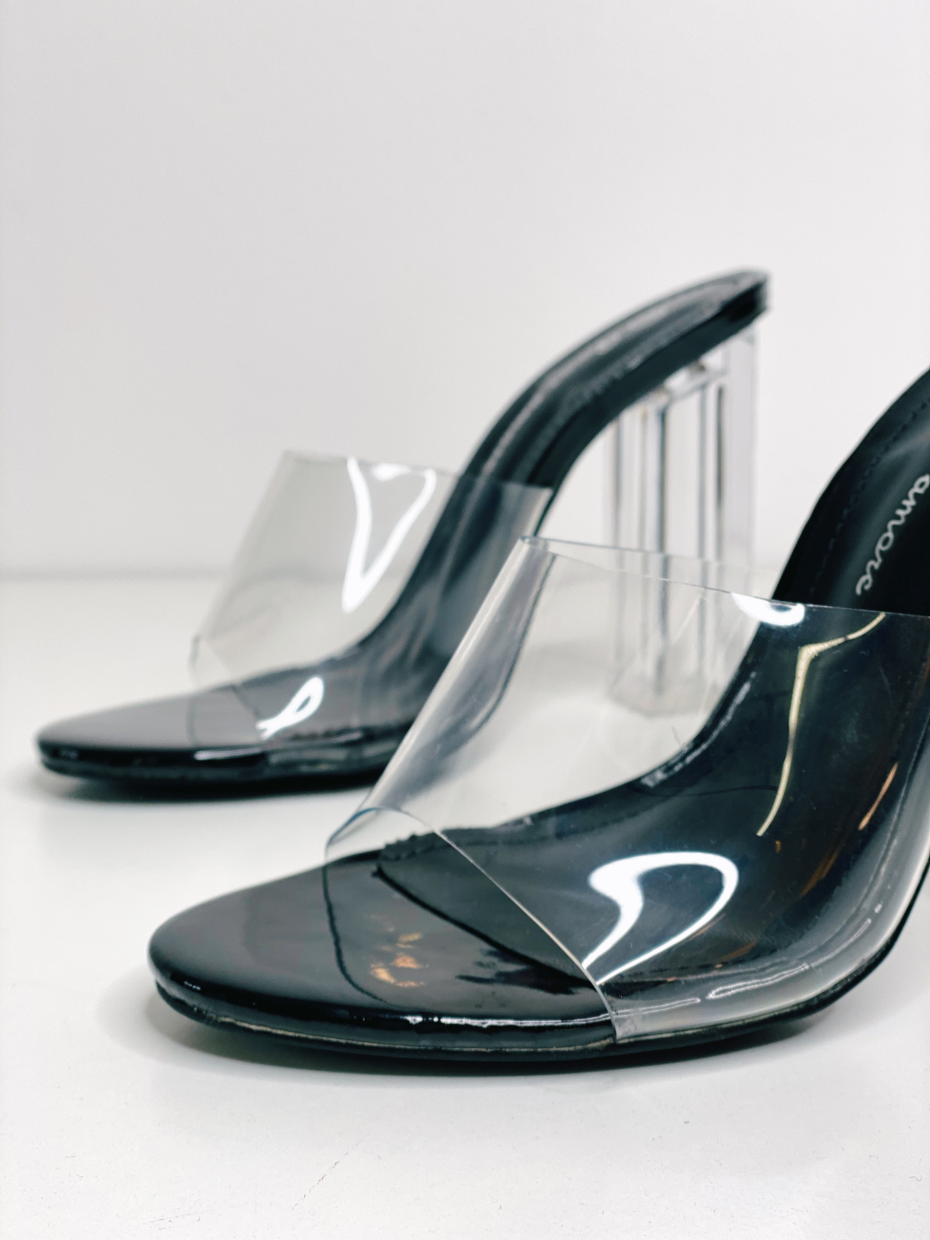 Sandalia de vinilo con tira ancha en parte delantera. Tacón cuadrado ancho transparente.