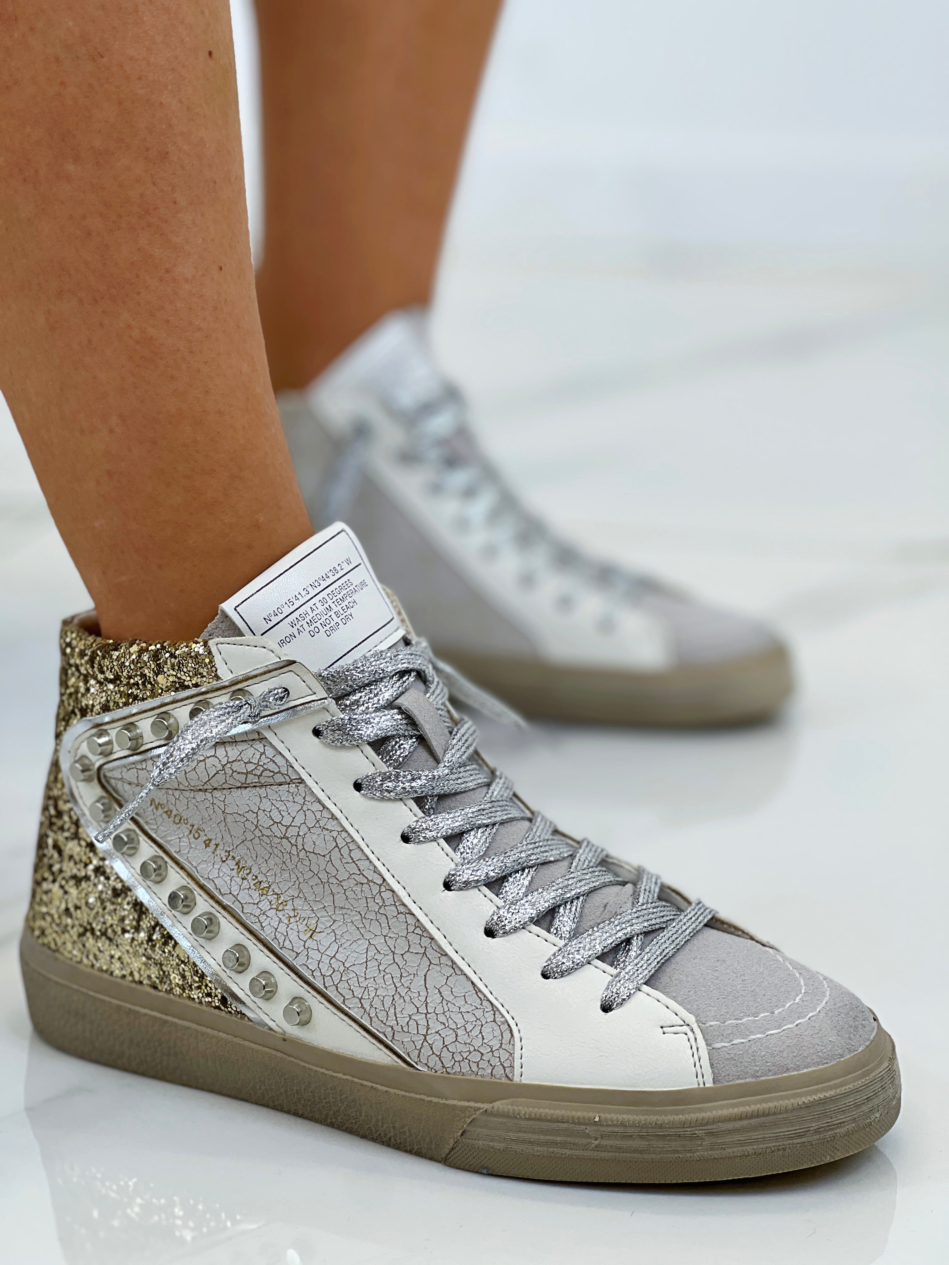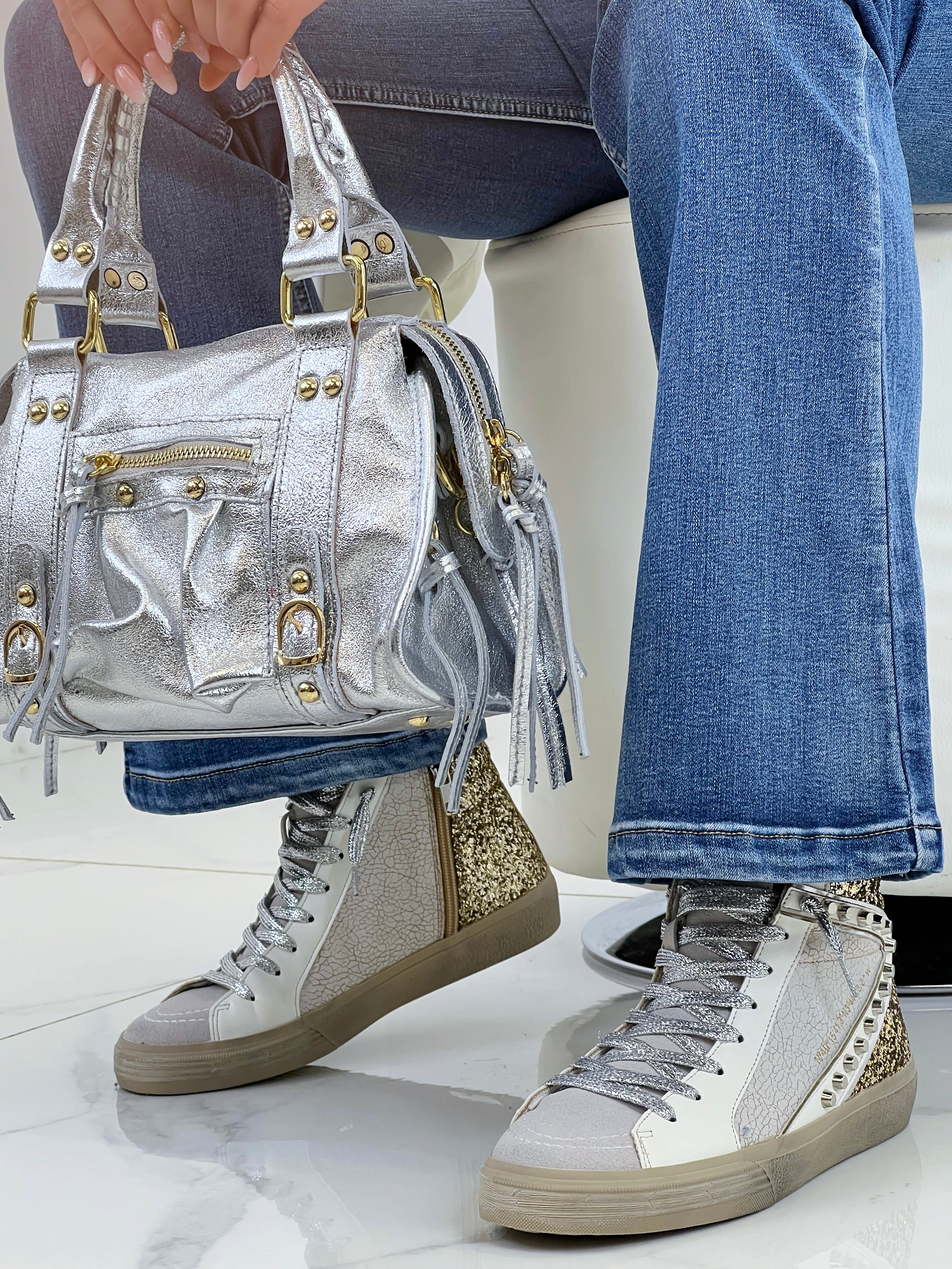 Zapatilla deportiva de estilo retro con combinación de materiales. Detalle de tachas. Cierre mediante cordones. Altura de la suela 2`5cm.