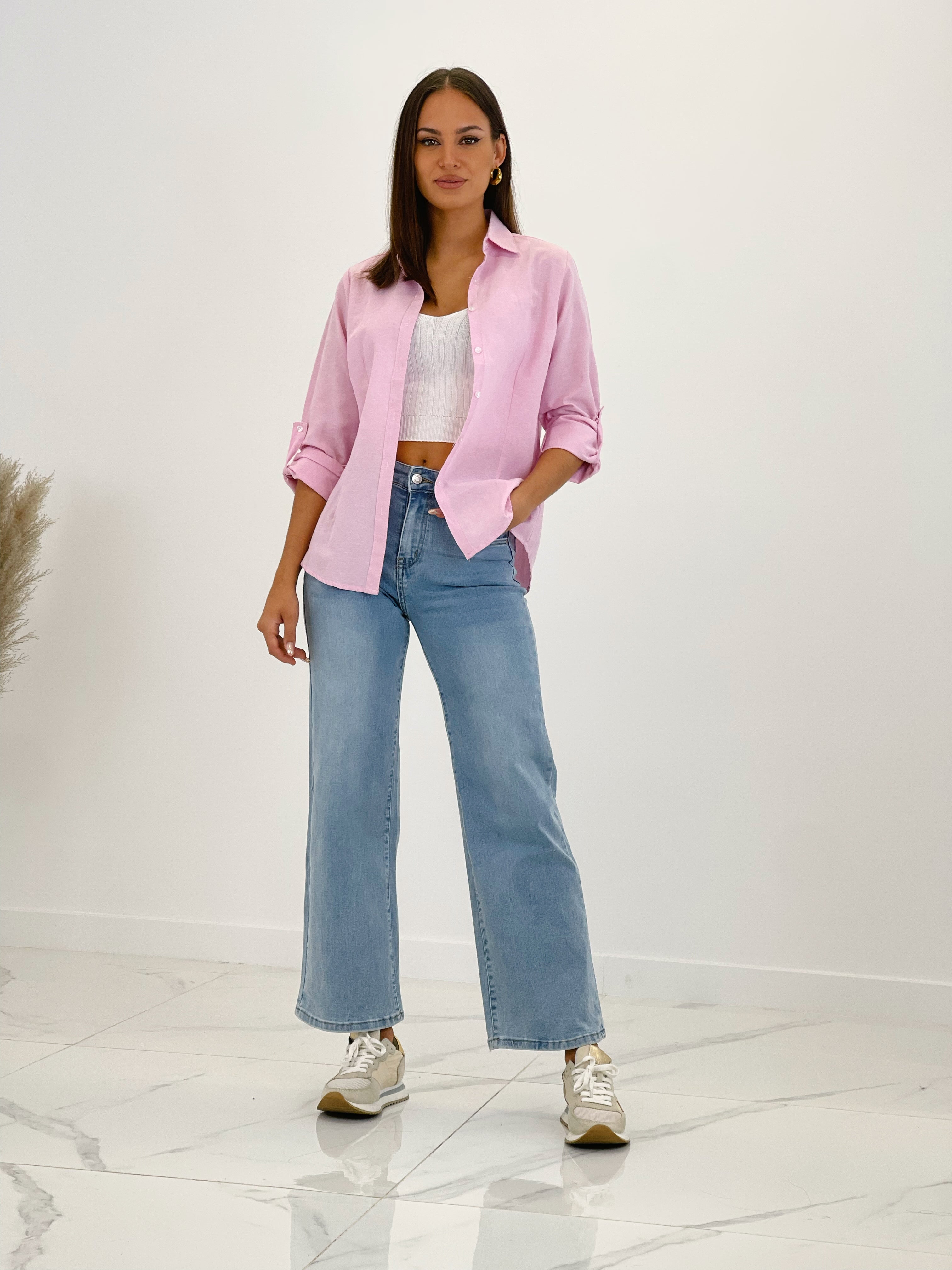 Camisa de manga larga con cuello y cierre de botones. Detalle de botón en la manga para poder recogerlas. Ligeramente más larga en la parte trasera.