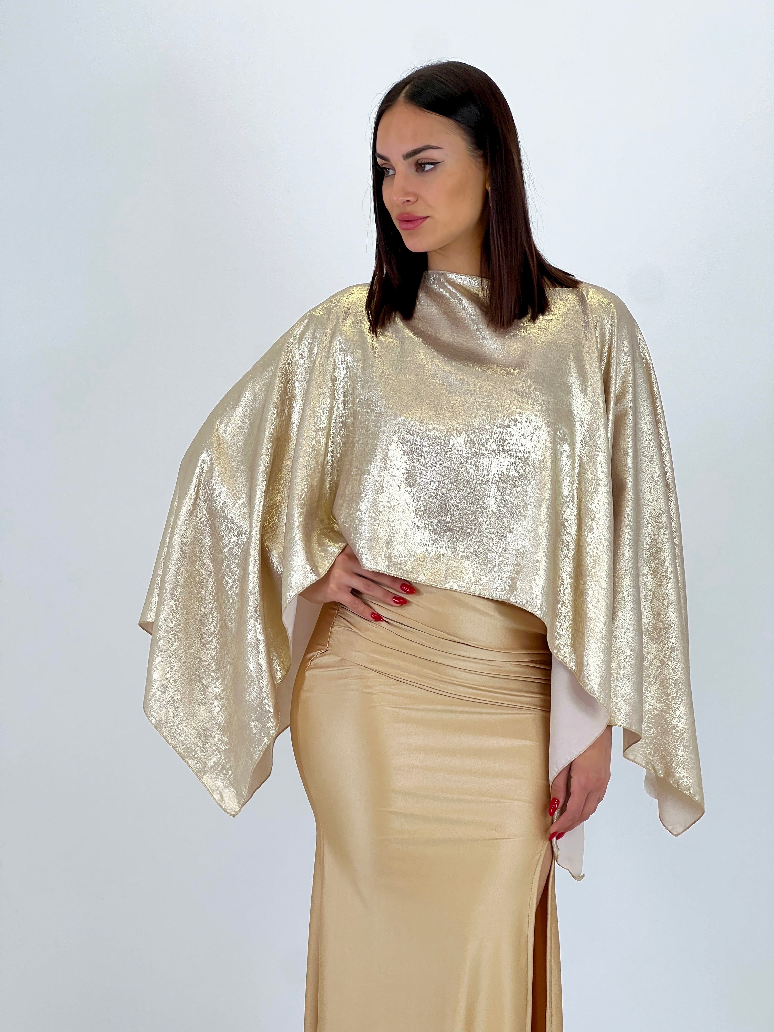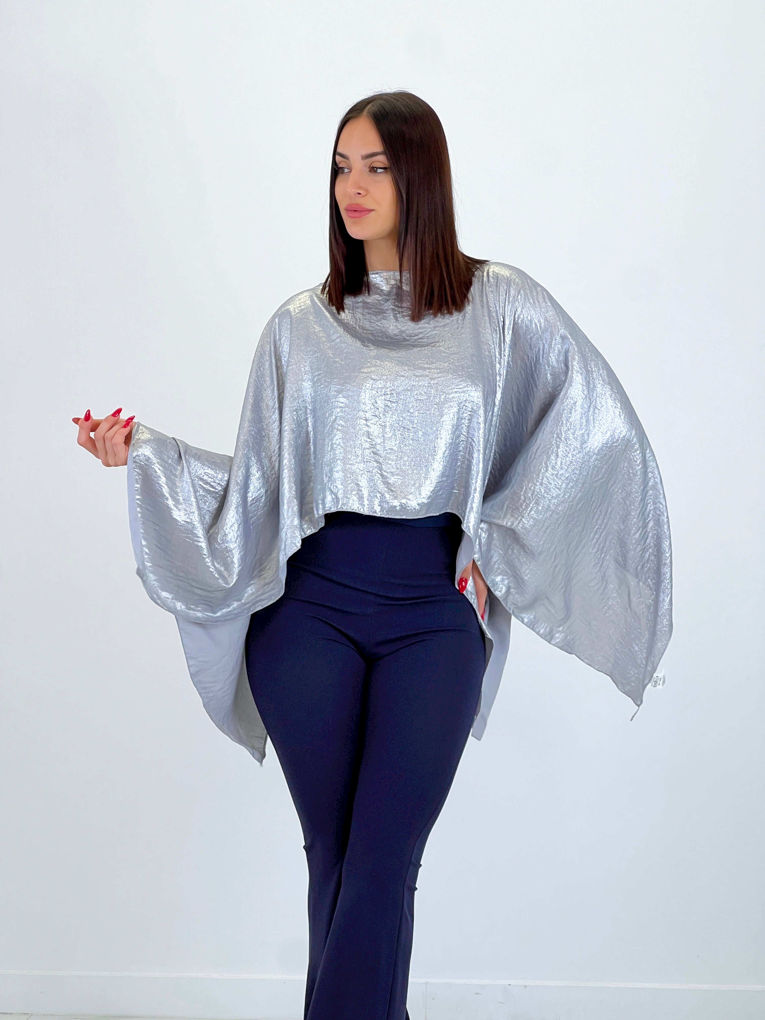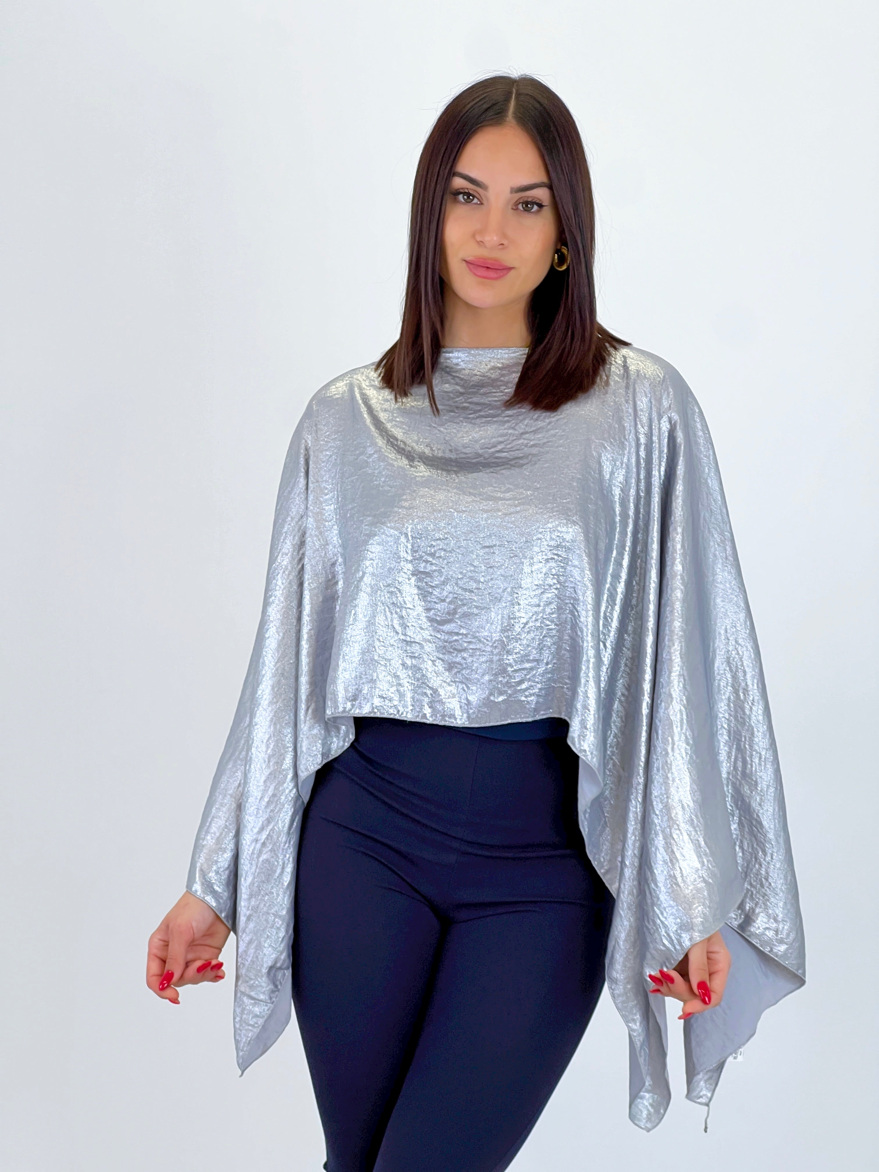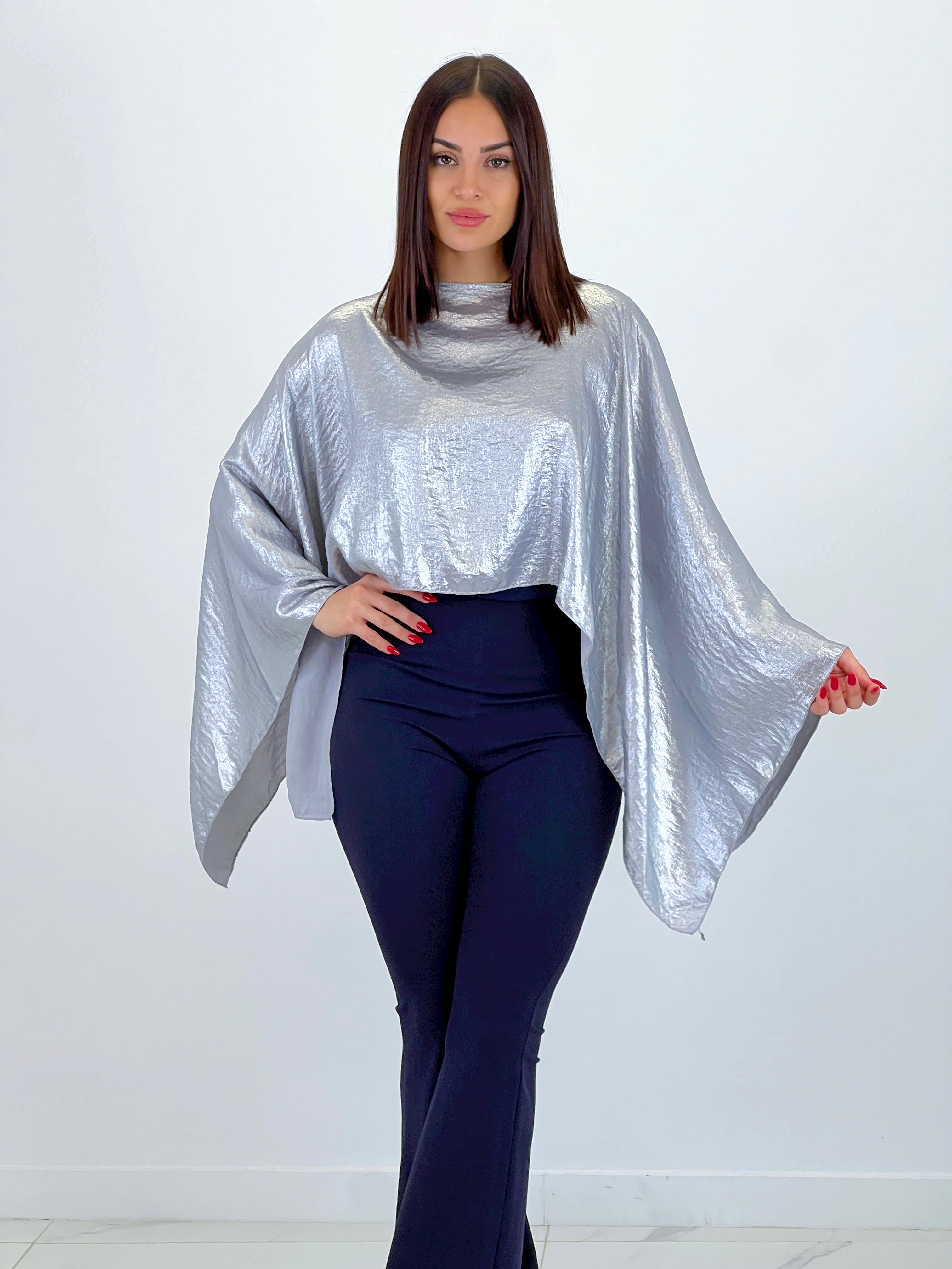 Esta elegante capa de tela metalizada es perfecta para cualquier ocasión. Con una manga acampanada, agrega un toque de sofisticación a tu atuendo. Mantente abrigado y a la moda con la capa fular metalizado.