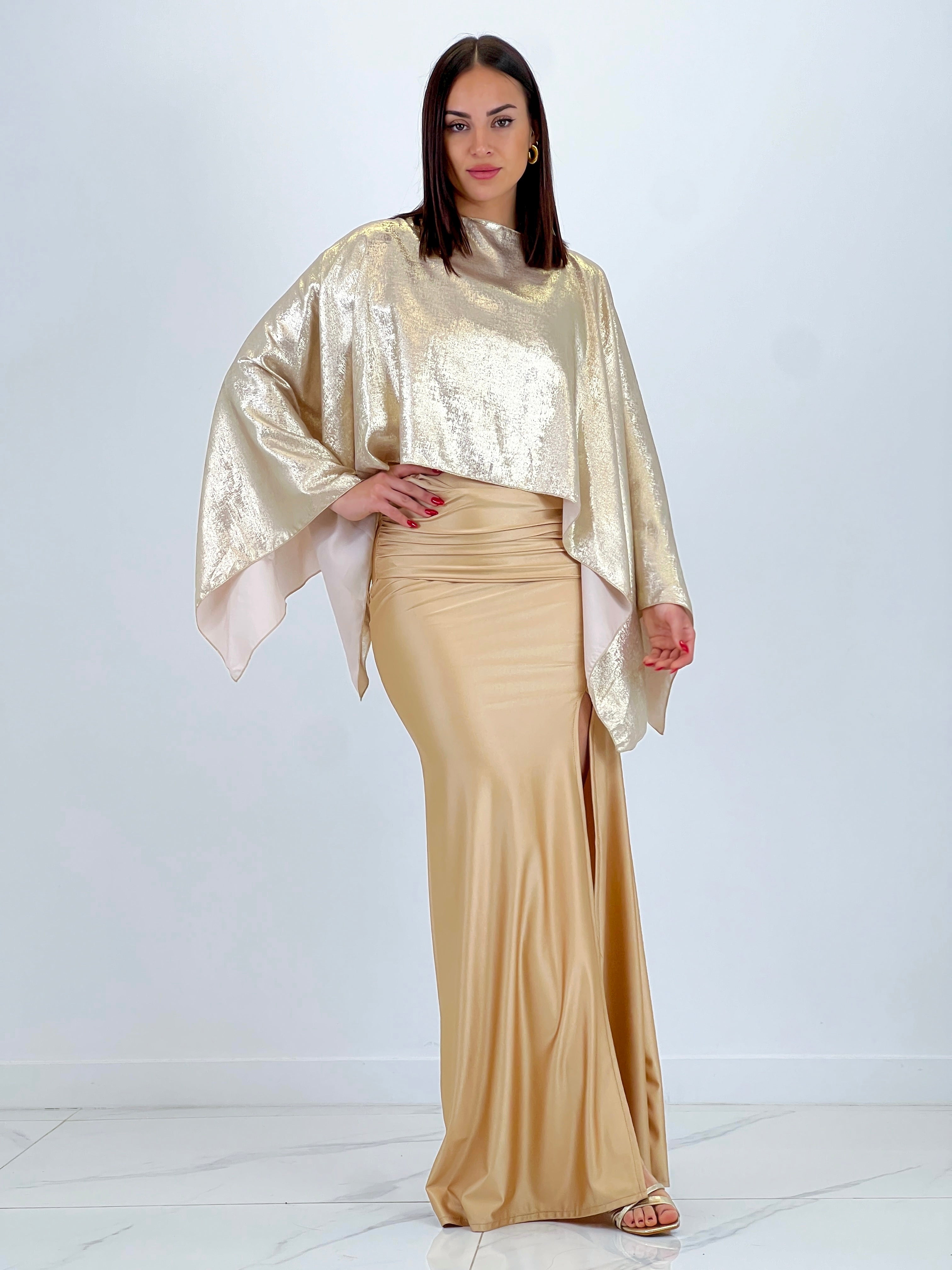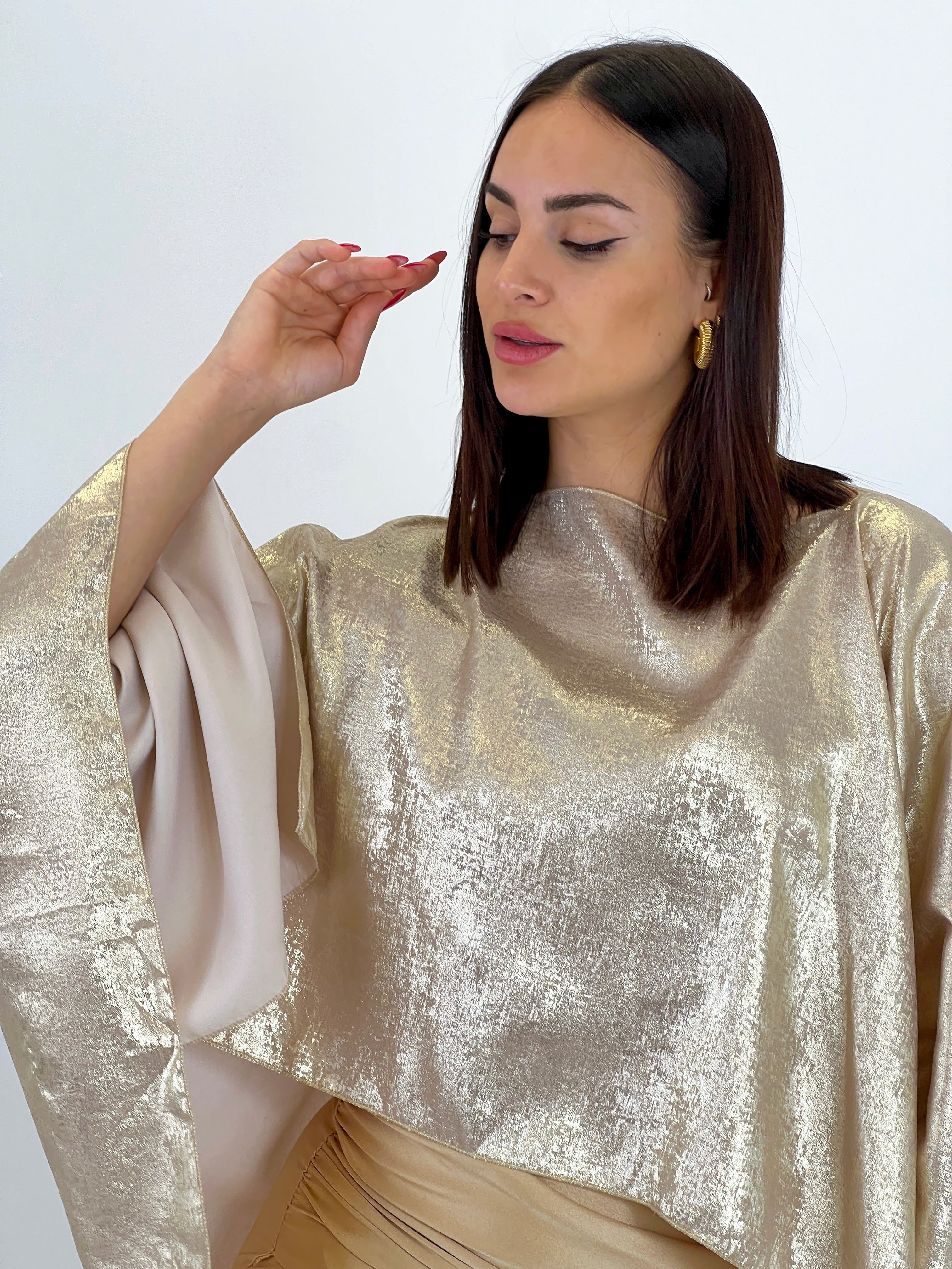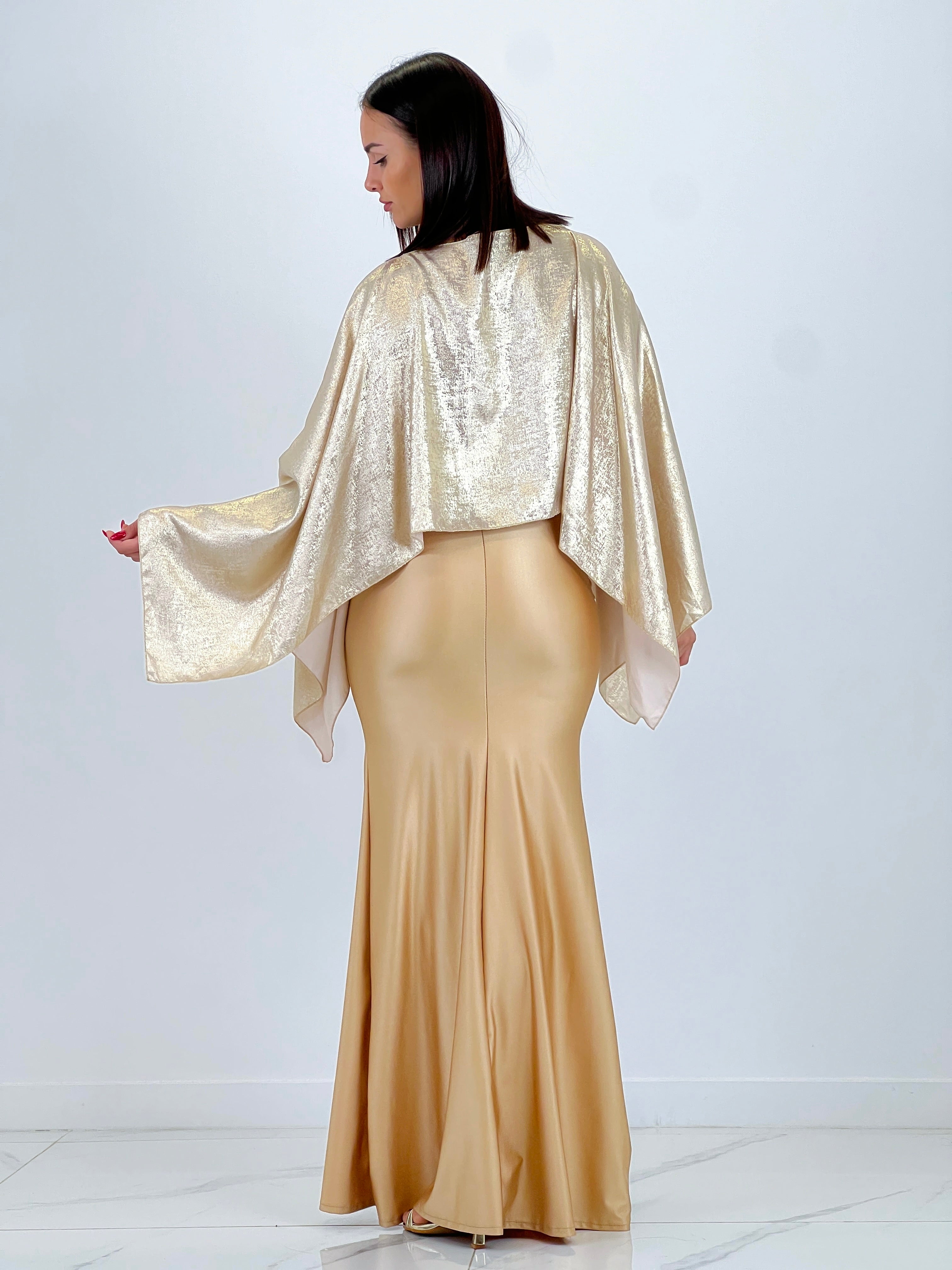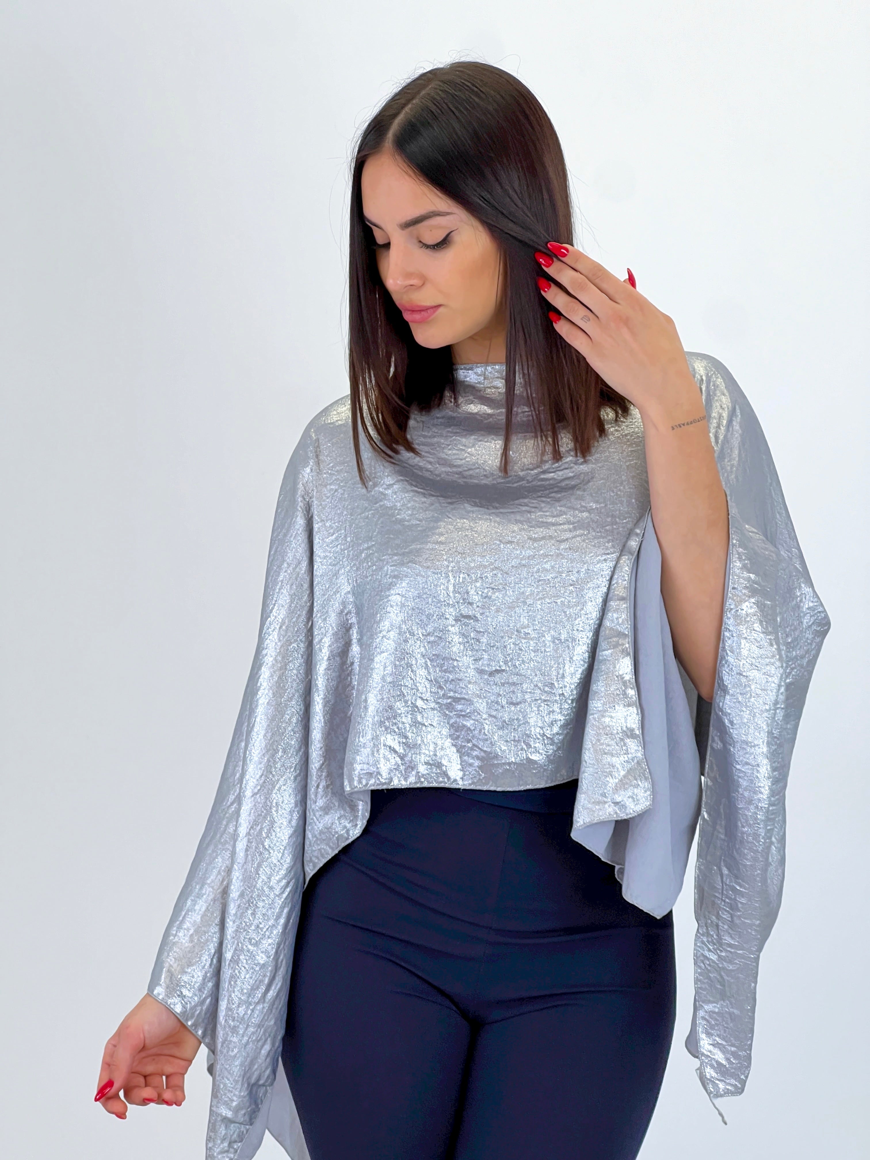 Esta elegante capa de tela metalizada es perfecta para cualquier ocasión. Con una manga acampanada, agrega un toque de sofisticación a tu atuendo. Mantente abrigado y a la moda con la capa fular metalizado.