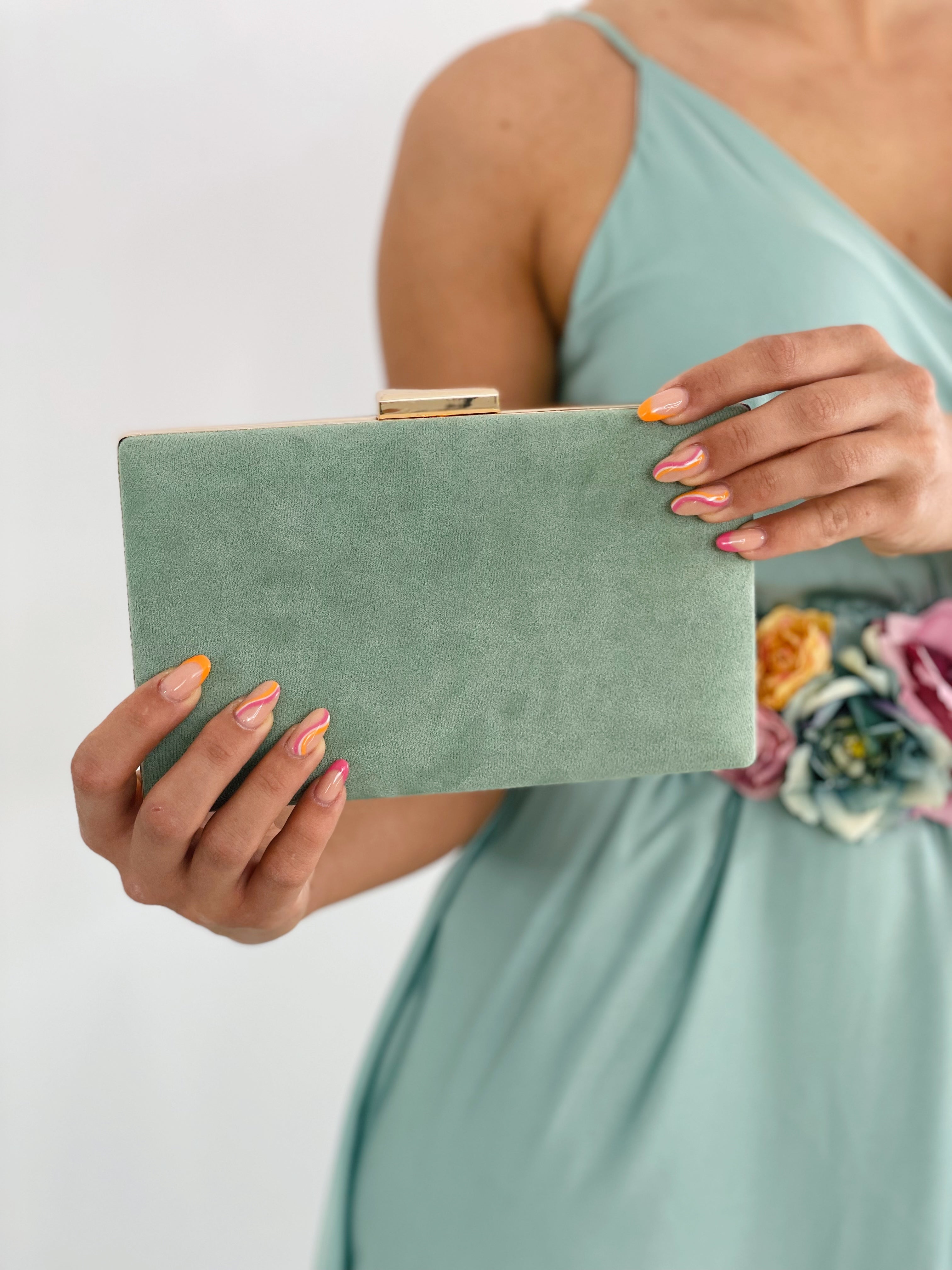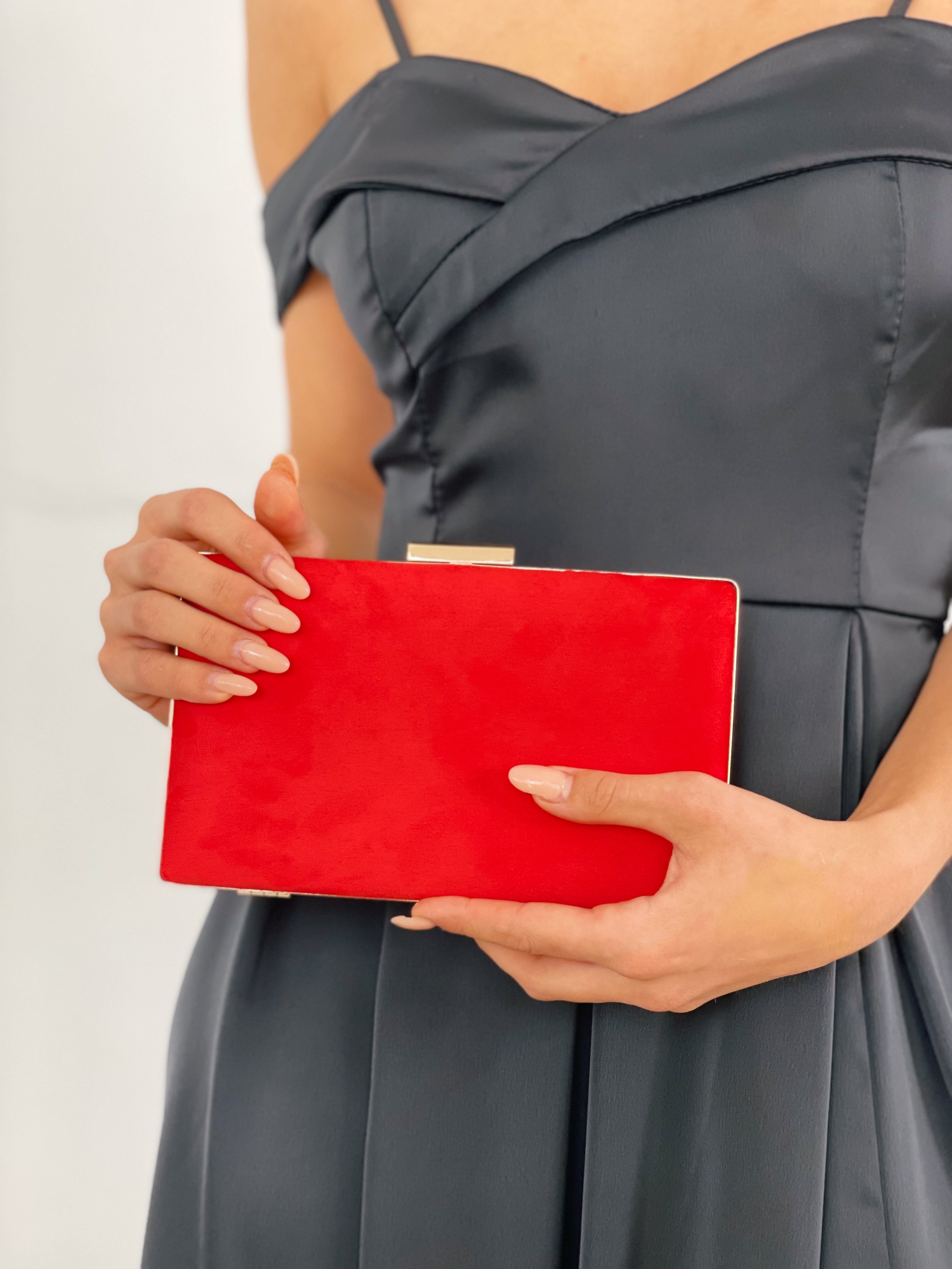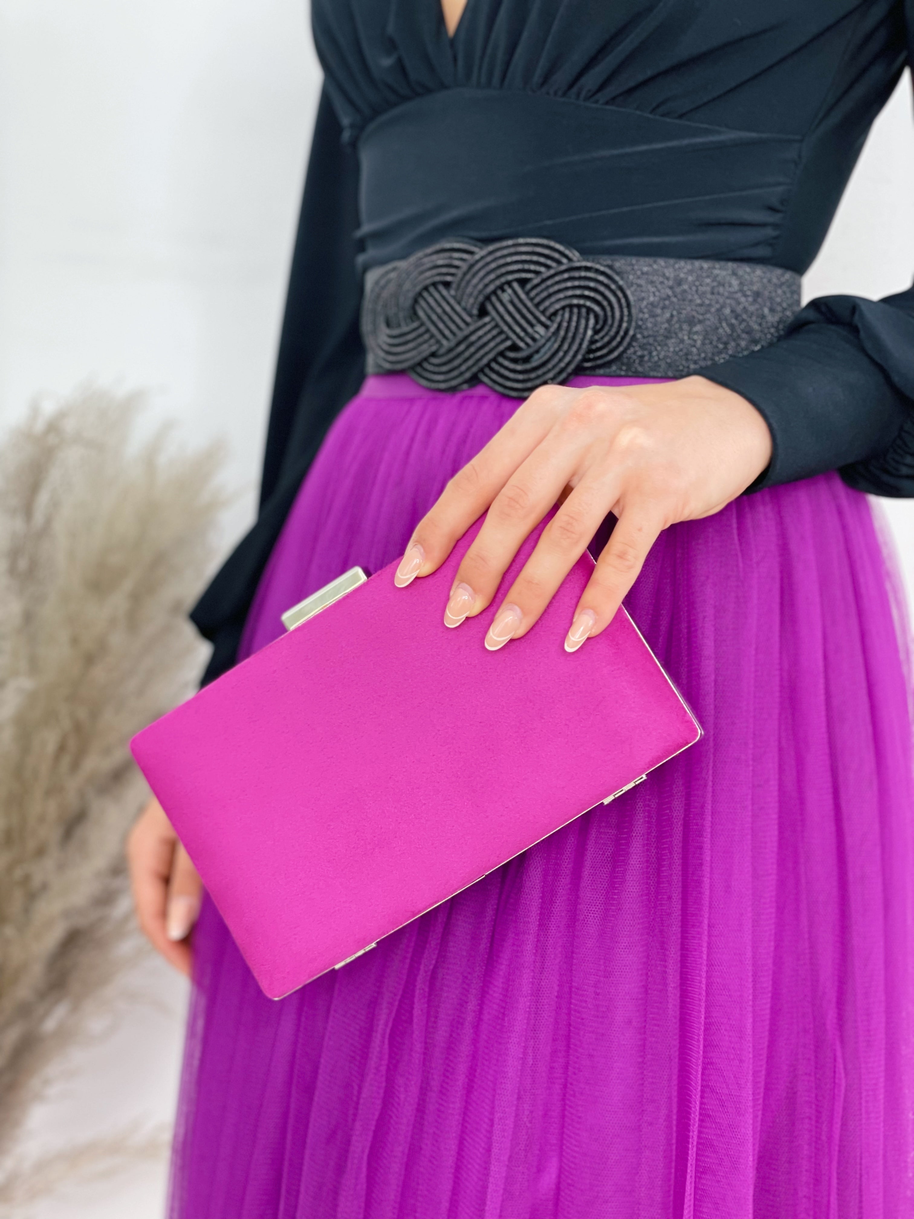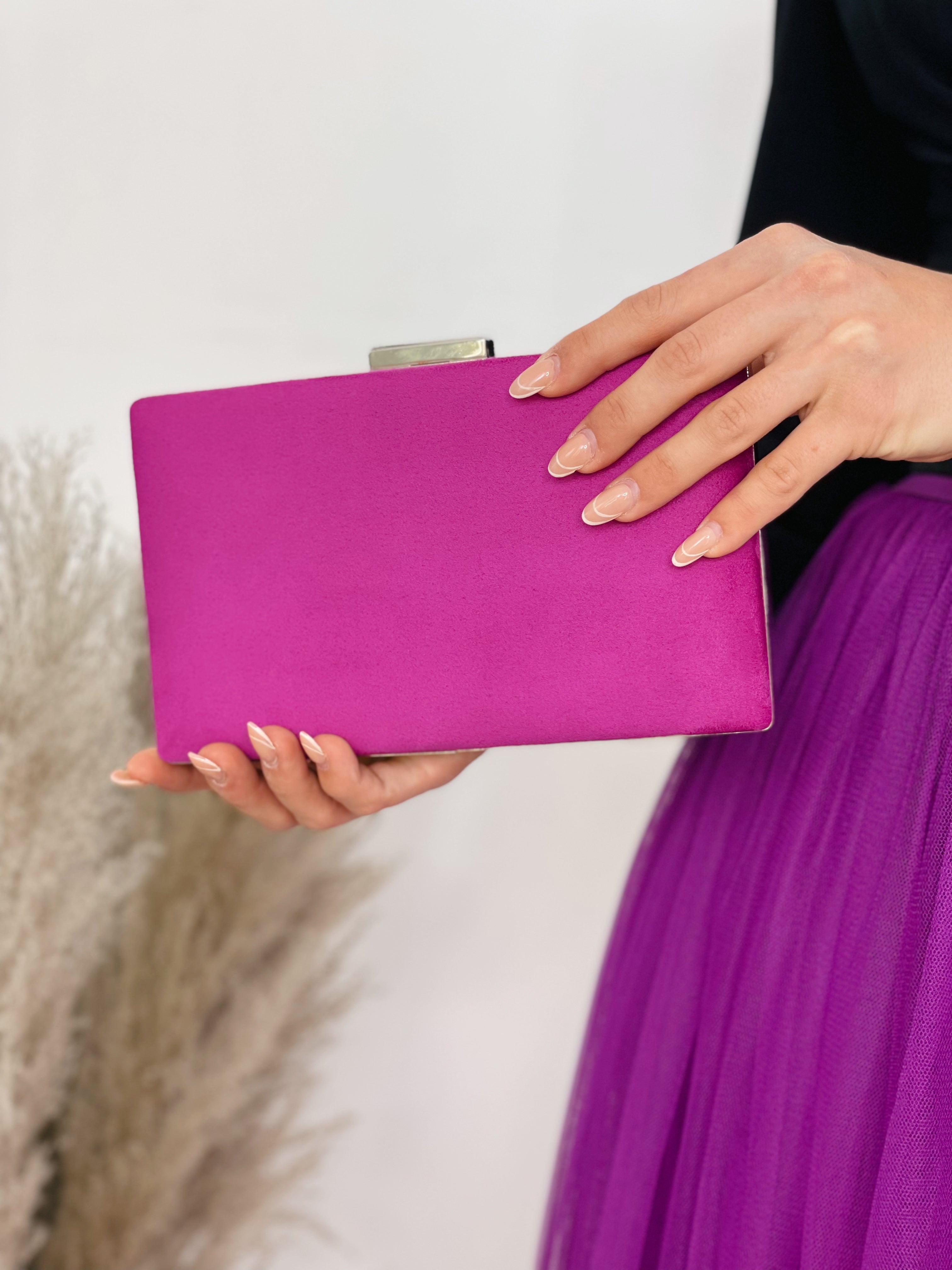 Bolso de mano o bolso clutch, morado fabricado en antelina con unas medidas de 20×11,5cm y un grosor de 5cm APROXIMADAMENTE.
