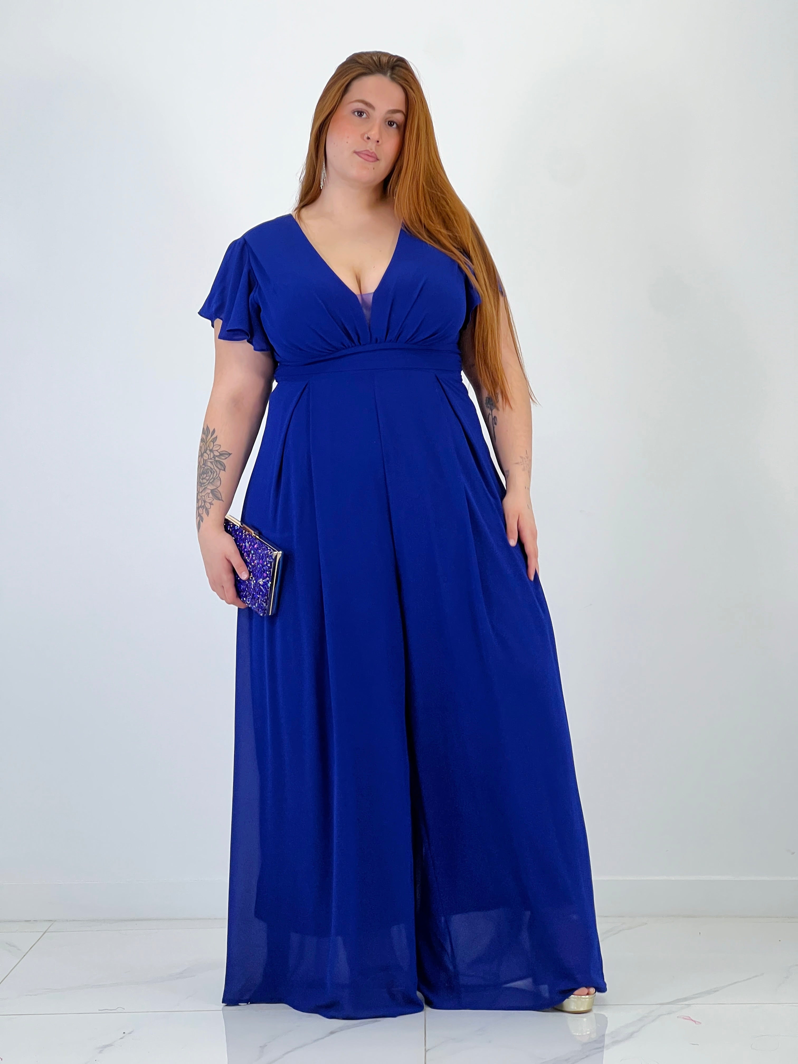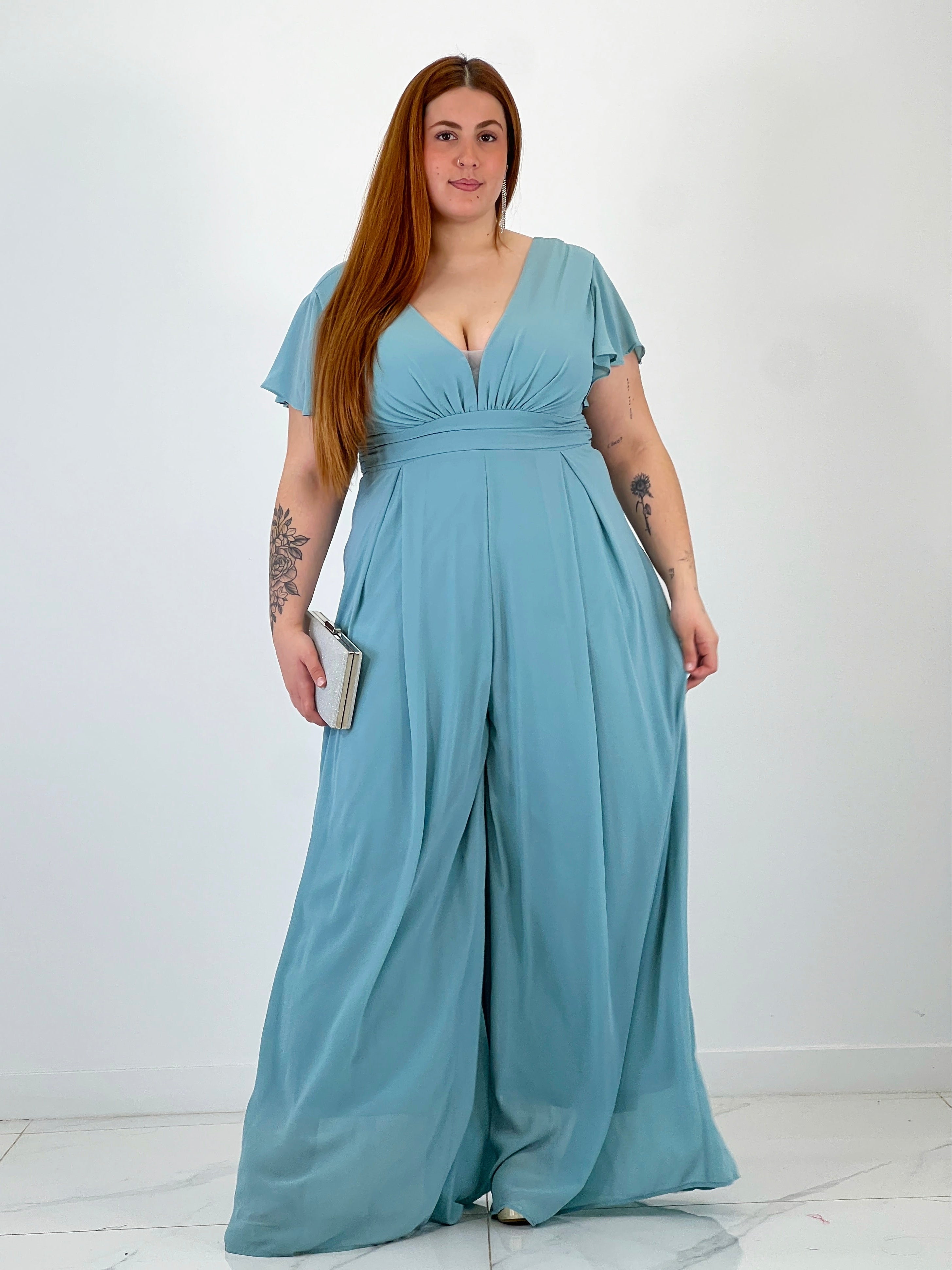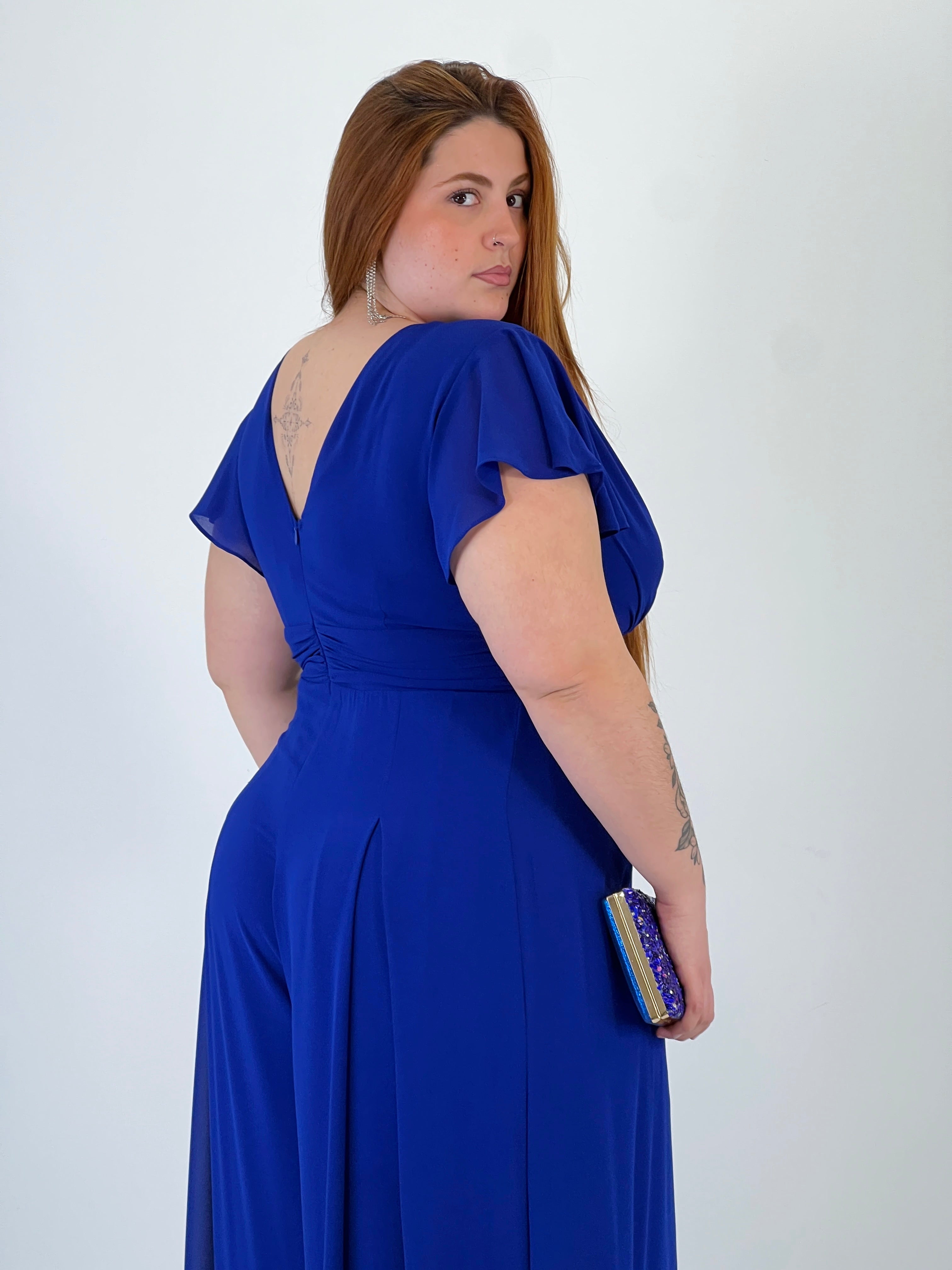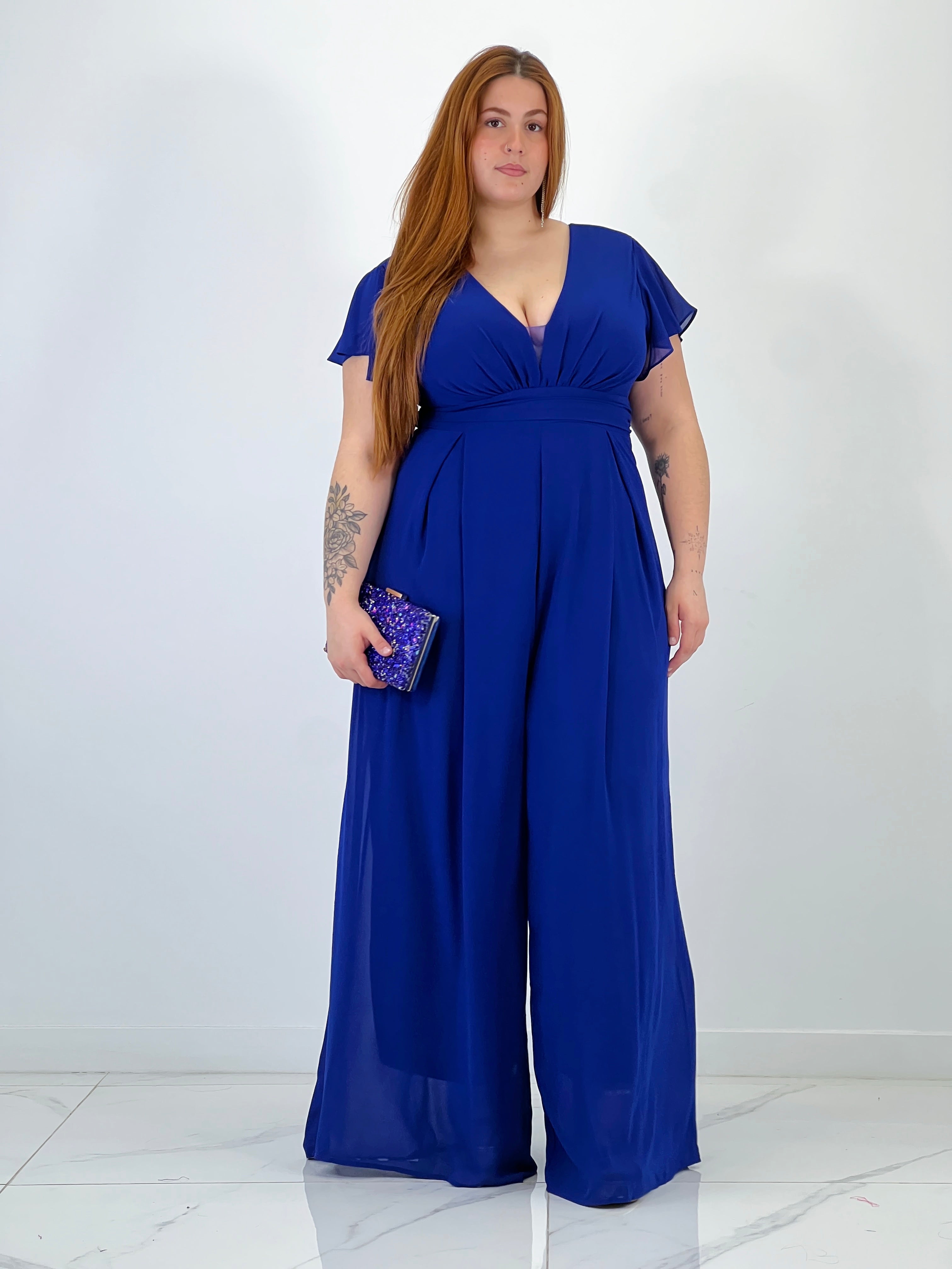 Descubre un estilo elegante y cómodo con el mono ceremonia Iria. De manga corta y escote V con gasa, este mono en talla grande es ideal para las invitadas. Su cintura fruncida resalta el cuerpo y su pierna ancha brinda una sensación de estilo en cualquier ceremonia.