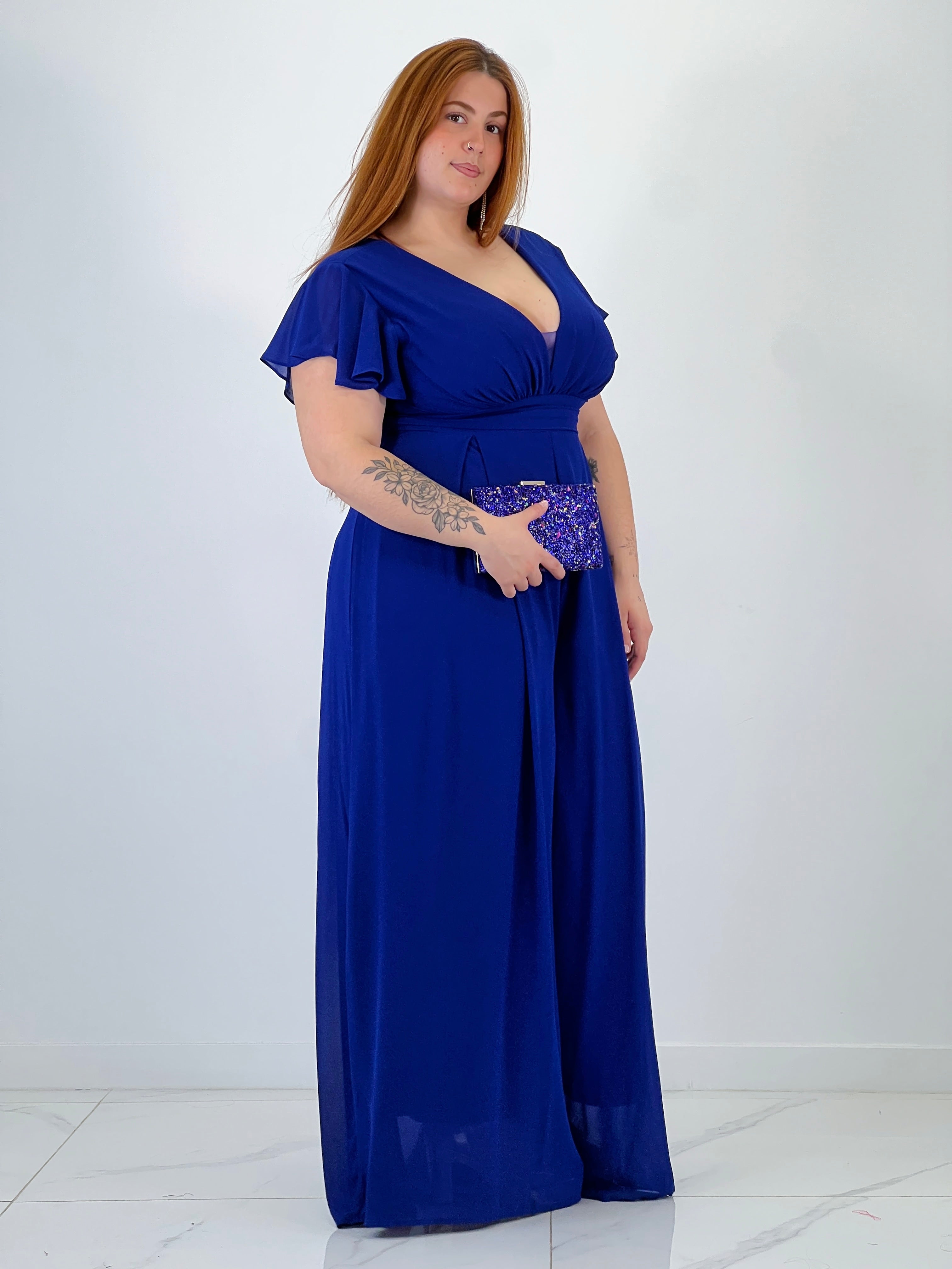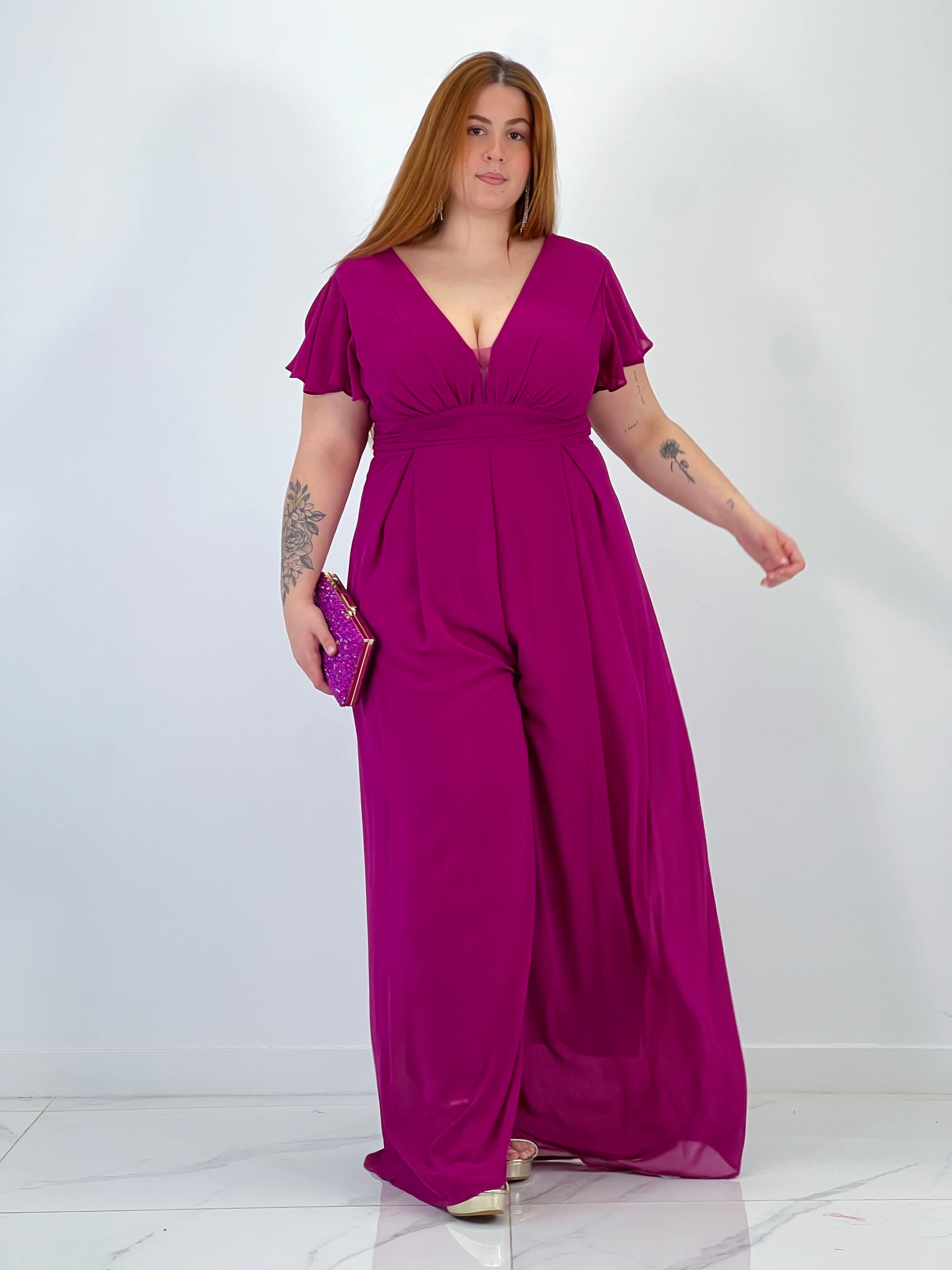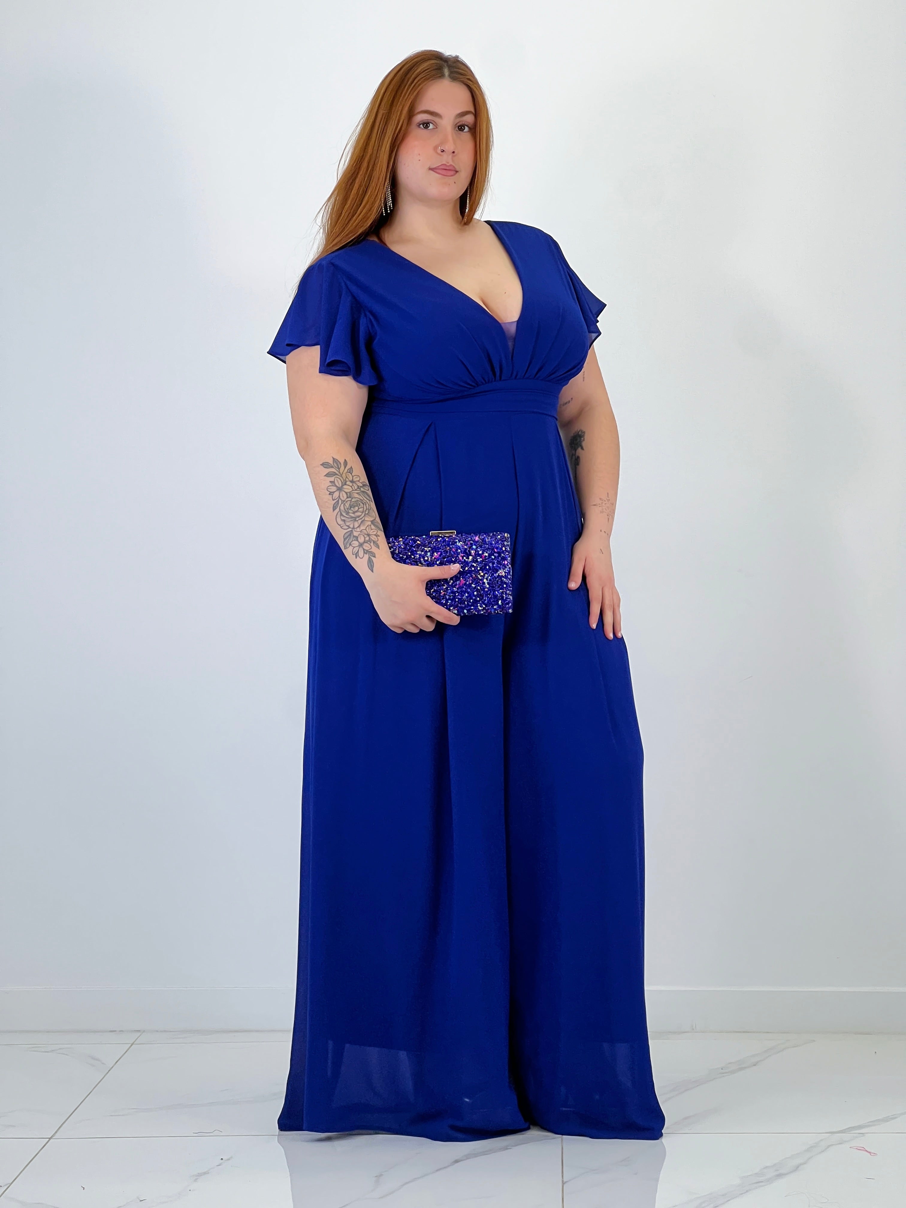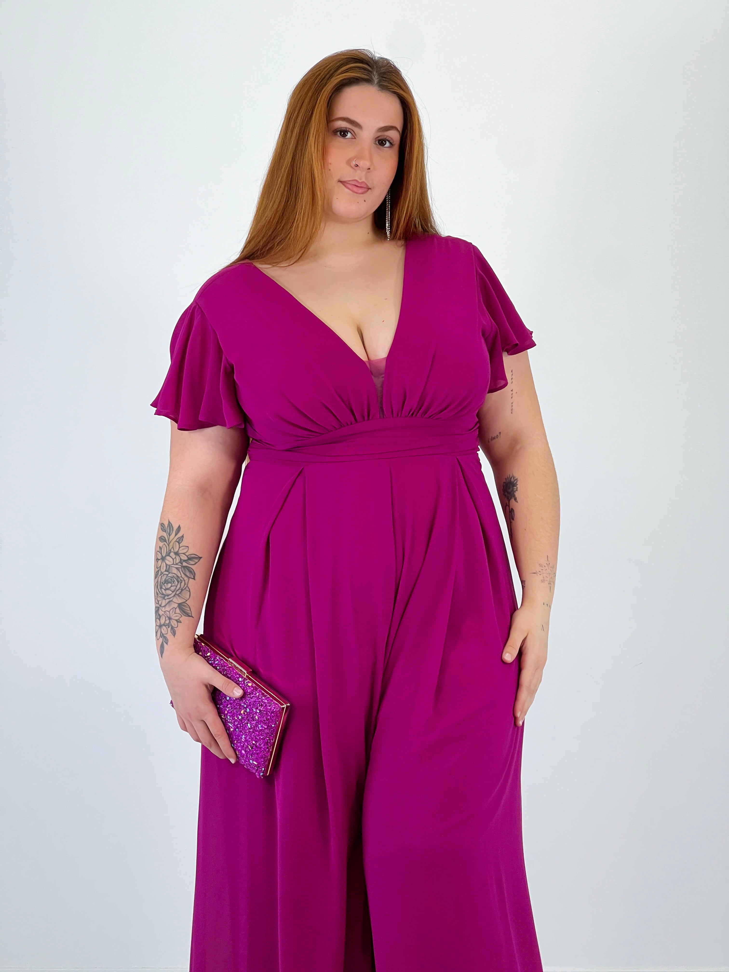 Descubre un estilo elegante y cómodo con el mono ceremonia Iria. De manga corta y escote V con gasa, este mono en talla grande es ideal para las invitadas. Su cintura fruncida resalta el cuerpo y su pierna ancha brinda una sensación de estilo en cualquier ceremonia.
