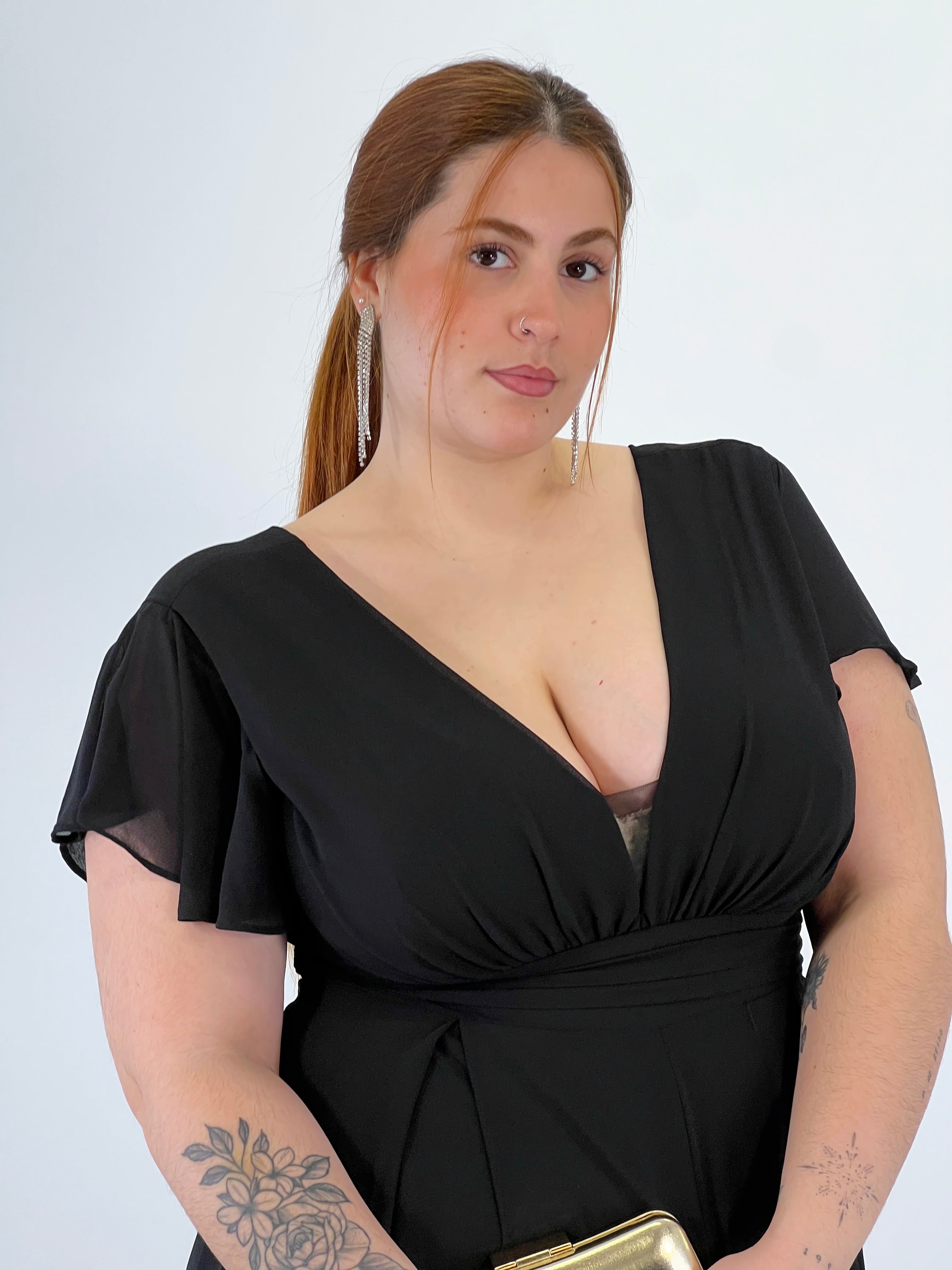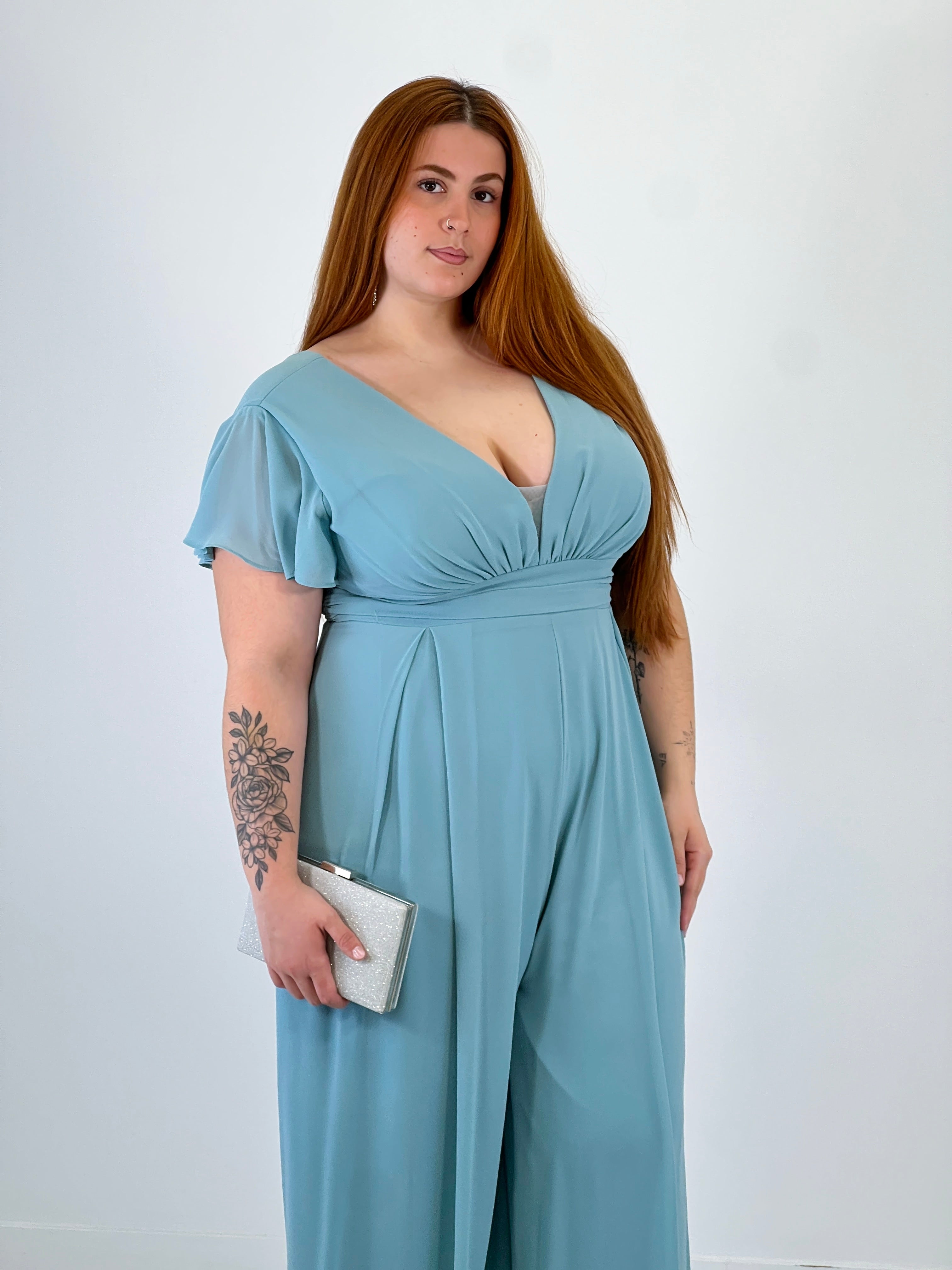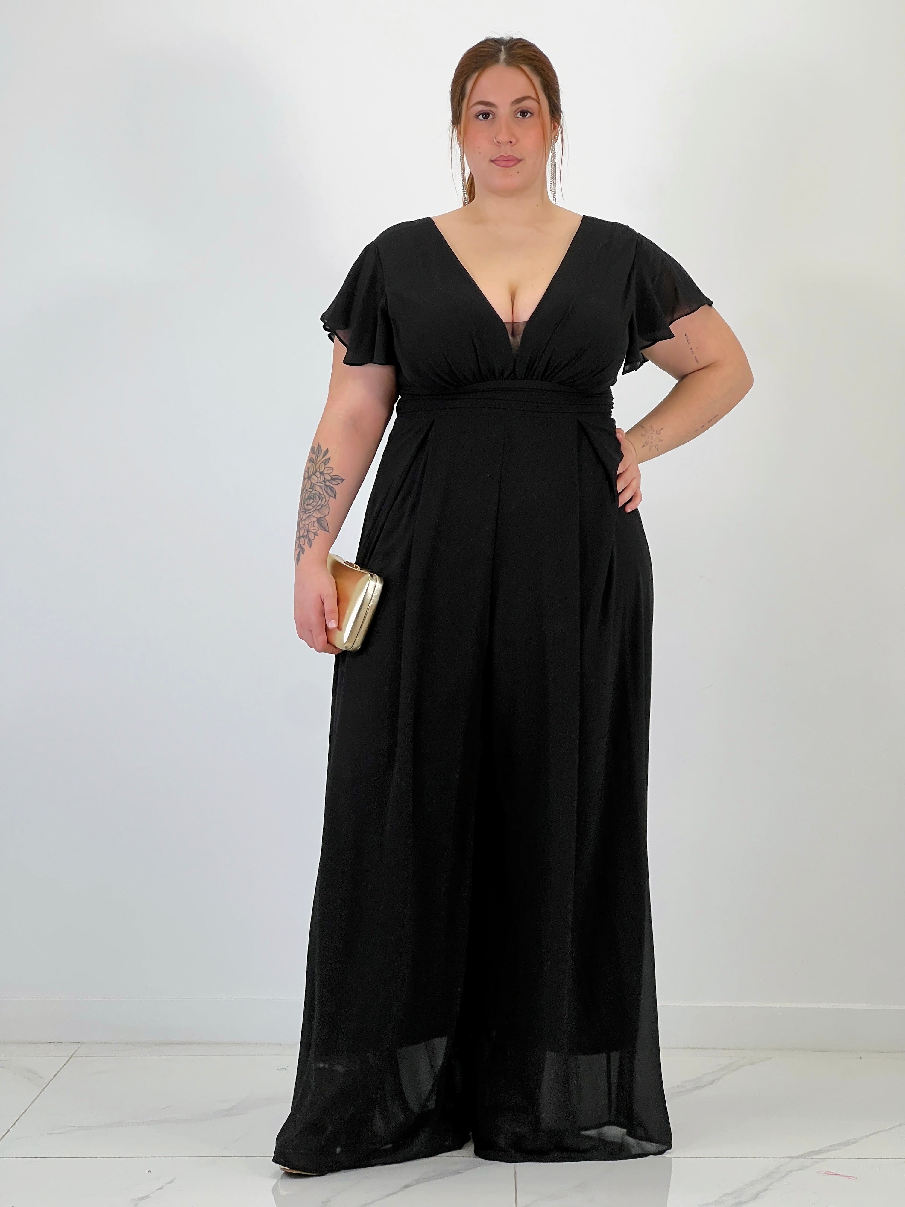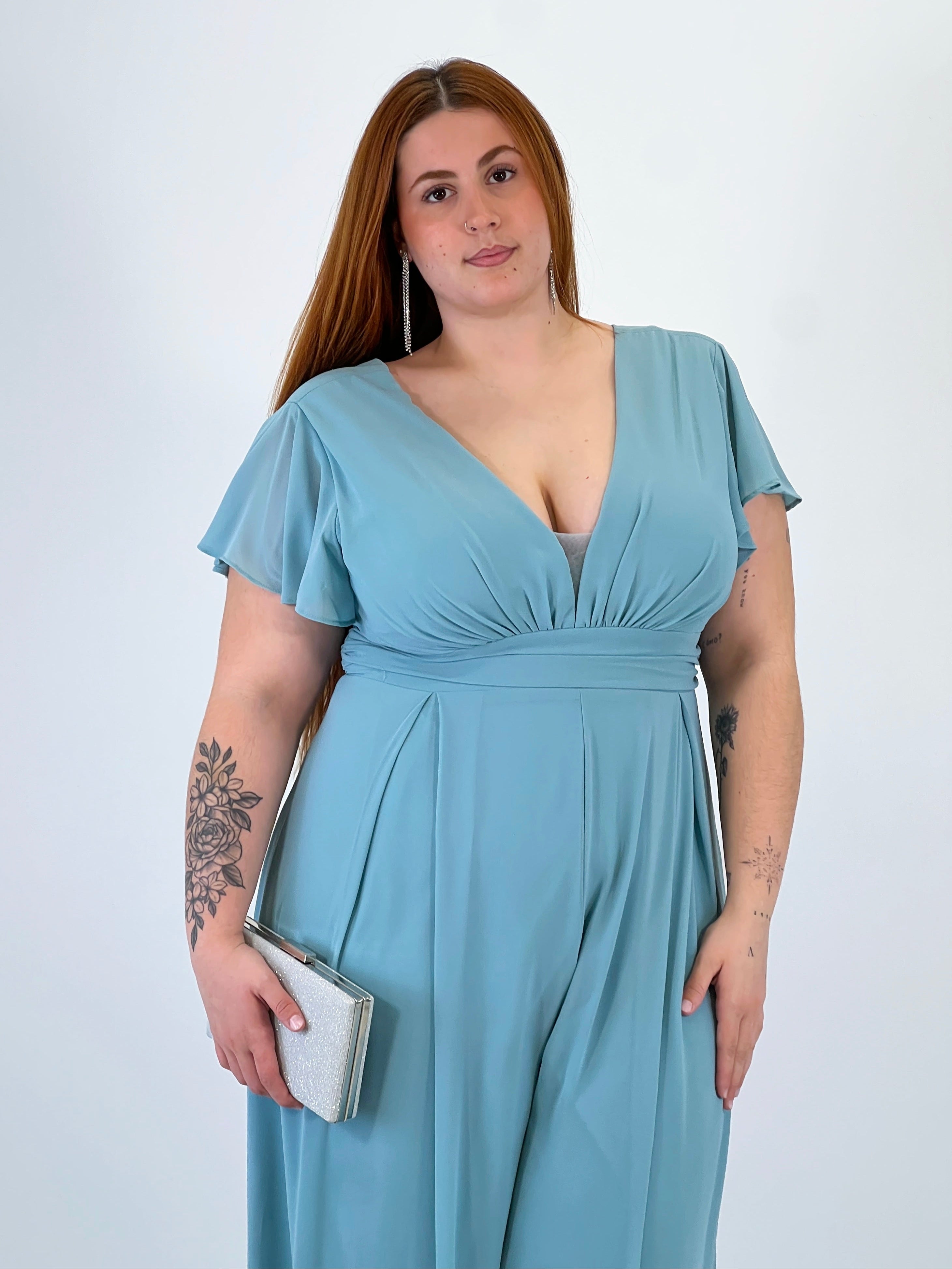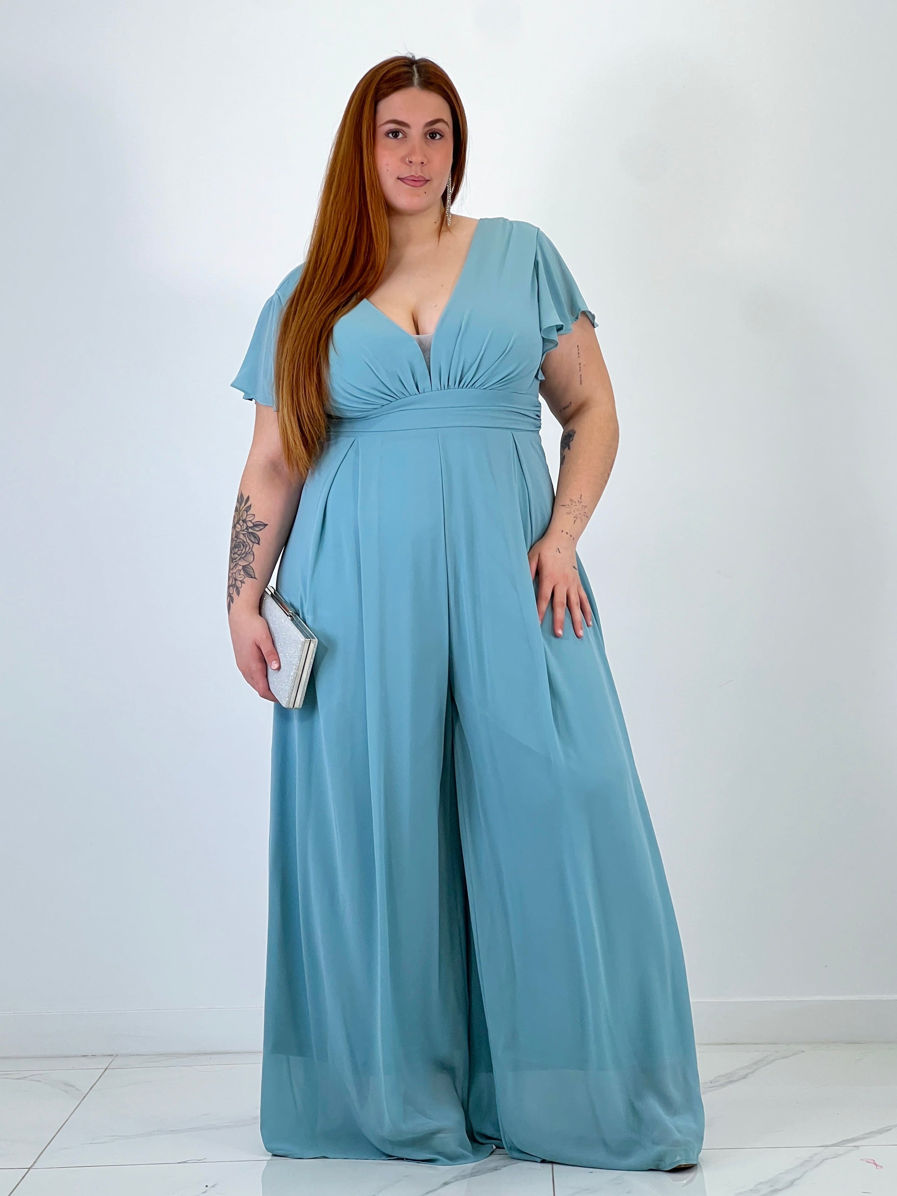 Descubre un estilo elegante y cómodo con el mono ceremonia Iria. De manga corta y escote V con gasa, este mono en talla grande es ideal para las invitadas. Su cintura fruncida resalta el cuerpo y su pierna ancha brinda una sensación de estilo en cualquier ceremonia.