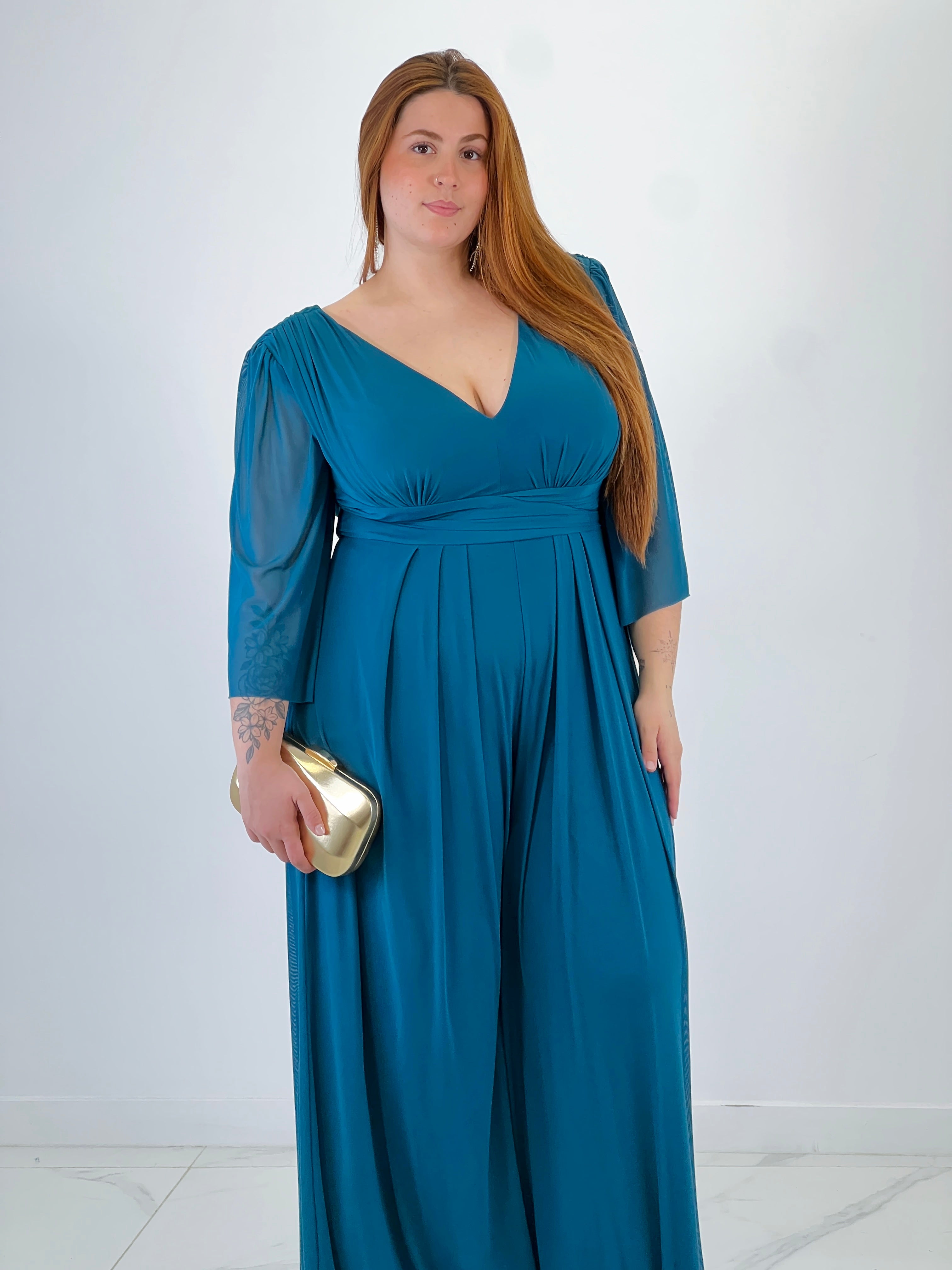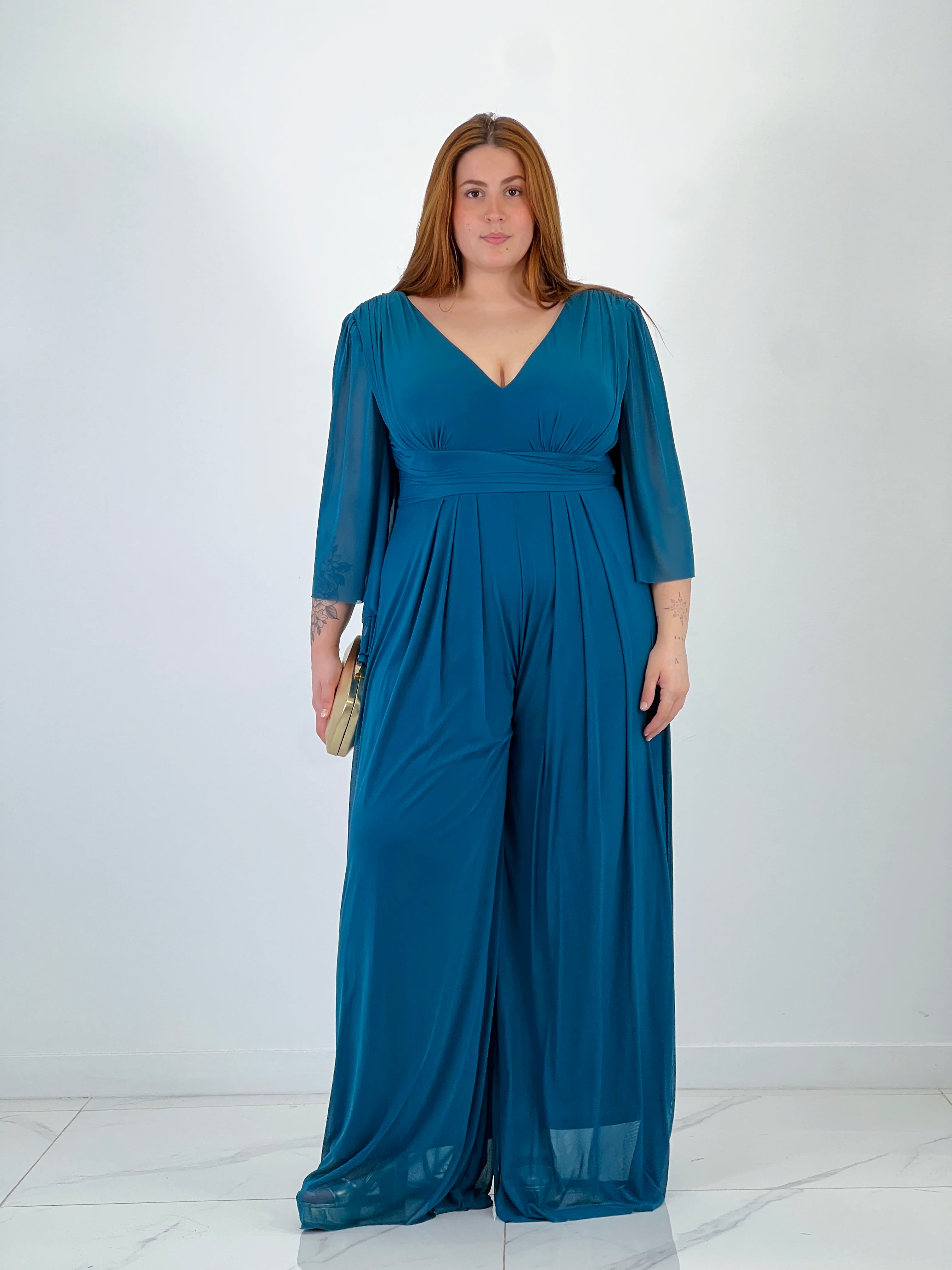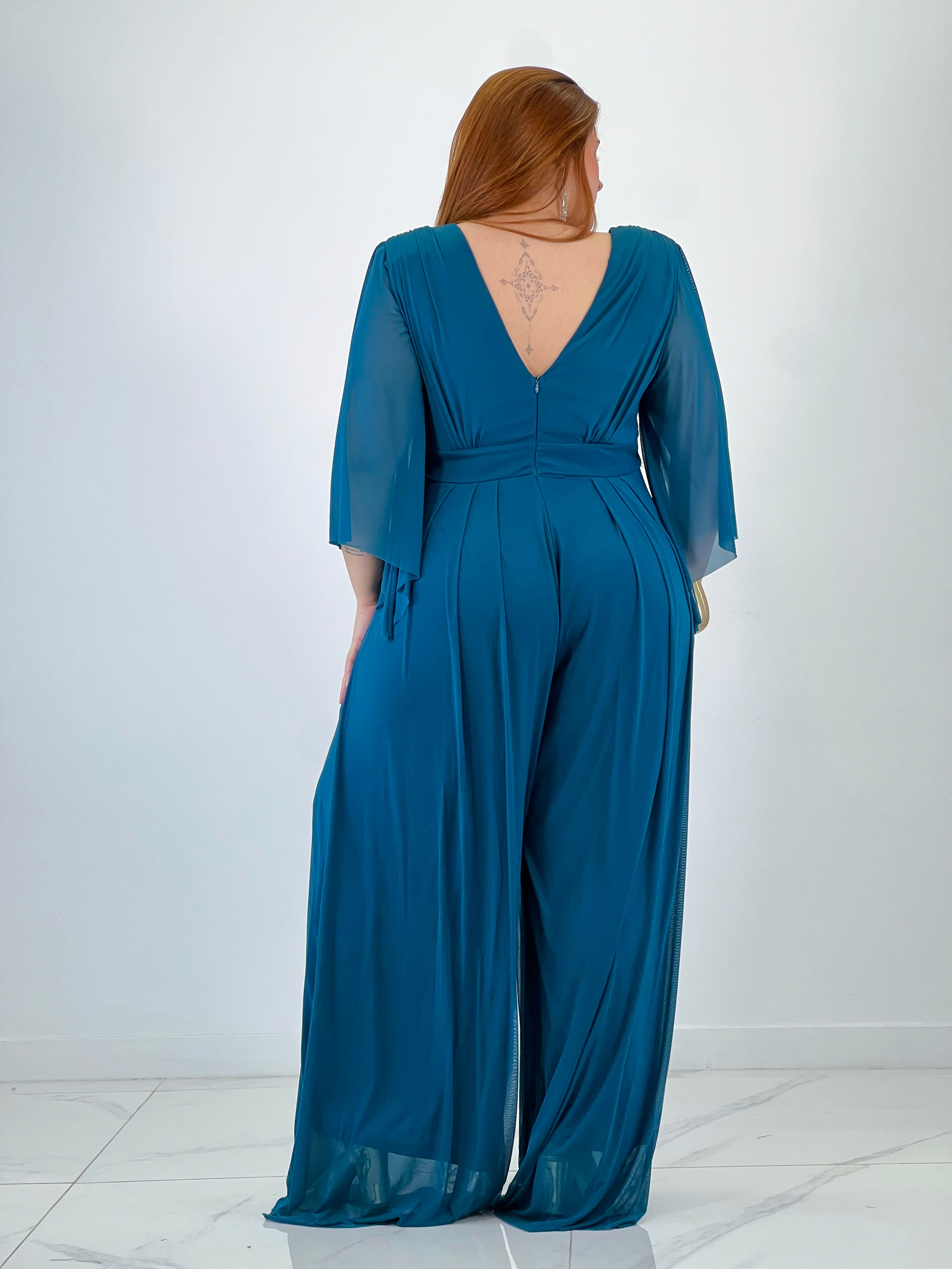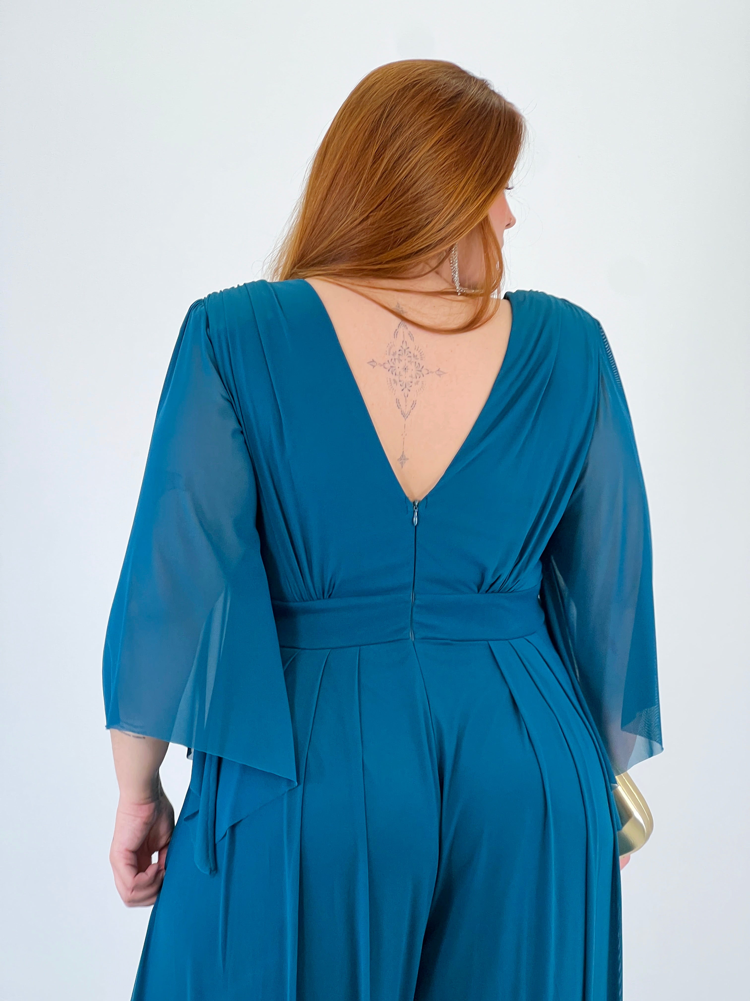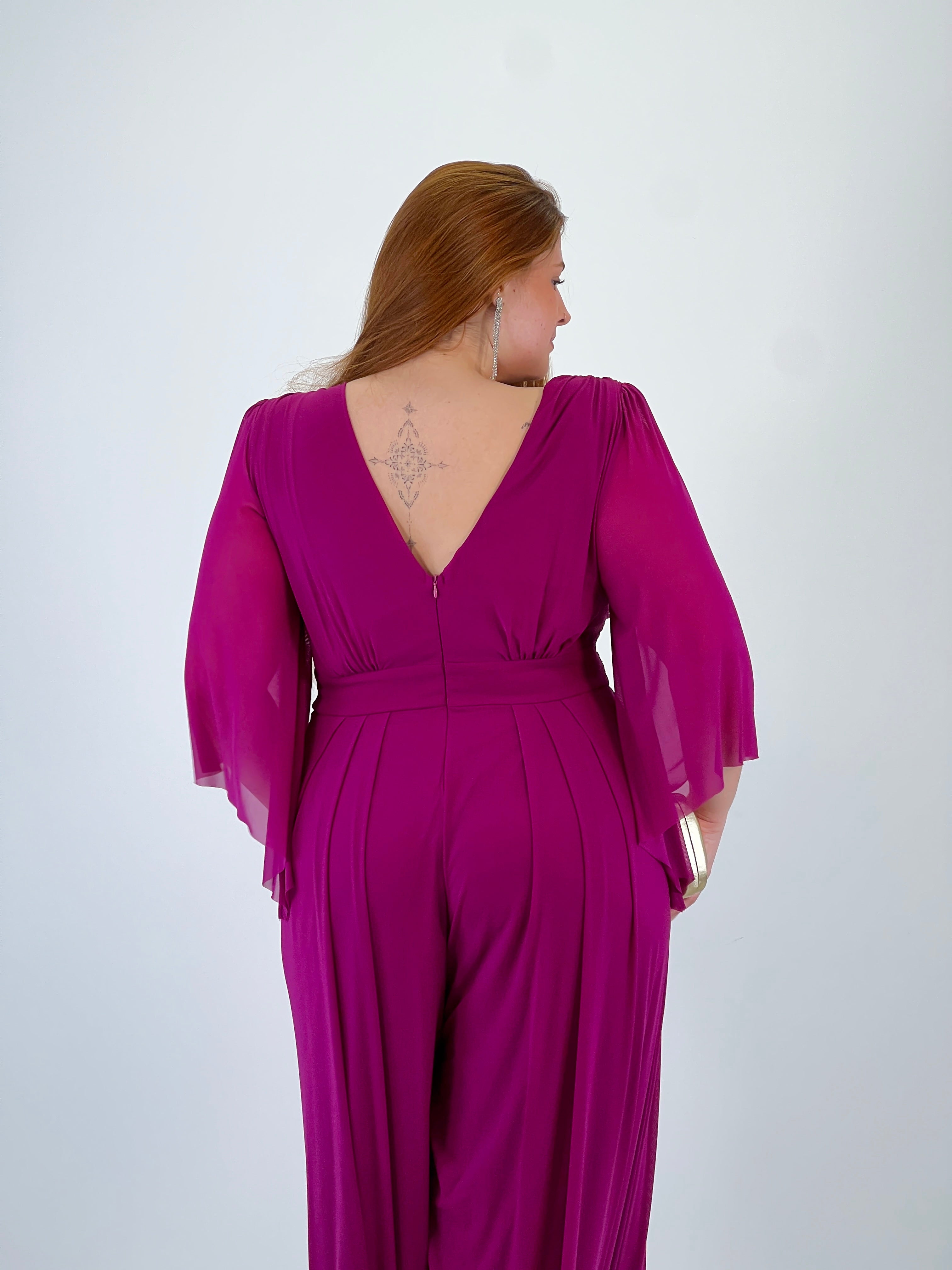 Descubre la elegancia y comodidad con nuestro mono manga acampanada Mencía. Perfecto para cualquier ceremonia, su corte de talla grande y escote en v resaltan la figura de la invitada. Con mangas acampanadas y un ancho y acampanado en la pierna, además, cuenta con forro interno para mayor confort.