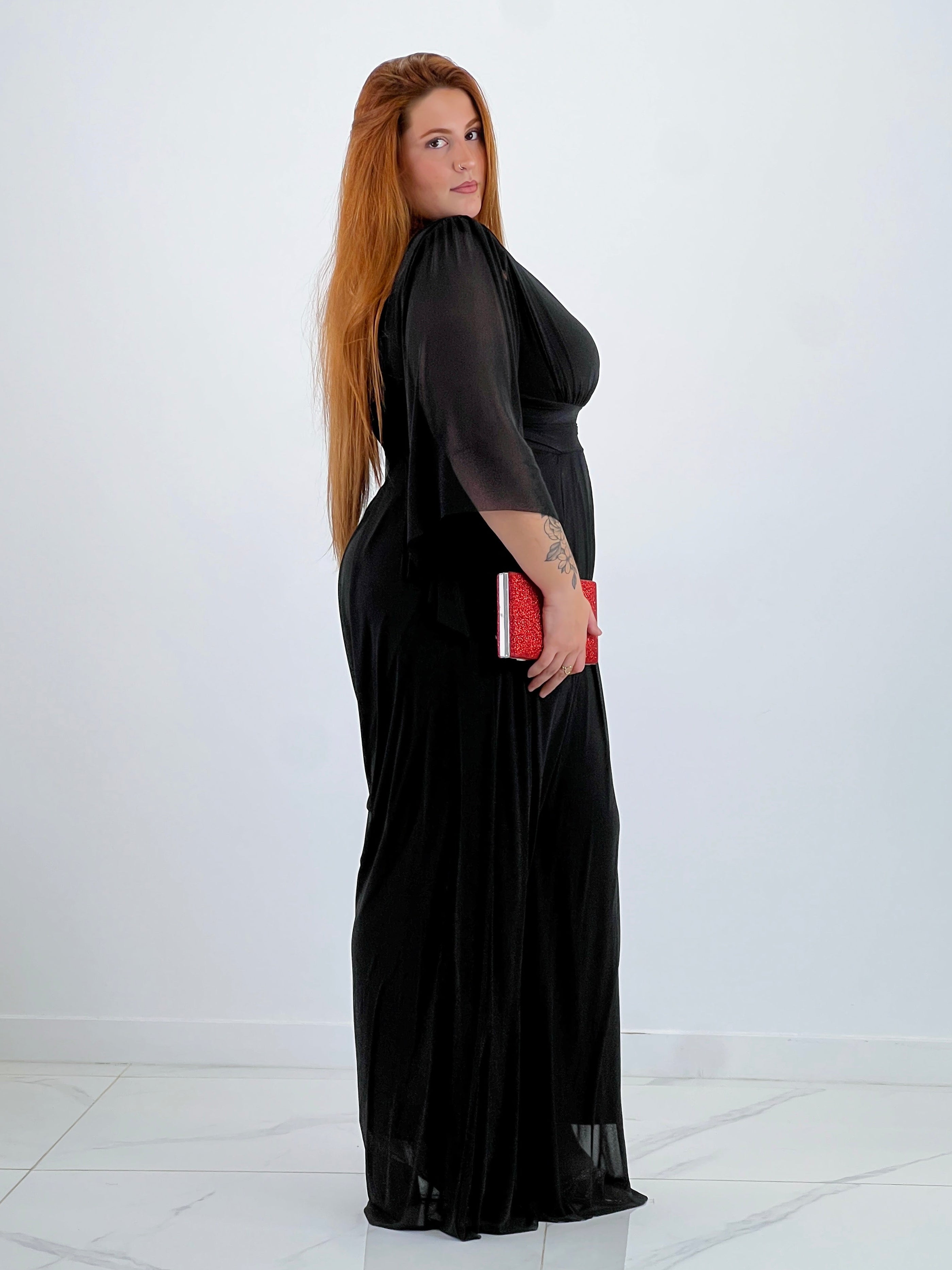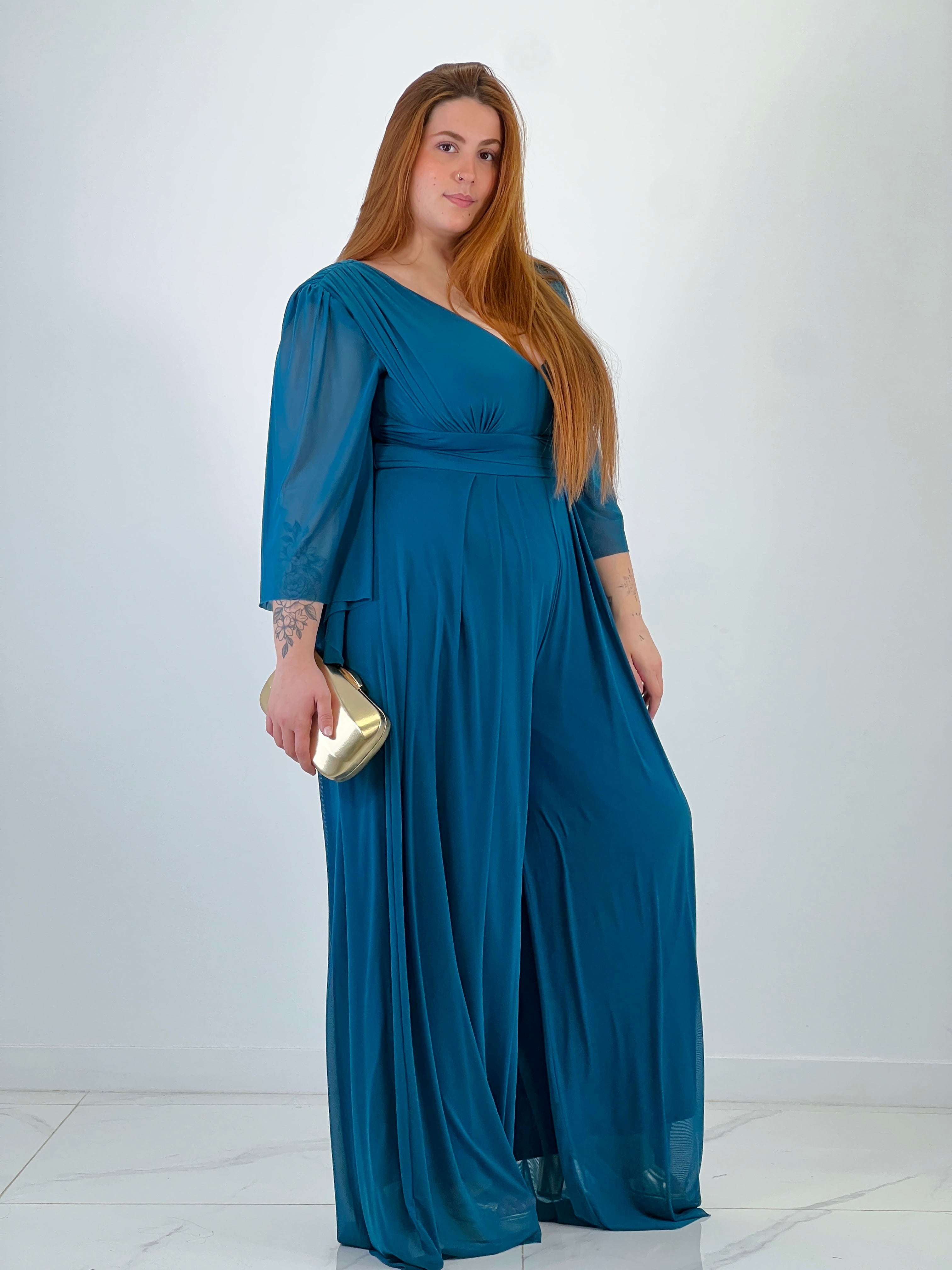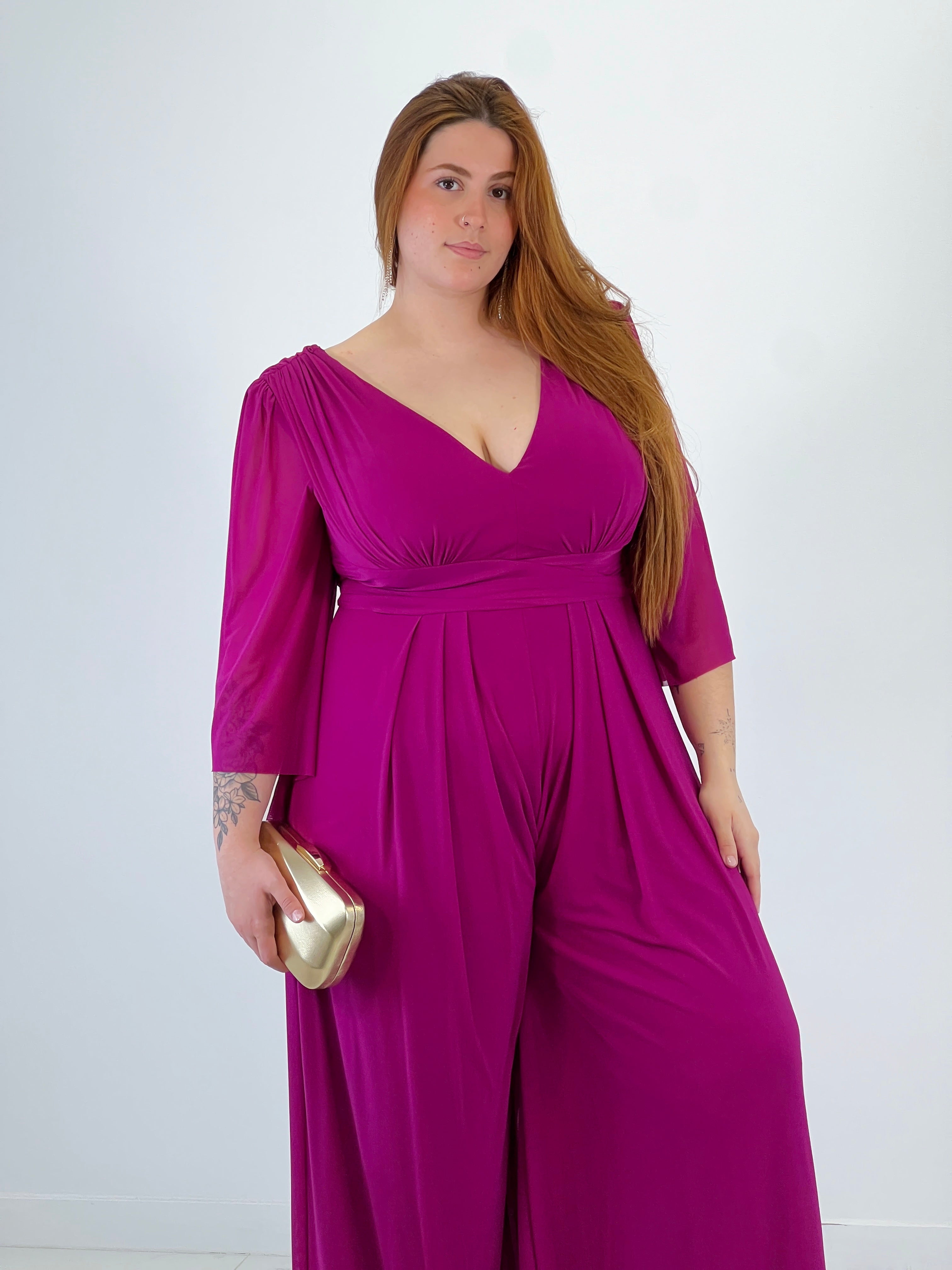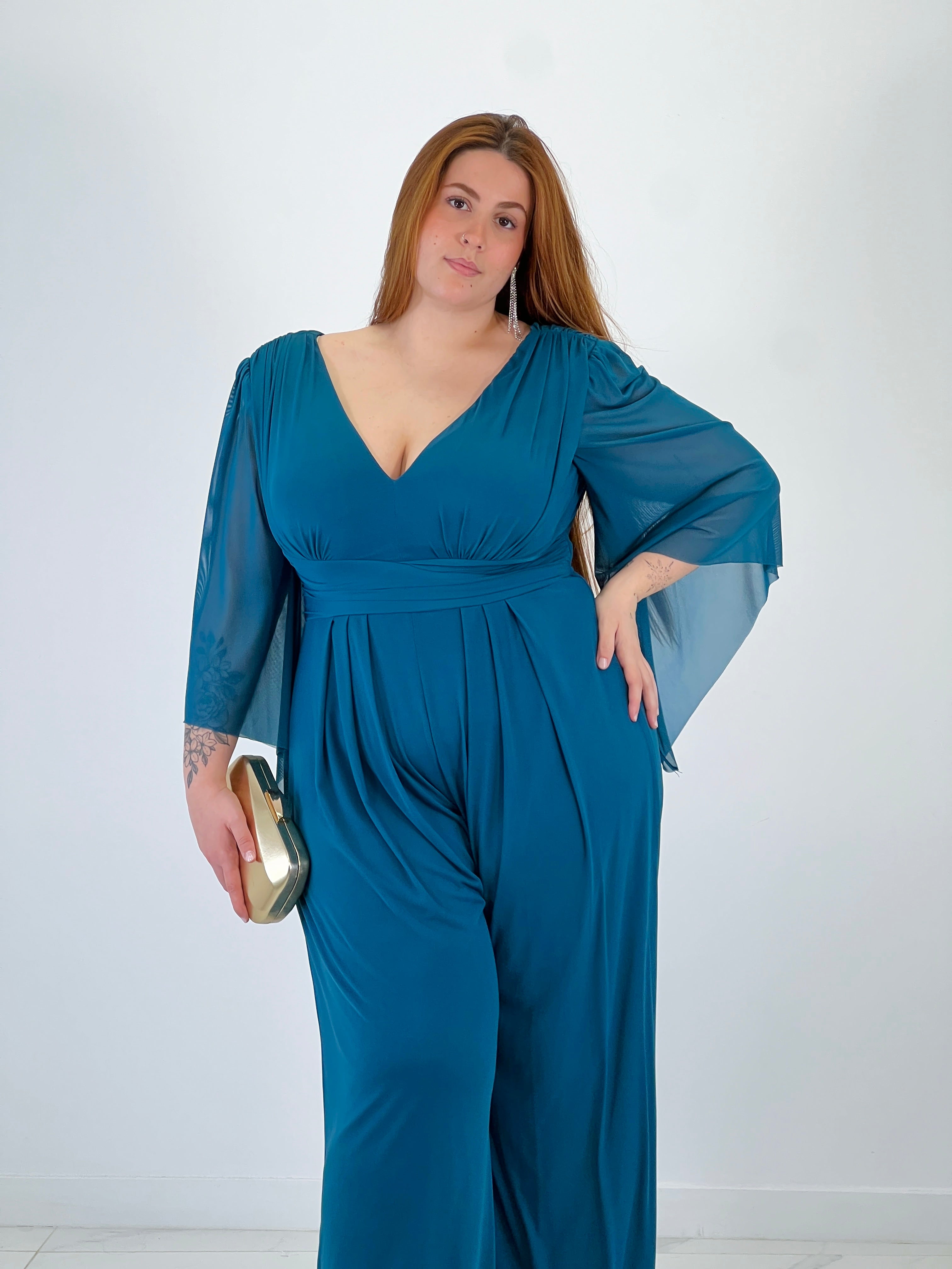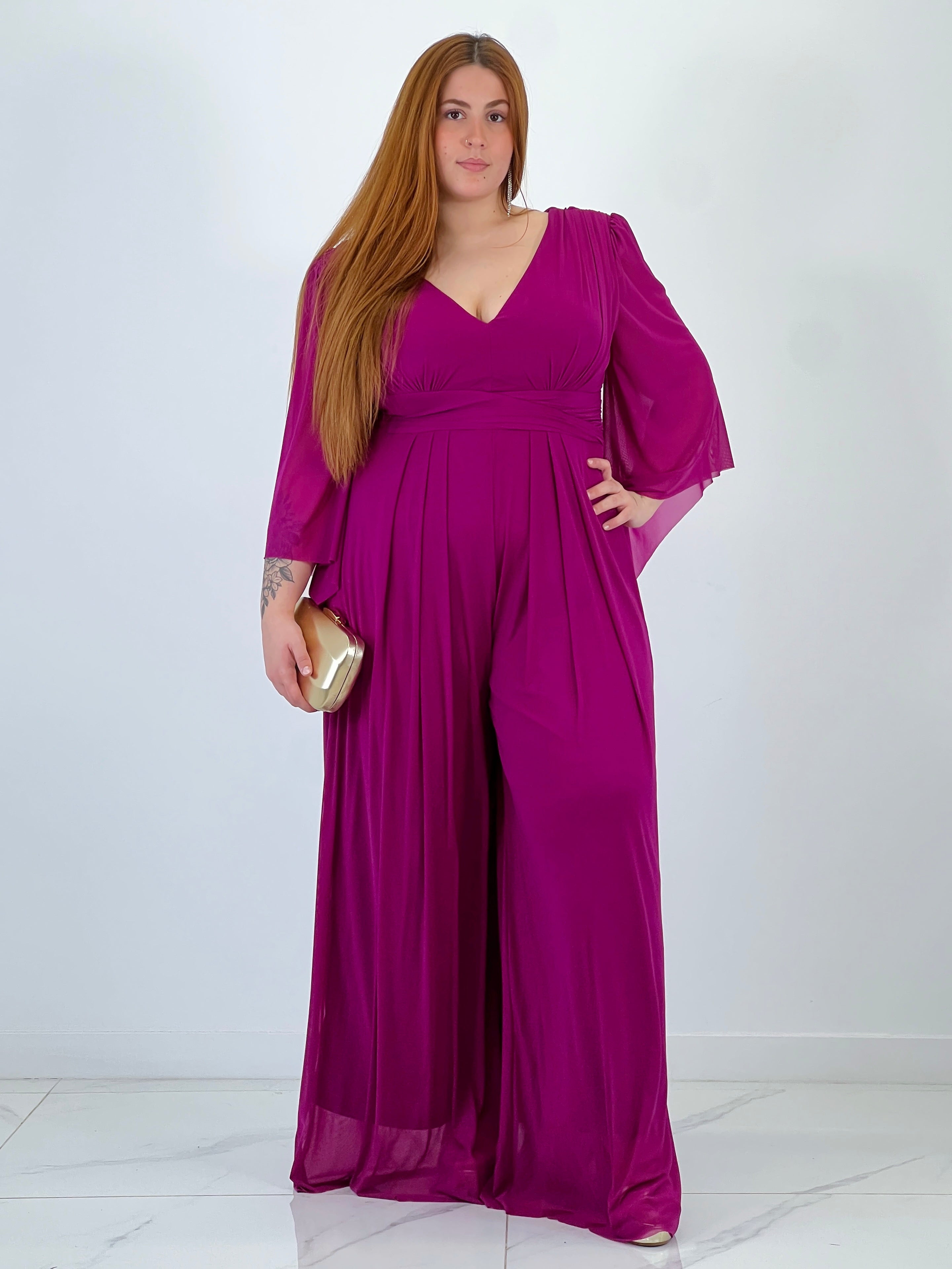 Descubre la elegancia y comodidad con nuestro mono manga acampanada Mencía. Perfecto para cualquier ceremonia, su corte de talla grande y escote en v resaltan la figura de la invitada. Con mangas acampanadas y un ancho y acampanado en la pierna, además, cuenta con forro interno para mayor confort.