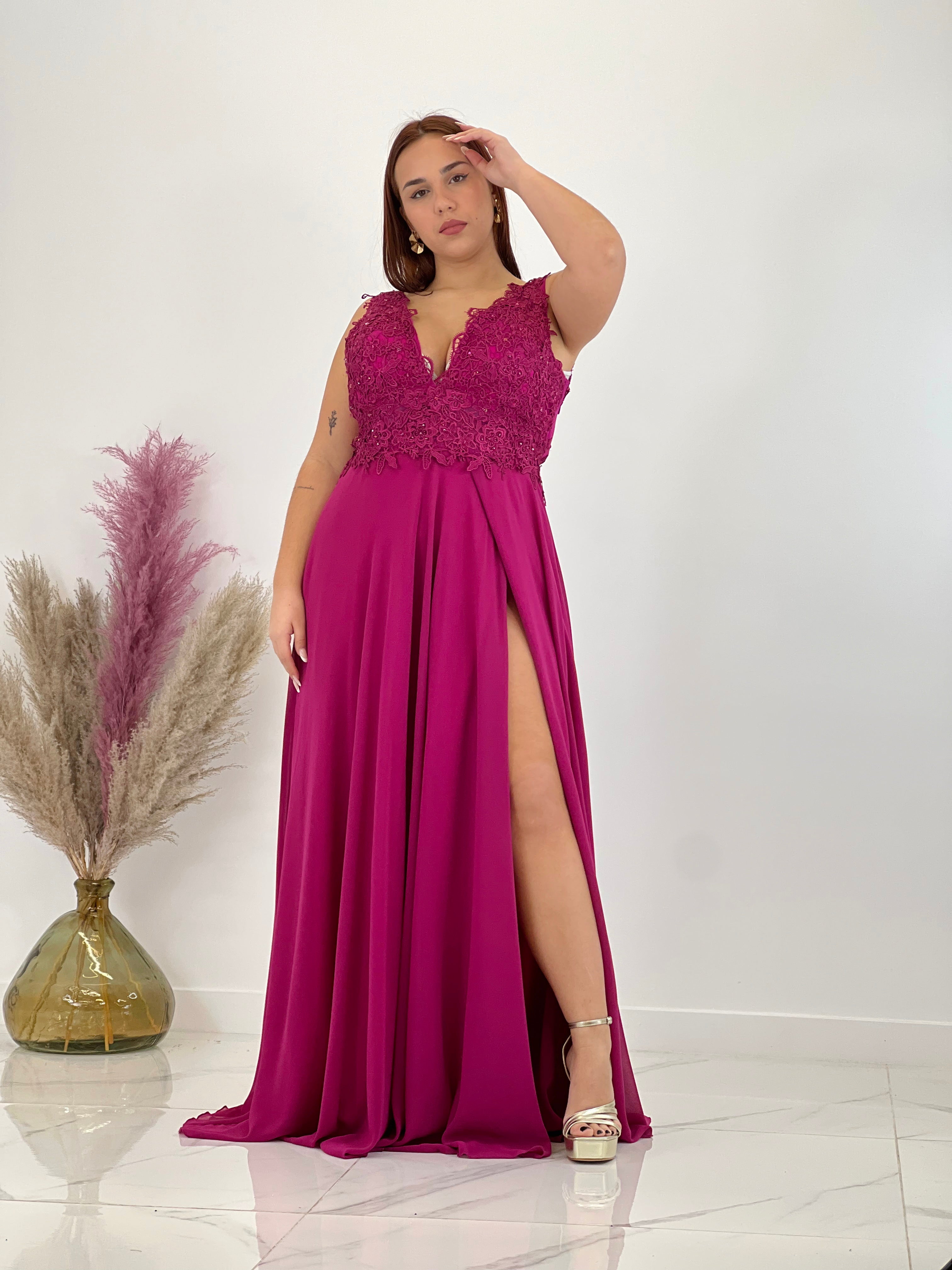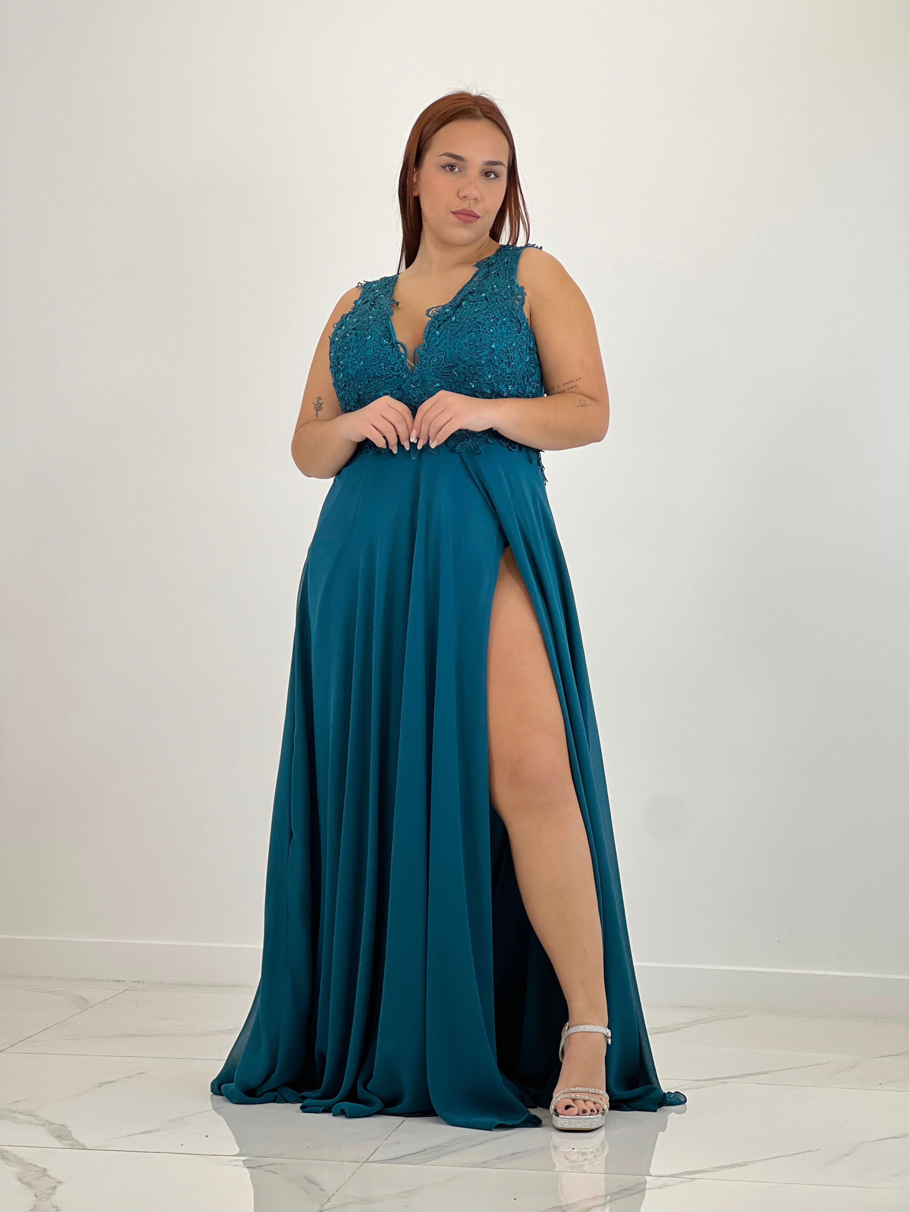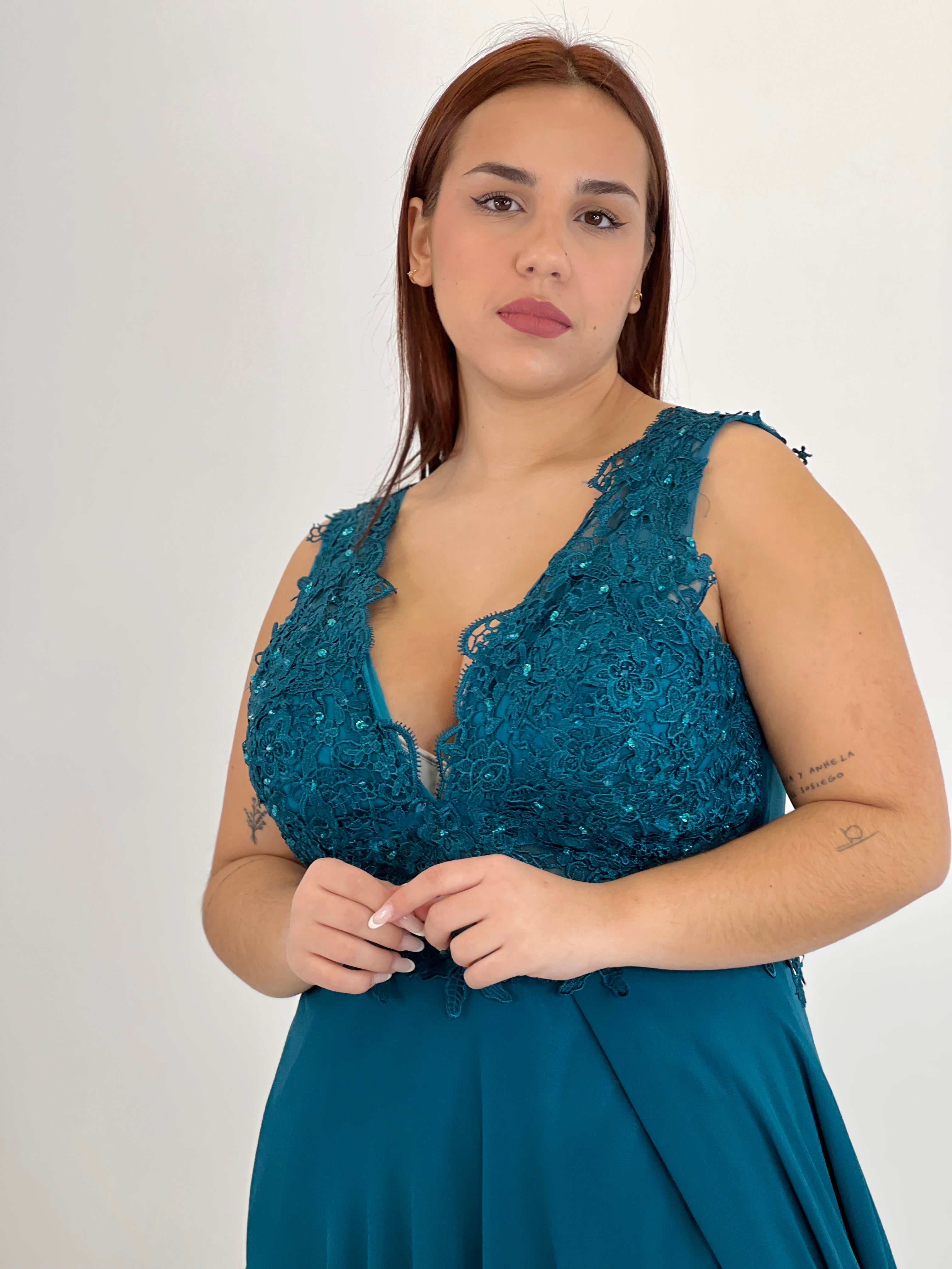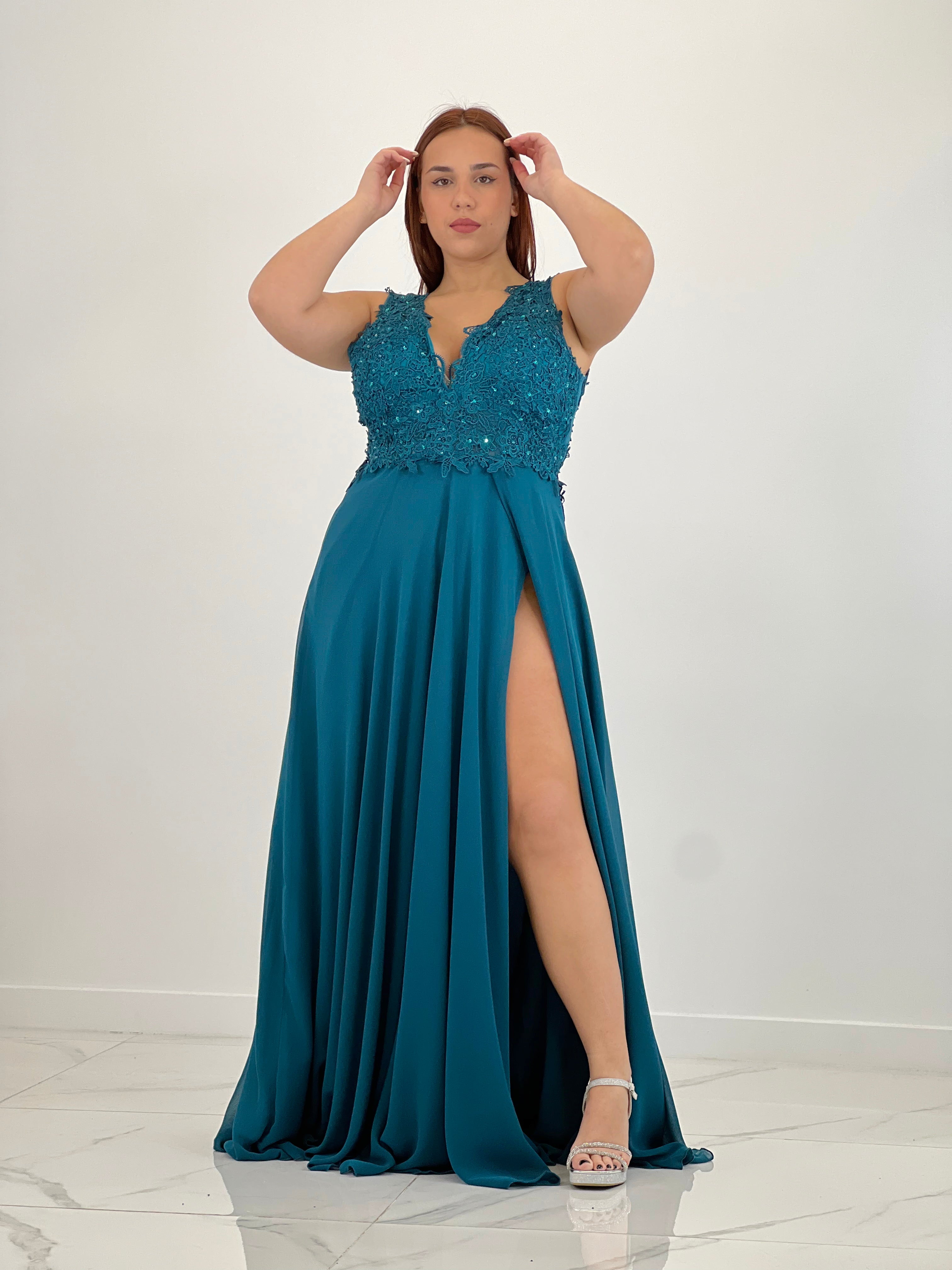 Este vestido largo de fiesta, con cuerpo de encaje y escote en V, es una opción deslumbrante para cualquier evento de gala o ceremonia. Su cierre con cremallera invisible en la espalda asegura un ajuste perfecto. Sus apliques de strass lo convierten en un vestido joya atemporal que te hará brillar con luz propia.