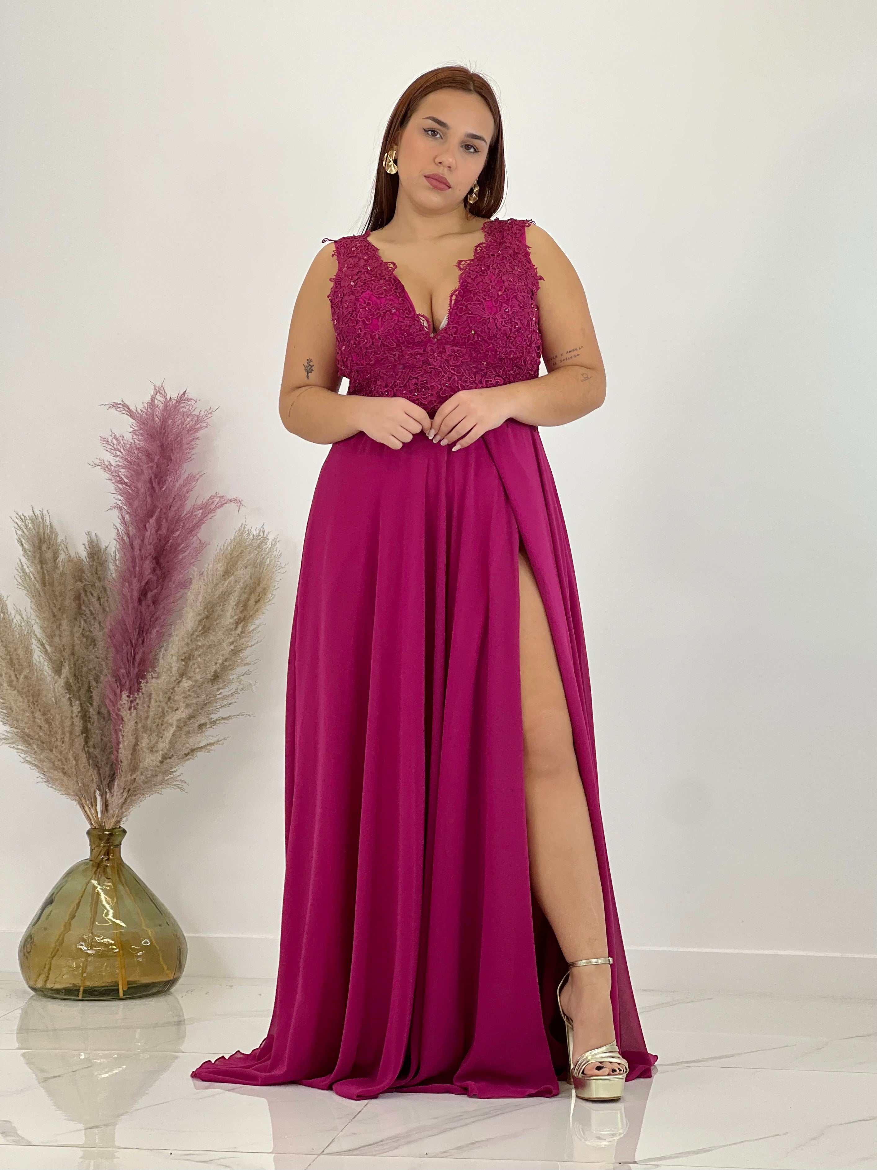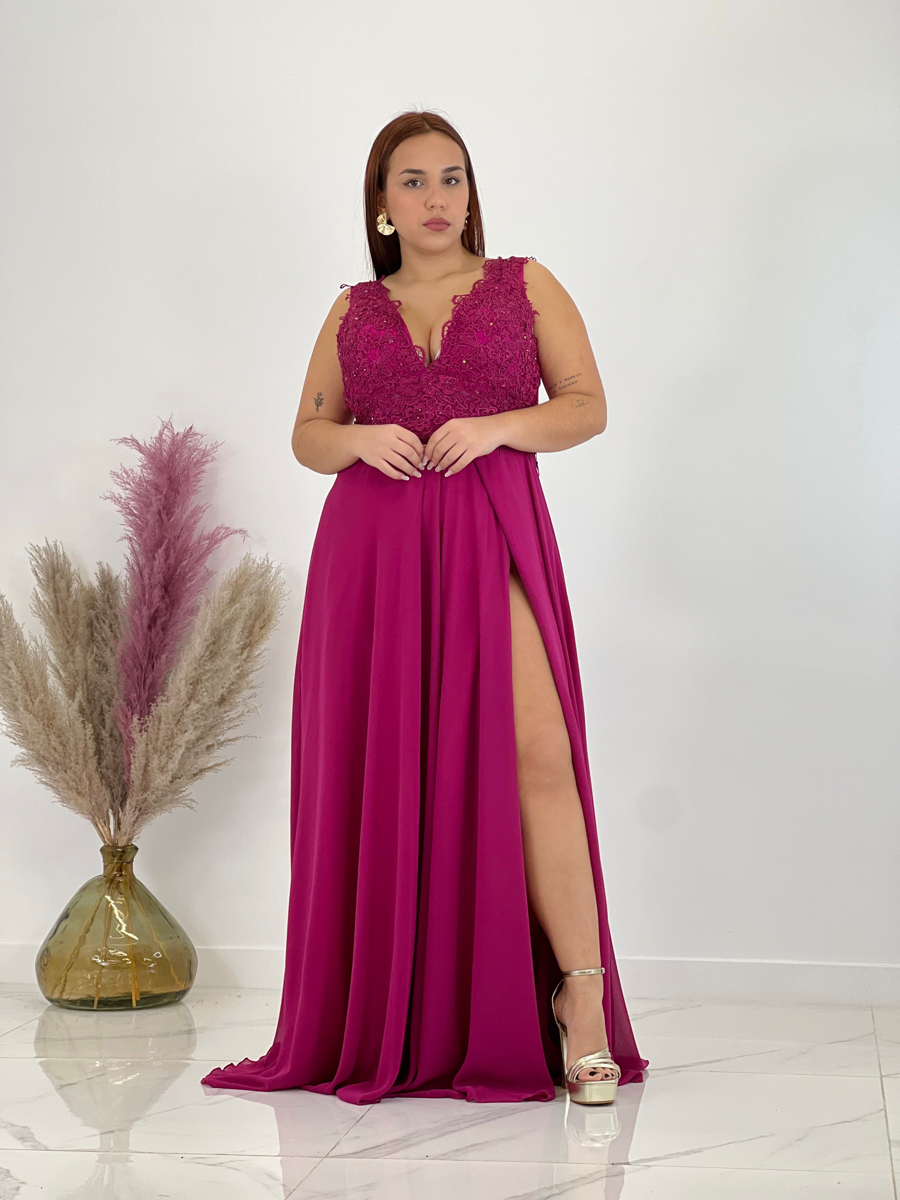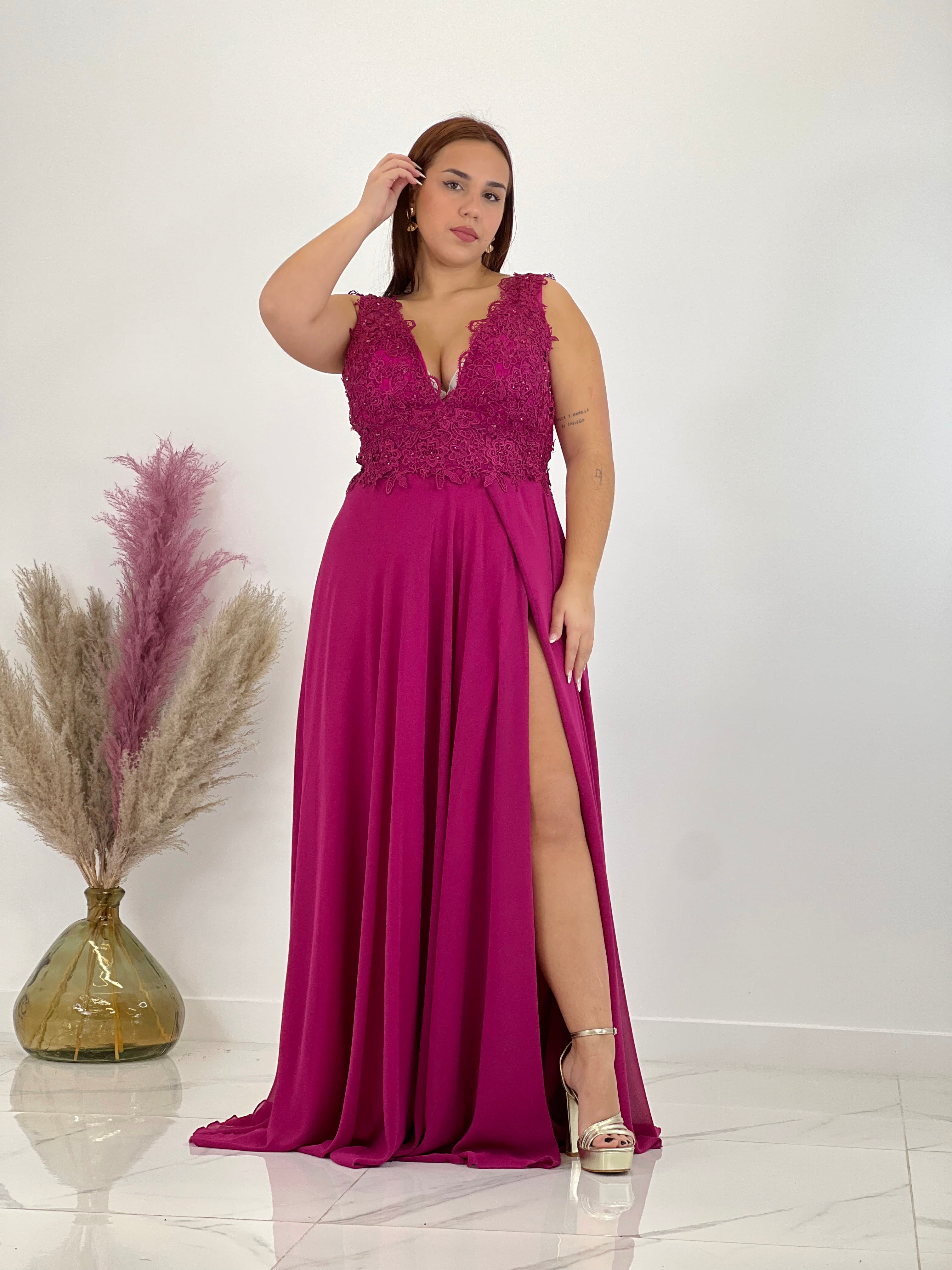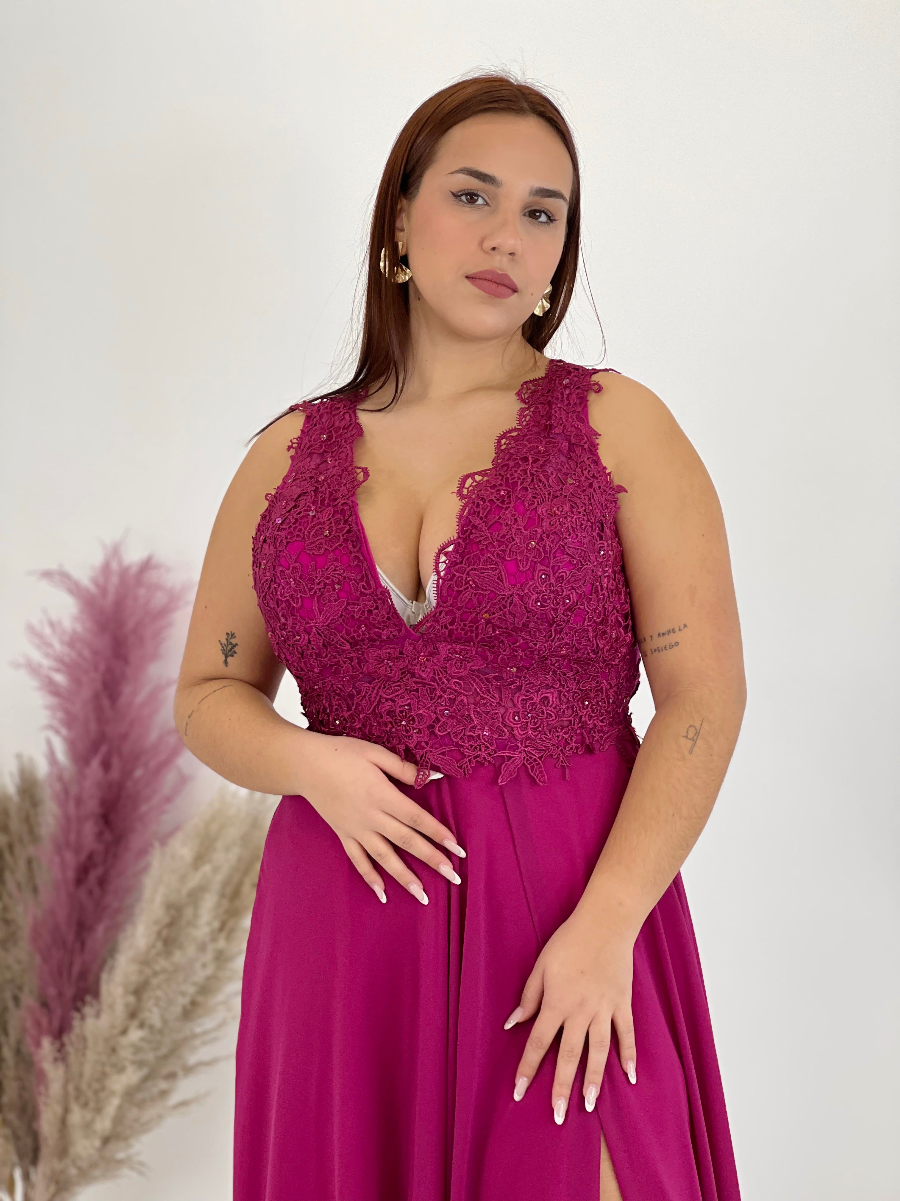 Este vestido largo de fiesta, con cuerpo de encaje y escote en V, es una opción deslumbrante para cualquier evento de gala o ceremonia. Su cierre con cremallera invisible en la espalda asegura un ajuste perfecto. Sus apliques de strass lo convierten en un vestido joya atemporal que te hará brillar con luz propia.