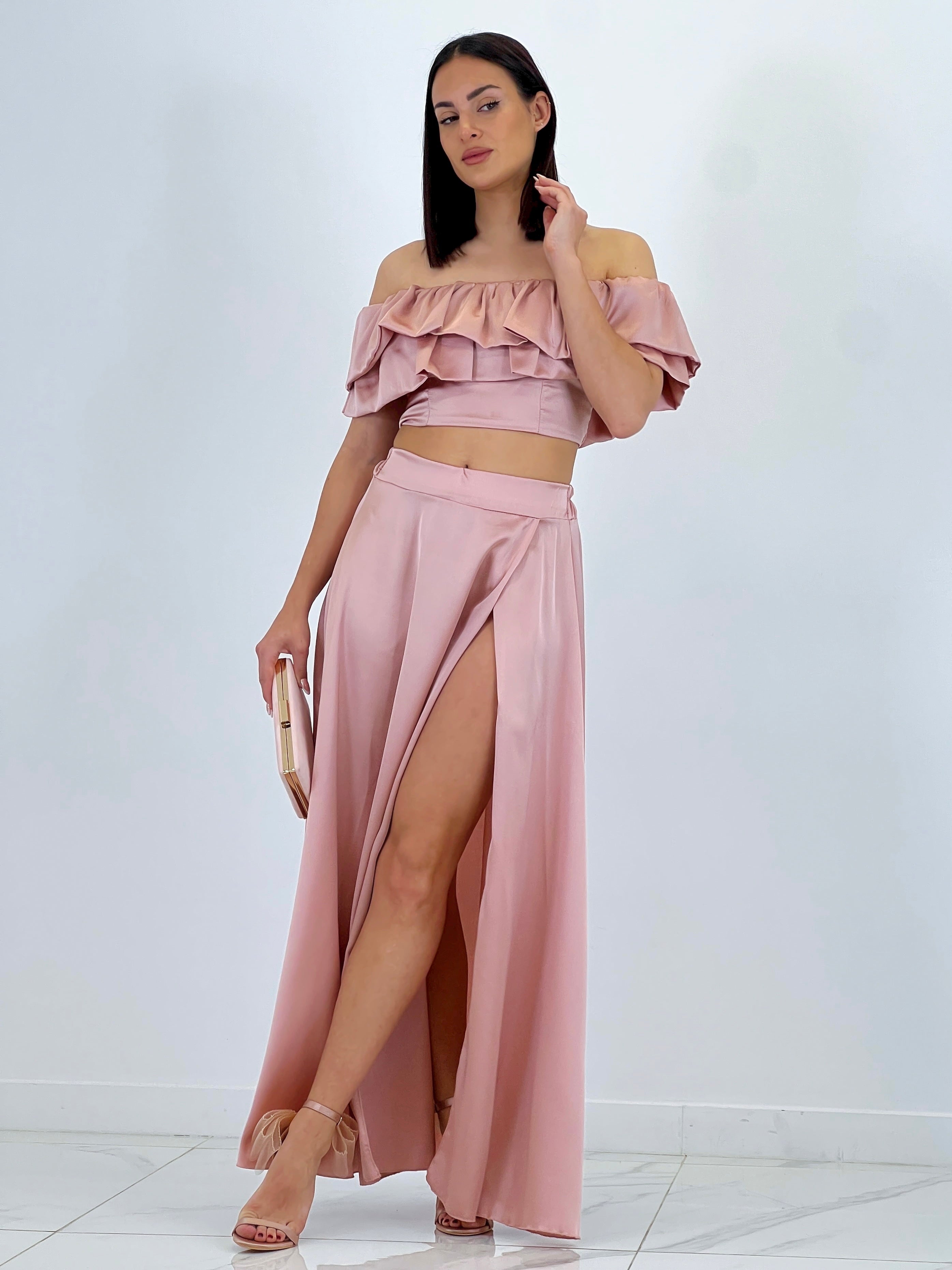 Con el conjunto falda y top Amaral, podrás lucir un look elegante y seductor. La falda y top largo de raso, con escote palabra de honor y hombros descubiertos, realzarán tu figura. El tejido fluido y la amplia obertura en la pernera te darán una caída excepcional. Falda elástica.