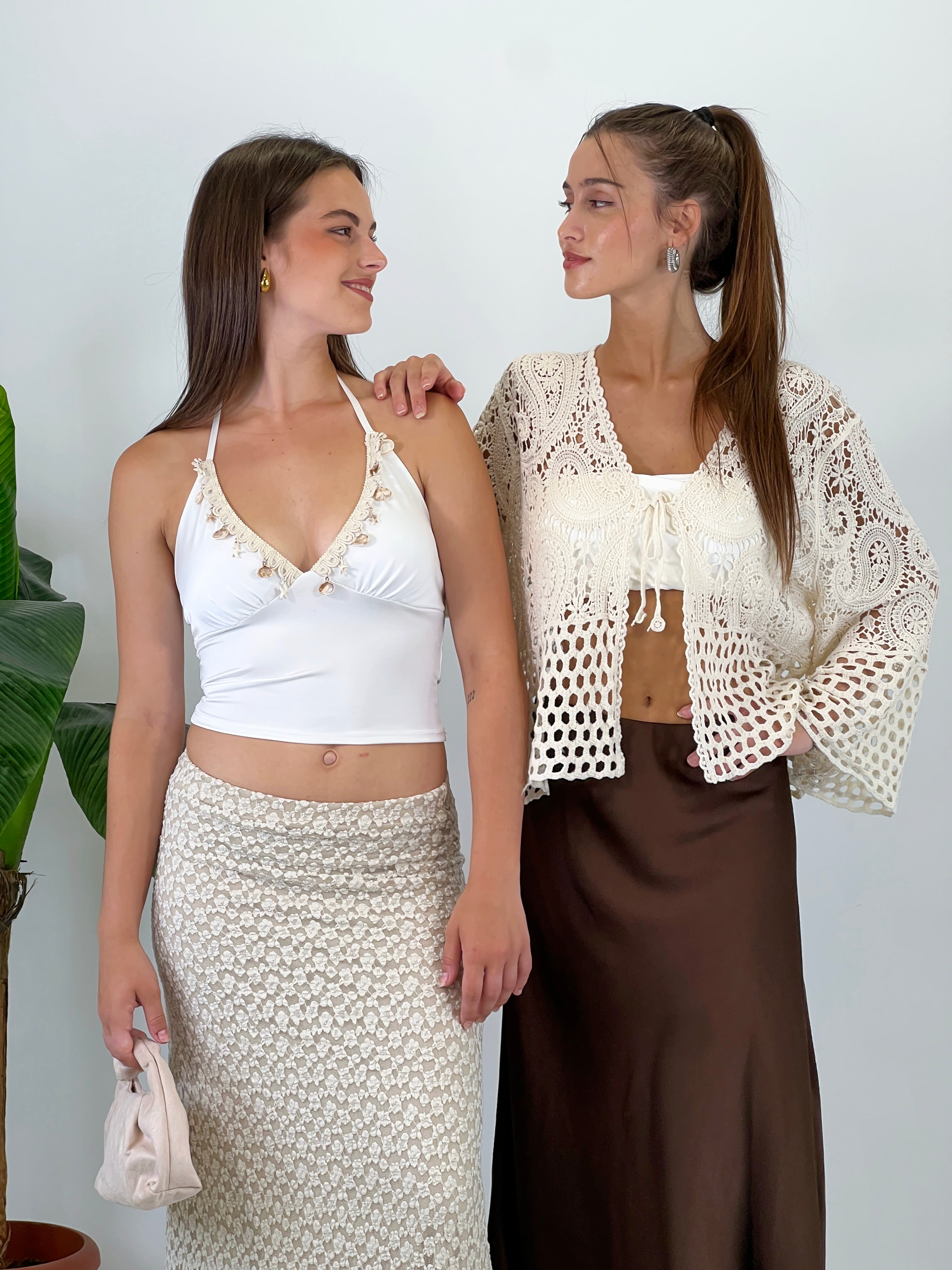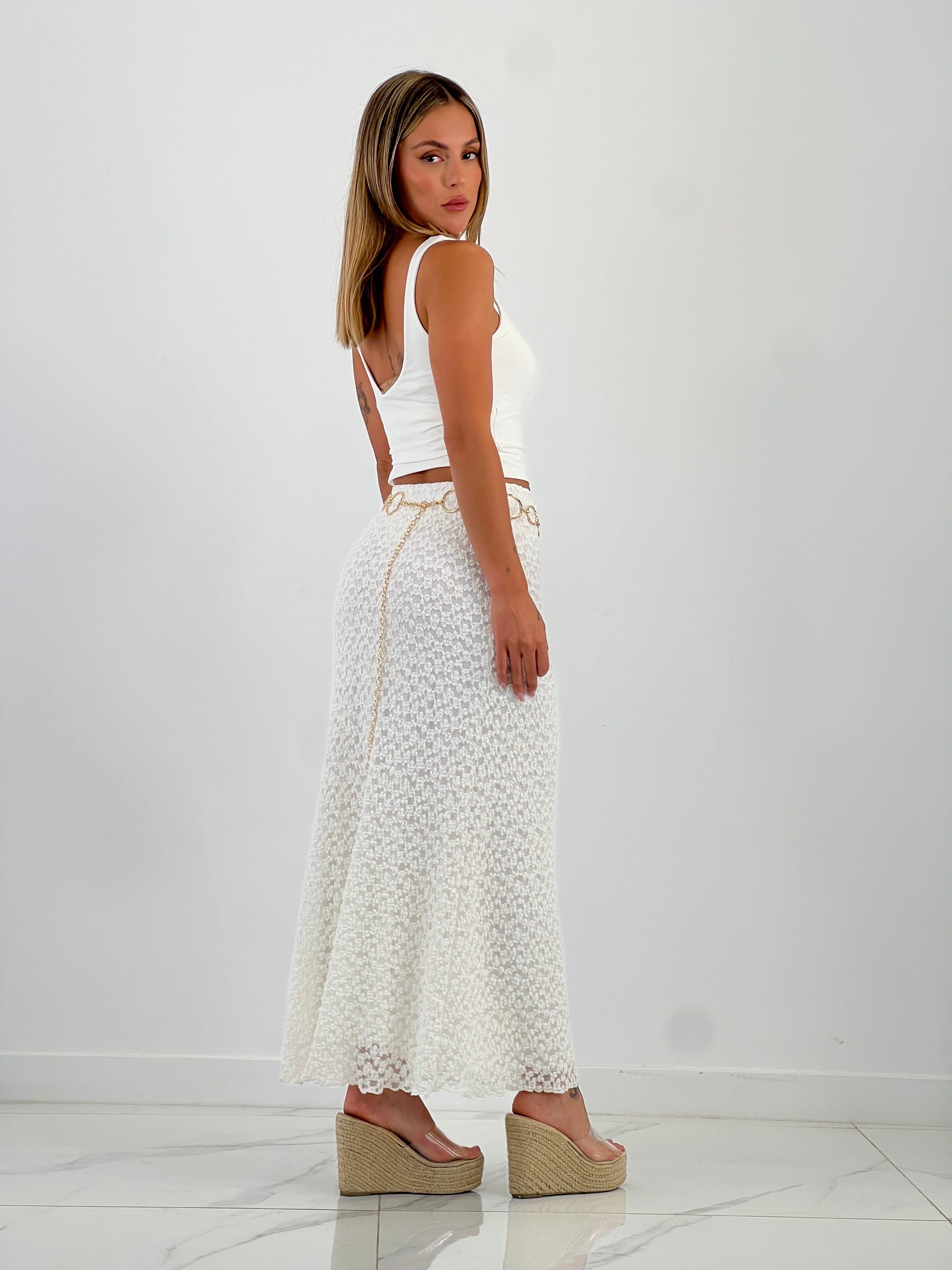 Falda larga de blonda, su diseño versátil permite combinarla tanto para ocasiones formales como informales. El patrón de blonda aporta textura y detalle visual, mientras que su longitud larga estiliza la silueta. Ideal para completar looks de temporada con un toque distinguido.
