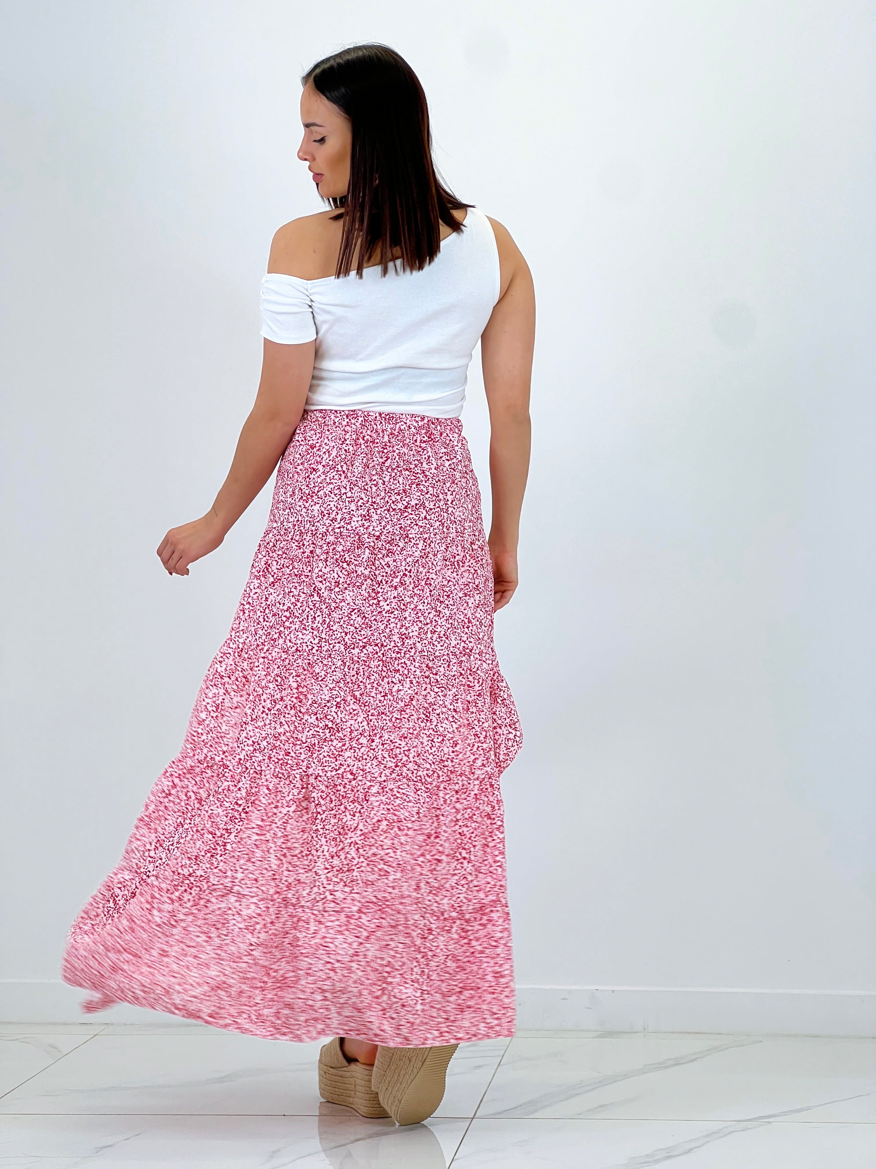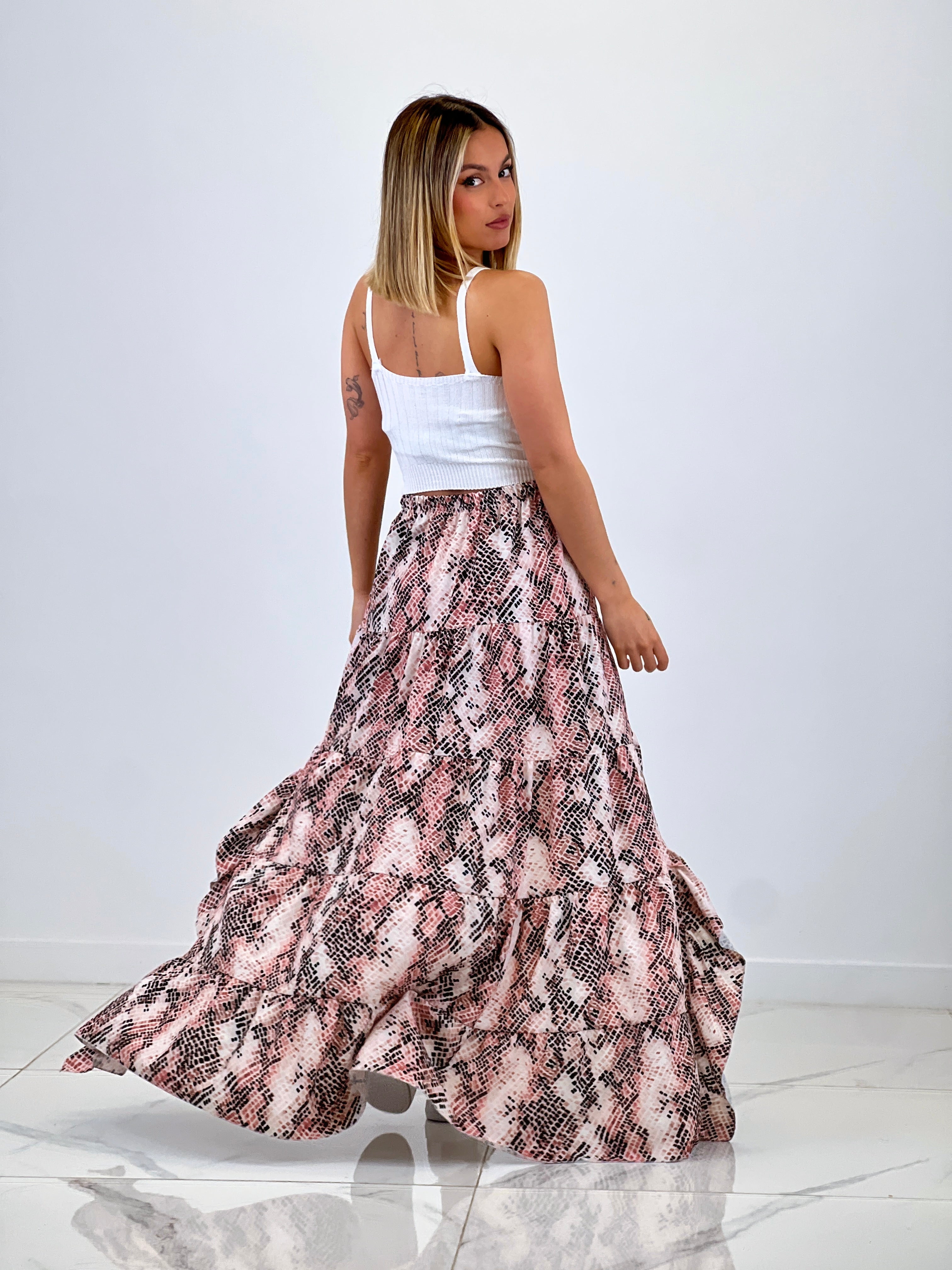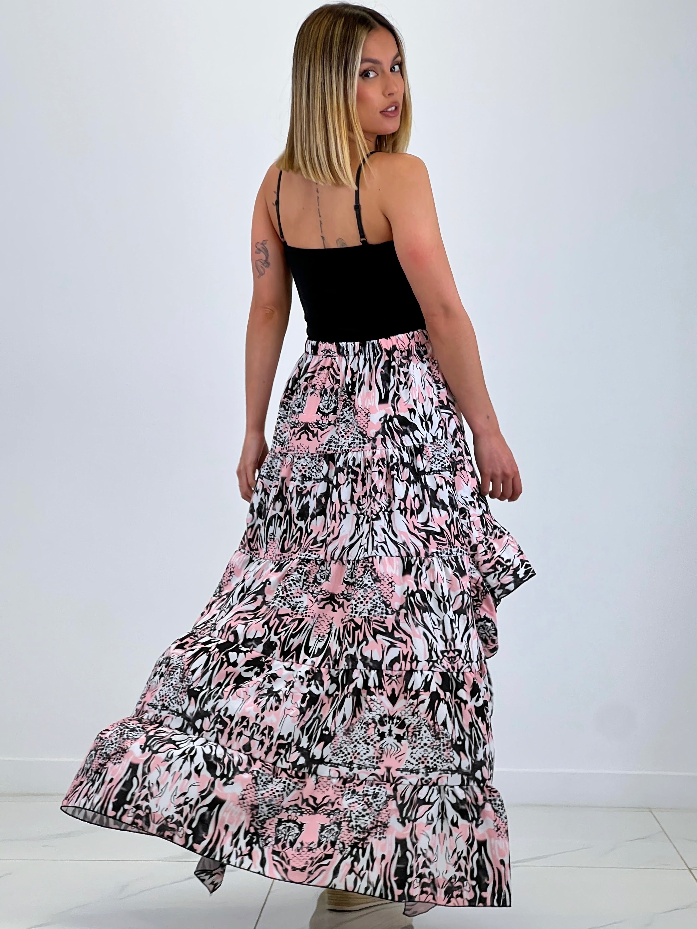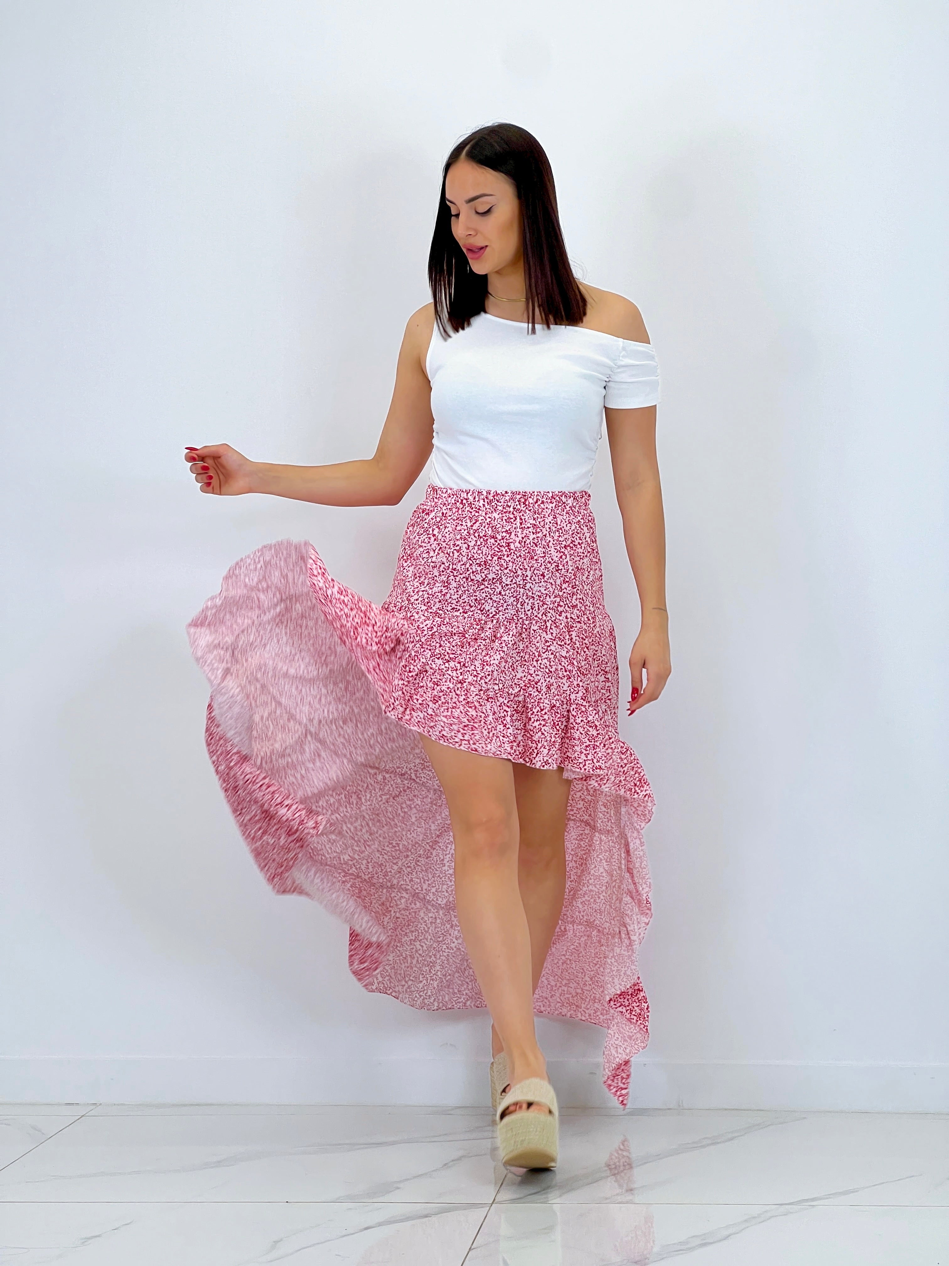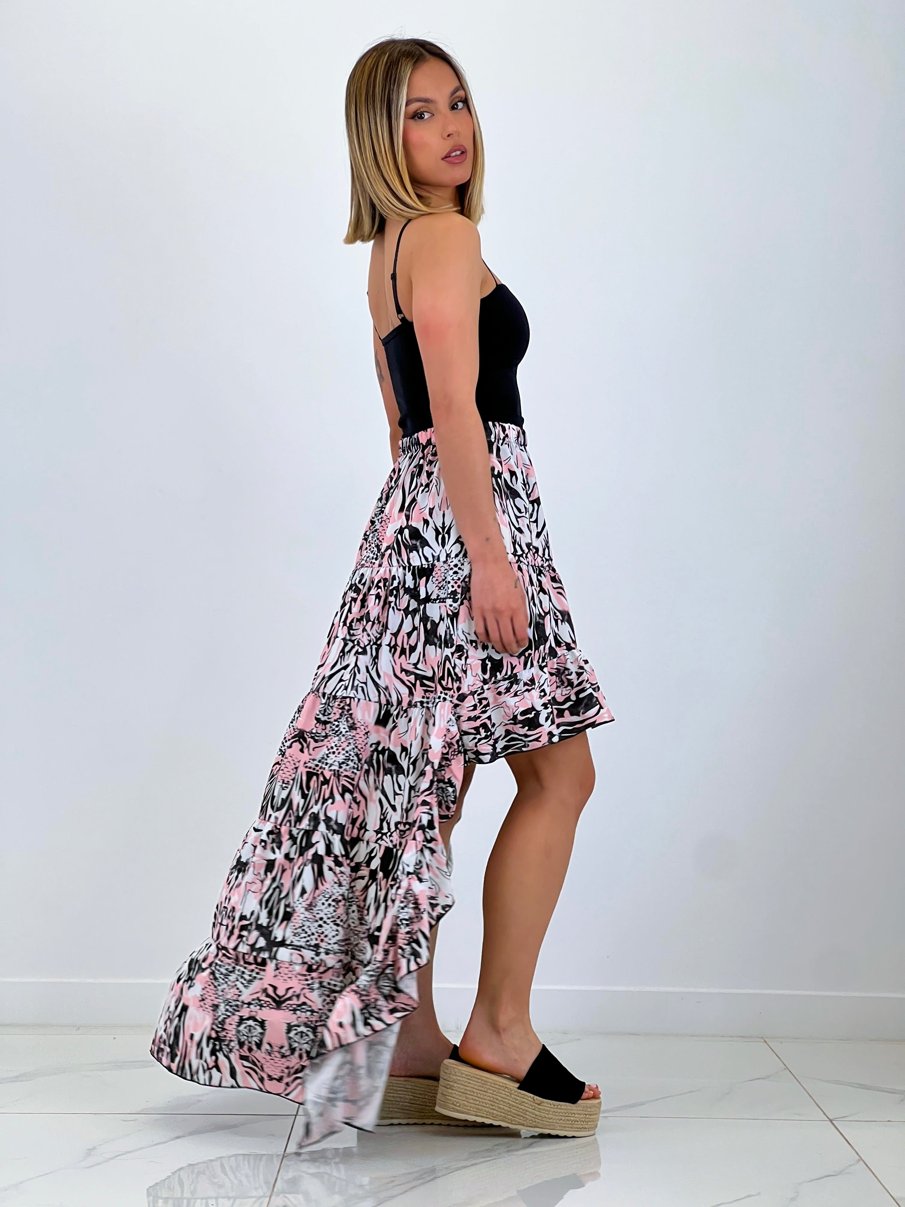 Falda estilo mullet, corta por delante y larga por detrás. Con volantes y estampada.