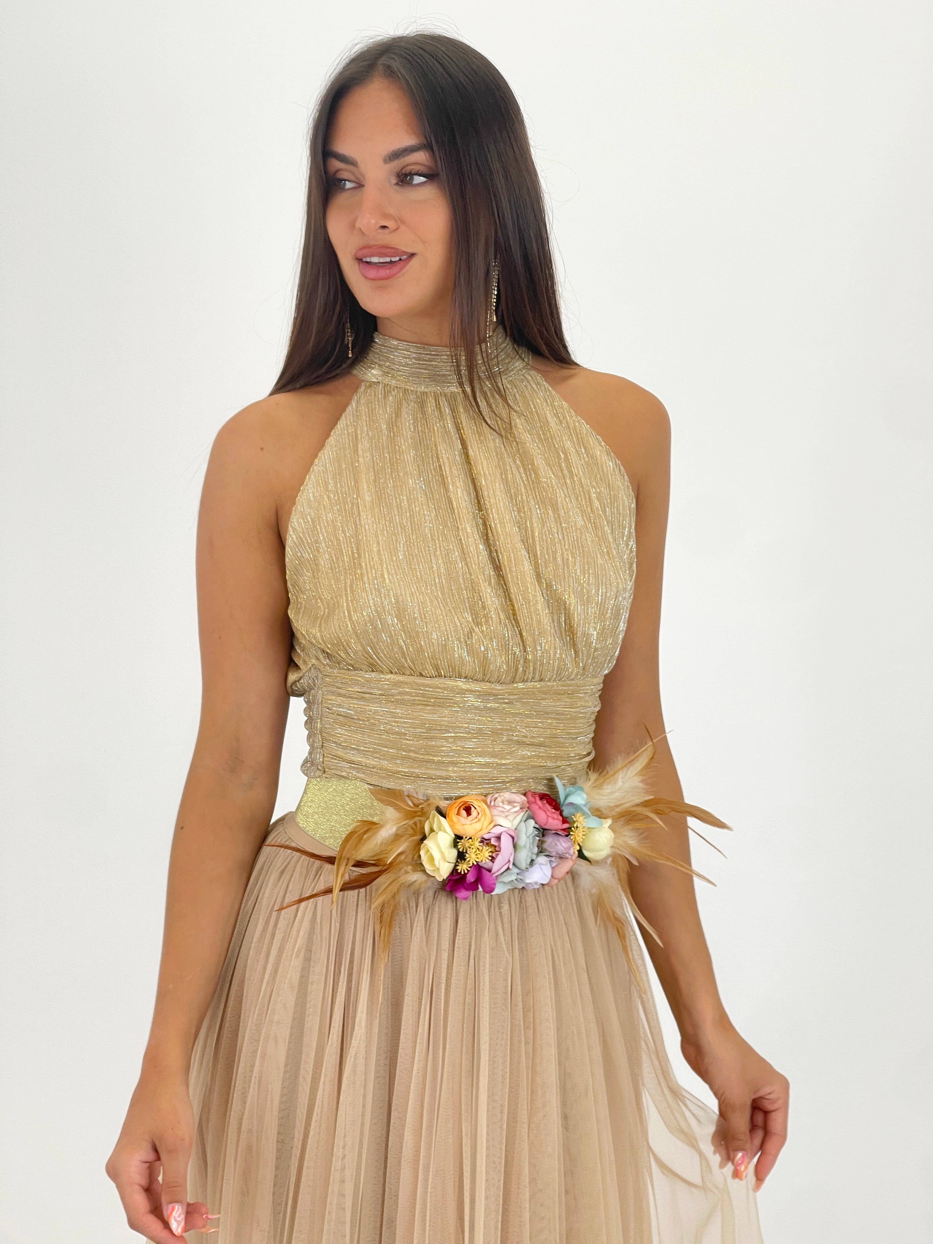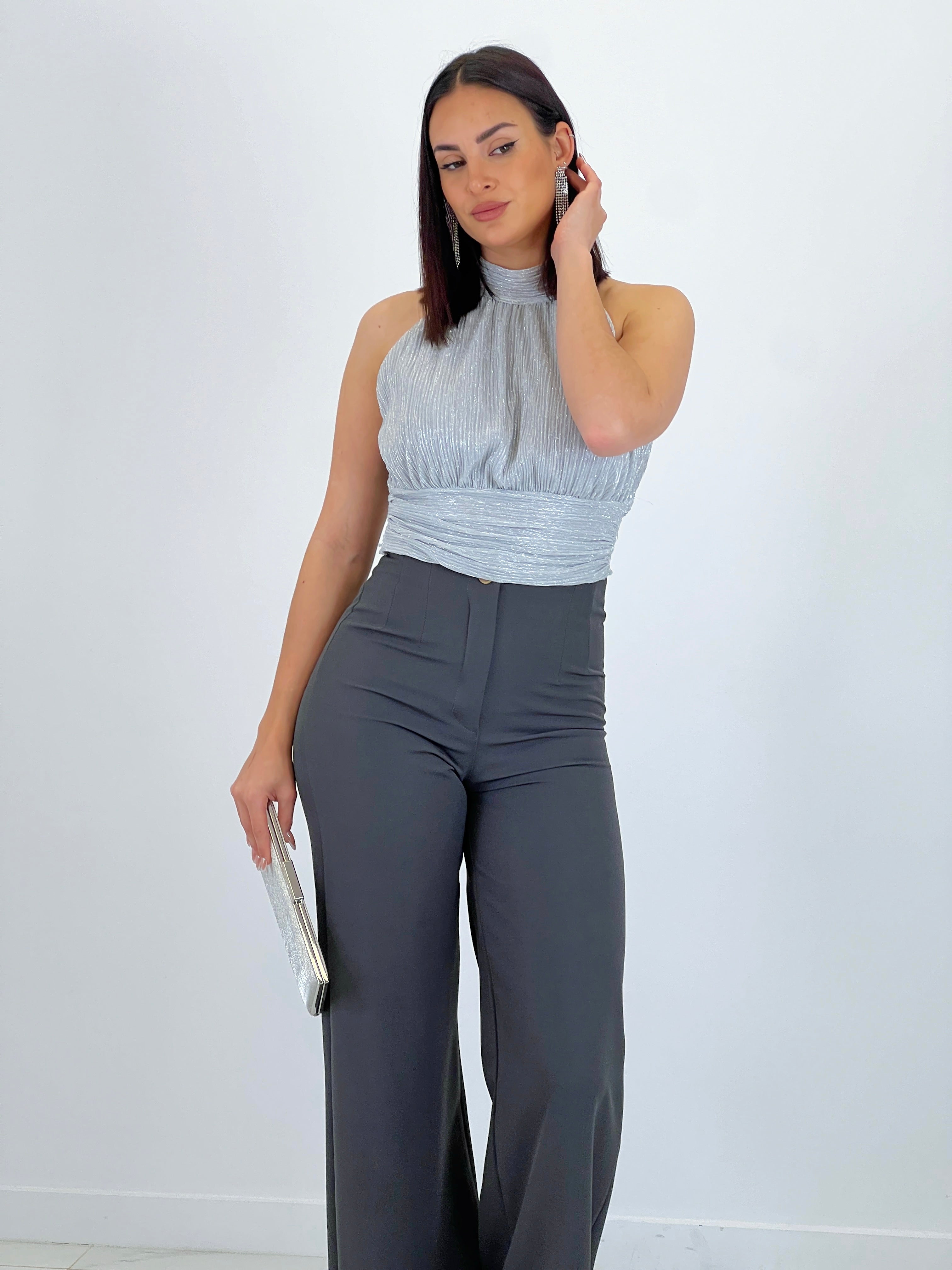 Este top de brillo, diseñado con un elegante cuello halter, aporta un toque sofisticado y moderno a cualquier look. Su acabado luminoso realza la presencia, mientras que su diseño estructurado asegura un ajuste cómodo y favorecedor. Perfecto para combinar con una falda de tul, crea un conjunto armonioso que destaca en ocasiones especiales y eventos donde se busca un estilo refinado y femenino. Este top se convierte en una pieza clave para quienes desean destacar con elegancia y personalidad.