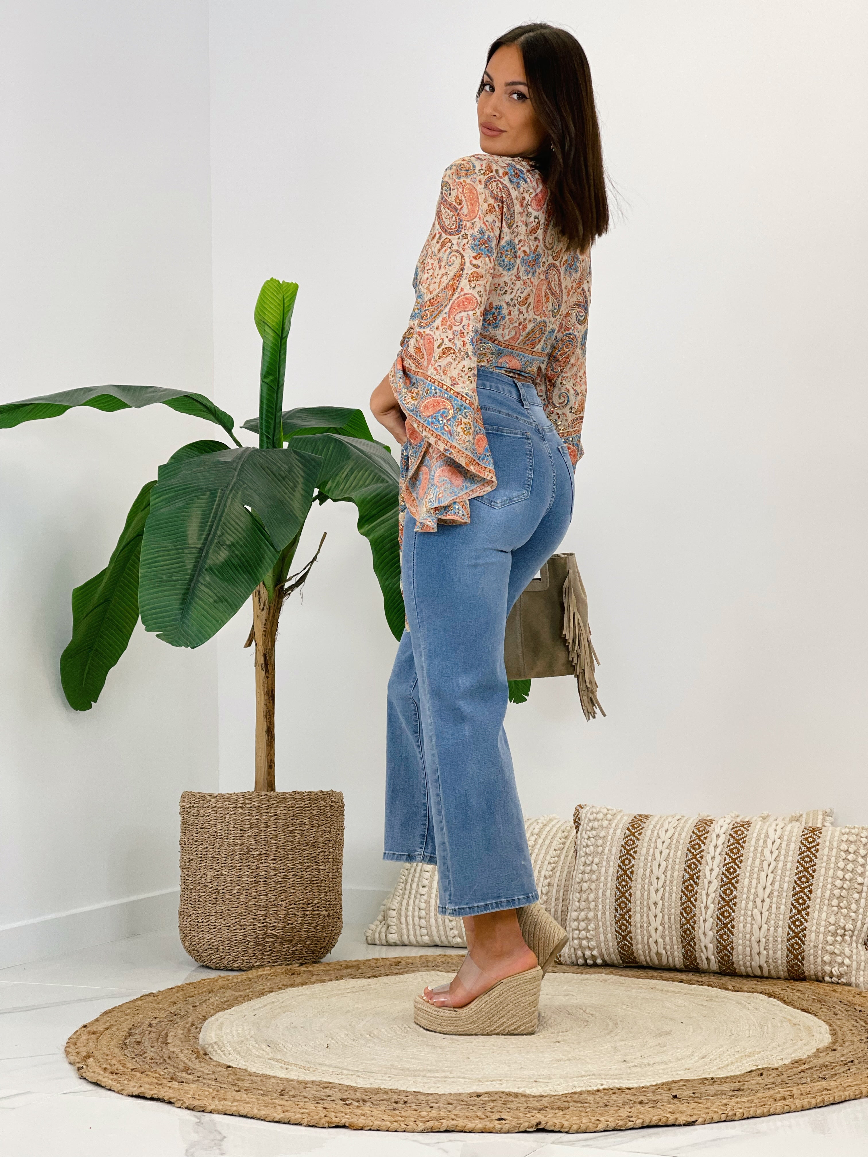 Top kimono estampado Boho de manga larga acampanada. Tejido de seda. Cierre con lazada y nudo a la cintura para una prenda veraniega versatil.