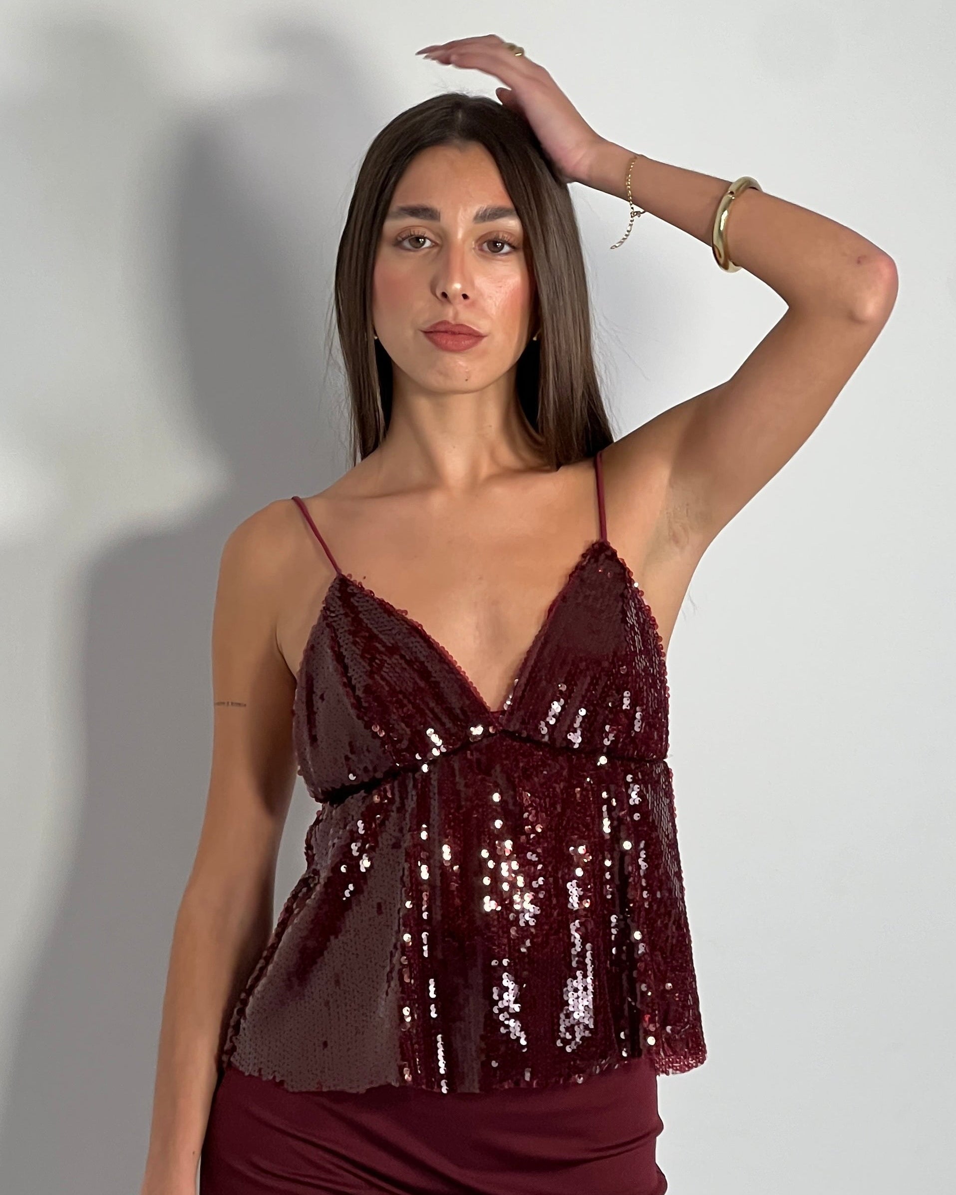 Este top de tirantes finos presenta un escote en V que realza el pecho con un ajuste ceñido, mientras que la caída fluida en la parte del torso aporta un estilo elegante y cómodo. Su diseño sofisticado con lentejuelas añade un brillo sutil, ideal para looks de noche con un toque refinado.