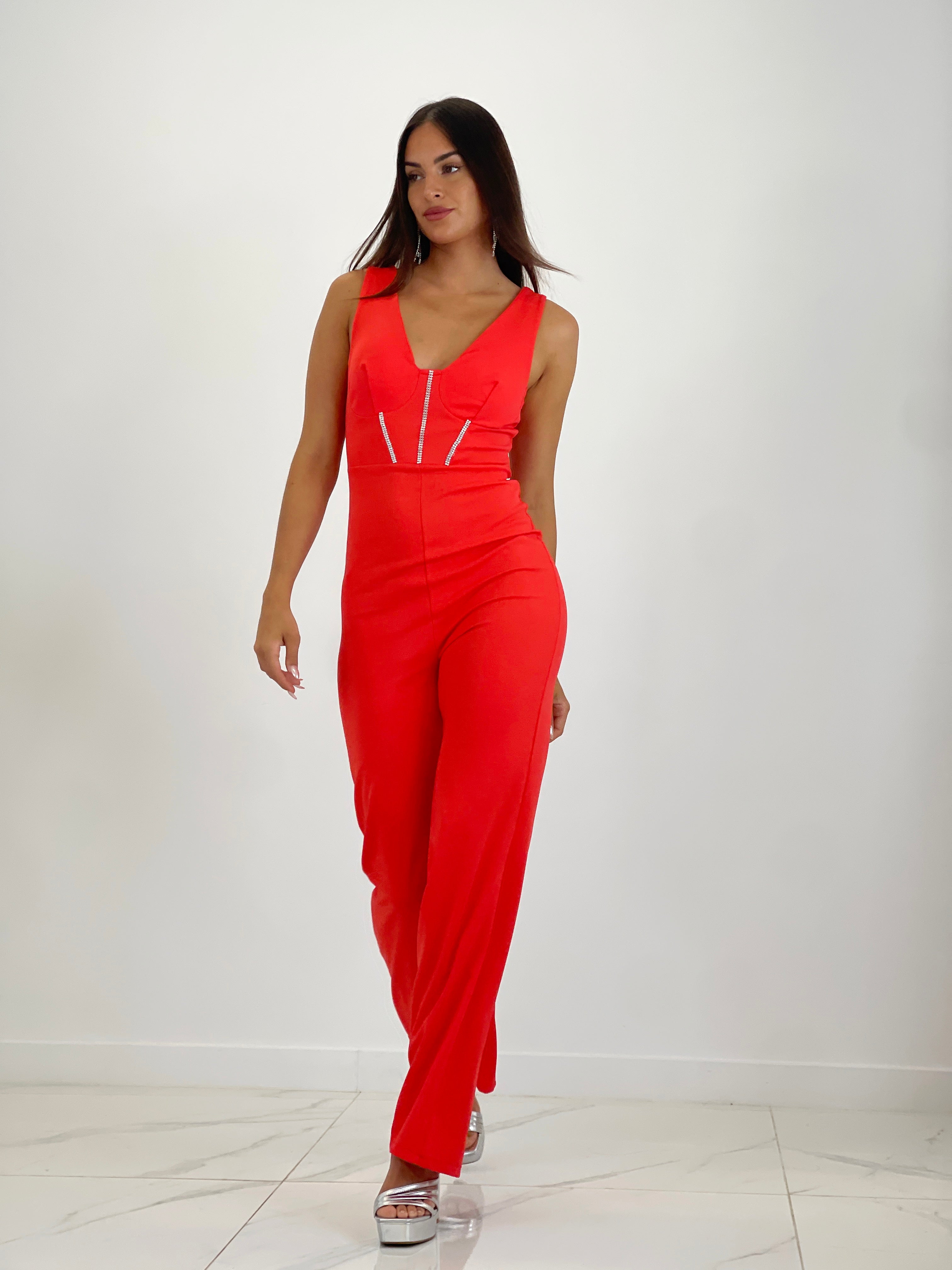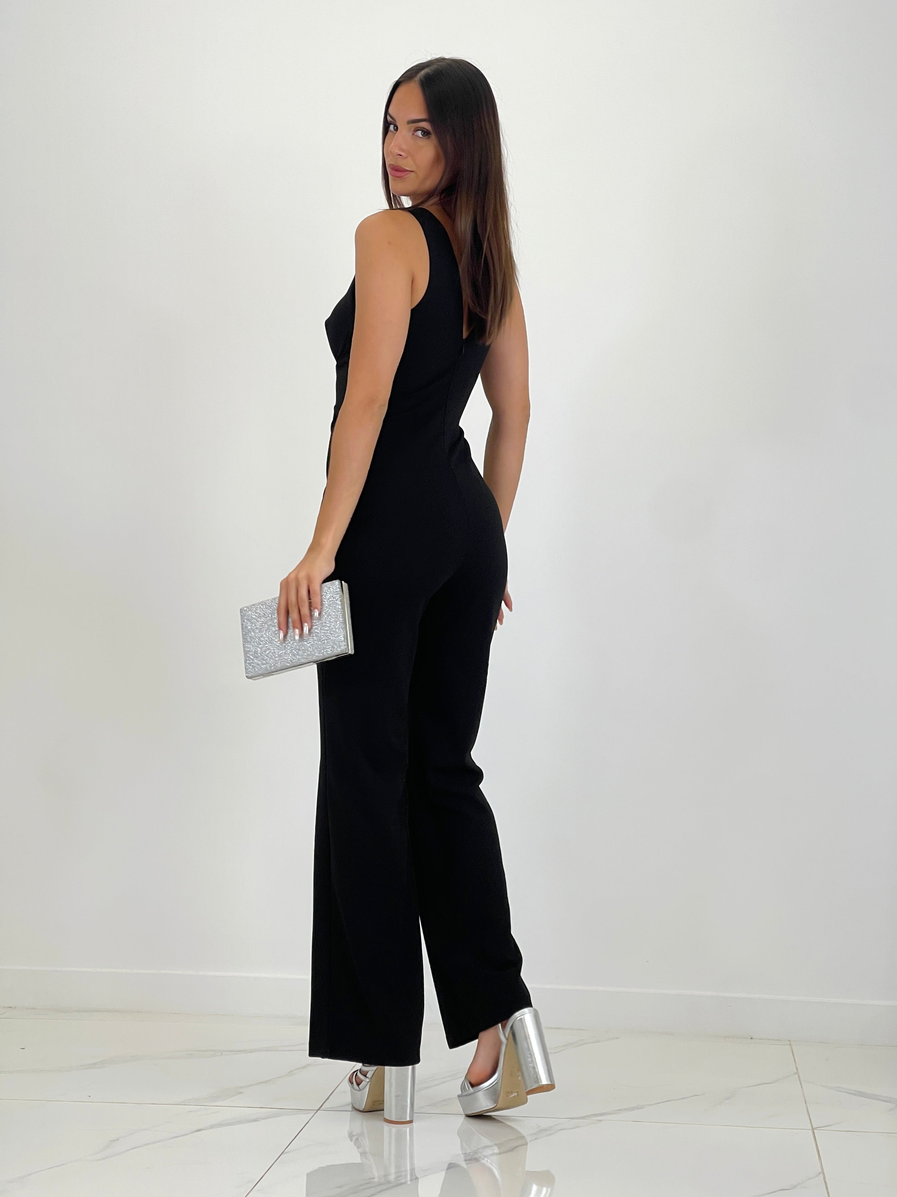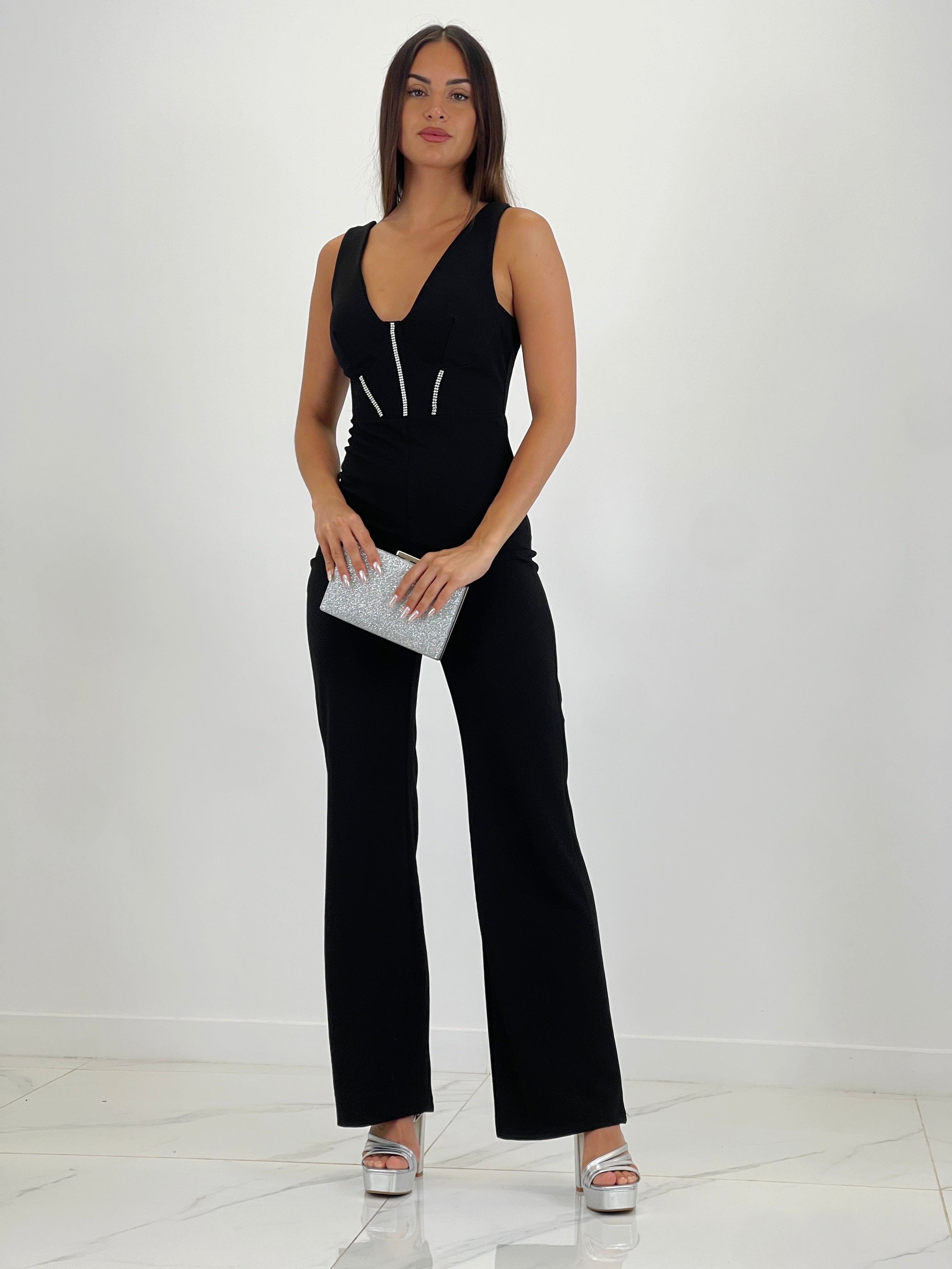Este mono corsé brillantitos Ángel cuenta con un diseño elegante y llamativo. Sus tirantes y pierna flare añaden un toque de estilo, mientras que la cremallera en la parte superior trasera lo hace cómodo y fácil de poner.