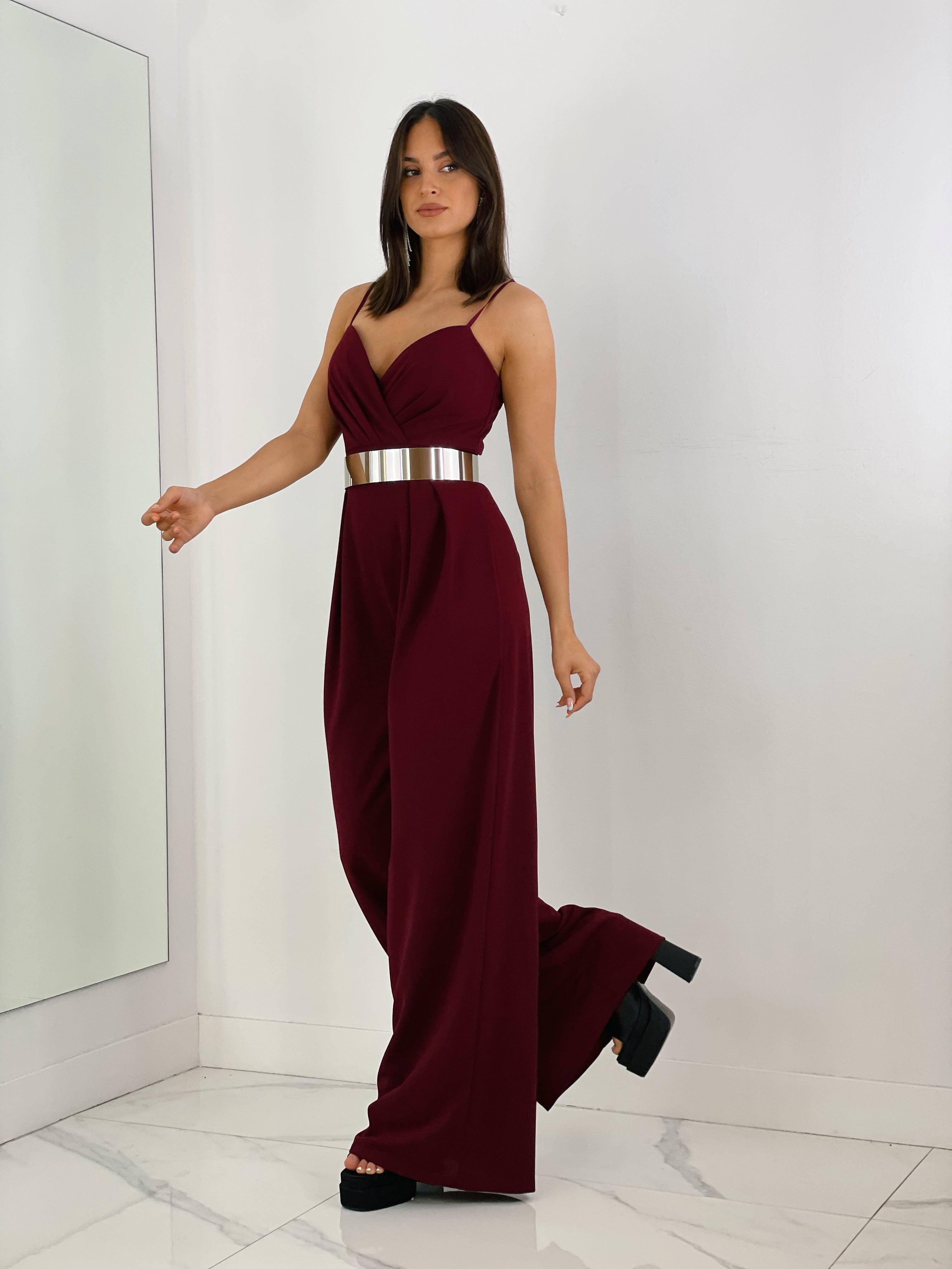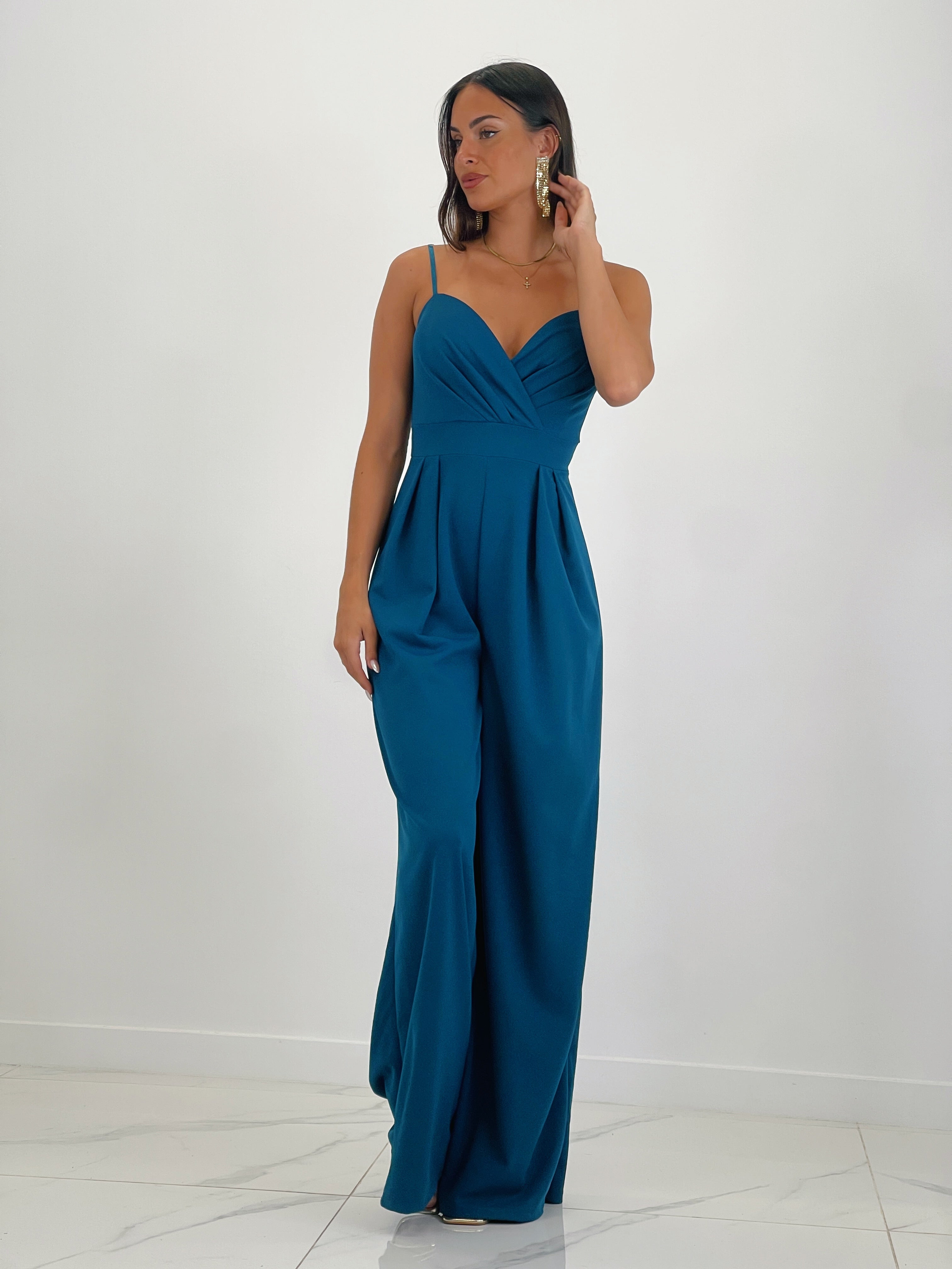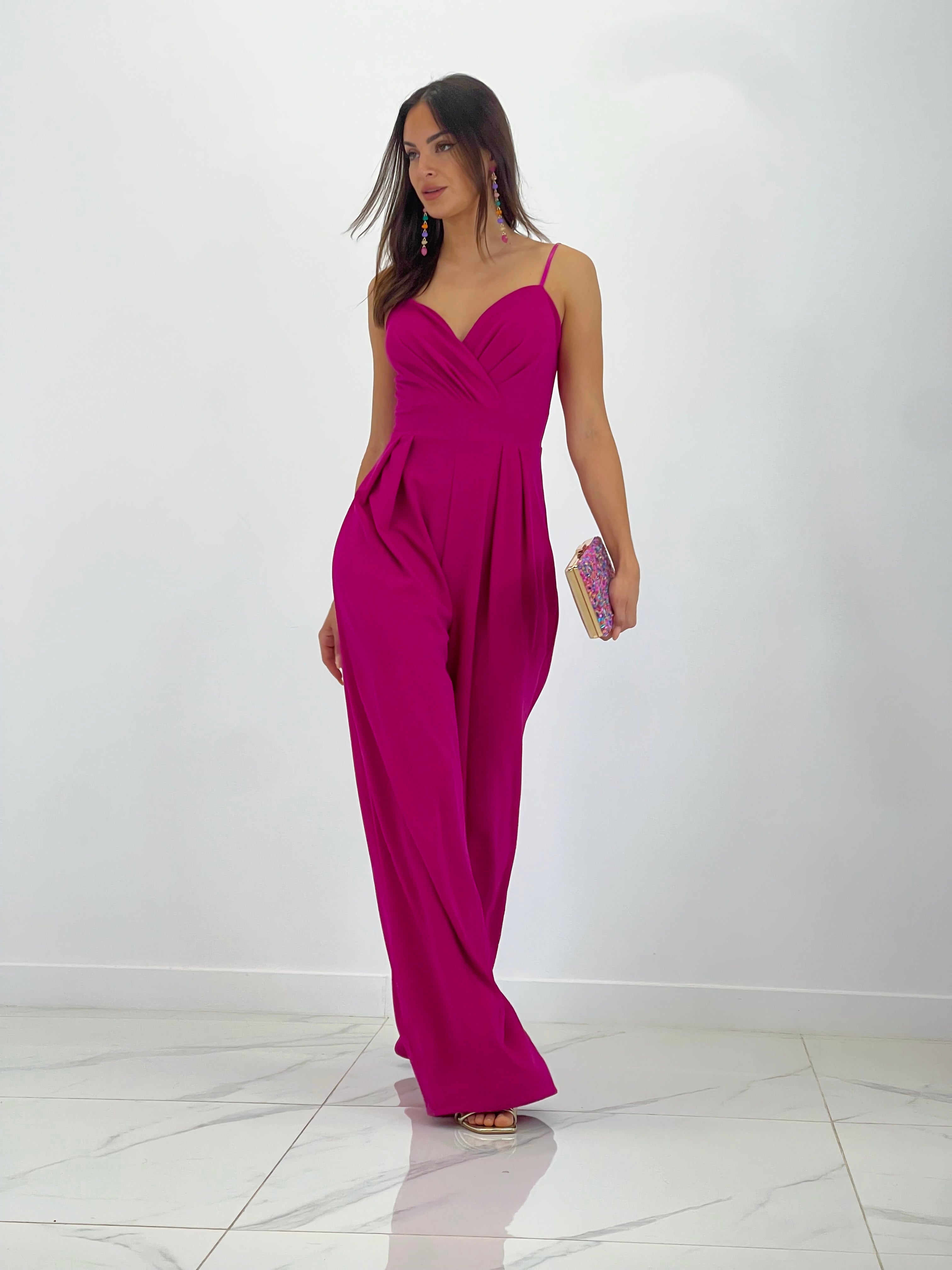 Este mono de estilo crepé es una prenda elegante y versátil, perfecta para cualquier ocasión. Cuenta con un escote cruzado con copa acabado en pico y un tirante ajustable para un ajuste personalizado. La cintura ajustada y la pernera ancha con pinzas le dan un toque favorecedor a tu figura. Además, el cierre trasero mediante cremallera oculta en la costura garantiza un acabado impecable.