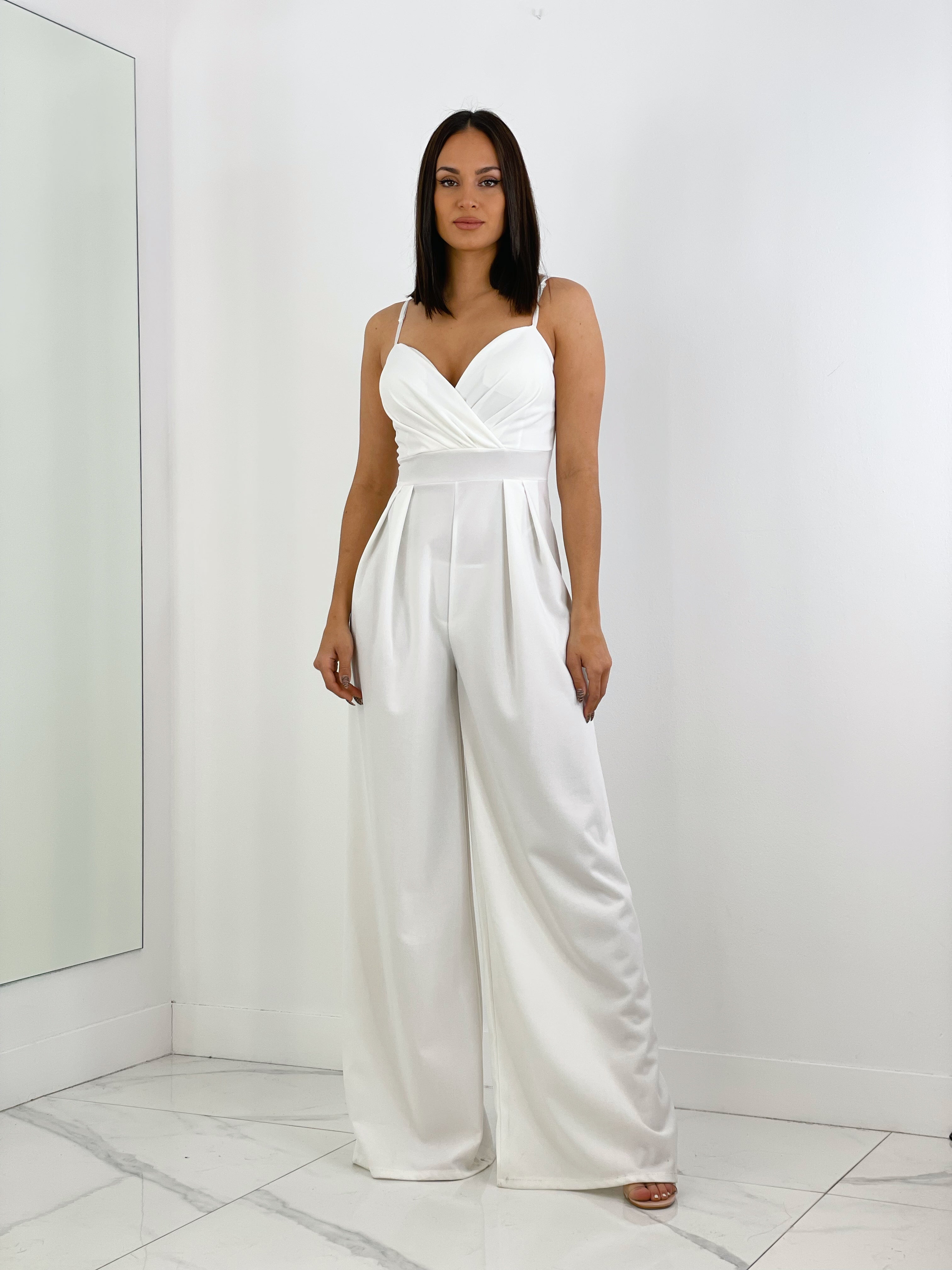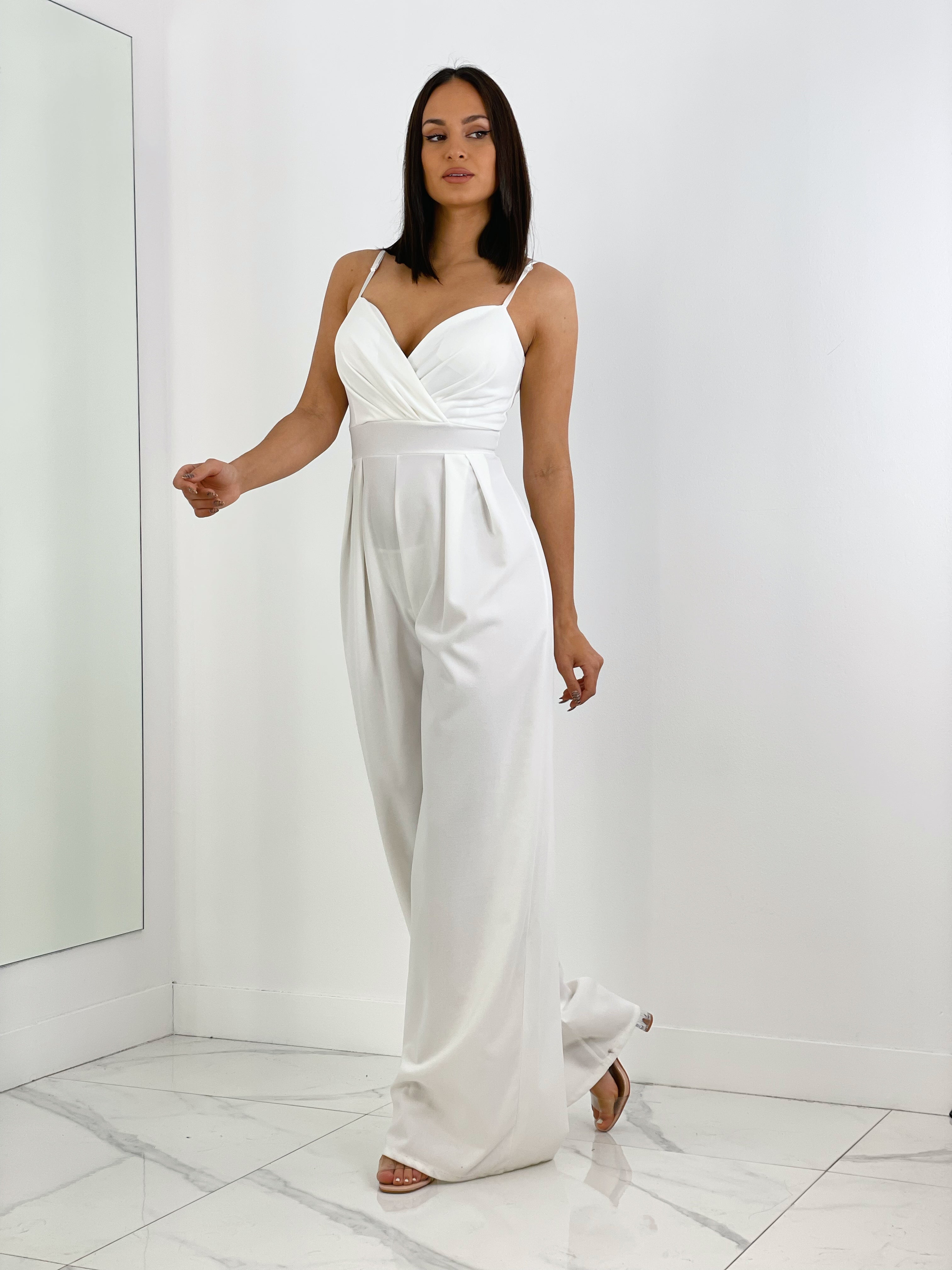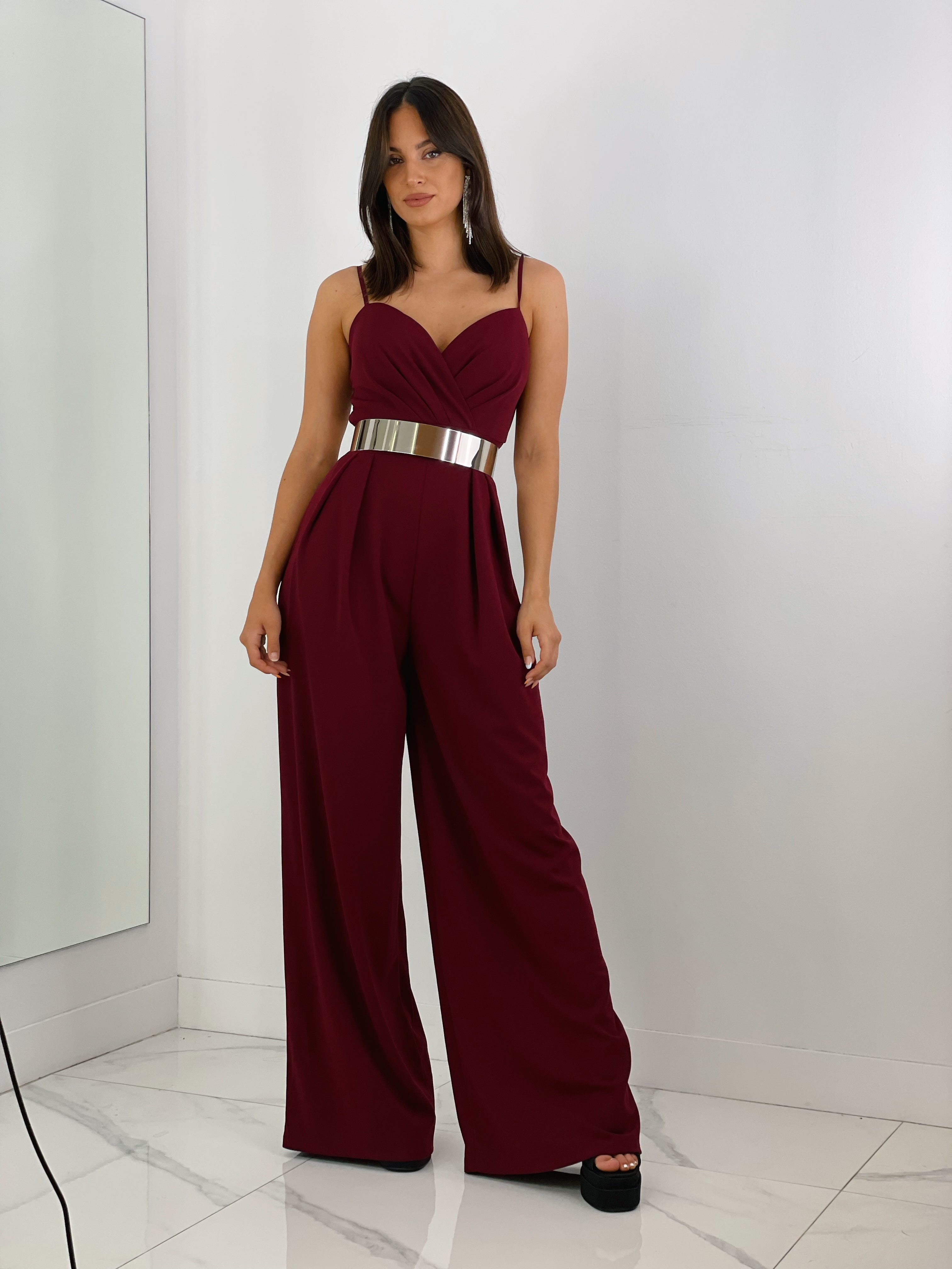 Este mono de estilo crepé es una prenda elegante y versátil, perfecta para cualquier ocasión. Cuenta con un escote cruzado con copa acabado en pico y un tirante ajustable para un ajuste personalizado. La cintura ajustada y la pernera ancha con pinzas le dan un toque favorecedor a tu figura. Además, el cierre trasero mediante cremallera oculta en la costura garantiza un acabado impecable.