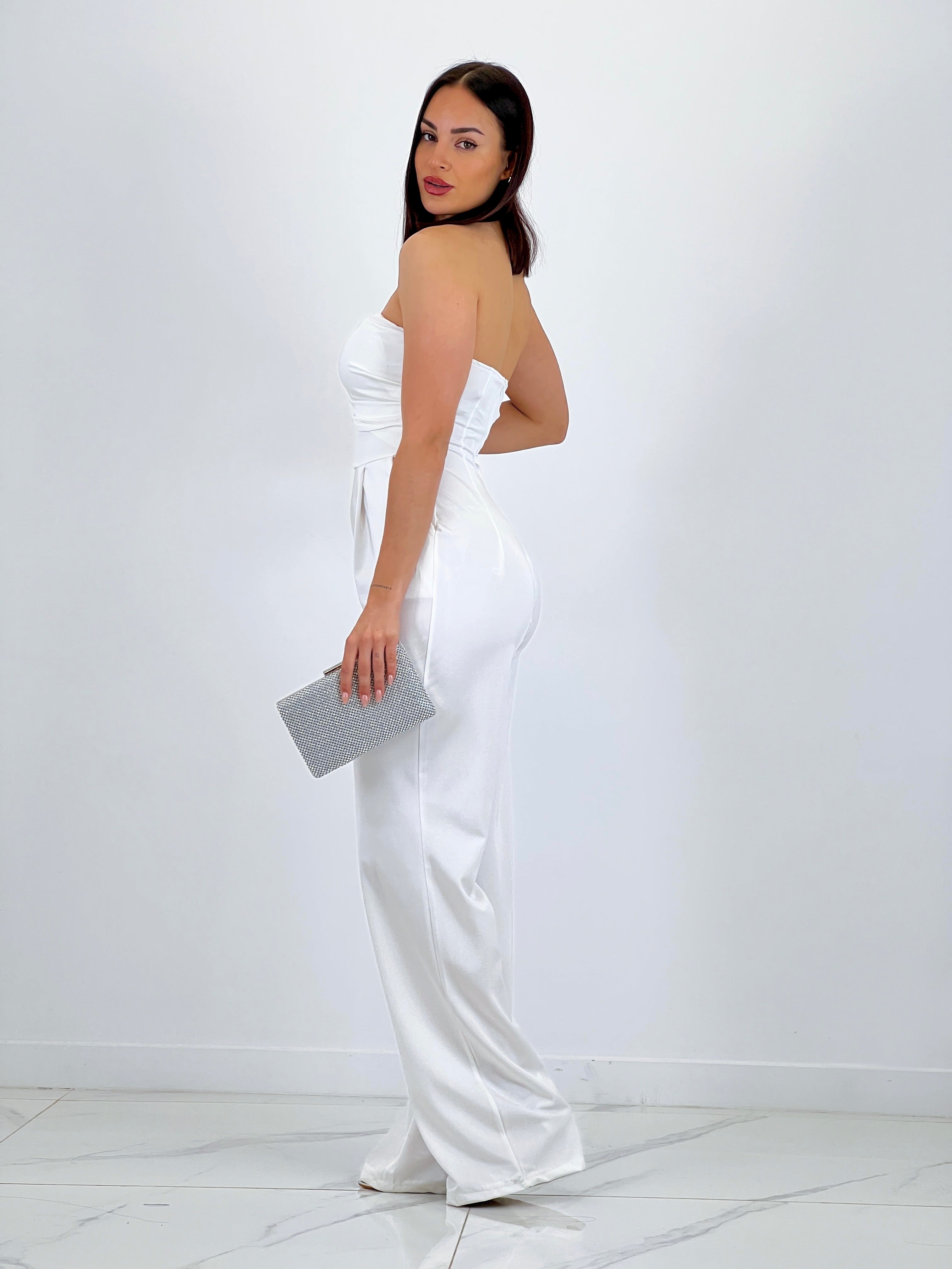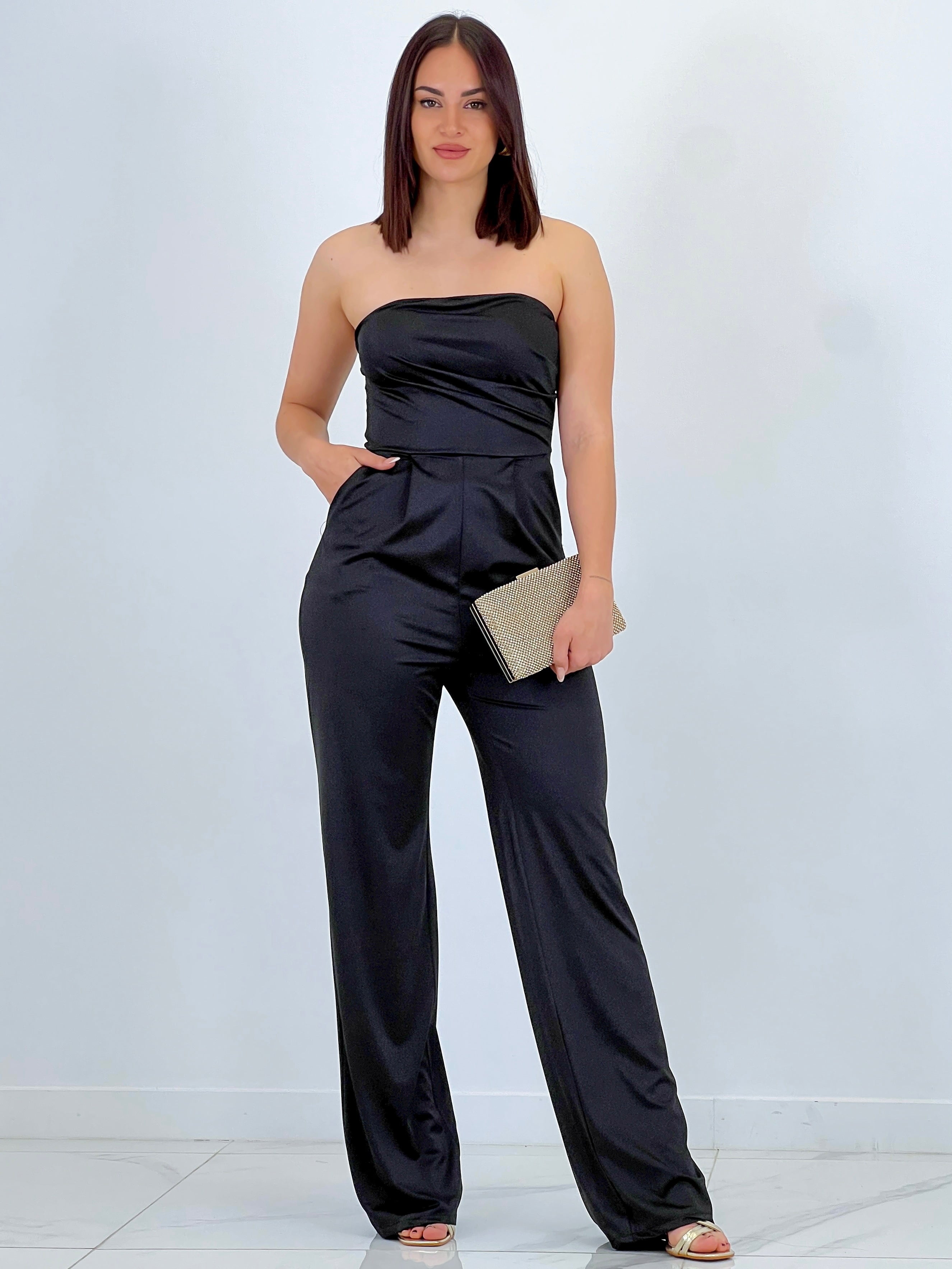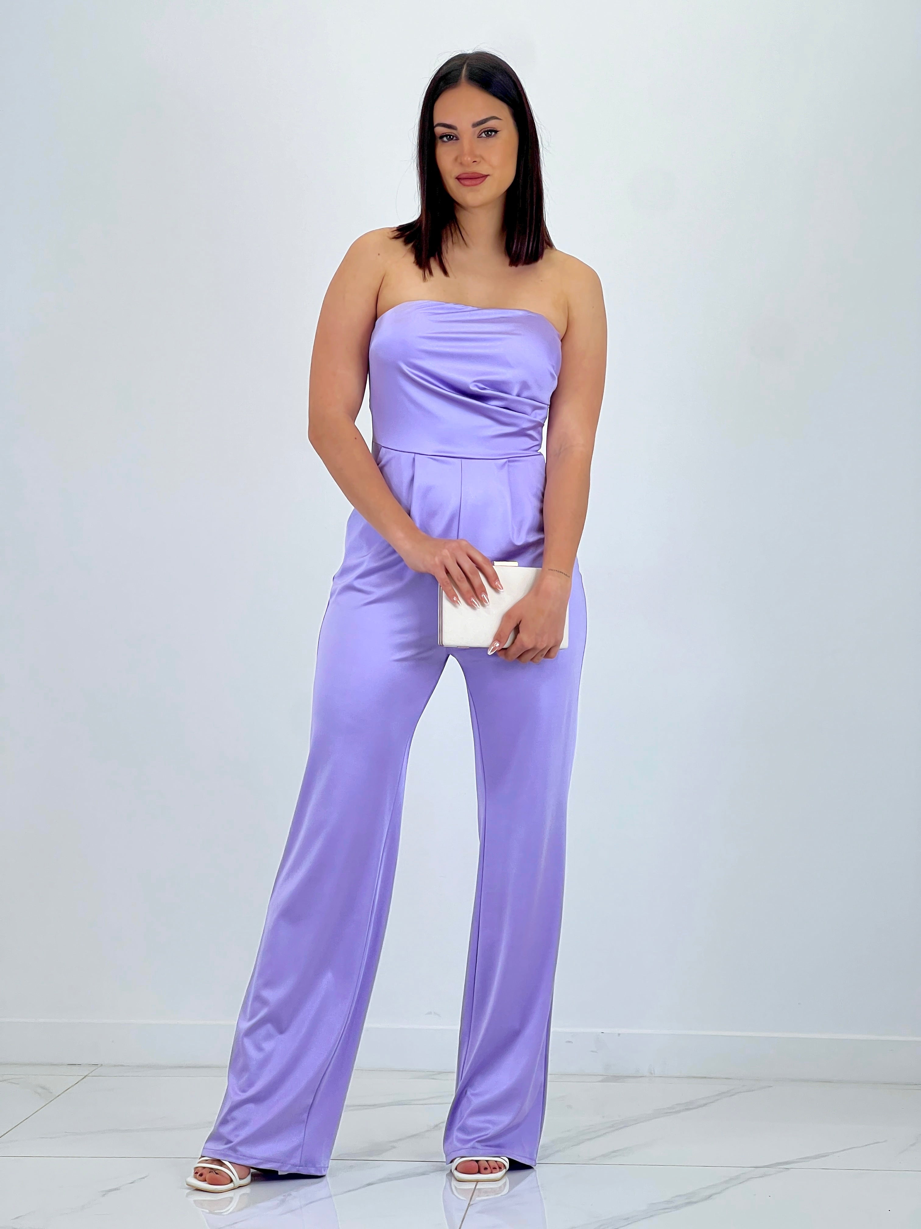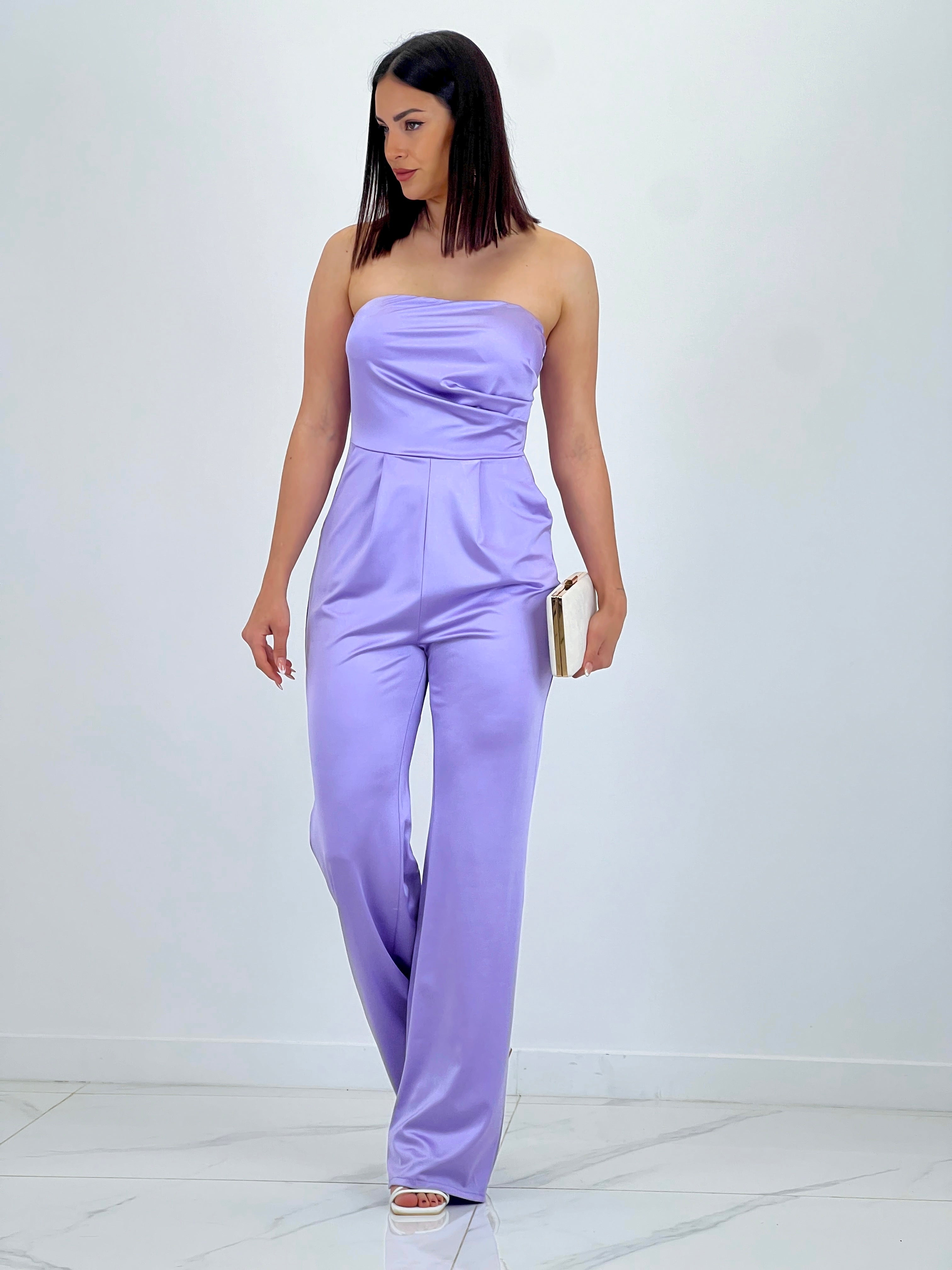 Este mono está hecho de un tejido satinado que crea un elegante efecto de brillo. El corte palabra de honor añade un toque de sofisticación y es perfecto para lucir en eventos especiales. Con este mono, estarás a la moda y te sentirás cómodo gracias a su tejido suave y sedoso.