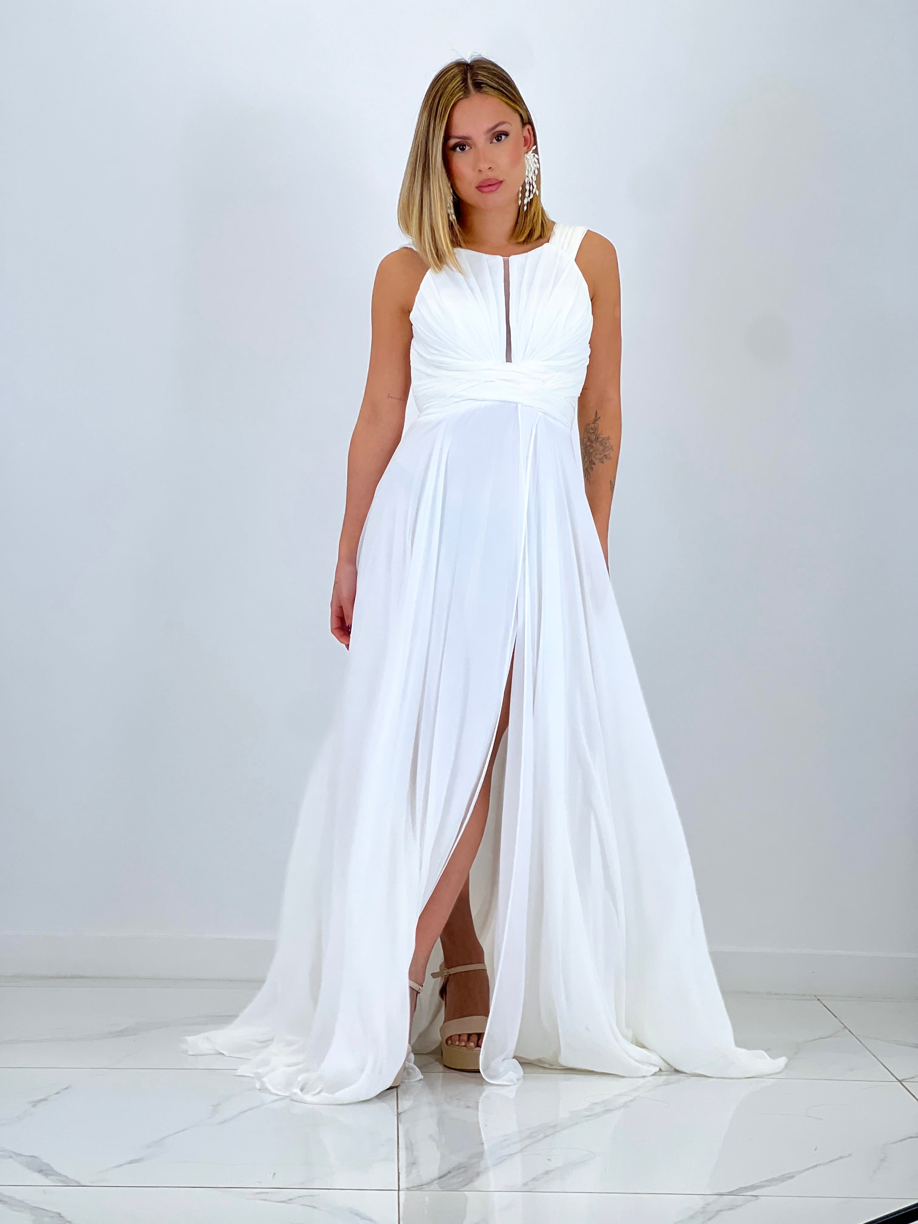 El vestido de ceremonia Luana es una pieza elegante y sofisticada que cuenta con un corte delantero que realza la figura femenina. Con un cuello redondo y tirantes anchos, este vestido también tiene un escote en la espalda con pequeñas aberturas laterales, proporcionando un toque sexy y moderno. Cómodo y fácil de poner, gracias a su cremallera trasera.