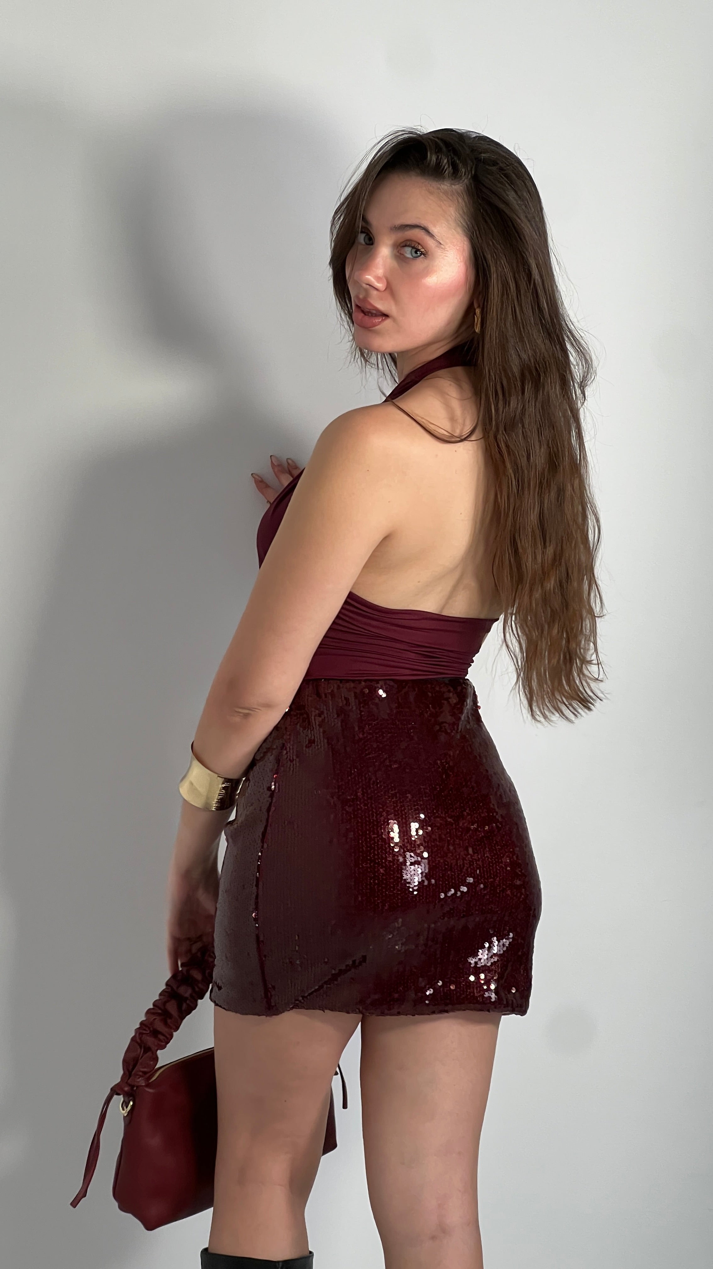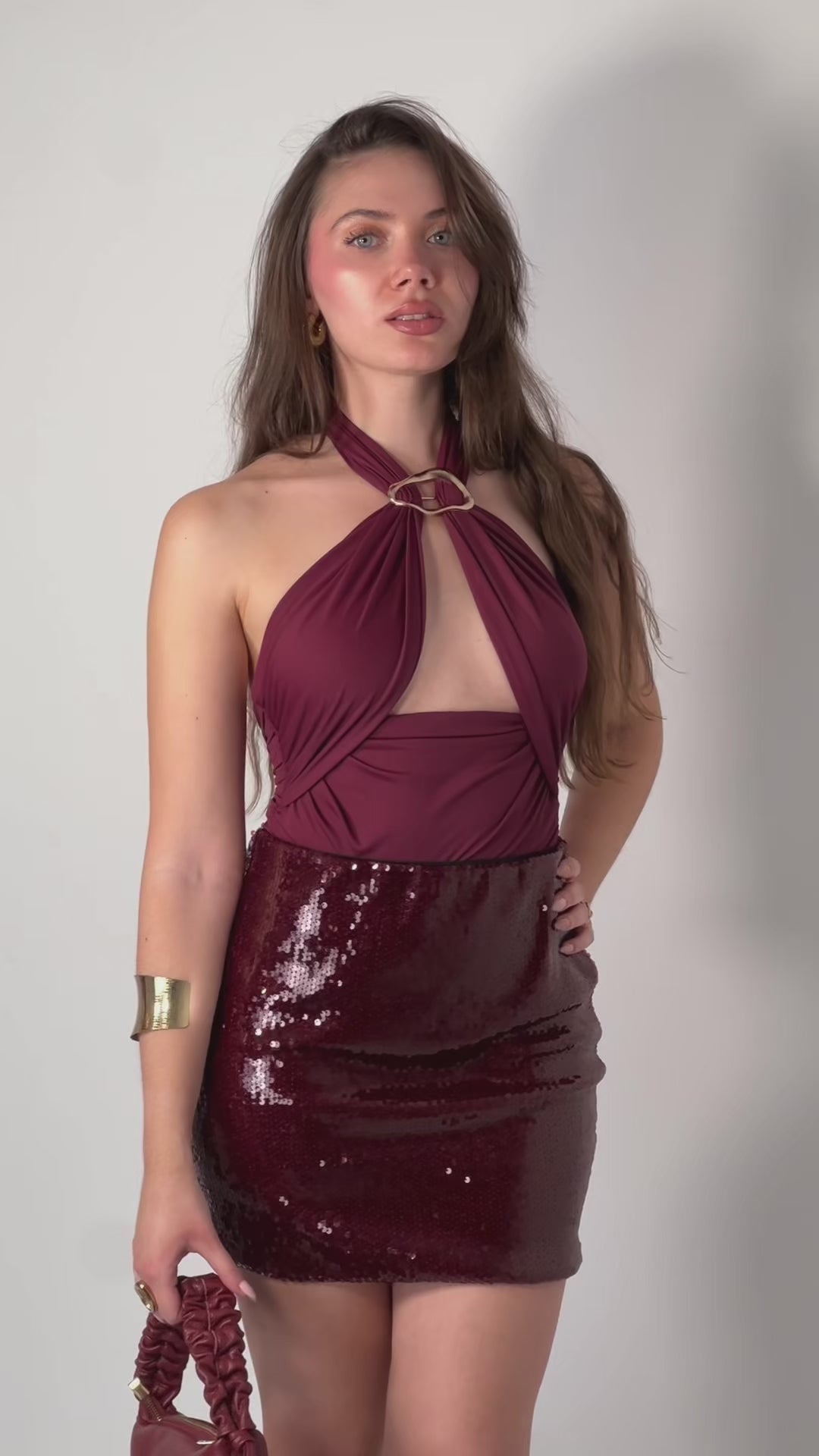Este body ajustado se sujeta al cuello, dejando los hombros descubiertos para un estilo sofisticado y atrevido. El detalle dorado en el centro aporta un toque de elegancia que realza el diseño, convirtiéndolo en una pieza versátil para looks modernos y refinados.
