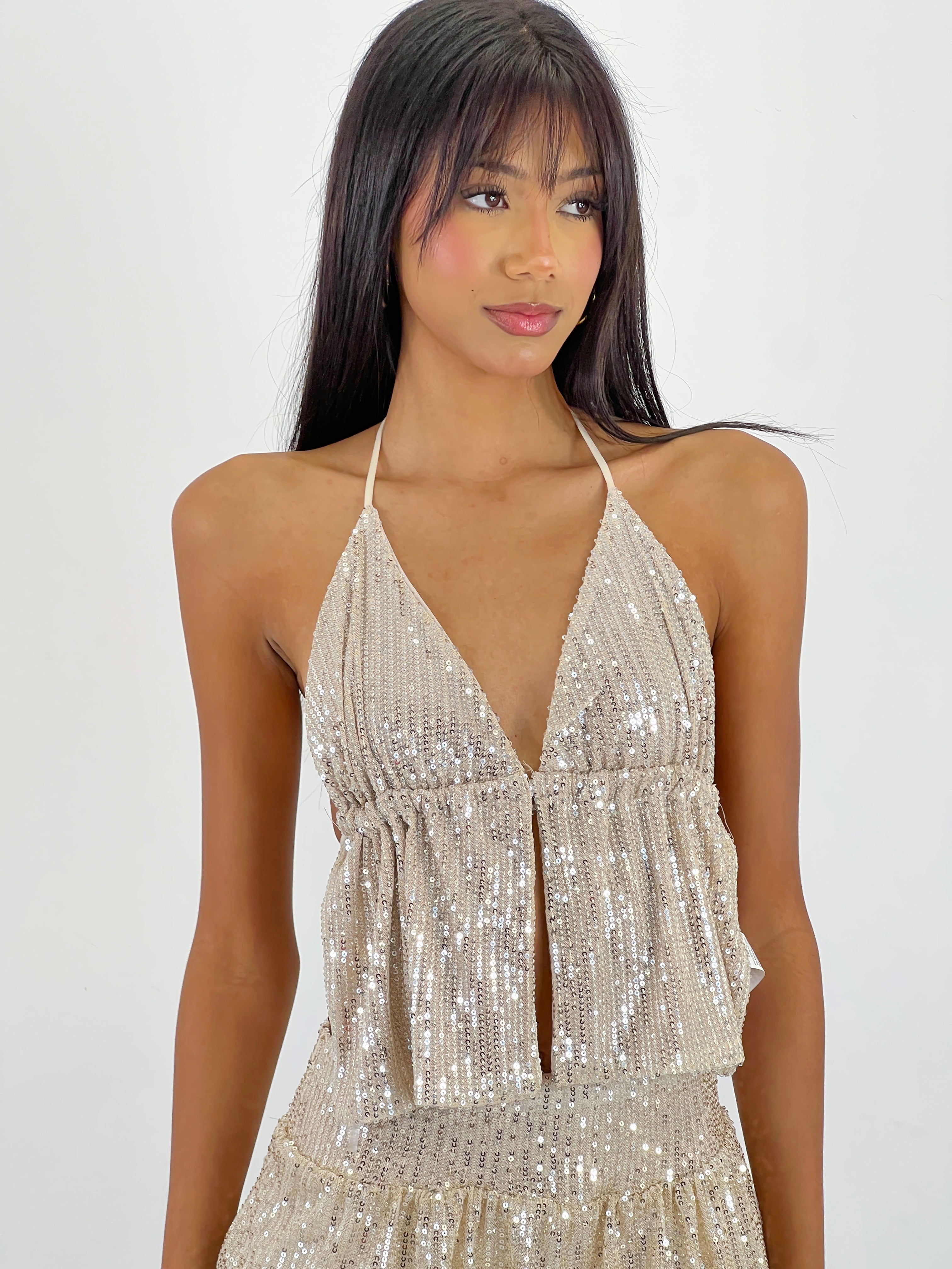 Este top escotado con lentejuelas brilla por su diseño de espalda descubierta y escote abierto, que realzan la elegancia y feminidad. Se ata por la espalda, permitiendo un ajuste personalizado que garantiza comodidad y un acabado sofisticado. Ideal para eventos especiales donde destacar con estilo y distinción es esencial.