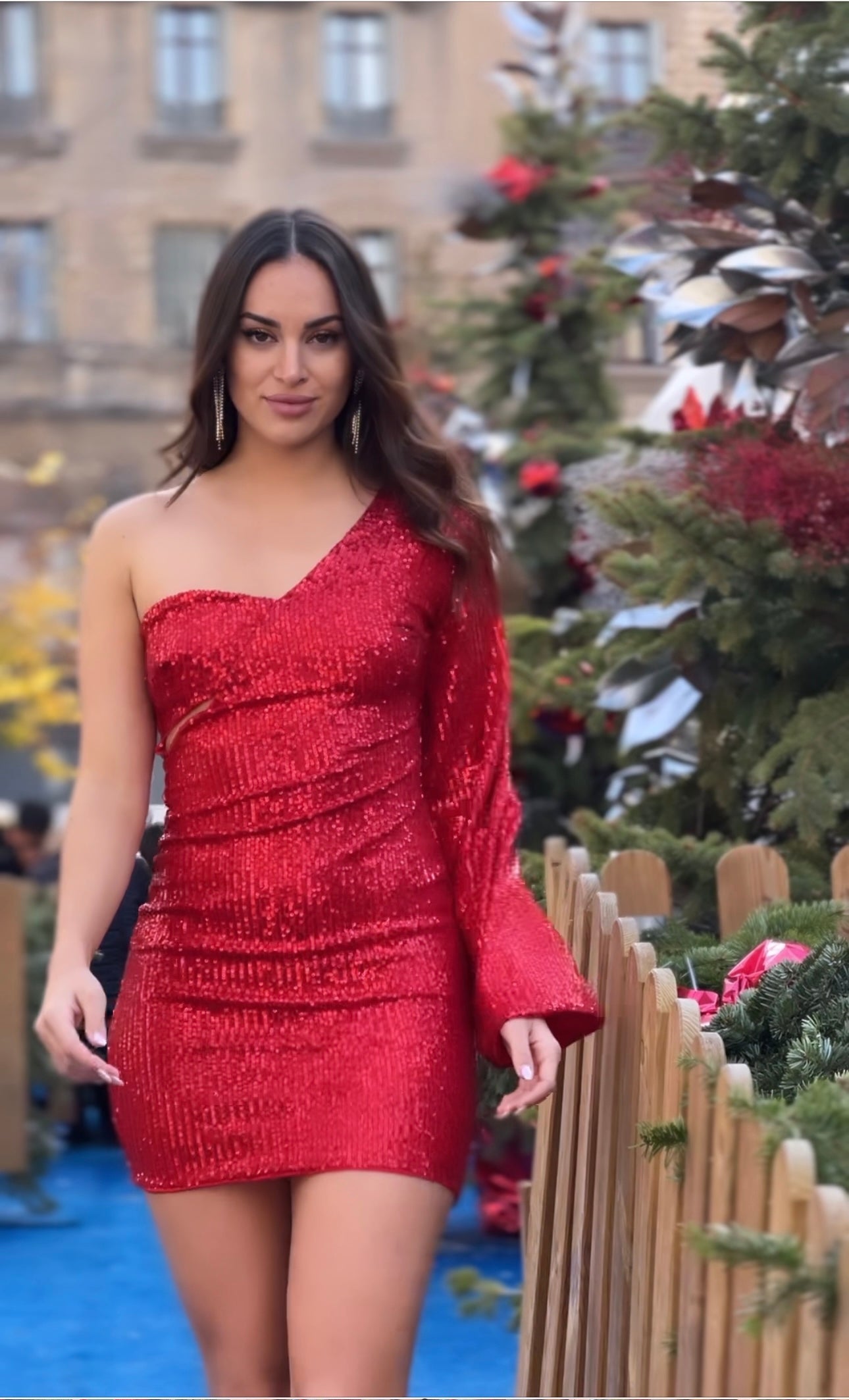 Vestido de lentejuelas asimétrico mini, con un lateral cut out y manga con caída acampanada.