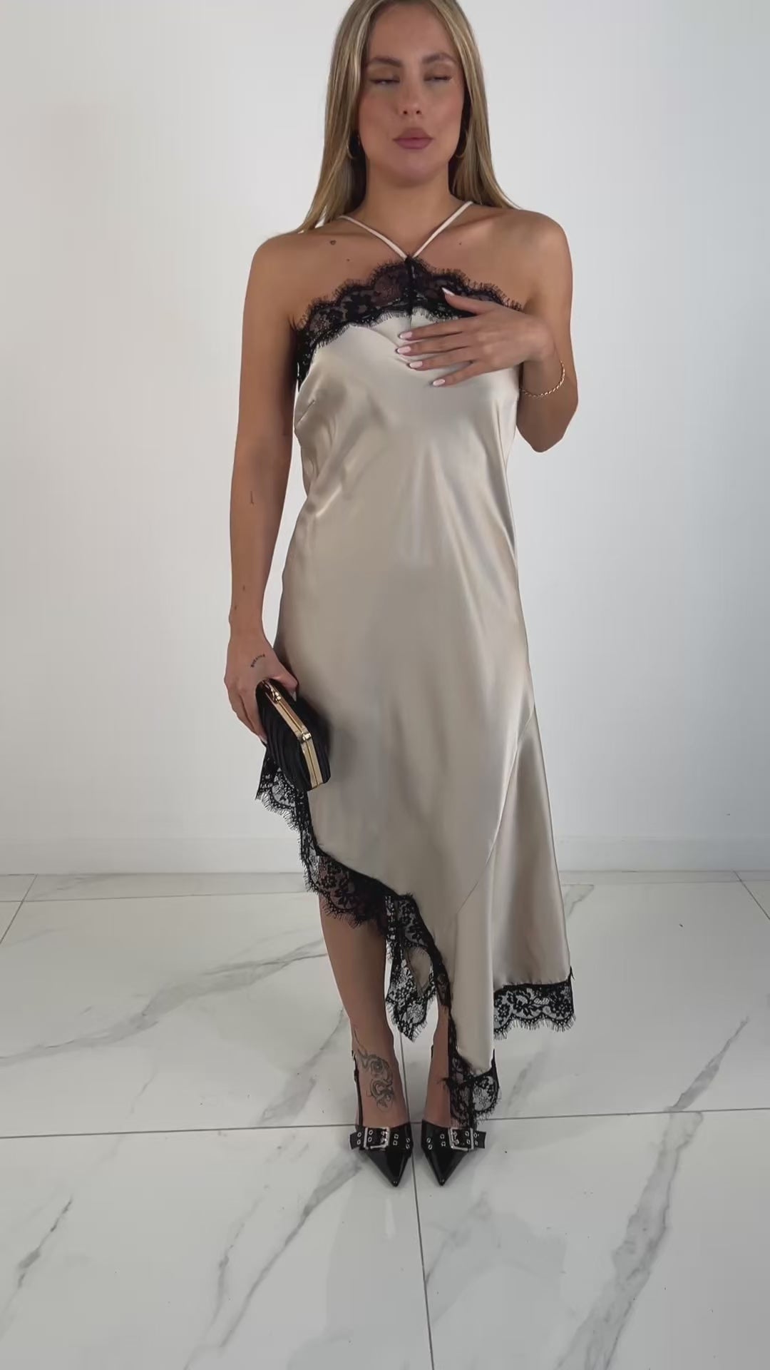 Este vestido satinado estilo lencero combina elegancia y delicadeza, con un tejido suave que aporta un acabado brillante. Cuenta con tirantes finos y un cuello halter que realzan la figura, mientras que los bordados de encaje añaden un detalle sofisticado y femenino. Su diseño asimétrico midi ofrece modernidad y movimiento en cada paso. Disponible en tres tonos diferentes, es una pieza versátil para ocasiones especiales que destaca por su estilo y calidad.