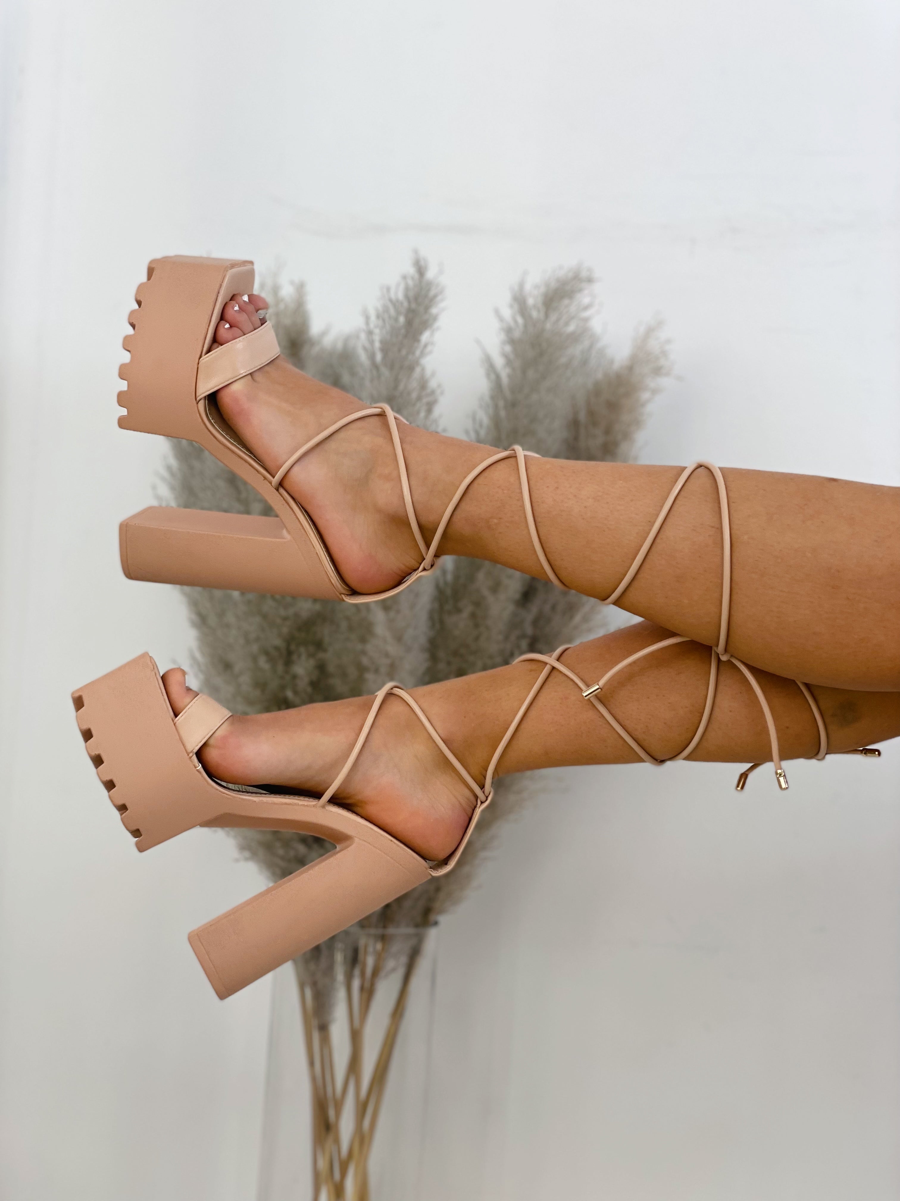 Sandalia de tacón, con plataforma. Tira ancha delantera. Cierre mediante cordones envolventes al tobillo.