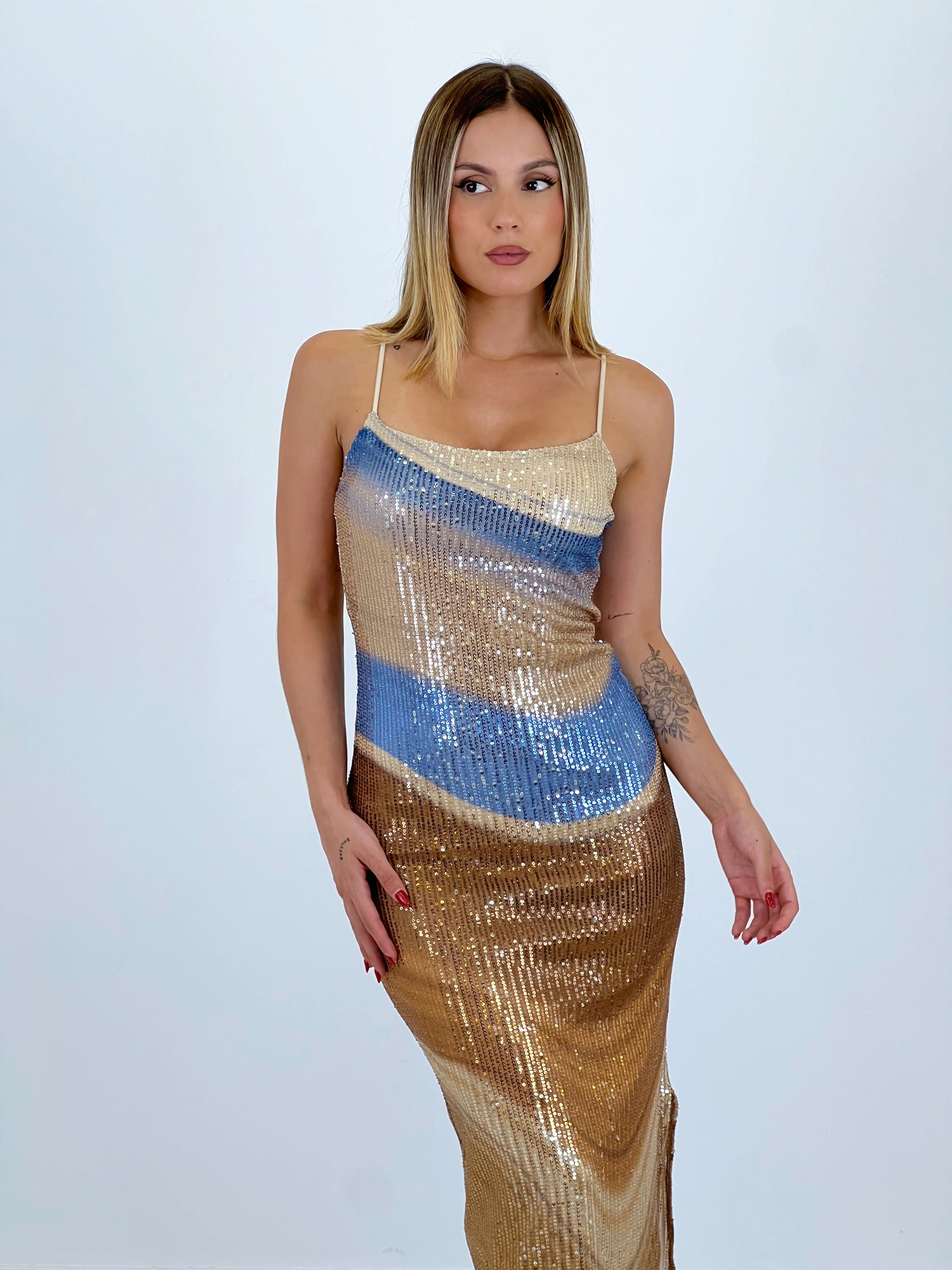 Este vestido midi de tirantes es perfecto para una noche de fiesta. Está hecho de lentejuelas brillantes y tiene un estampado de aguas, lo que lo hace elegante y llamativo. Luce un look deslumbrante con este vestido Libia.