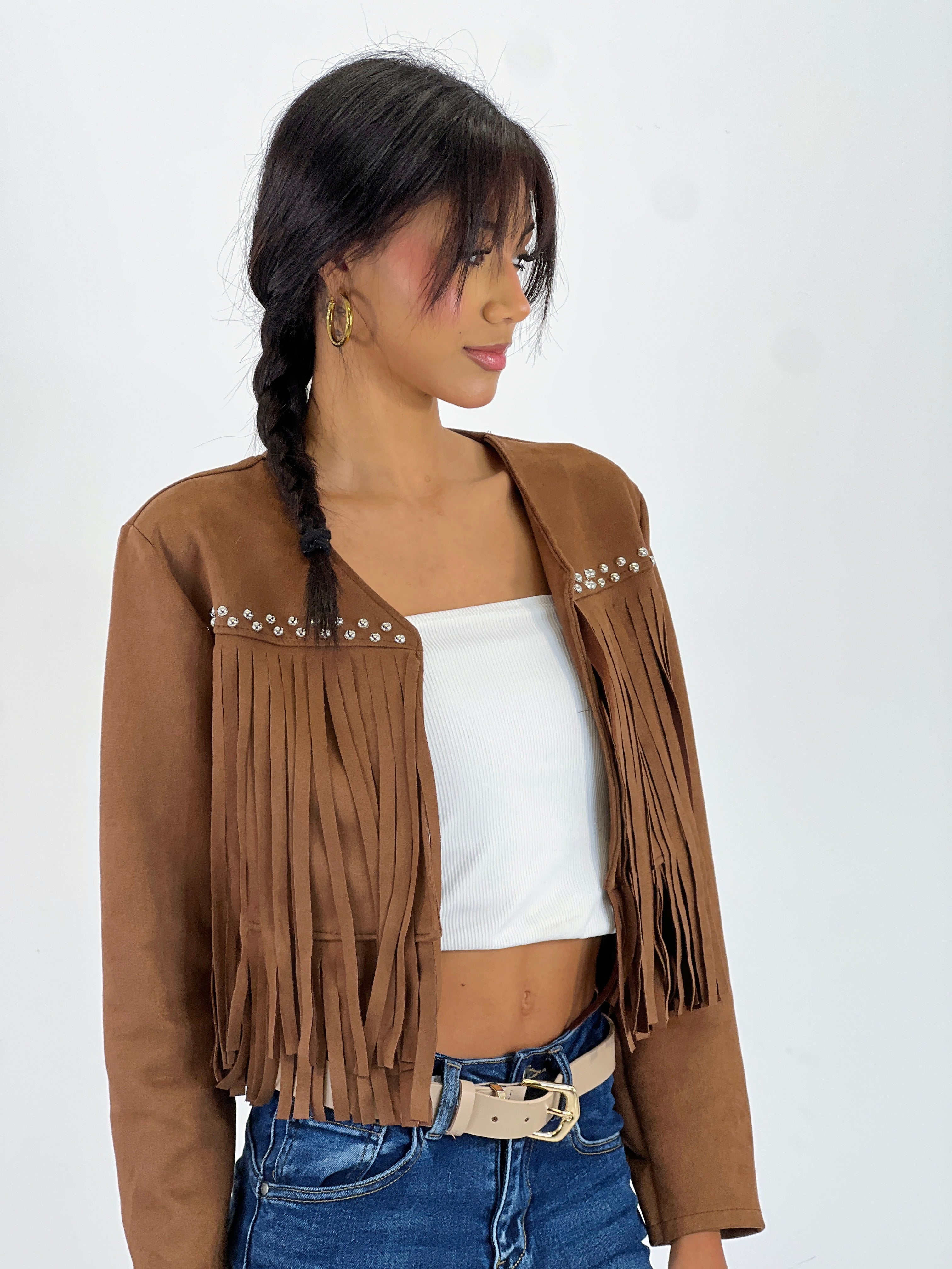 Esta chaqueta de ante combina flecos detallados con tachuelas metálicas que aportan un aire contemporáneo y audaz. Su confección en suave ante ofrece comodidad y durabilidad, mientras que los elementos decorativos le confieren un estilo distintivo y elegante. Ideal para quienes desean destacar con una prenda que fusiona tradición y modernidad en un diseño versátil para múltiples ocasiones.