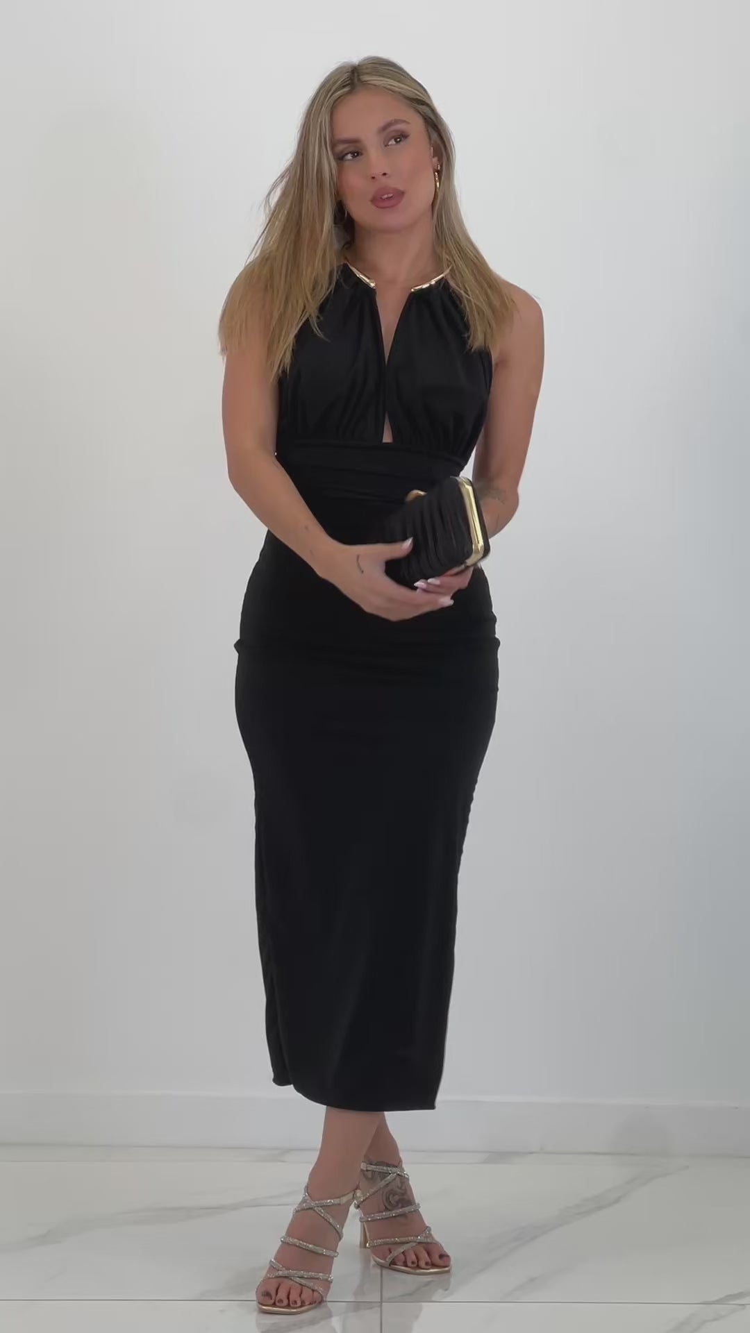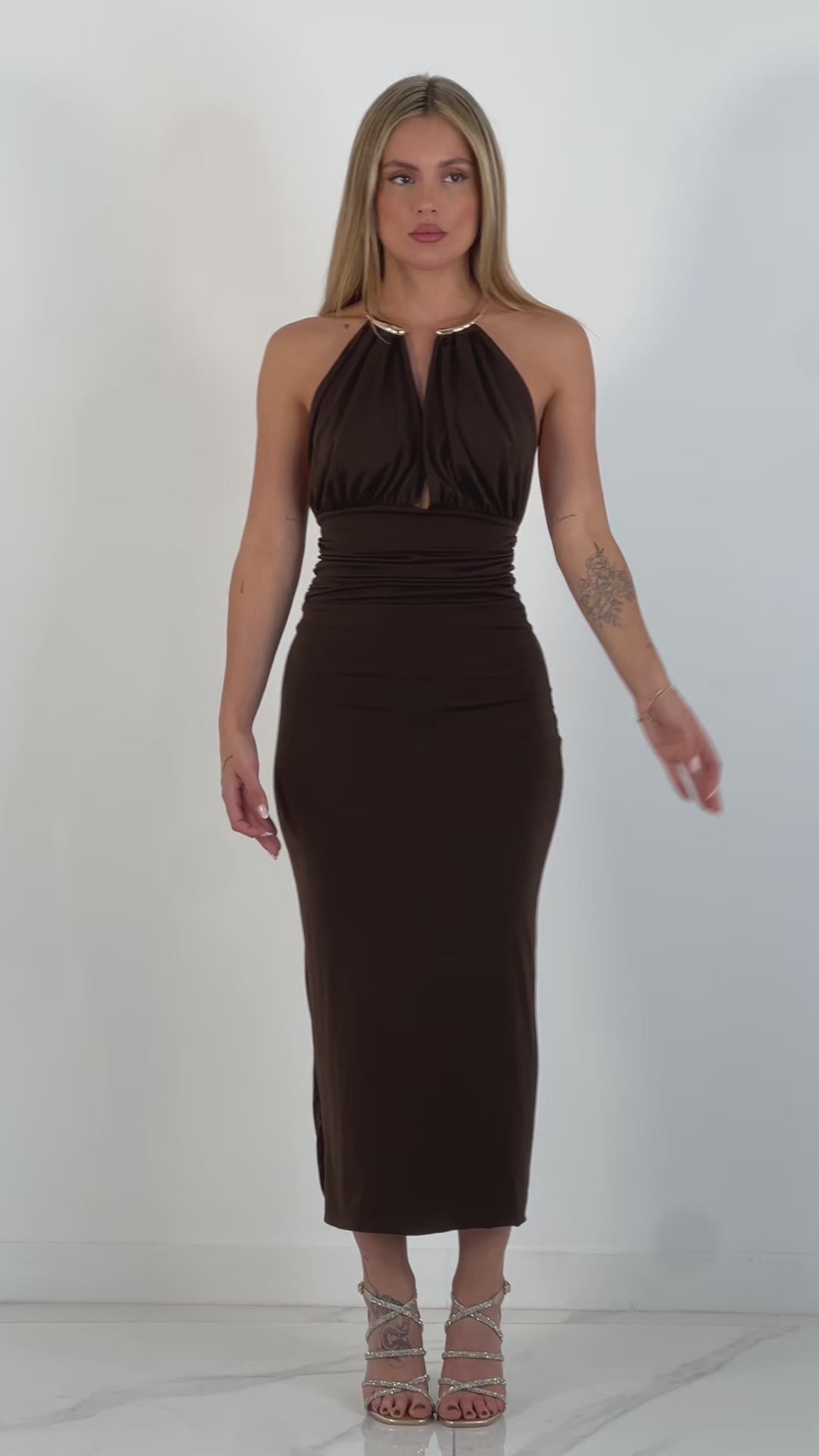 Vestido halter midi que combina elegancia clásica con detalles de joyería que elevan su sofisticación. El cuello halter proporciona un ajuste seguro y favorecedor, mientras que la largo midi ofrece versatilidad para diferentes ocasiones. Los elementos de joyería integrados en el diseño crean un efecto de lujo sin necesidad de accesorios adicionales. Una prenda versátil que transita perfectamente de día a noche.