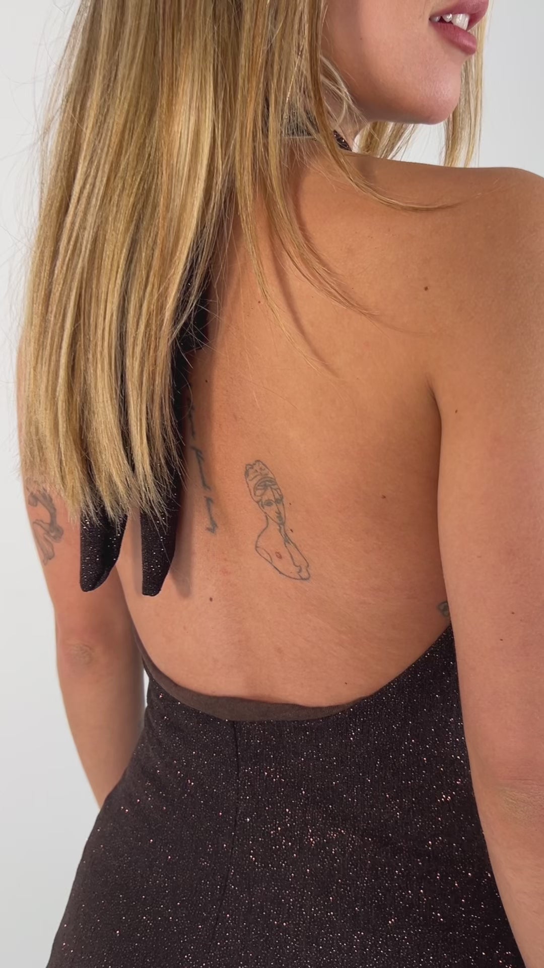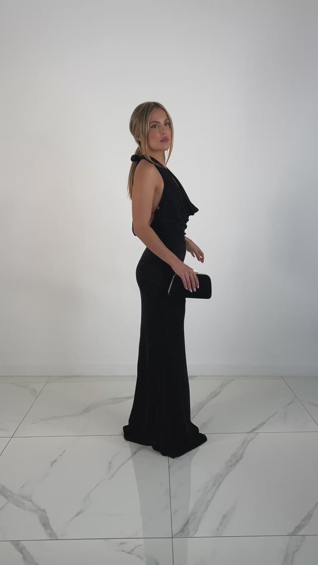 Vestido lurex que fusiona elegancia y versatilidad. Presenta un cuello cascada que cae con gracia, mientras que el cierre halter anudado permite ajustar el escote según tus preferencias. El tejido brillante realza cualquier ocasión especial.