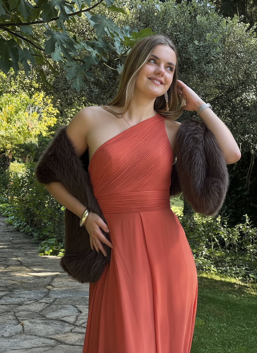 Este chal alargado recubierto de pelo sintético ofrece calidez y estilo, ideal para eventos de otoño e invierno. Su textura suave y elegante proporciona un complemento sofisticado que realza cualquier look, manteniendo confort durante las temporadas más frías.