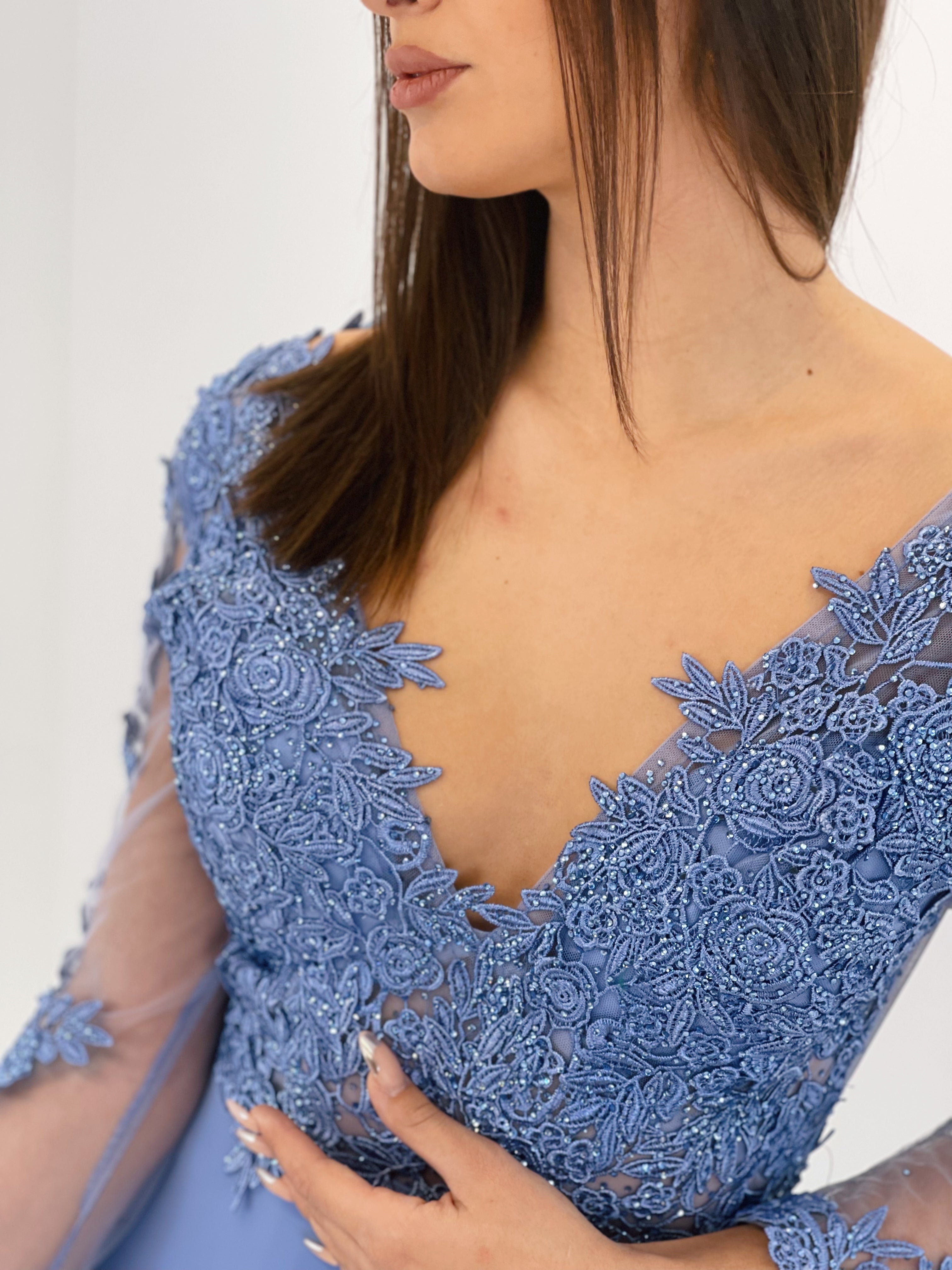 Este elegante vestido largo de fiesta Atlantis es perfecto para cualquier ocasión especial. Con su cuerpo de encaje y escote en V, te hará sentir sofisticada y elegante. La cremallera invisible en la espalda y la manga tres cuartos le dan un toque de comodidad y estilo.