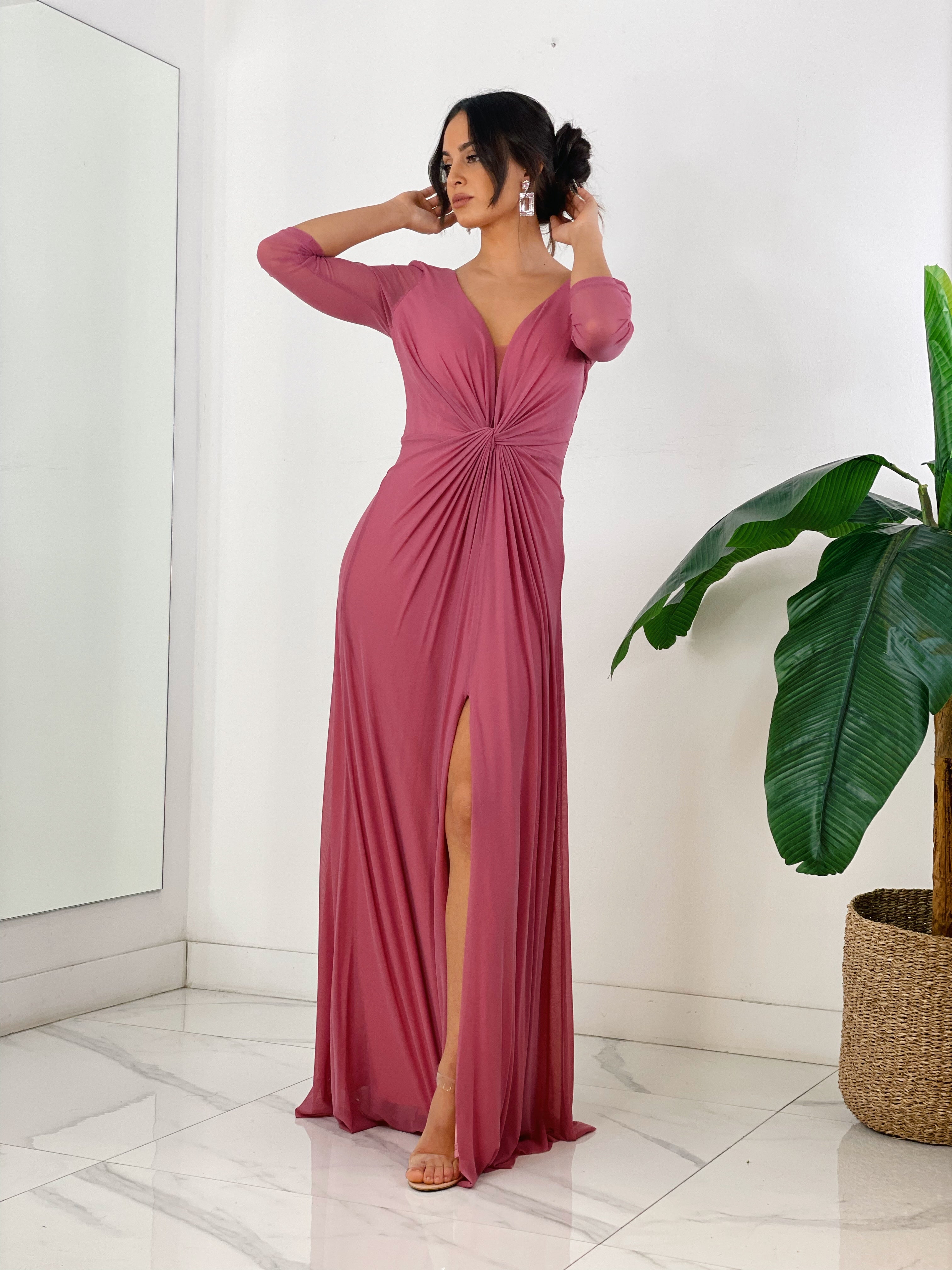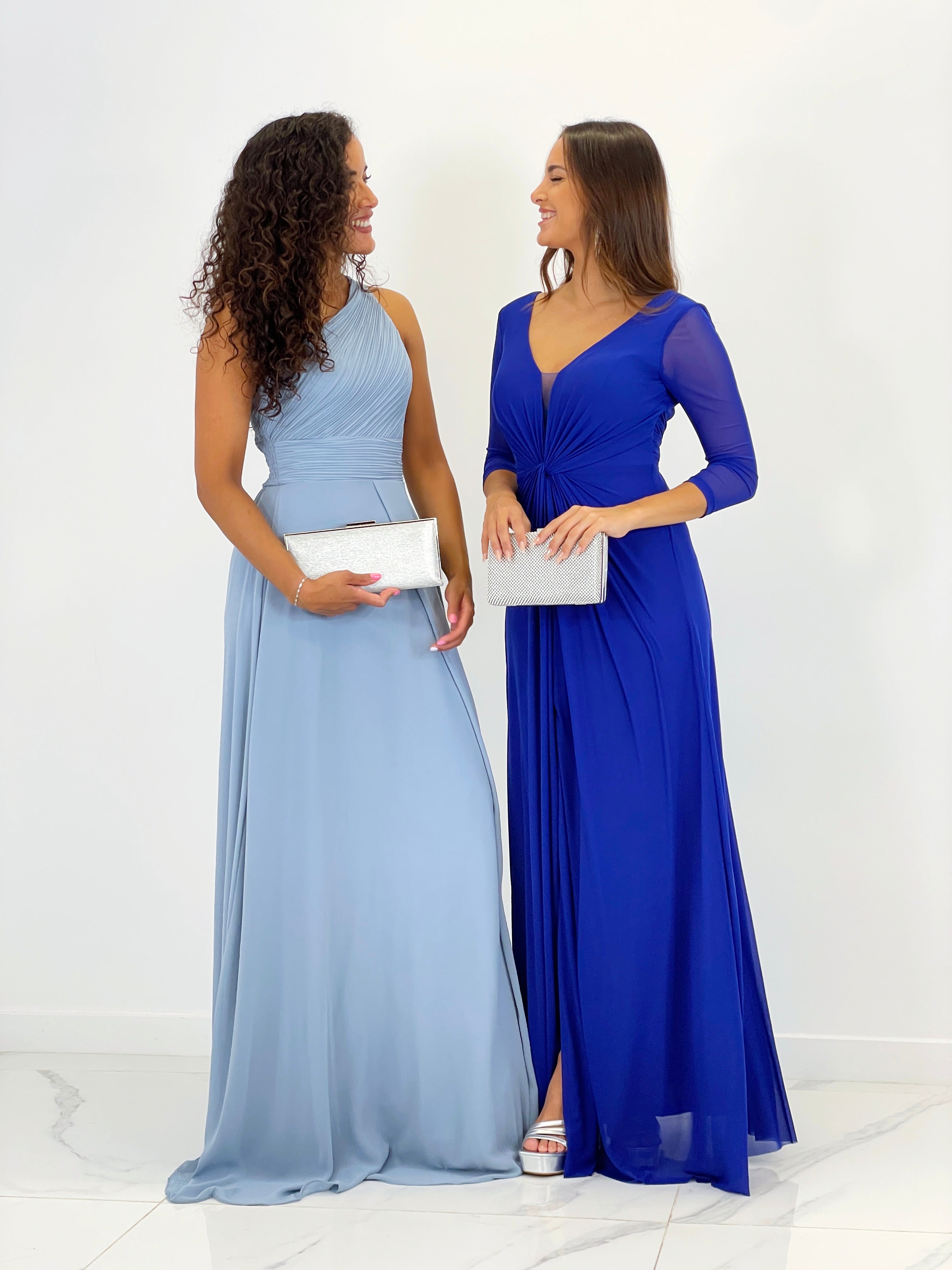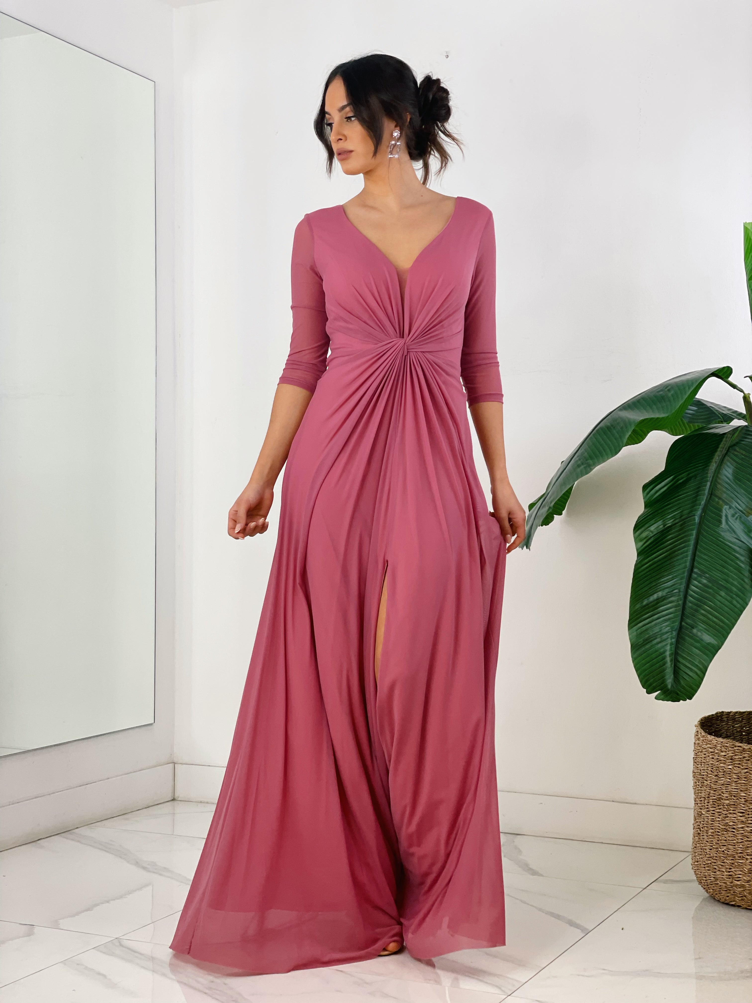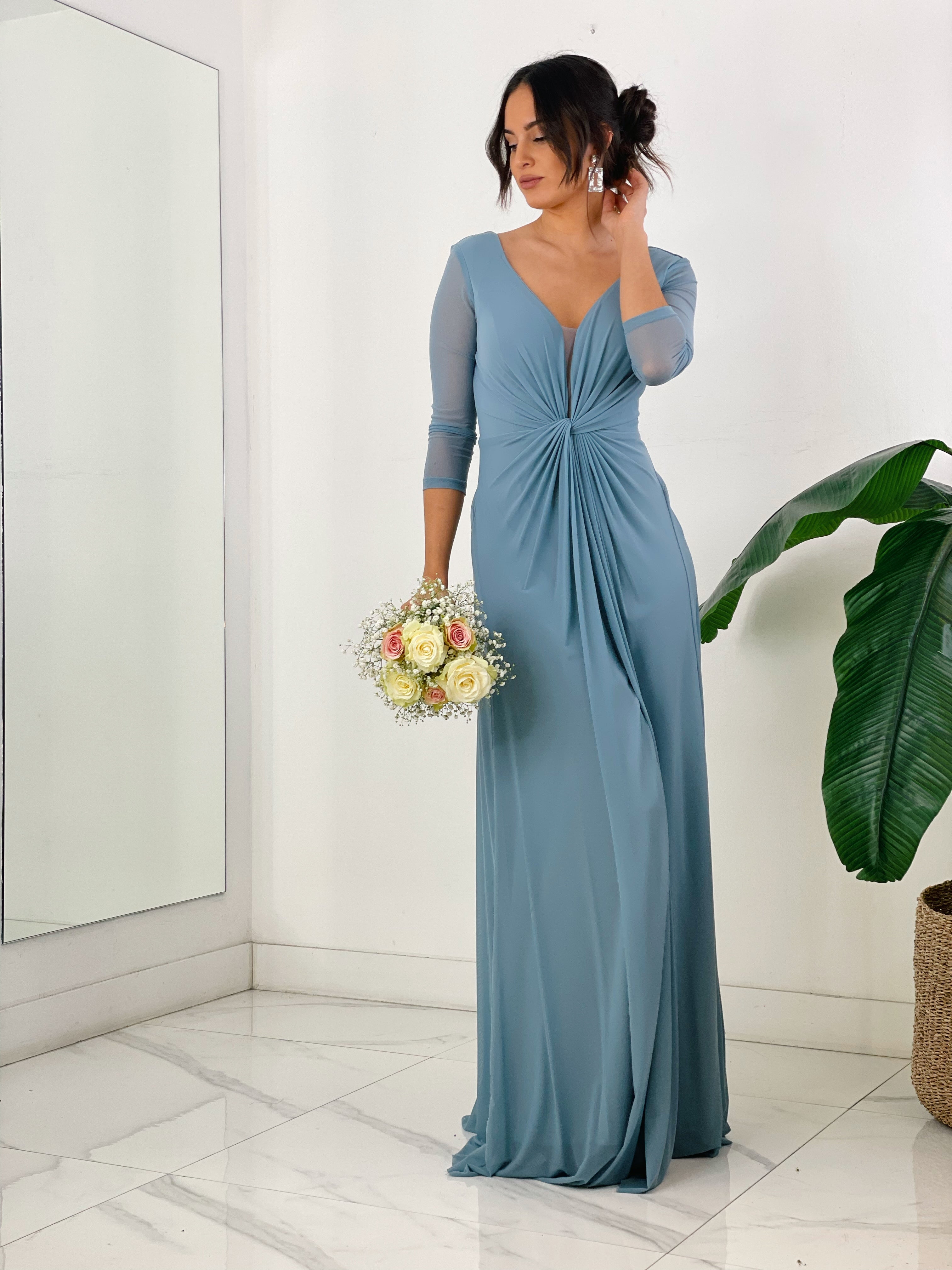El vestido Elsa de gasa es perfecto para lucir radiante en cualquier ceremonia. Con su escote pronunciado en pico y detalle de nudo en la cintura, brinda un toque elegante a tu figura. Las mangas tres cuartos semitransparentes y la obertura en la parte baja añaden un toque único y sofisticado. Complementado con una espalda en pico acabada en fruncido y cierre trasero de cremallera.