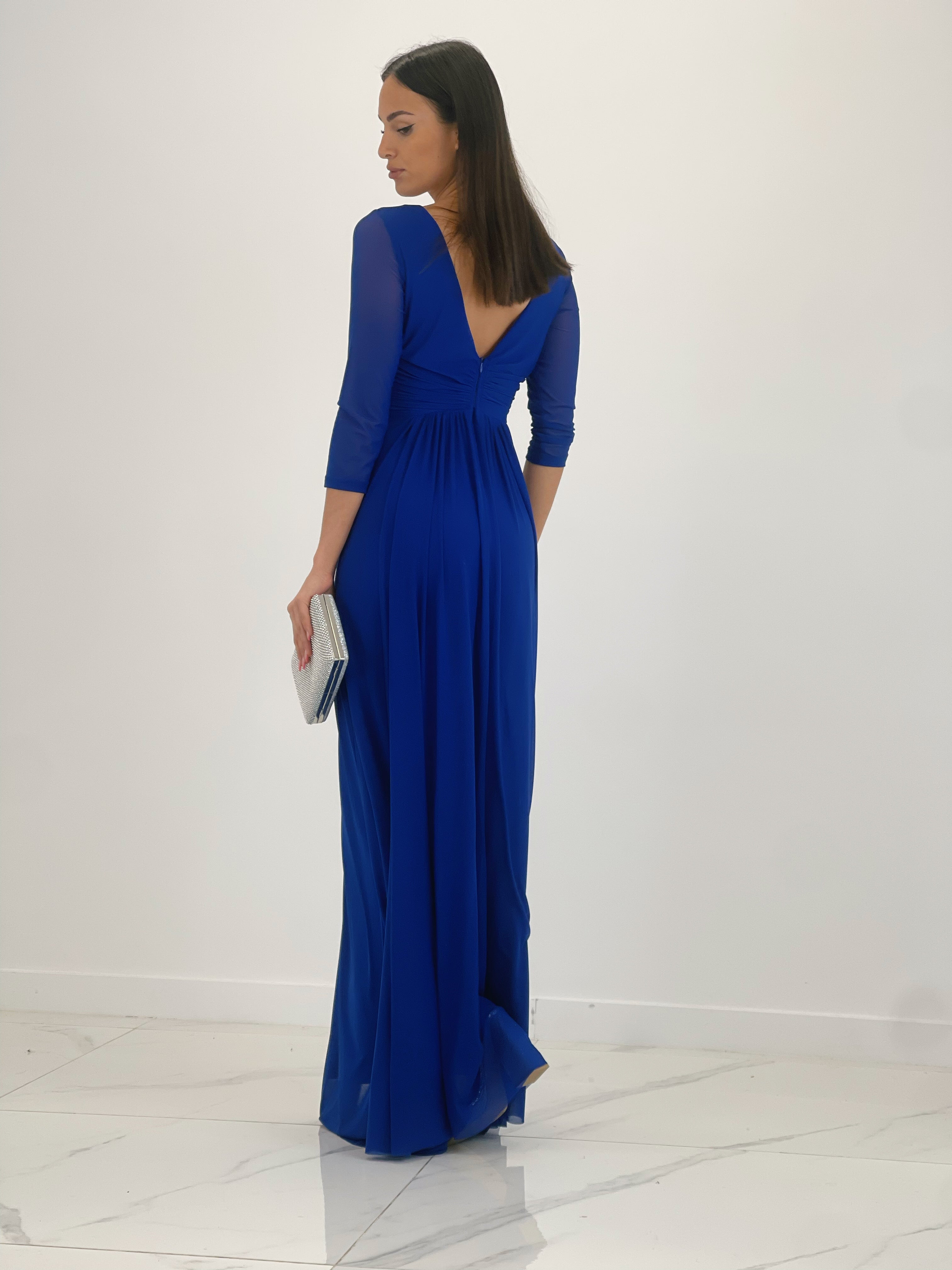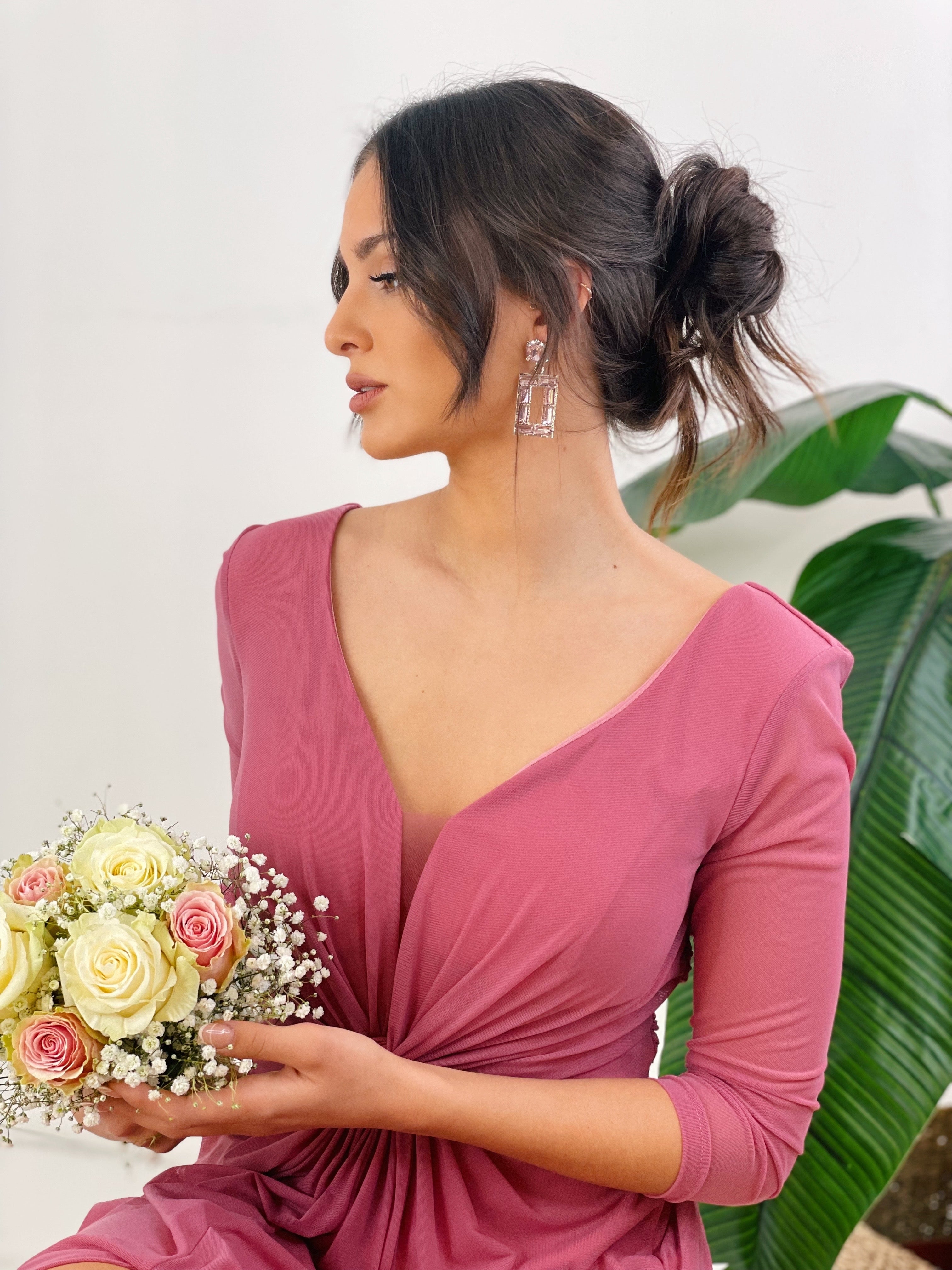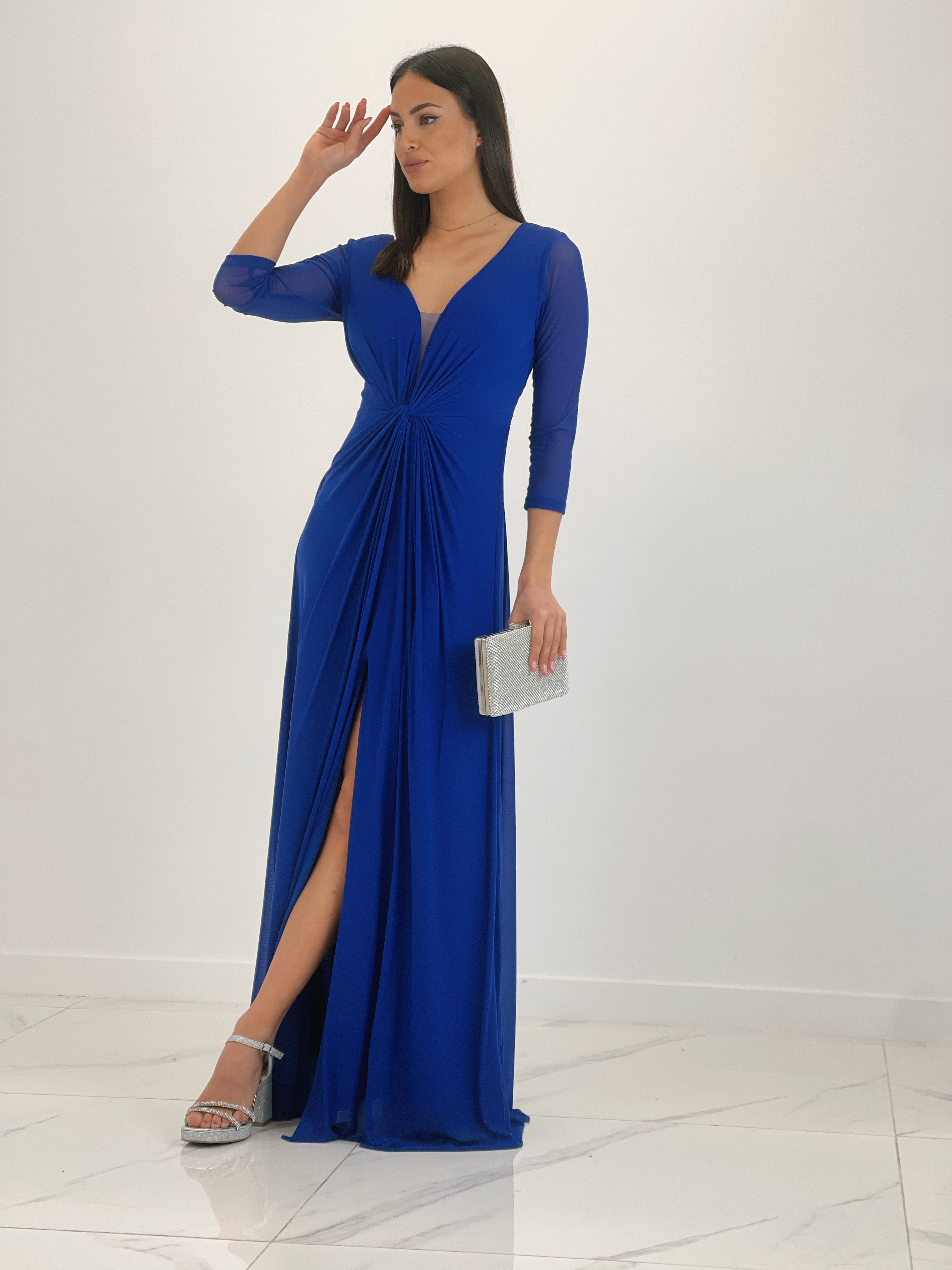 El vestido Elsa de gasa es perfecto para lucir radiante en cualquier ceremonia. Con su escote pronunciado en pico y detalle de nudo en la cintura, brinda un toque elegante a tu figura. Las mangas tres cuartos semitransparentes y la obertura en la parte baja añaden un toque único y sofisticado. Complementado con una espalda en pico acabada en fruncido y cierre trasero de cremallera.