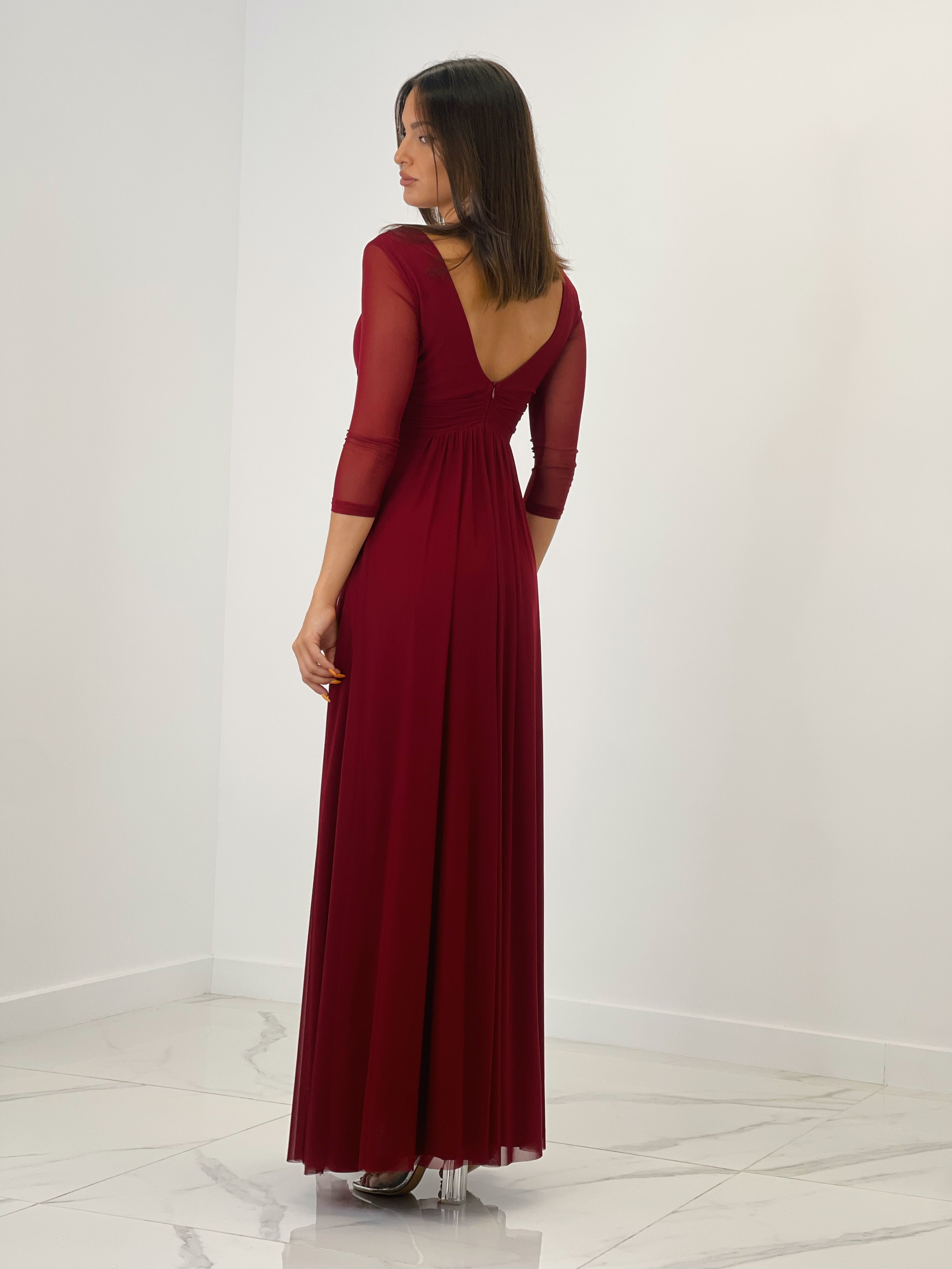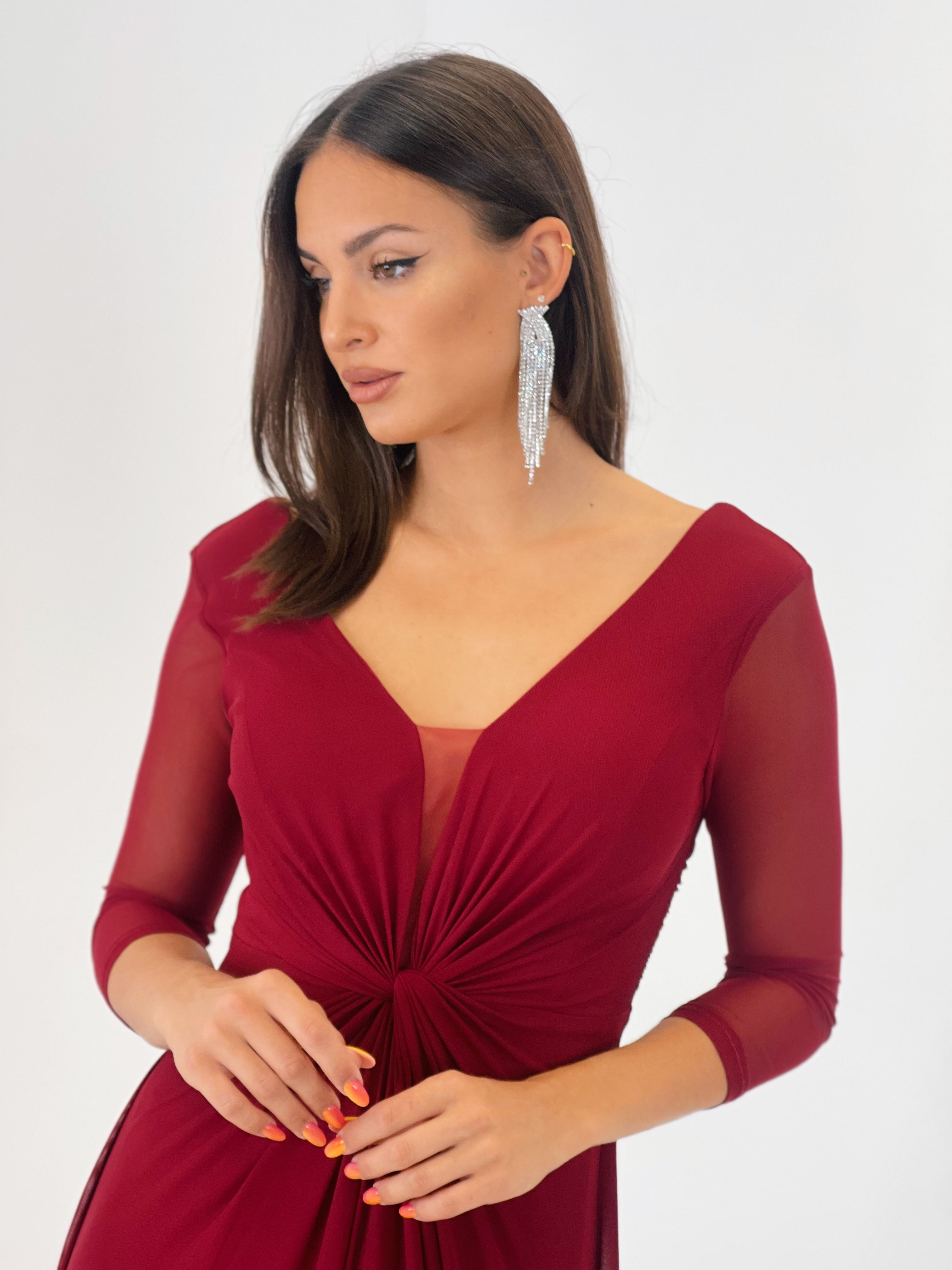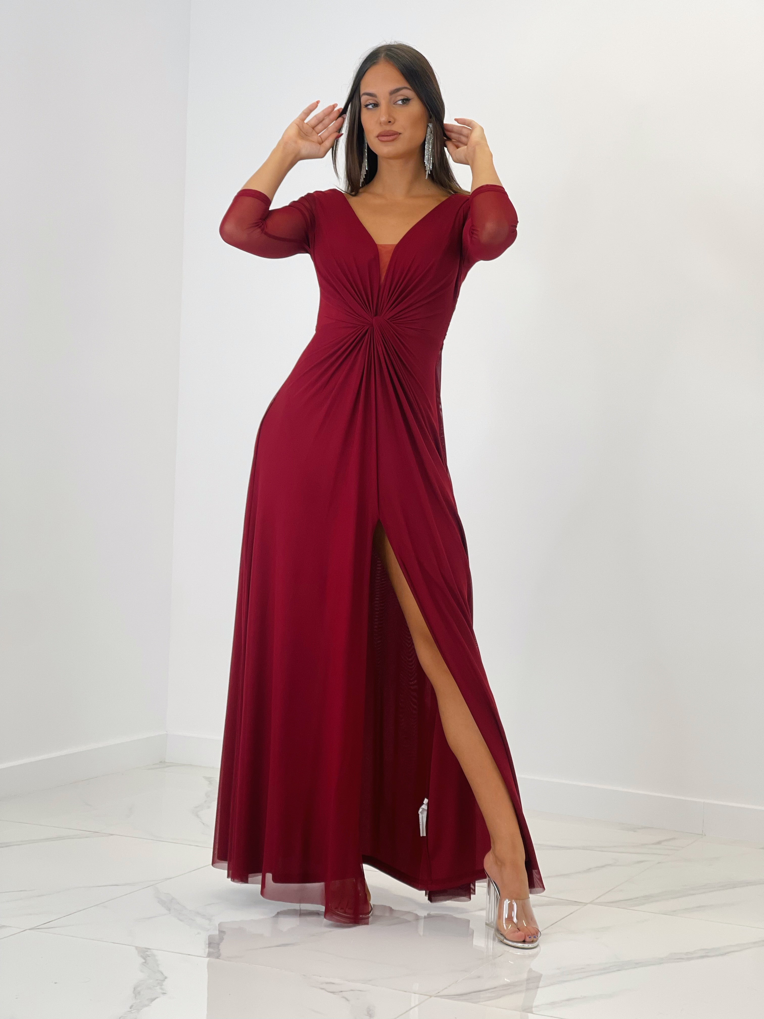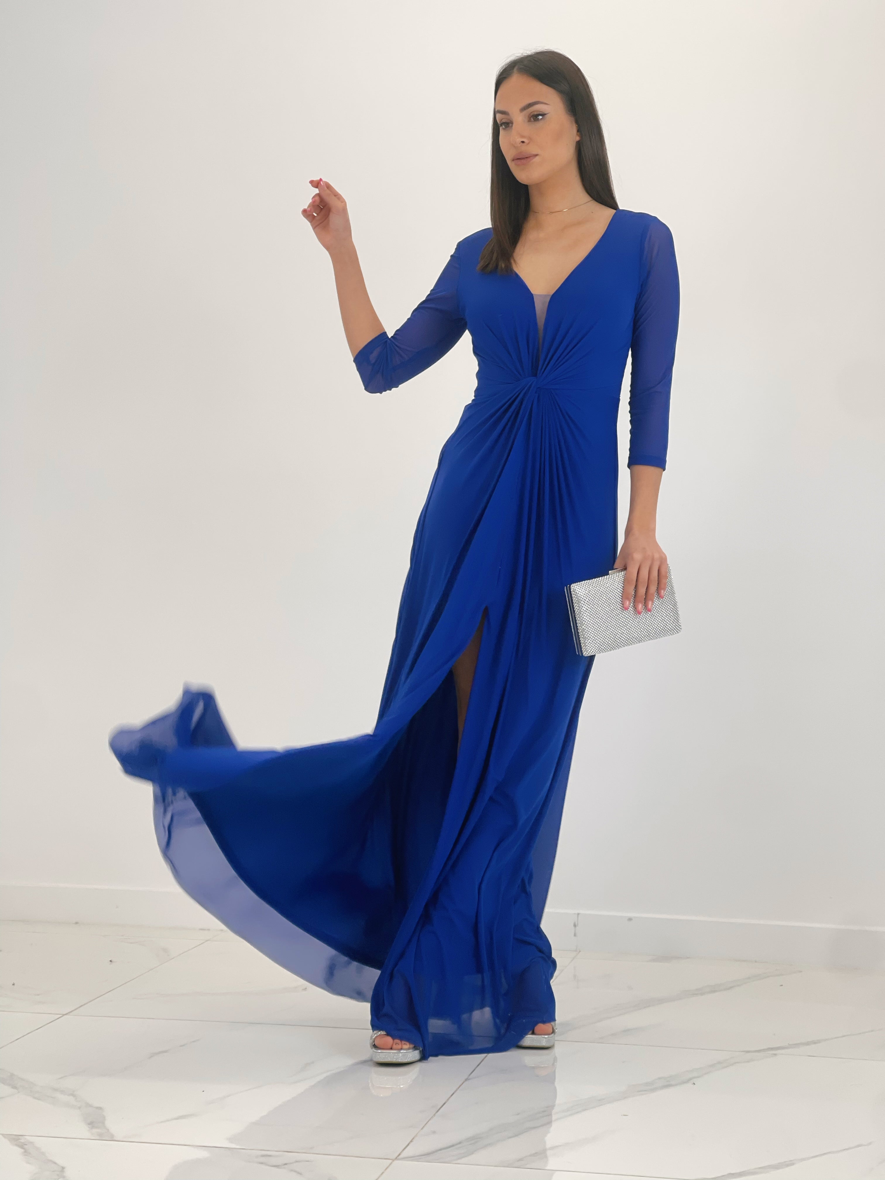 El vestido Elsa de gasa es perfecto para lucir radiante en cualquier ceremonia. Con su escote pronunciado en pico y detalle de nudo en la cintura, brinda un toque elegante a tu figura. Las mangas tres cuartos semitransparentes y la obertura en la parte baja añaden un toque único y sofisticado. Complementado con una espalda en pico acabada en fruncido y cierre trasero de cremallera.