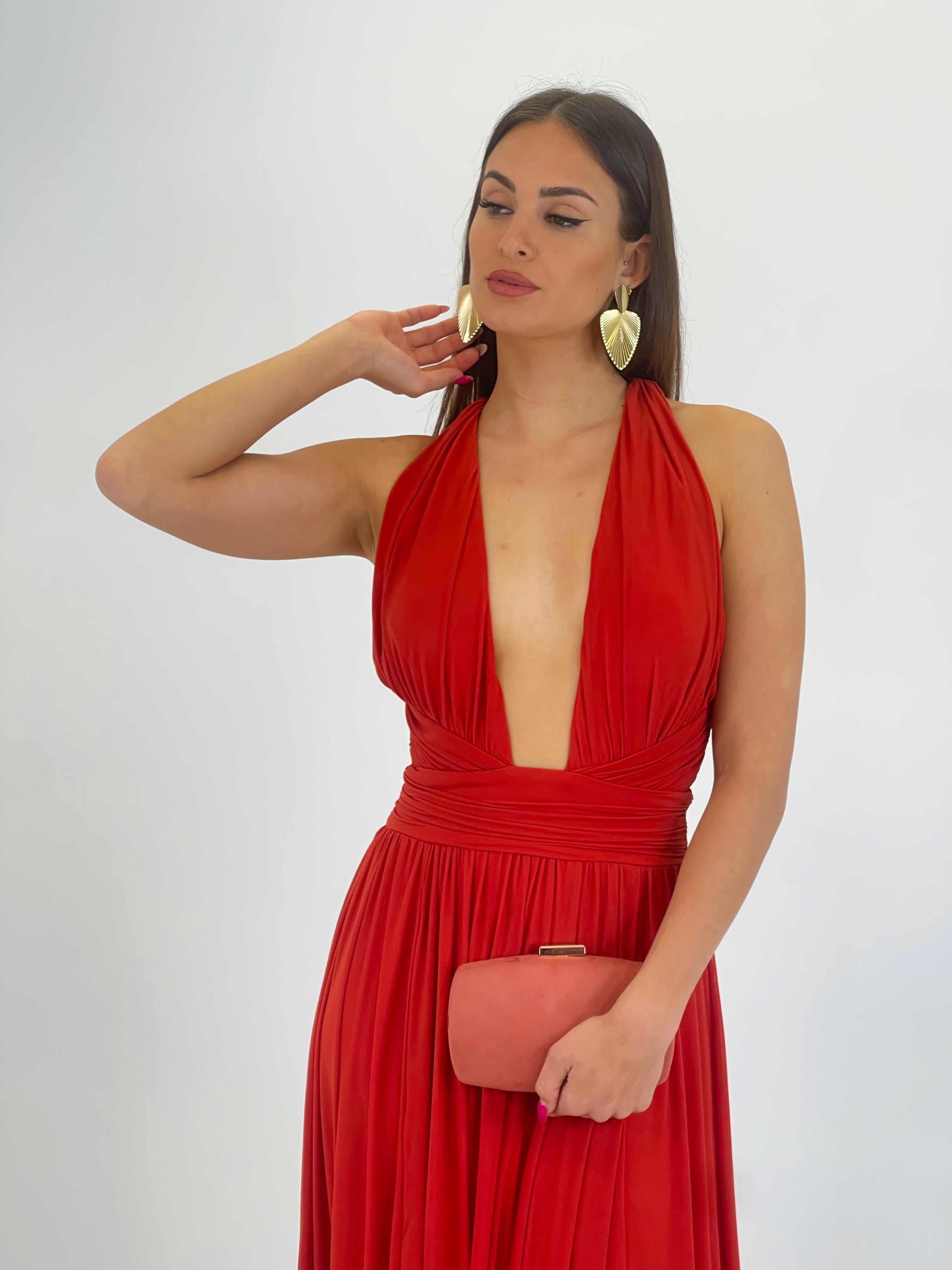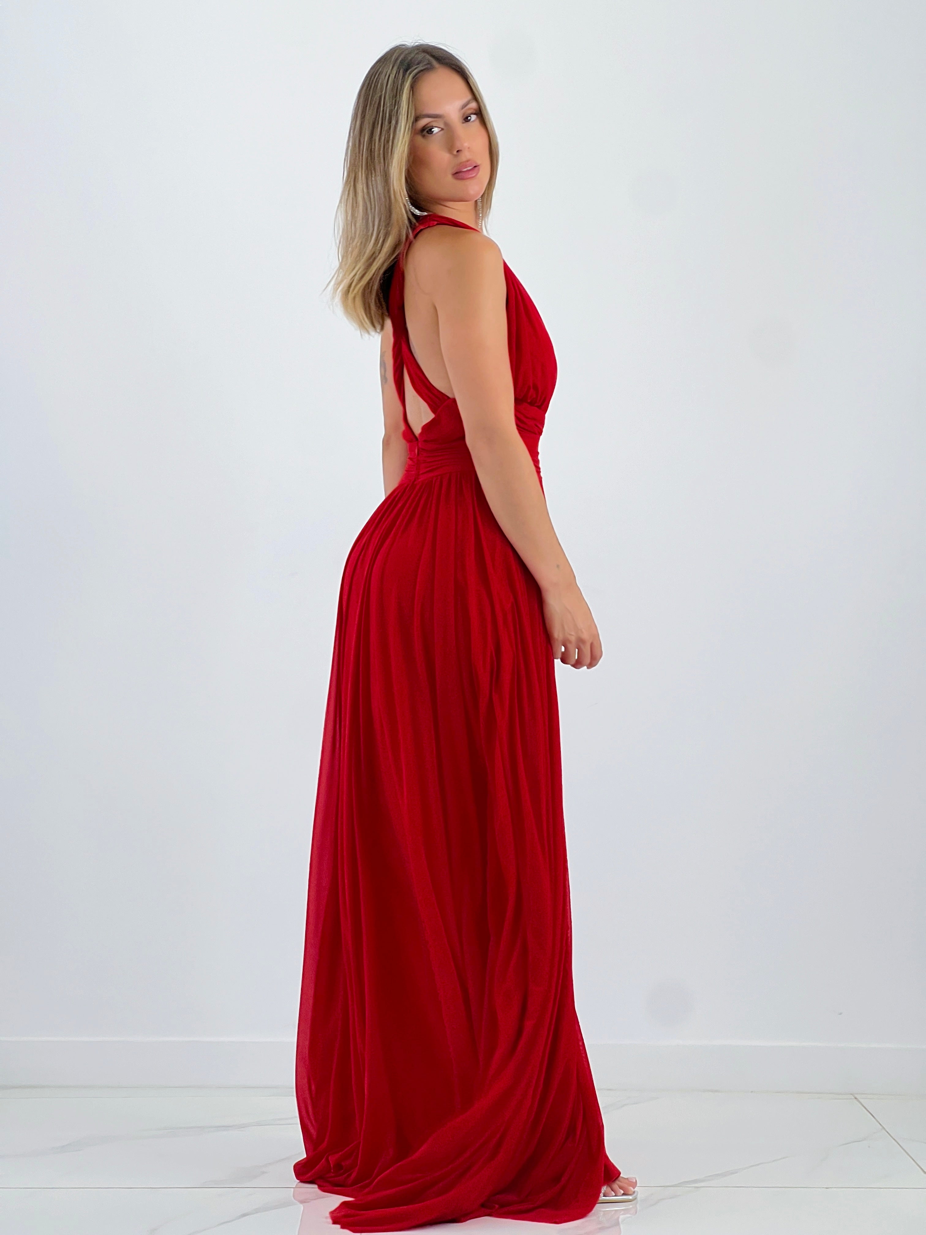 Este vestido largo es perfecto para eventos especiales. Sus tirantes versátiles permiten usarlo de tres formas distintas y su apertura en la pierna le da un toque de elegancia. Ideal para lucir en una ceremonia inolvidable.