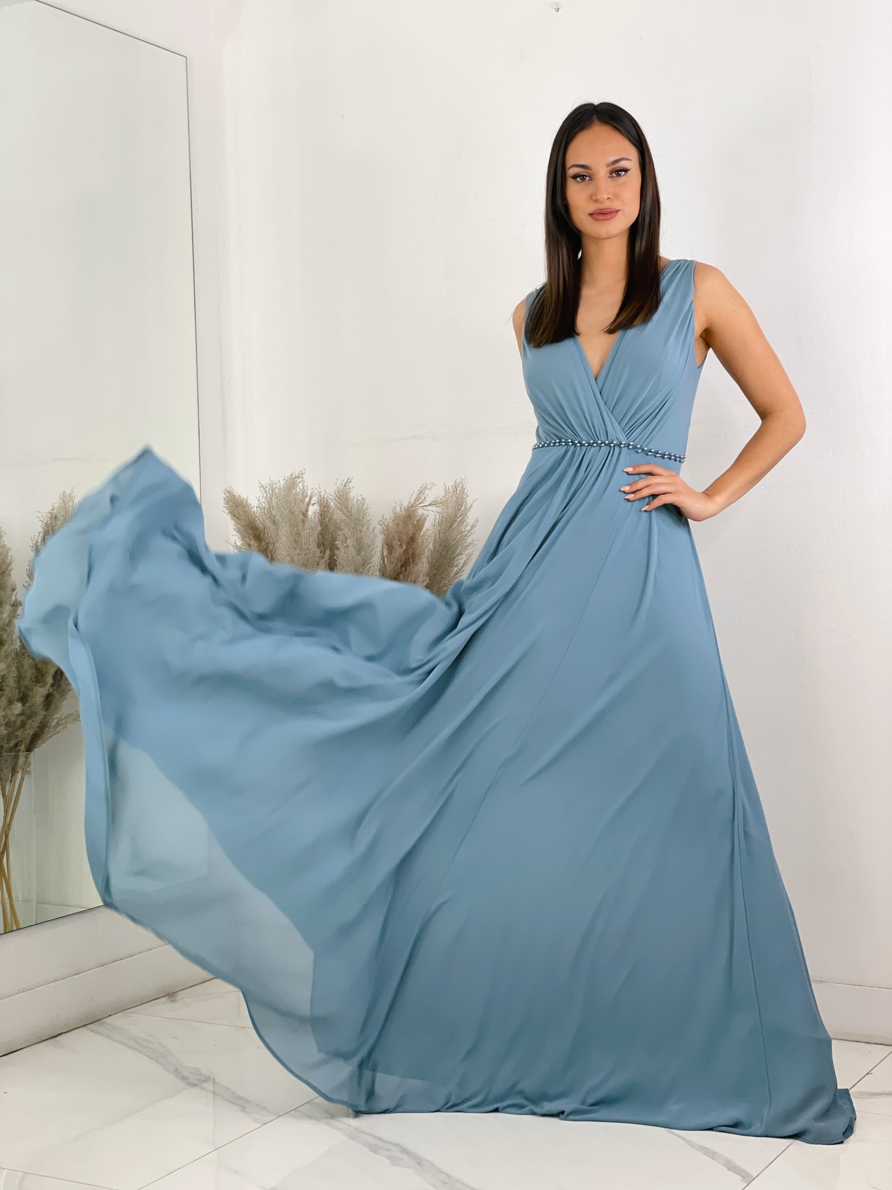 Vestido de escote en pico abierto y tirante ancho. Plisado en delantero y espalda. Cinturón de pedrería fino. Forro interior. Cierre mediante cremallera oculta en costura en espalda.