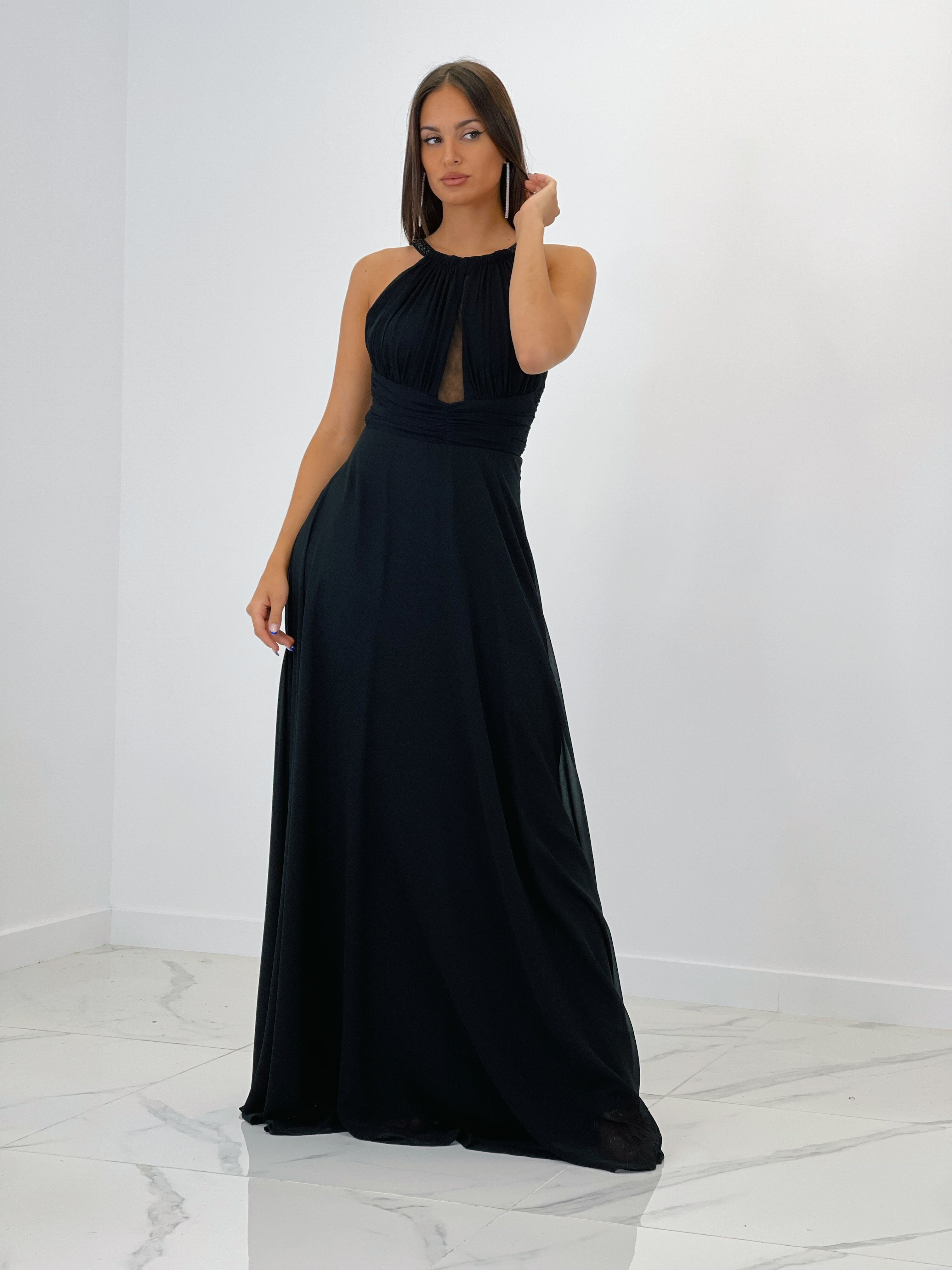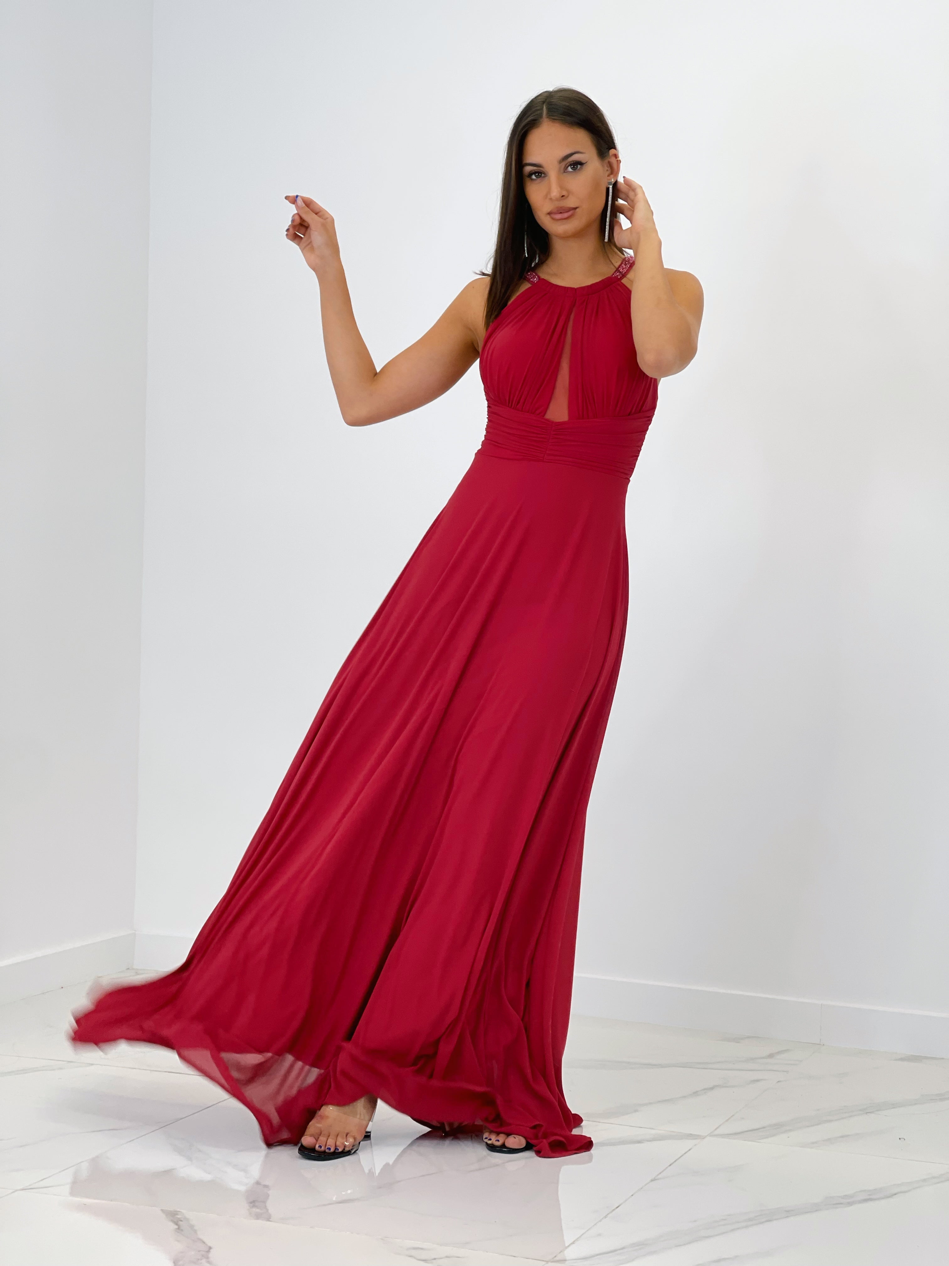 Este vestido de ceremonia presenta un elegante escote halter de pedrería con una abertura en el centro del pecho, que te hará destacar en cualquier ocasión especial. La cremallera oculta en la costura trasera y el suave forro interior te garantizan comodidad y un ajuste perfecto.